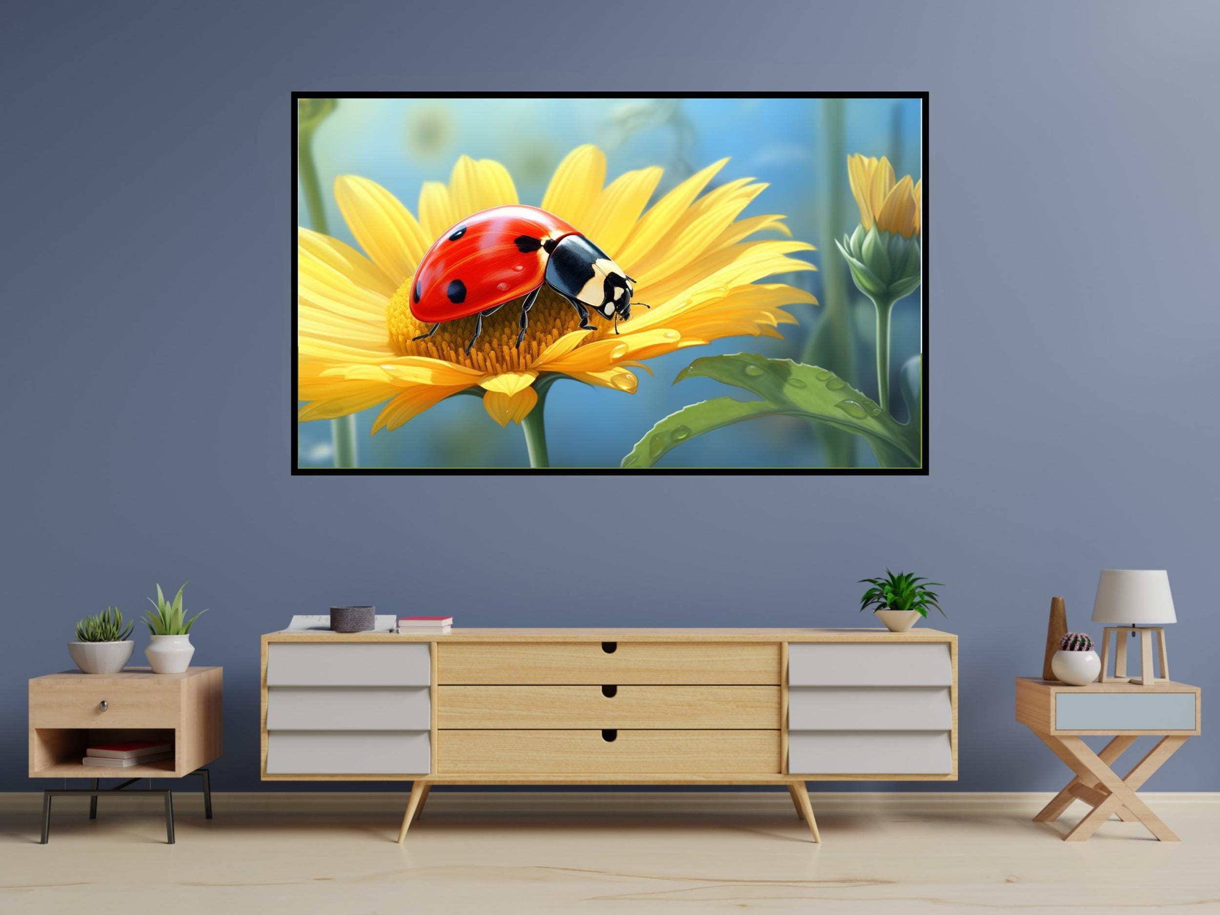 Discover the enchanting charm of nature with this bright realistic art featuring a ladybug on a yellow daisy. The vibrant colors and fresh dewy flower details bring a cheerful home decor touch to your digital space, capturing the delicate beauty of outdoor nature. This detailed insect art is perfect for anyone seeking a lively, nature-inspired image to brighten their screen.