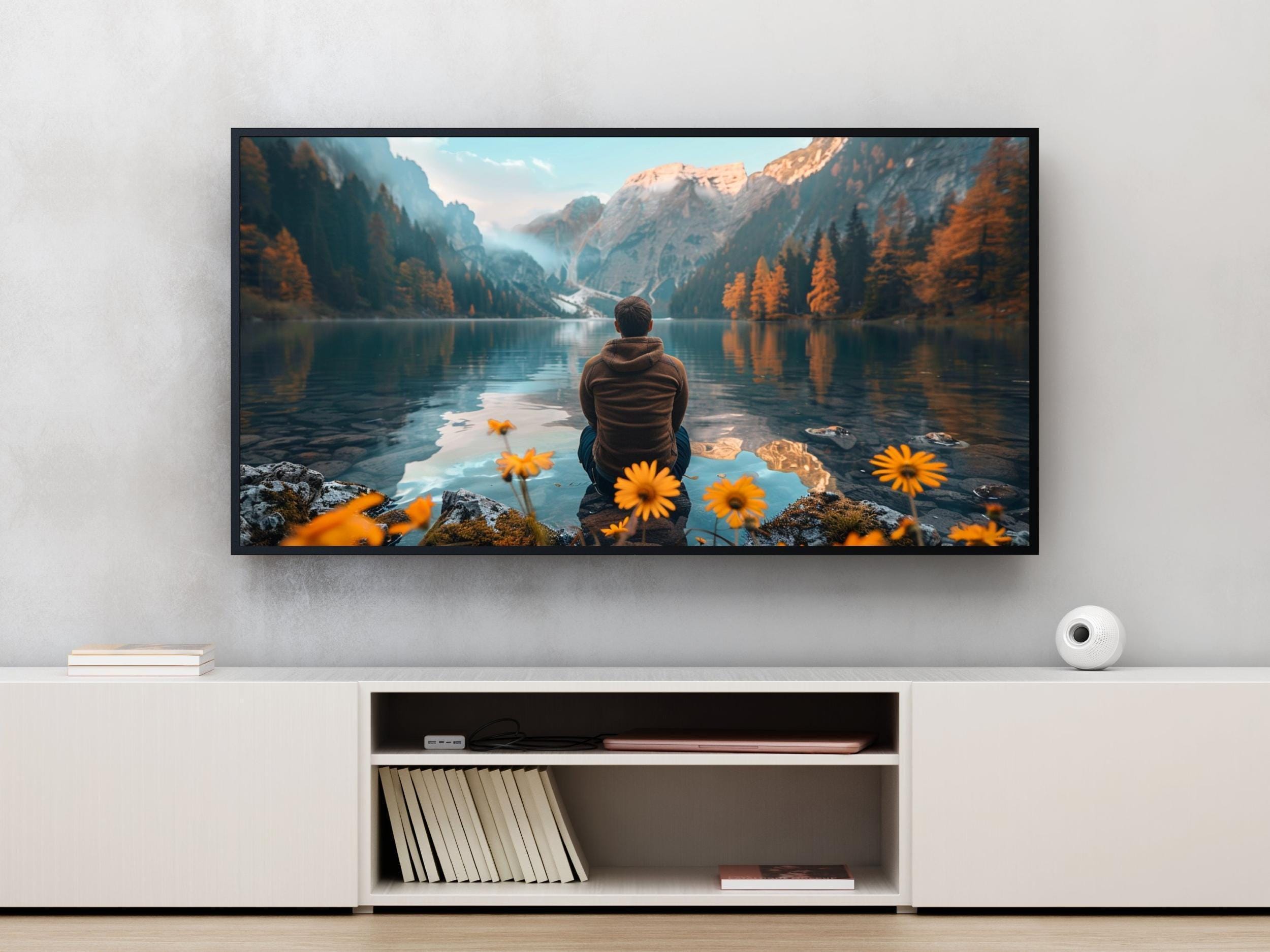 Immerse yourself in the tranquil beauty of this peaceful lake scene, where misty mountain views meet vibrant autumn foliage and evergreen trees. This serene landscape art invites quiet reflection, capturing a moment of calm that transforms any digital wall display into a nature-inspired sanctuary. Perfect for adding a touch of natural elegance, this 4K digital download brings the outdoors inside with stunning clarity and color.