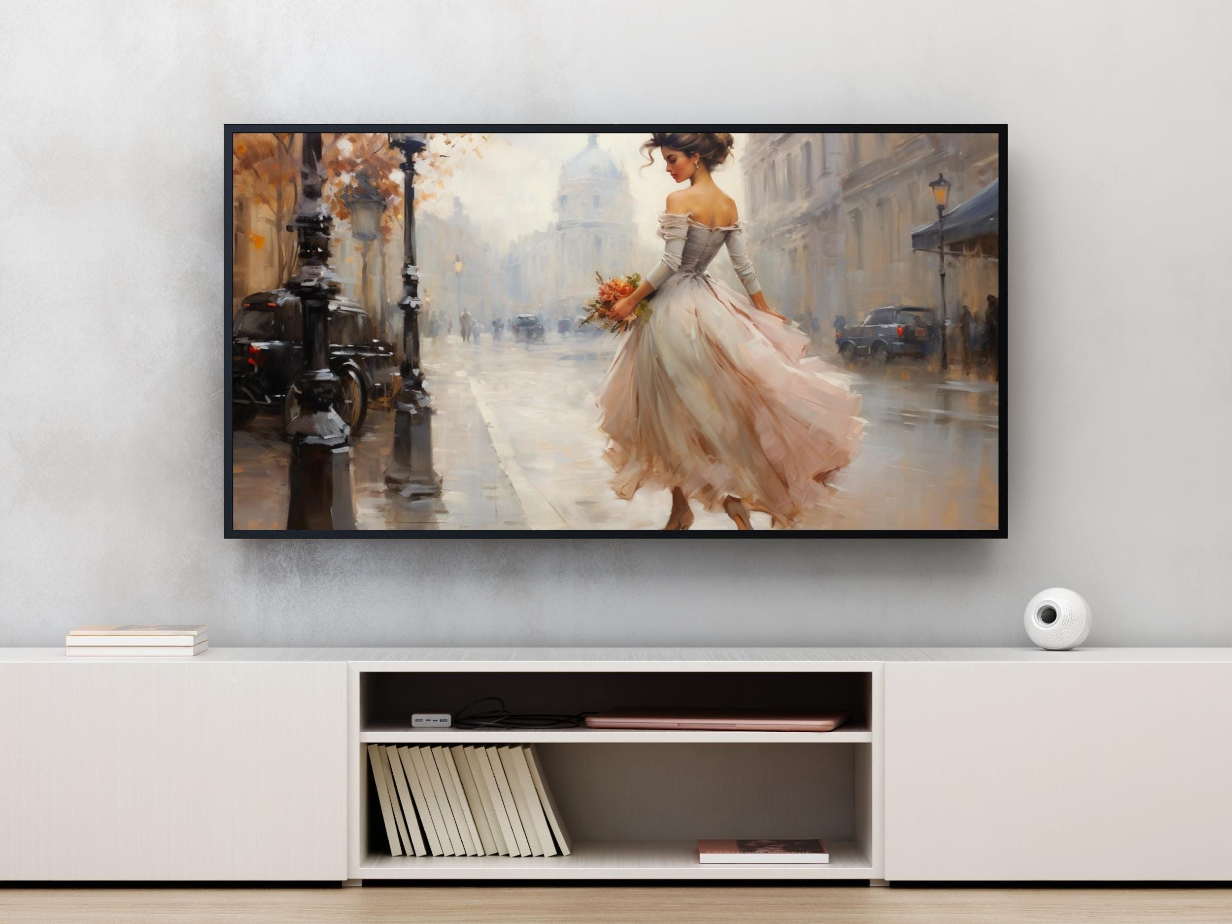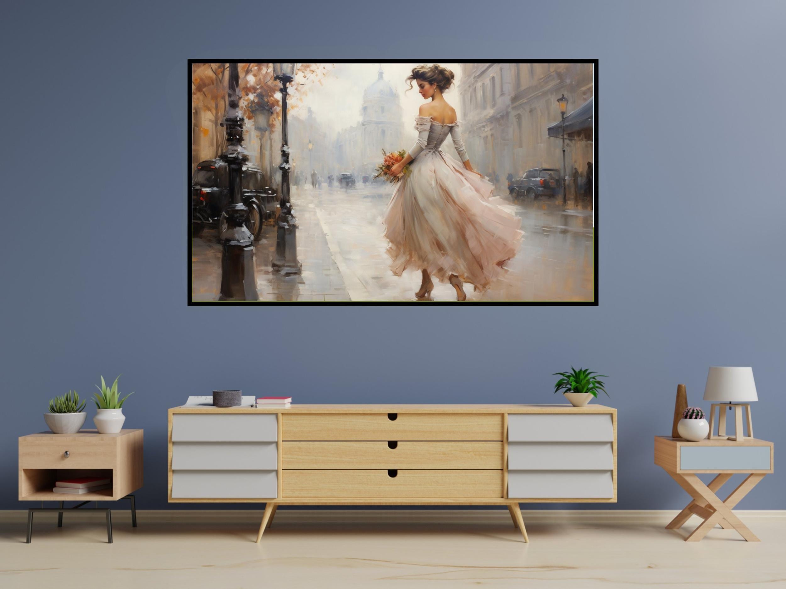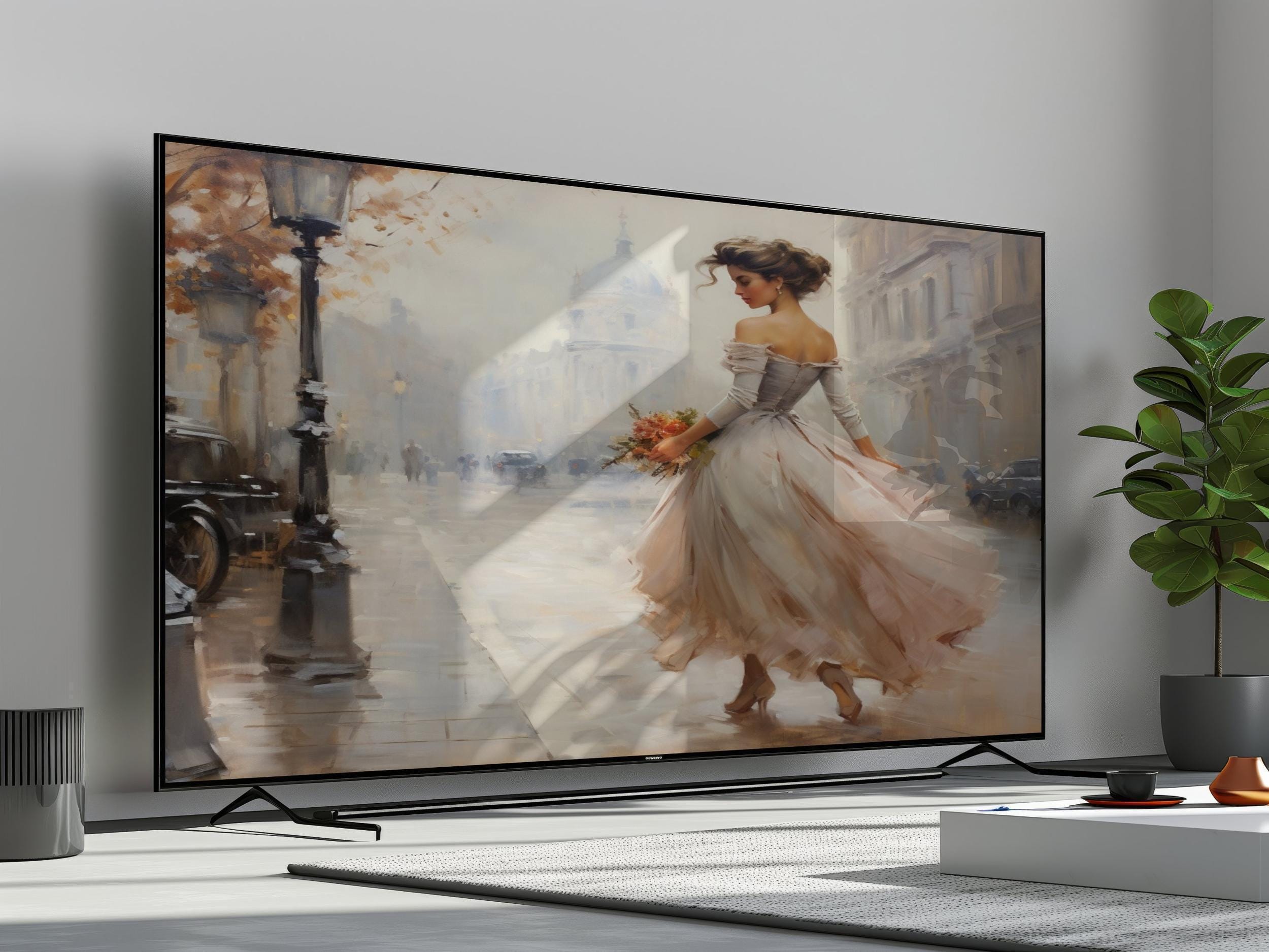 Step into a serene vintage street scene where timeless elegance meets delicate floral beauty. This digital artwork captures an elegant woman in a pastel gown, holding a vibrant floral bouquet that adds a touch of softness to the nostalgic atmosphere. Inspired by classic cars and softly glowing lampposts, this 4K UHD piece invites you to immerse yourself in a dreamy vintage style that transforms any space.