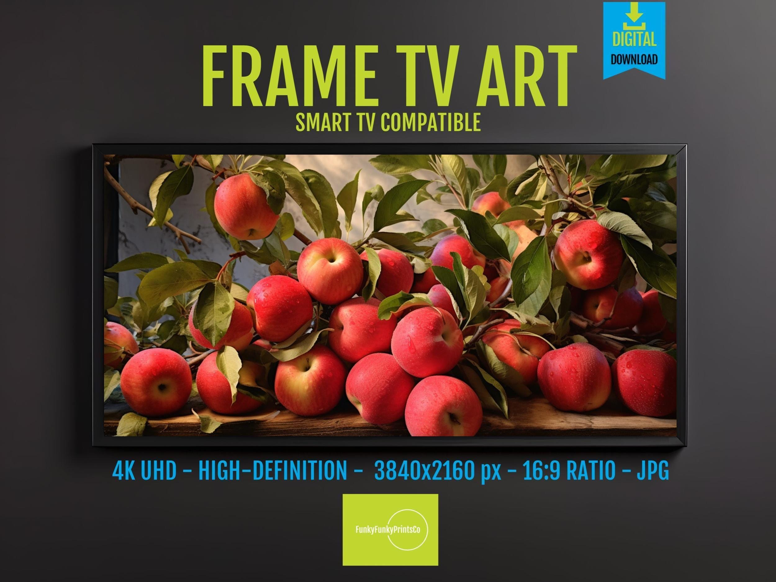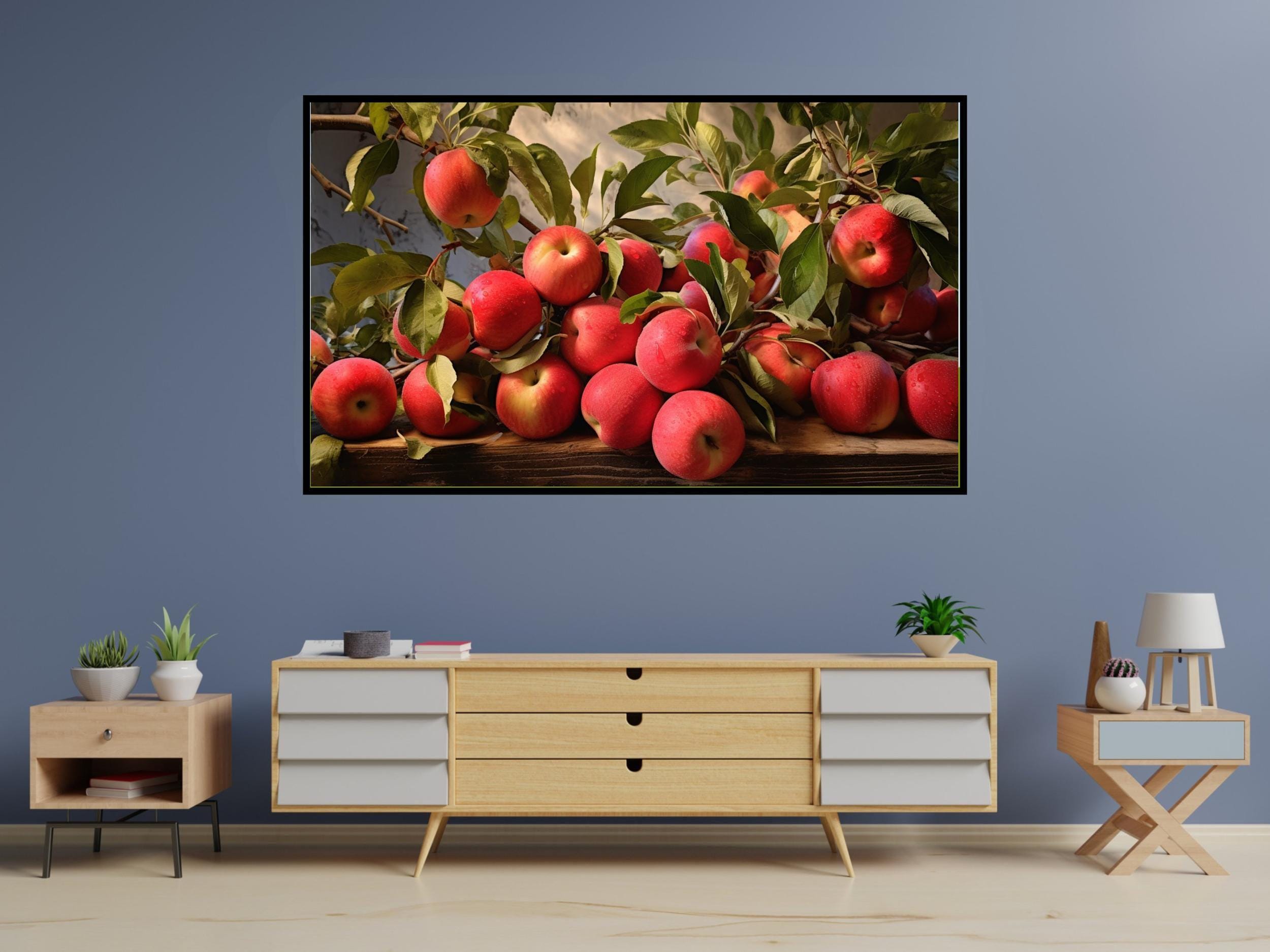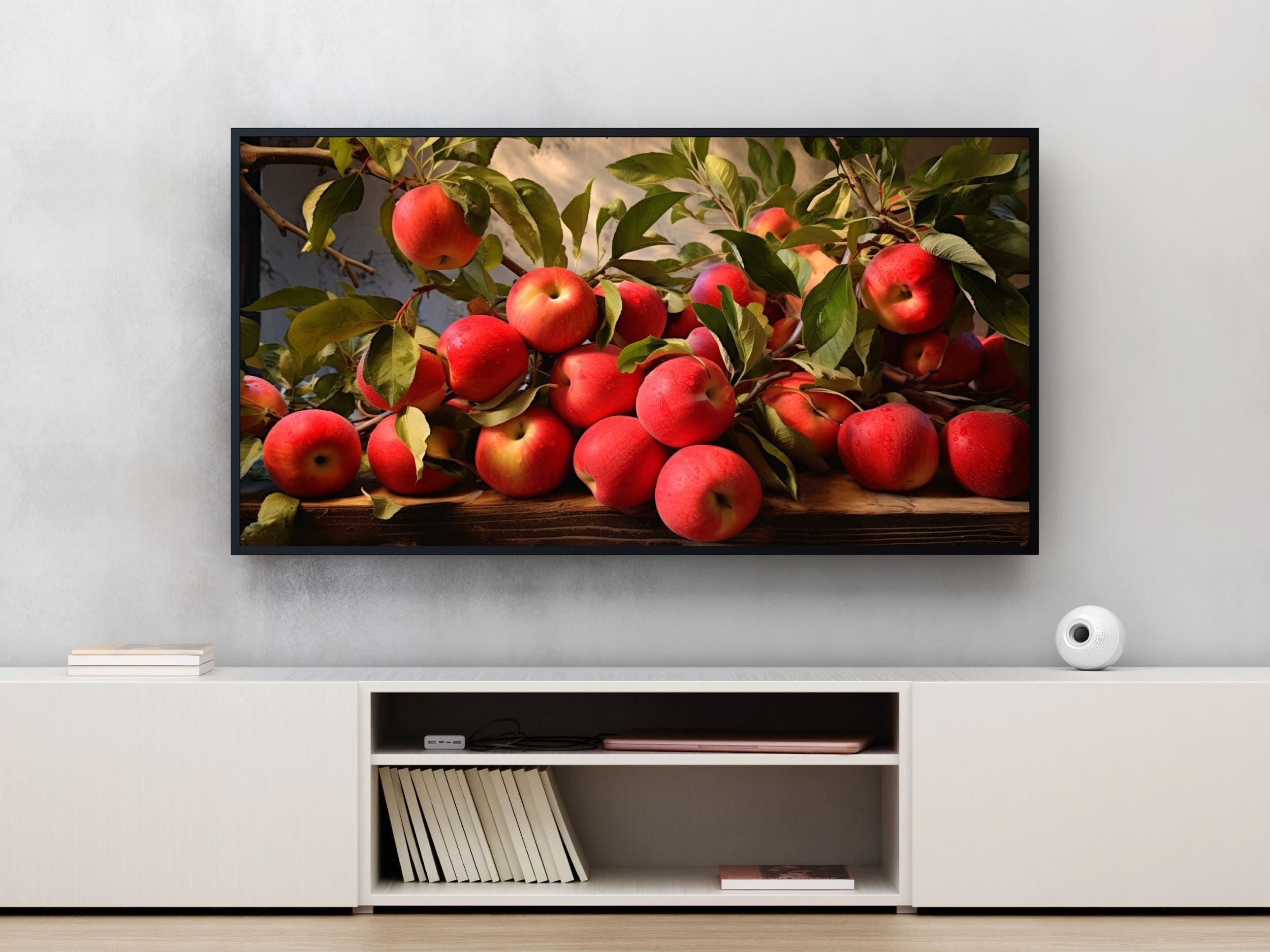 Immerse yourself in the cozy charm of autumn with this stunning digital art featuring glossy red apples nestled among vibrant green leaves. Designed as a 4K screen art download, it beautifully captures the rustic fall decor vibe perfect for your Samsung Frame TV or any digital display. This cozy nature display brings the warmth and abundance of the harvest season right into your home.