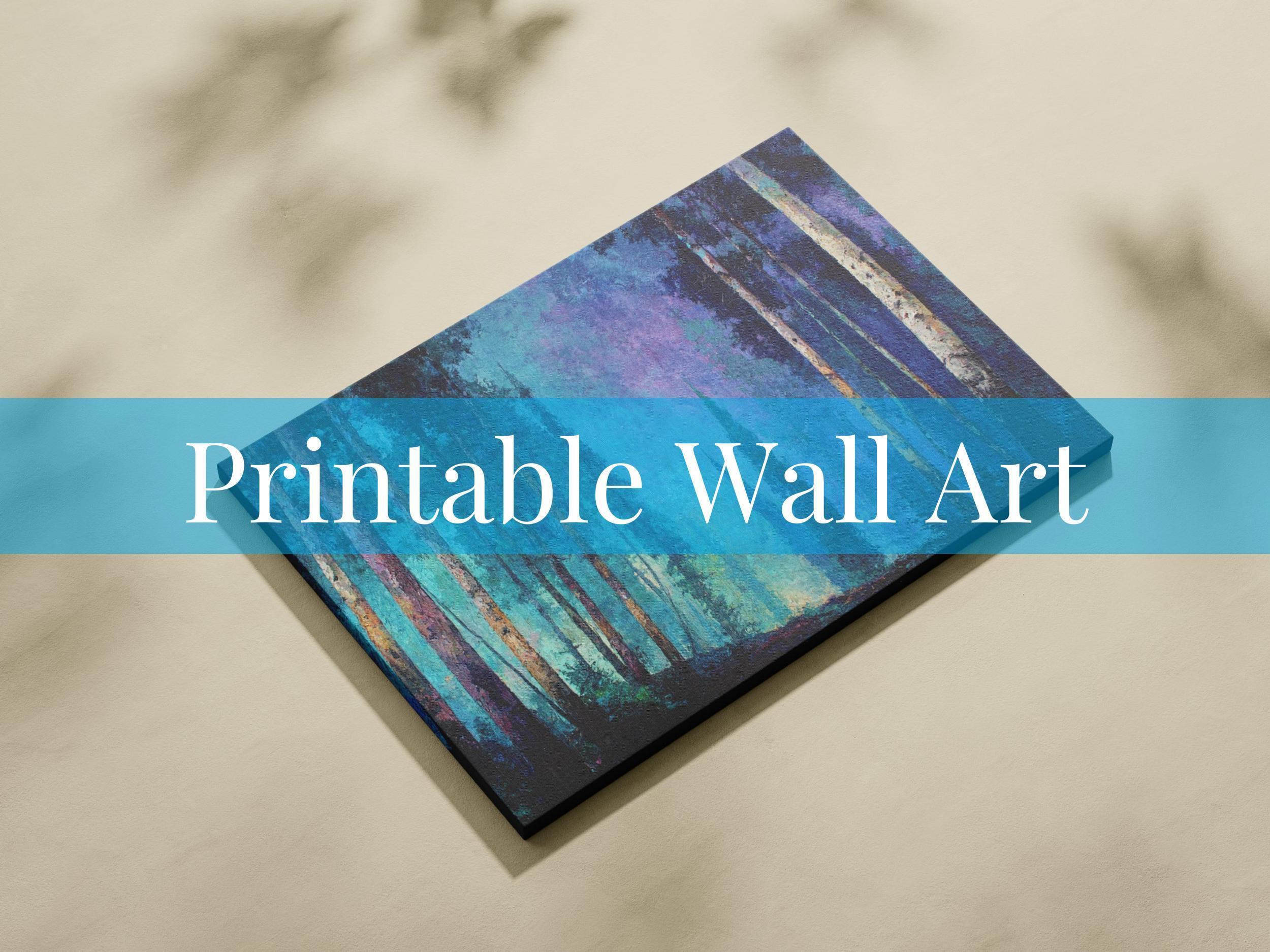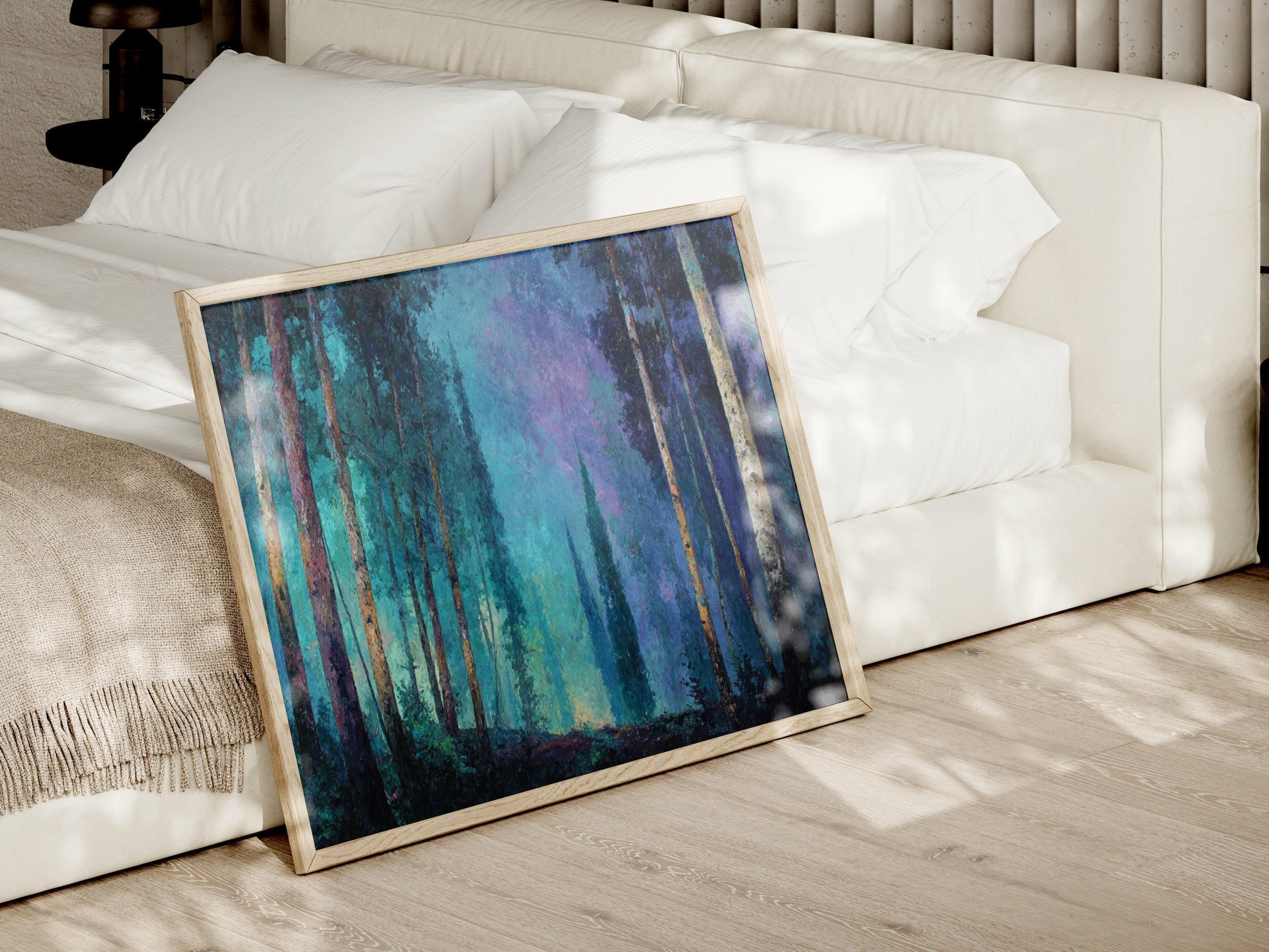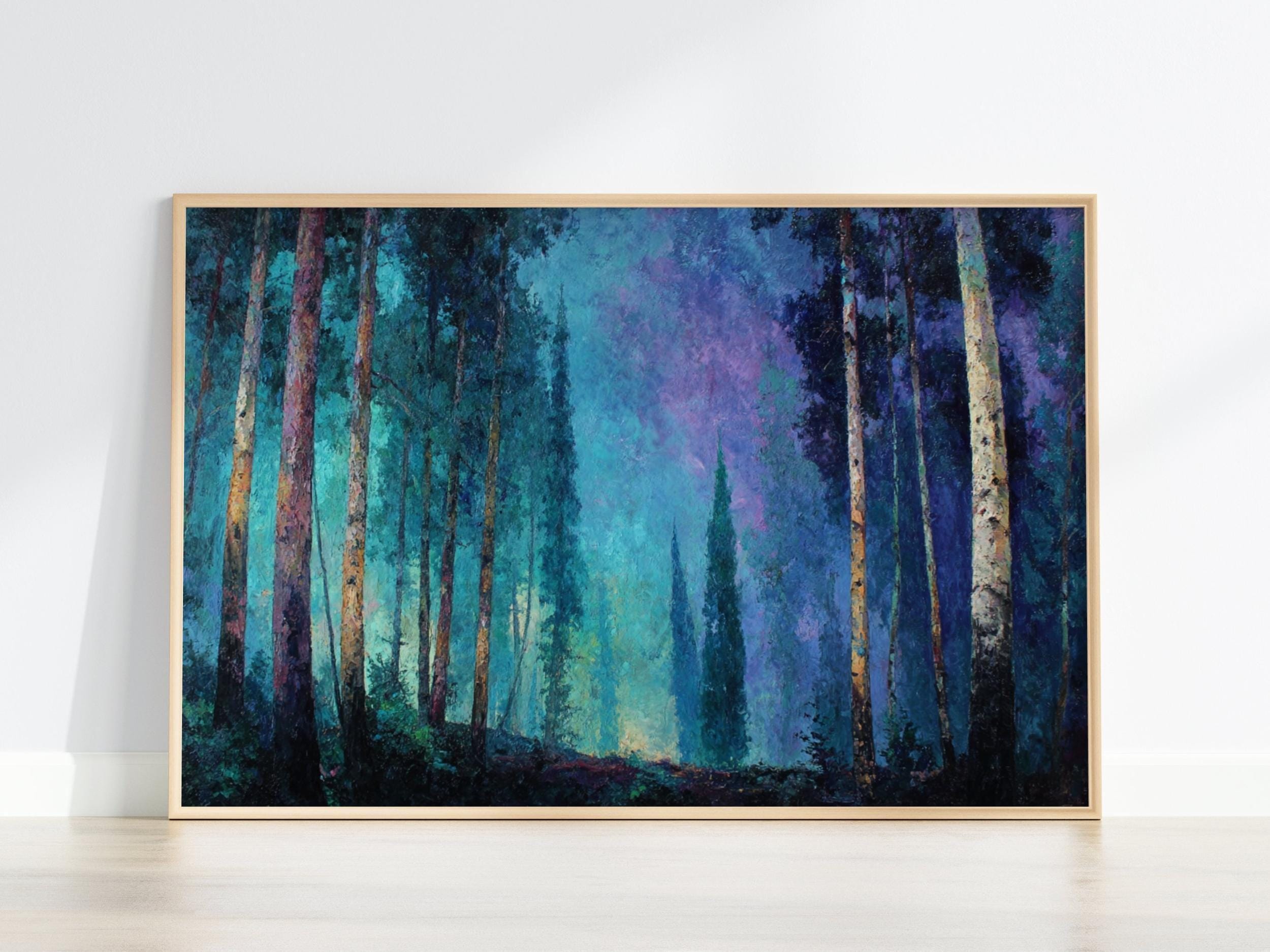 Step into a dreamy forest where misty fog weaves through tall birch trees, creating a peaceful nature art scene that invites calm and reflection. This digital download art captures the magical interplay of blues, purples, and greens in a serene forest setting, enhanced by visible brush stroke texture that brings the image to life. Perfect for adding a tranquil, large wall print to your home decor, this piece evokes the quiet mystery of a misty forest scene.