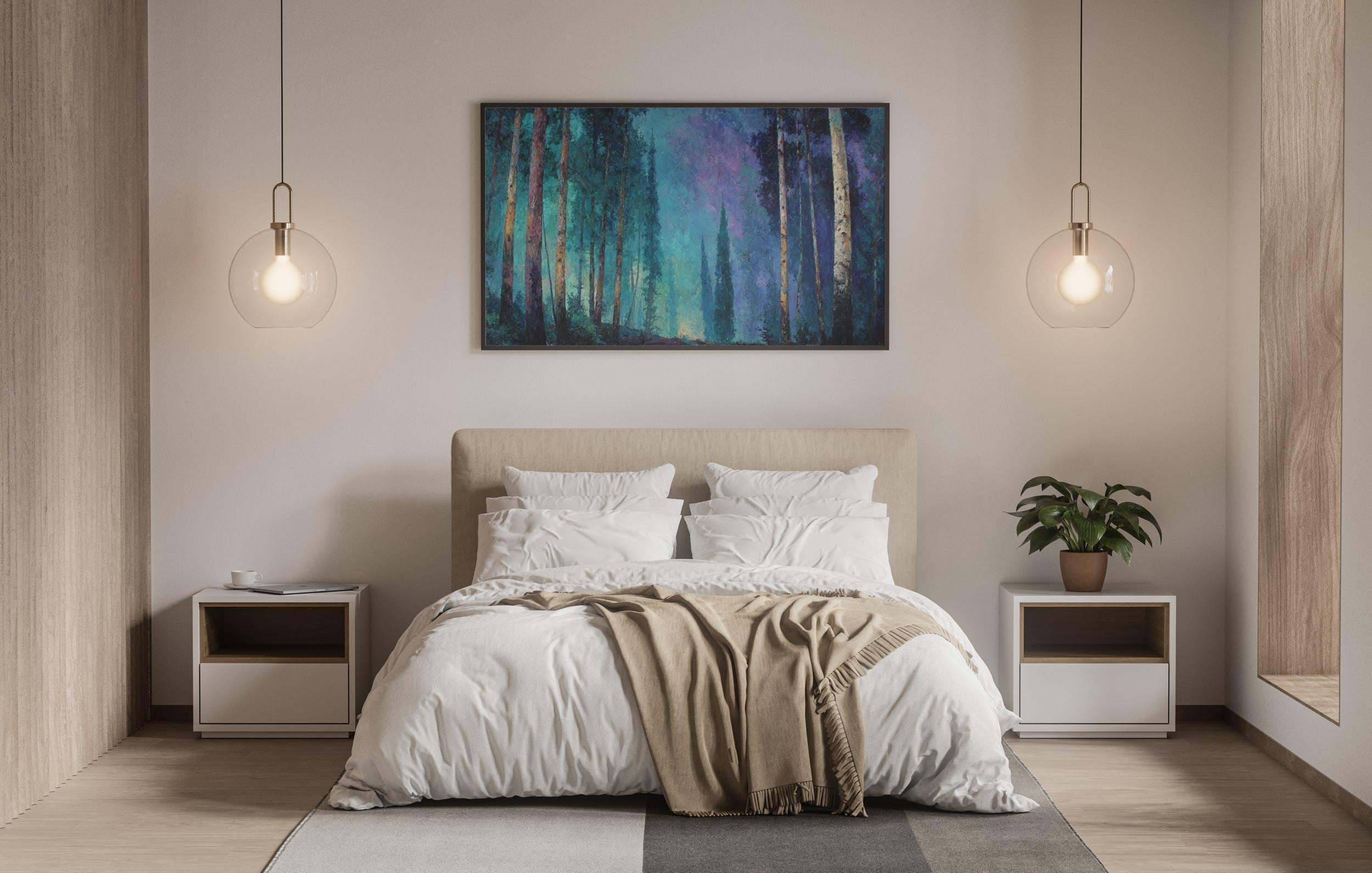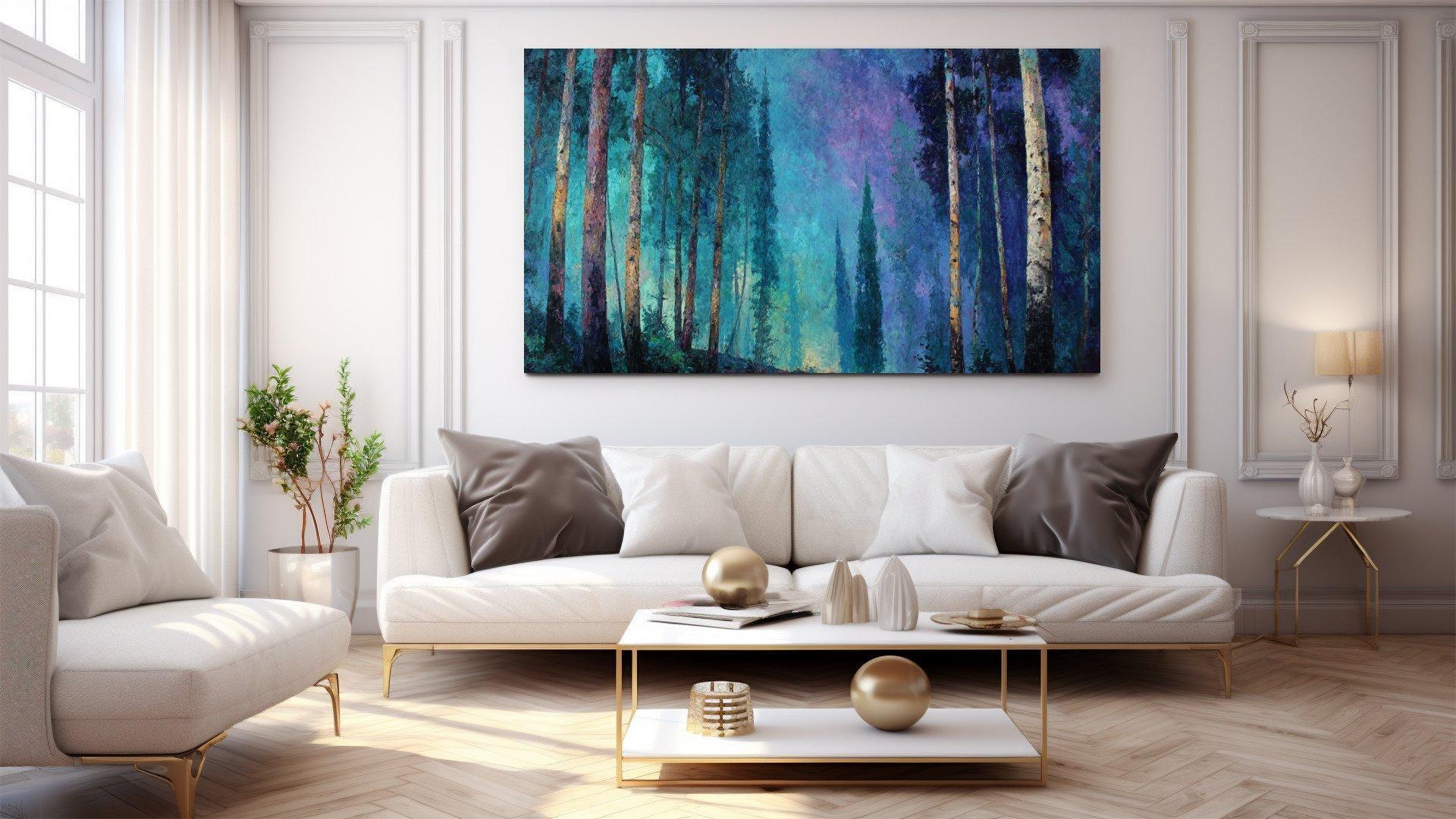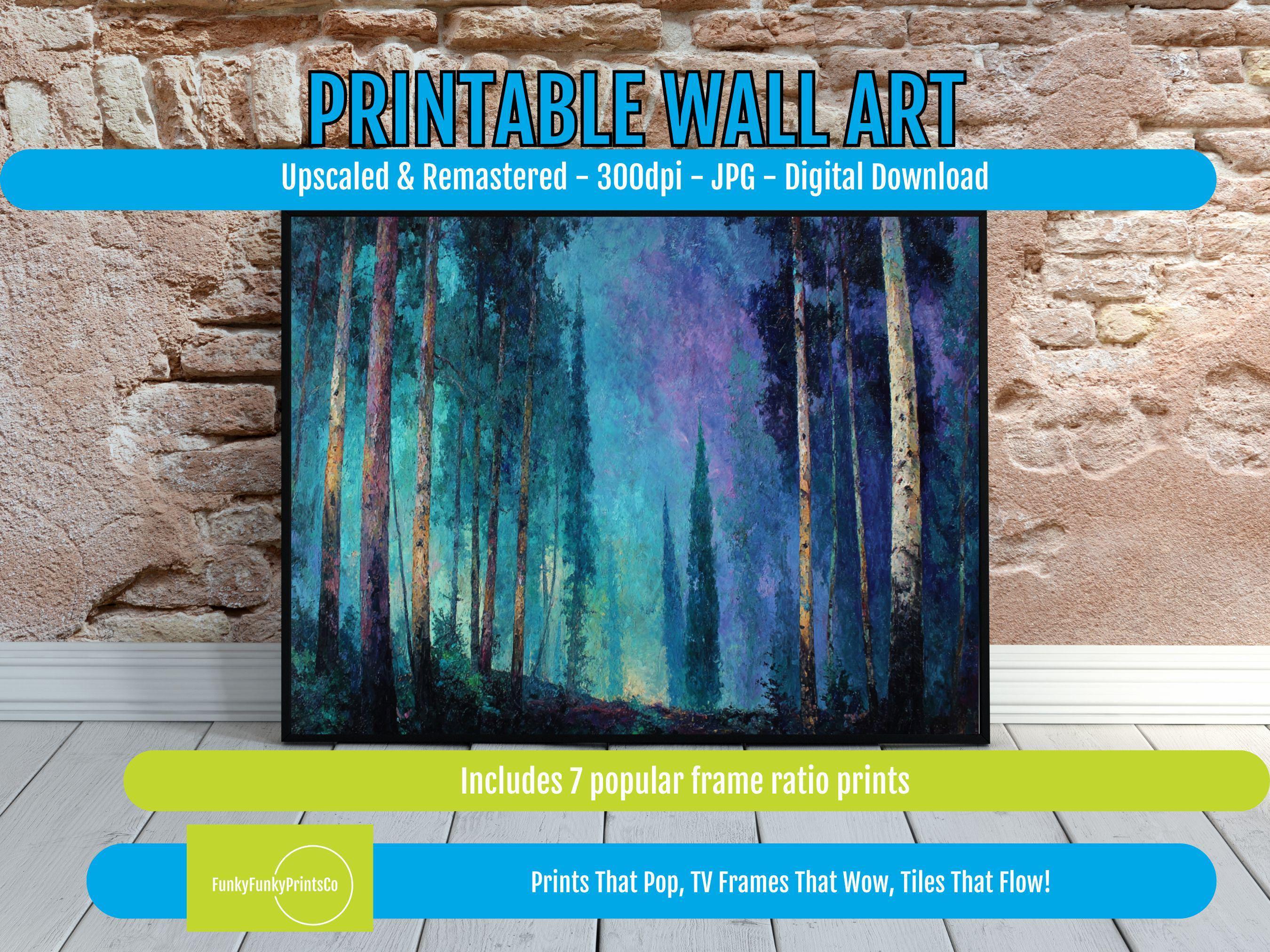 Step into a dreamy forest where misty fog weaves through tall birch trees, creating a peaceful nature art scene that invites calm and reflection. This digital download art captures the magical interplay of blues, purples, and greens in a serene forest setting, enhanced by visible brush stroke texture that brings the image to life. Perfect for adding a tranquil, large wall print to your home decor, this piece evokes the quiet mystery of a misty forest scene.