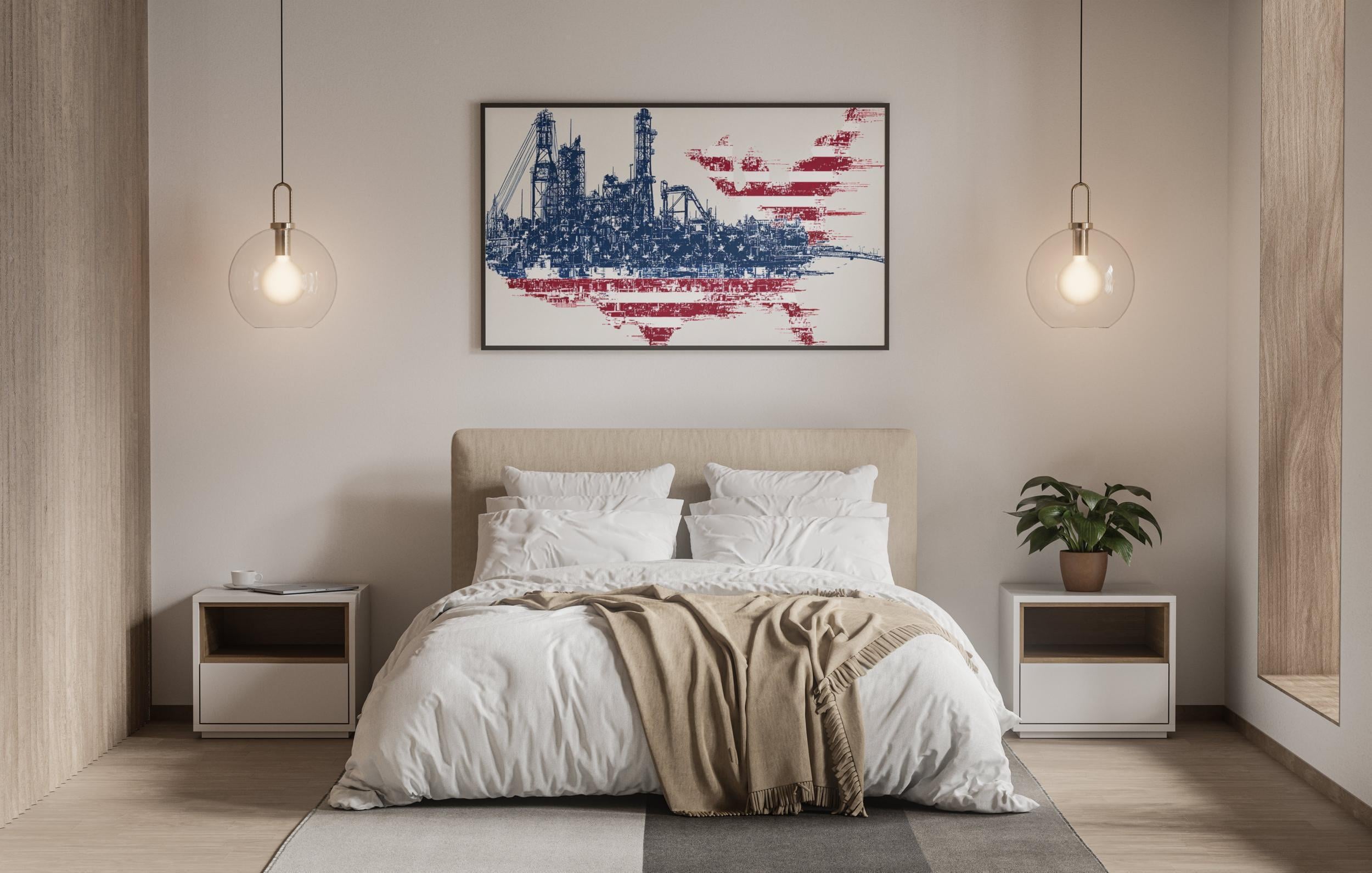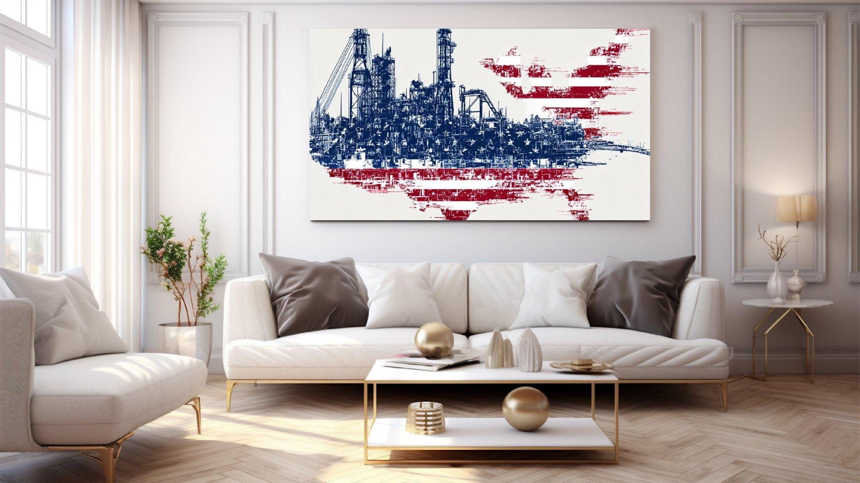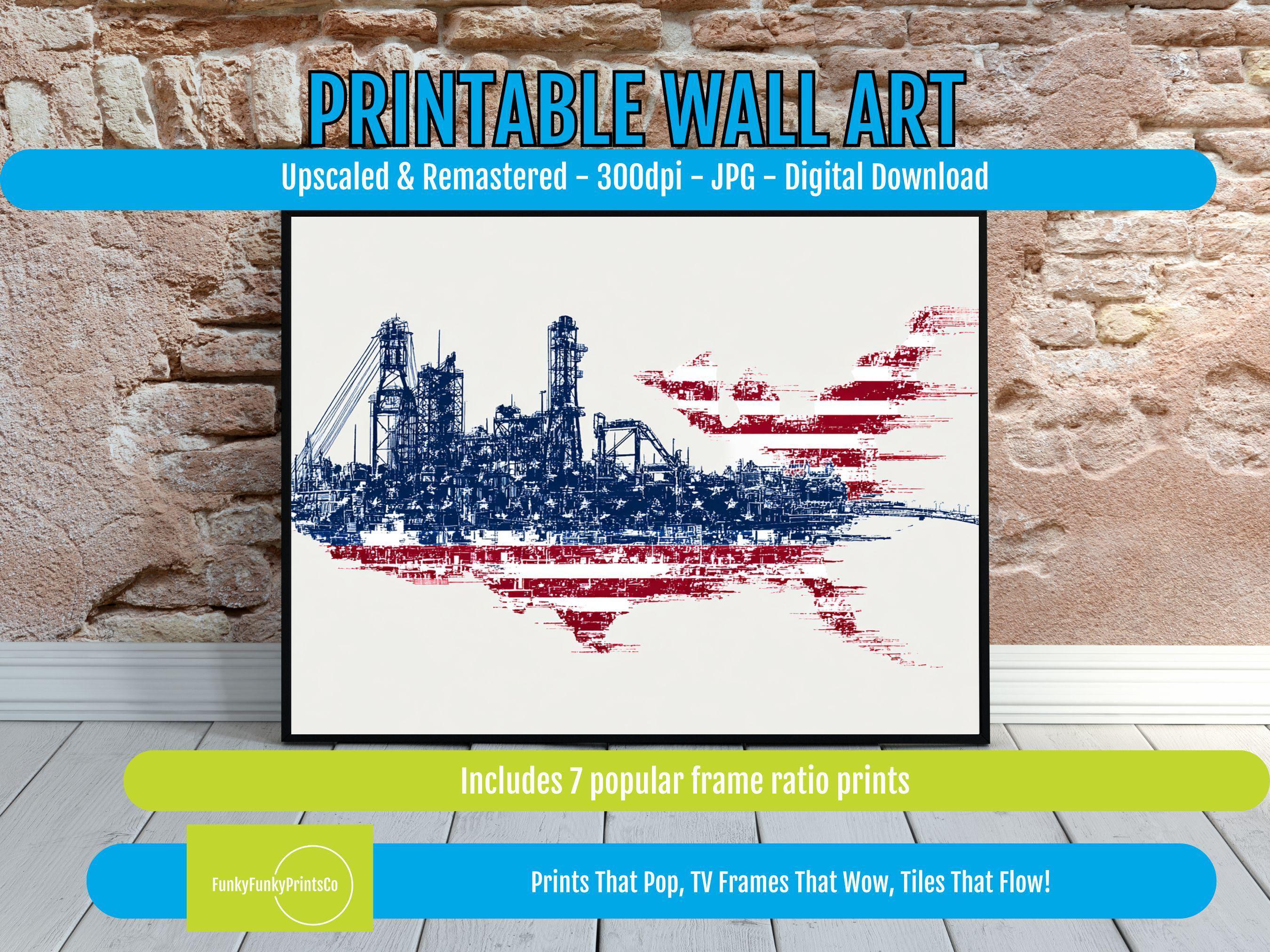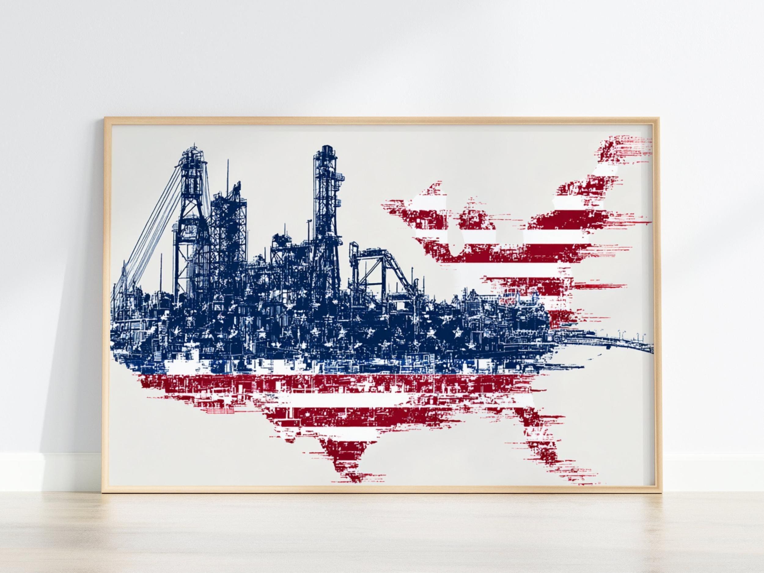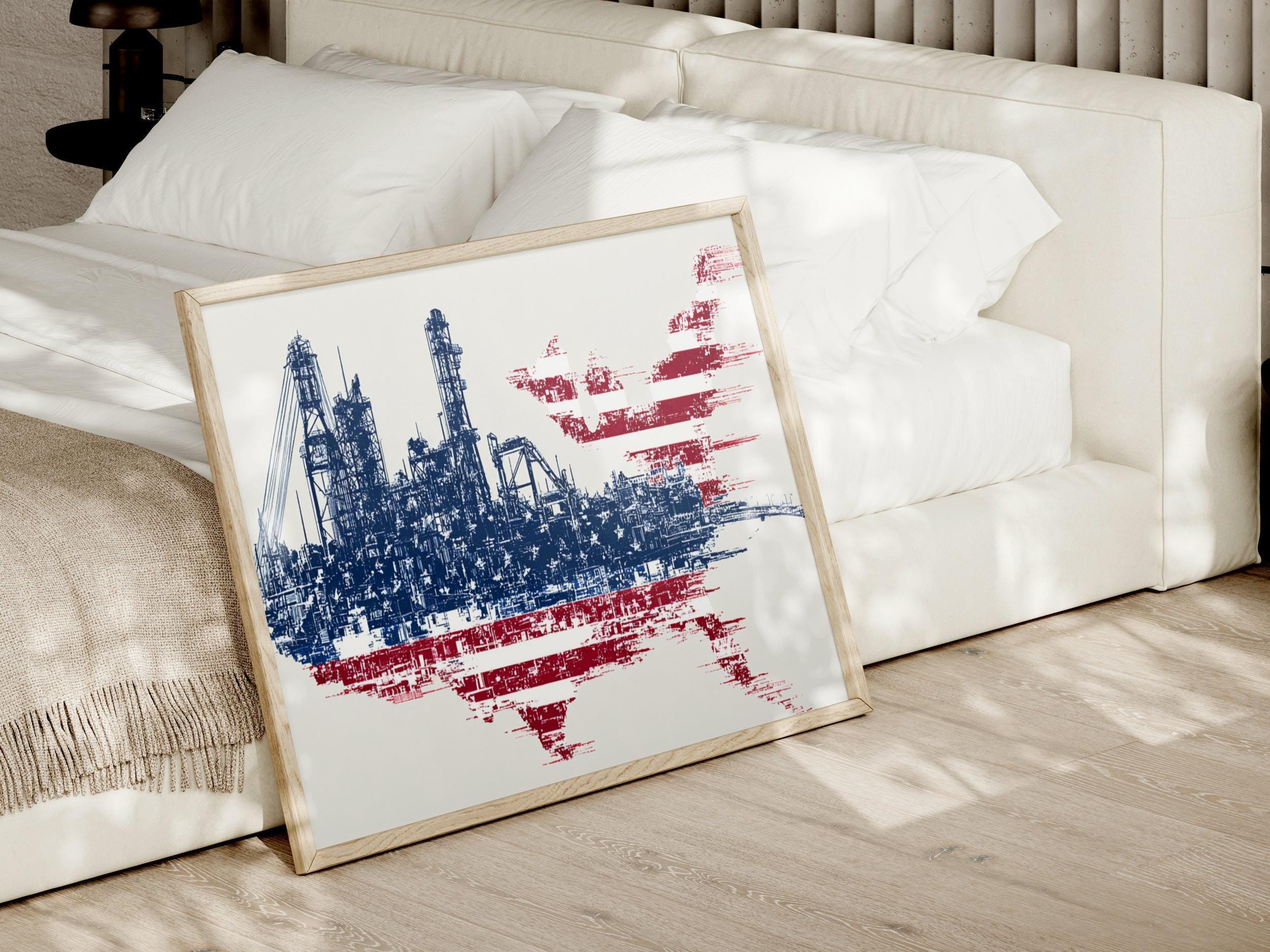 Discover a striking blend of patriotism and modern design with this digital download featuring a patriotic US map rendered in an abstract red blue palette. Inspired by industrial scenes and American flag colors, this stylized map print captures the bold spirit of the nation with graphic modern style and a unique oil refinery design. Perfect for modern wall decor, this high-resolution JPG offers an instant download that brings vibrant, printable home art right to your fingertips.