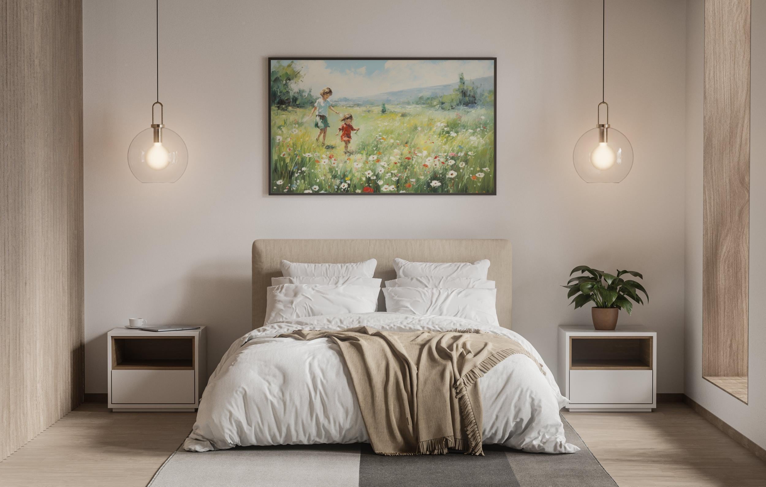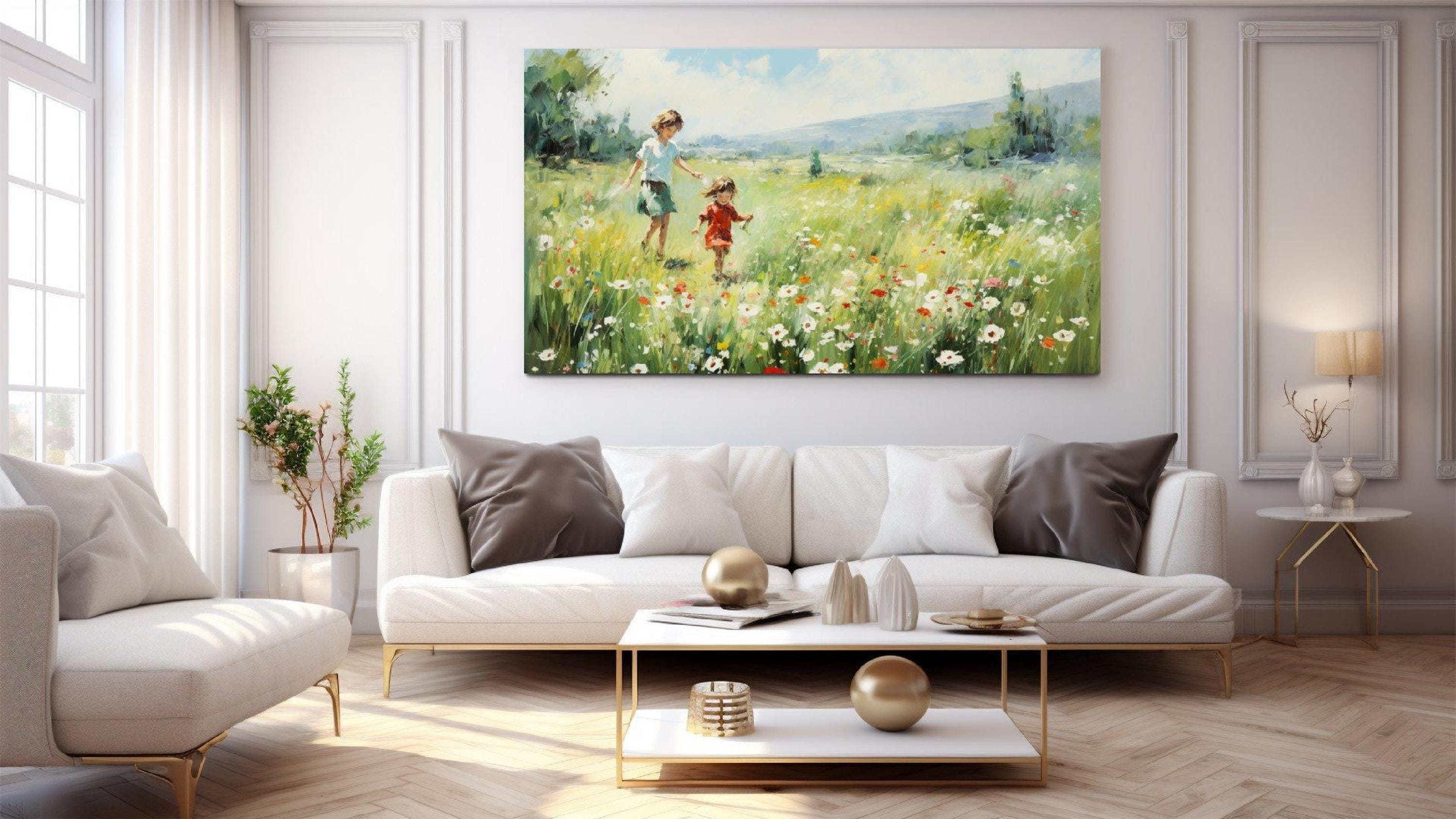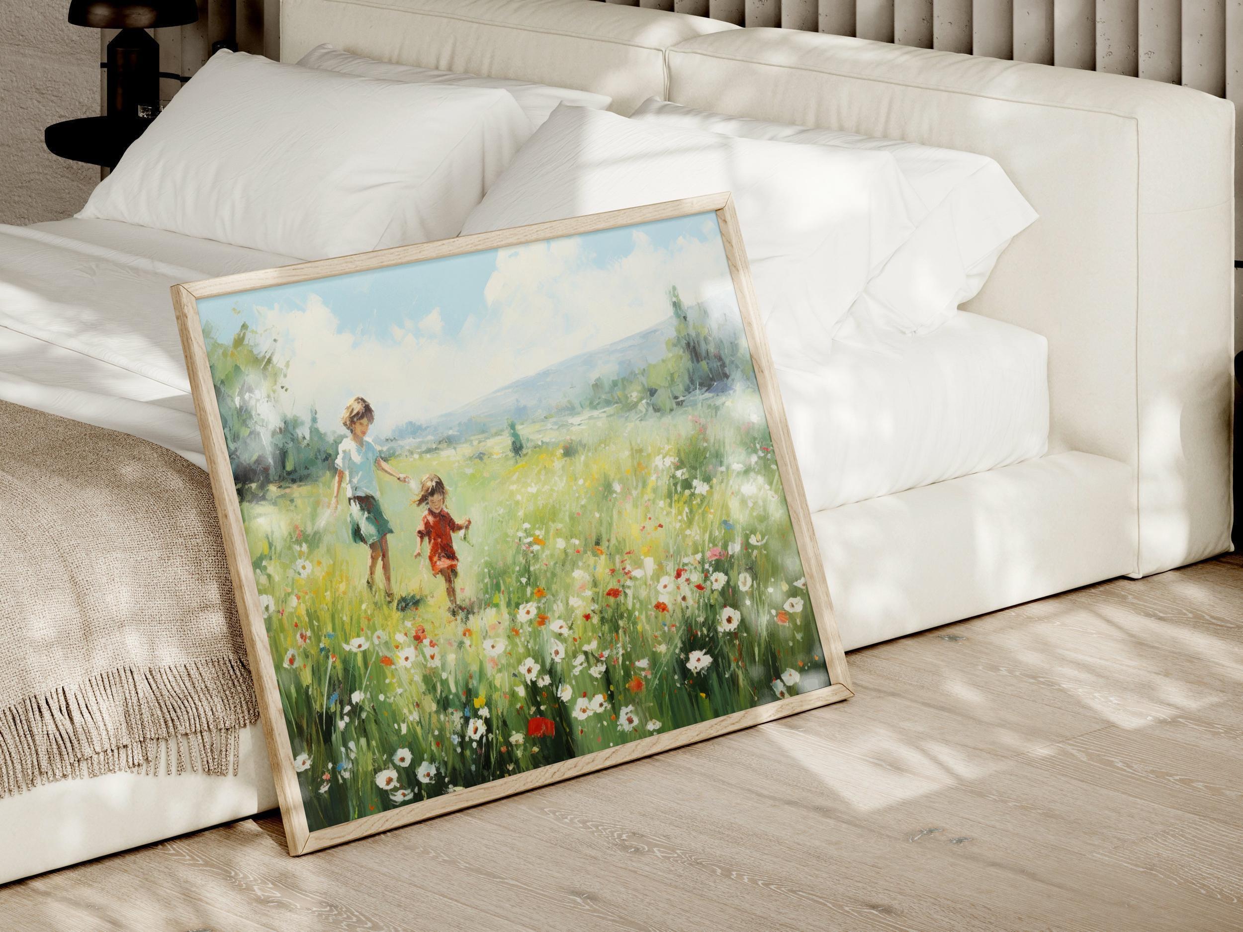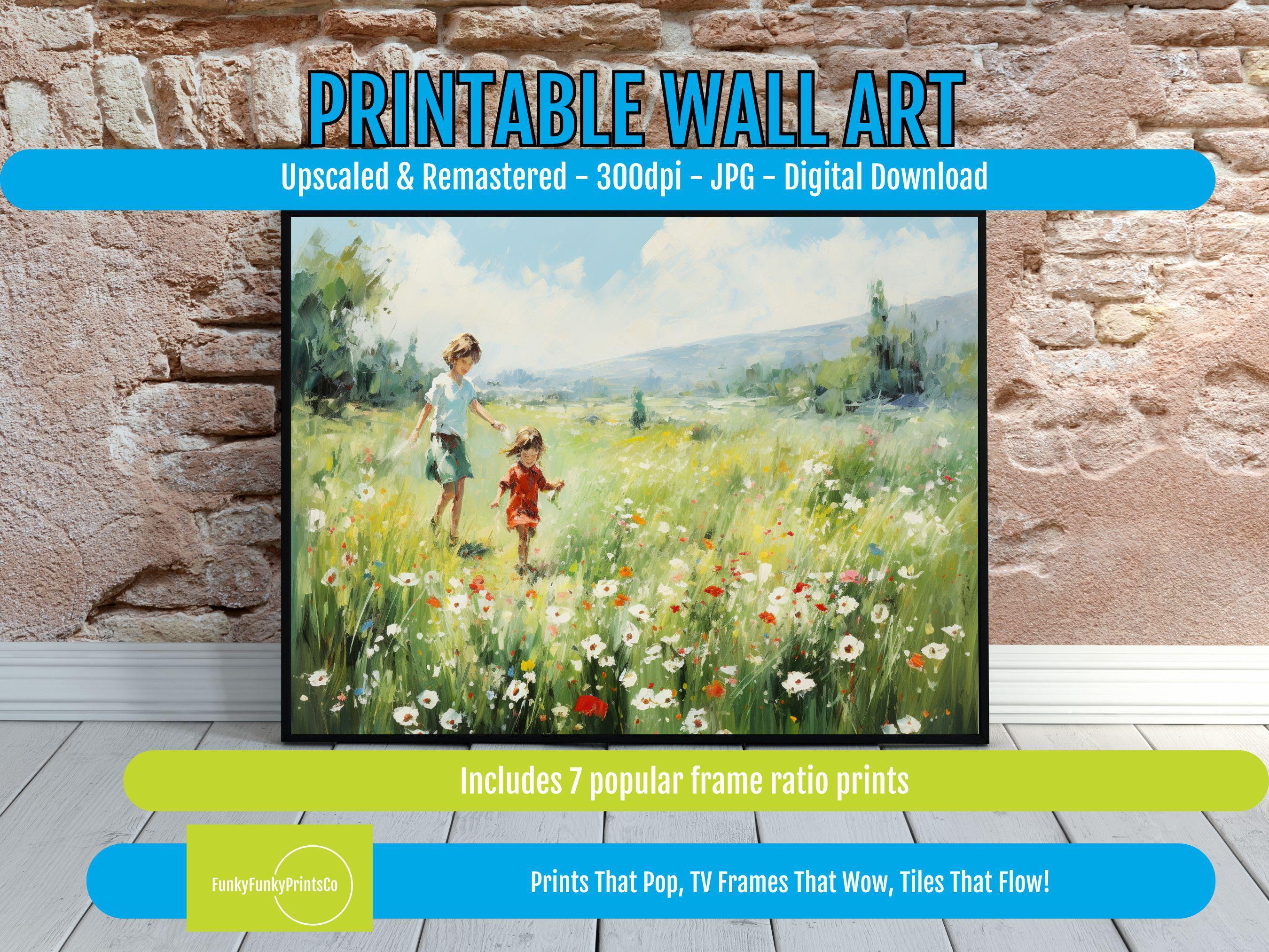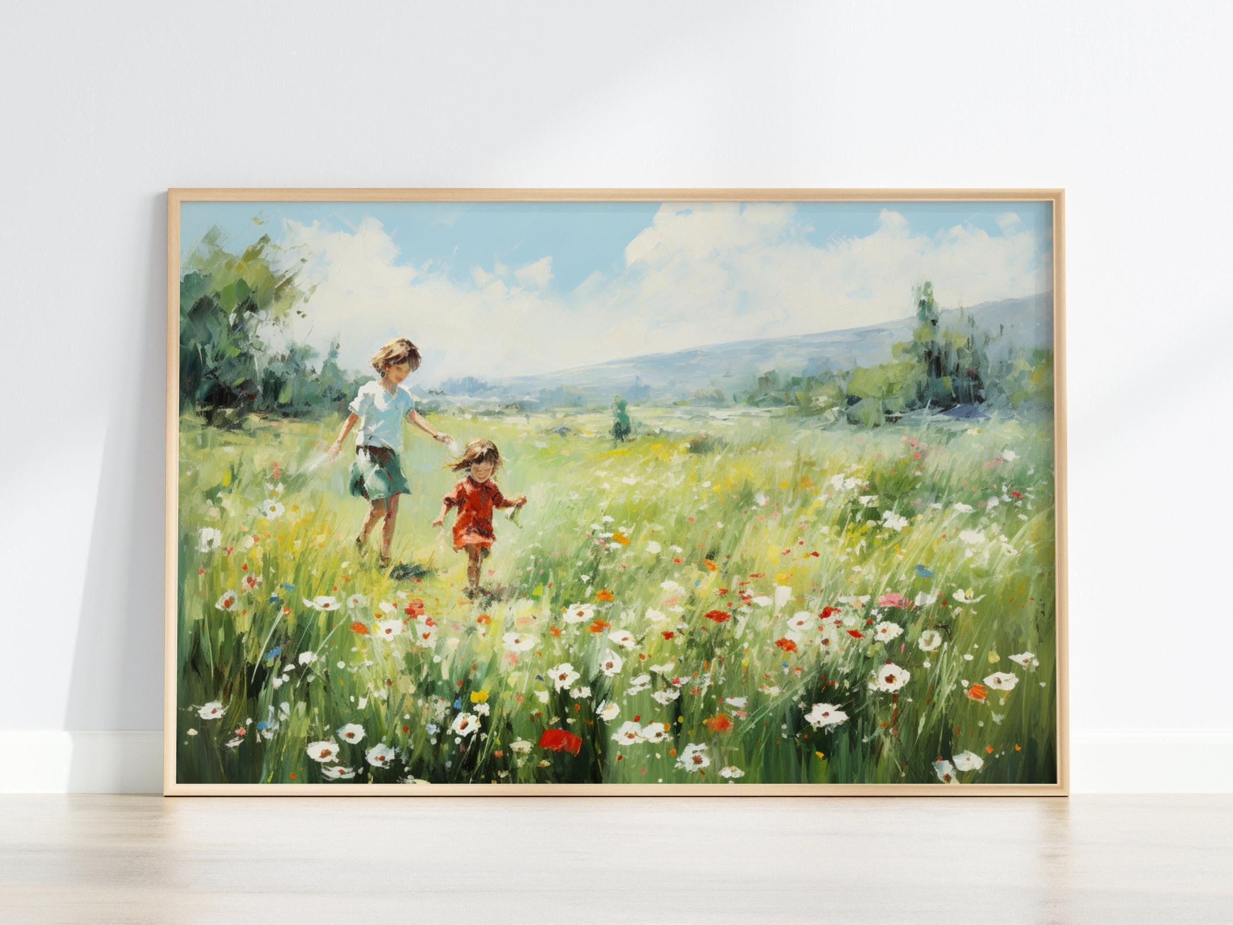 - 🌼 High-resolution digital download featuring a bright landscape with colorful blooms and detailed children playing art