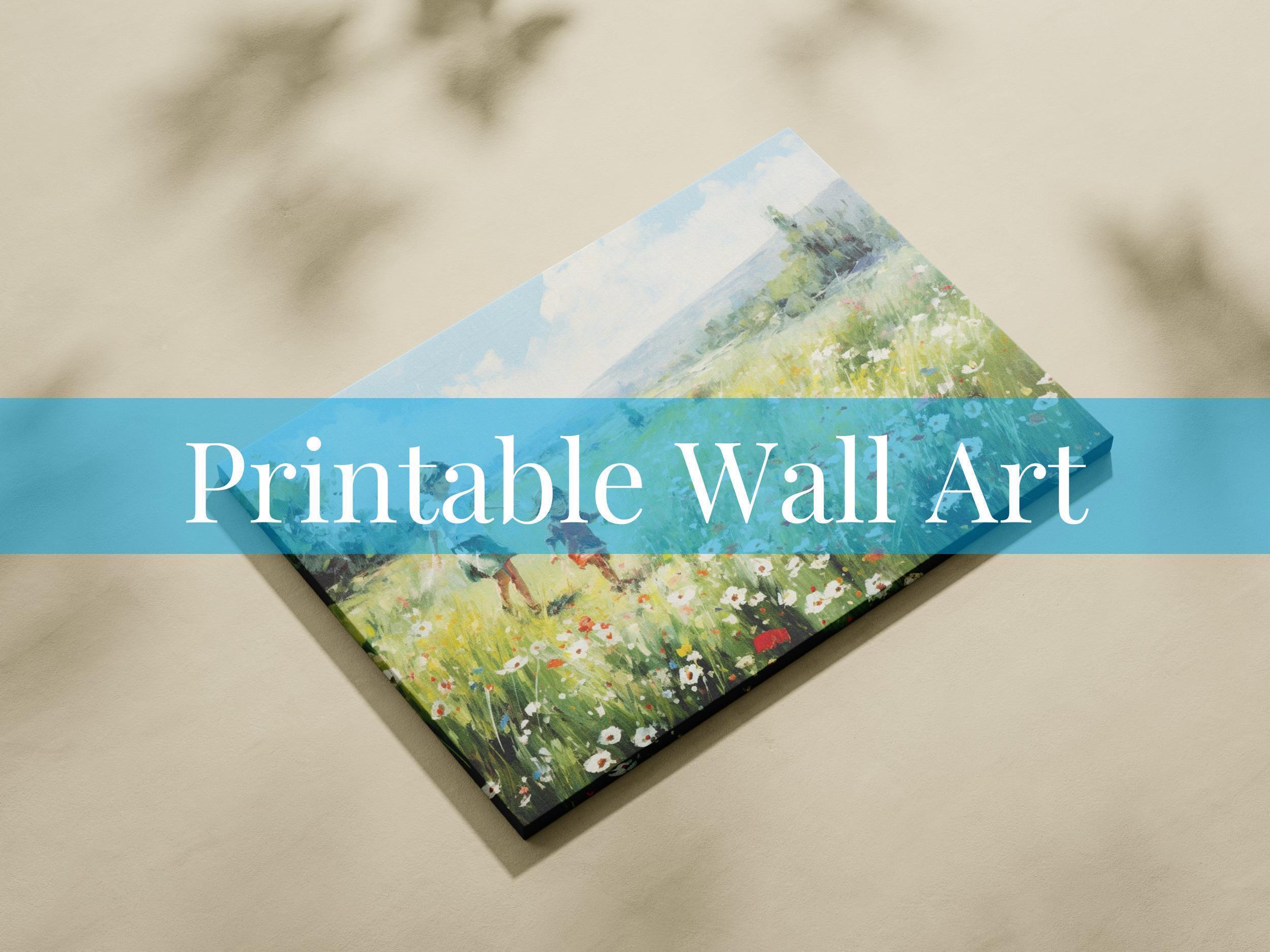 Step into a joyful outdoor scene where children play freely amidst rolling hills and a calming blue sky. This children's meadow art captures the innocence of youth surrounded by lush greenery decor and fluffy clouds that drift softly overhead. Inspired by the simple beauty of nature, this printable art brings a vibrant landscape filled with happiness and peace right into your home.