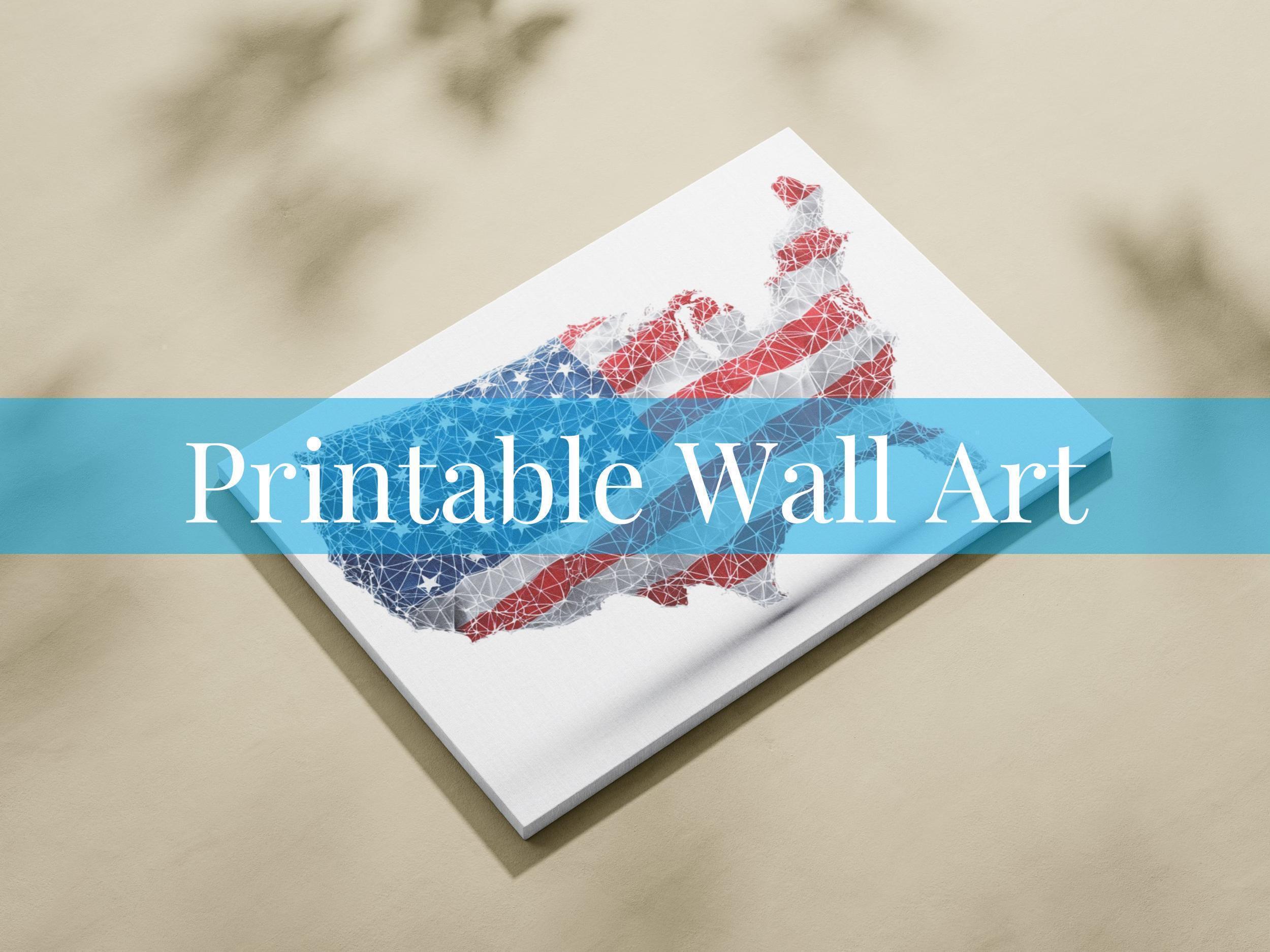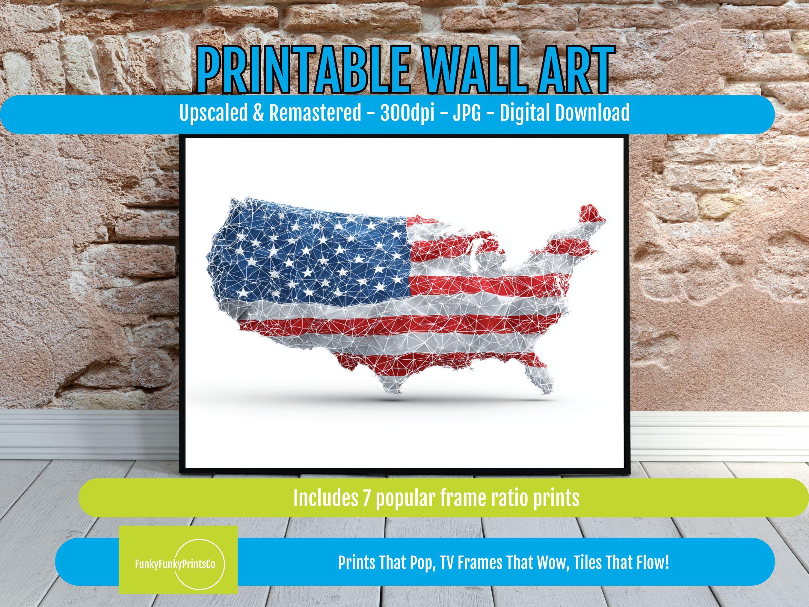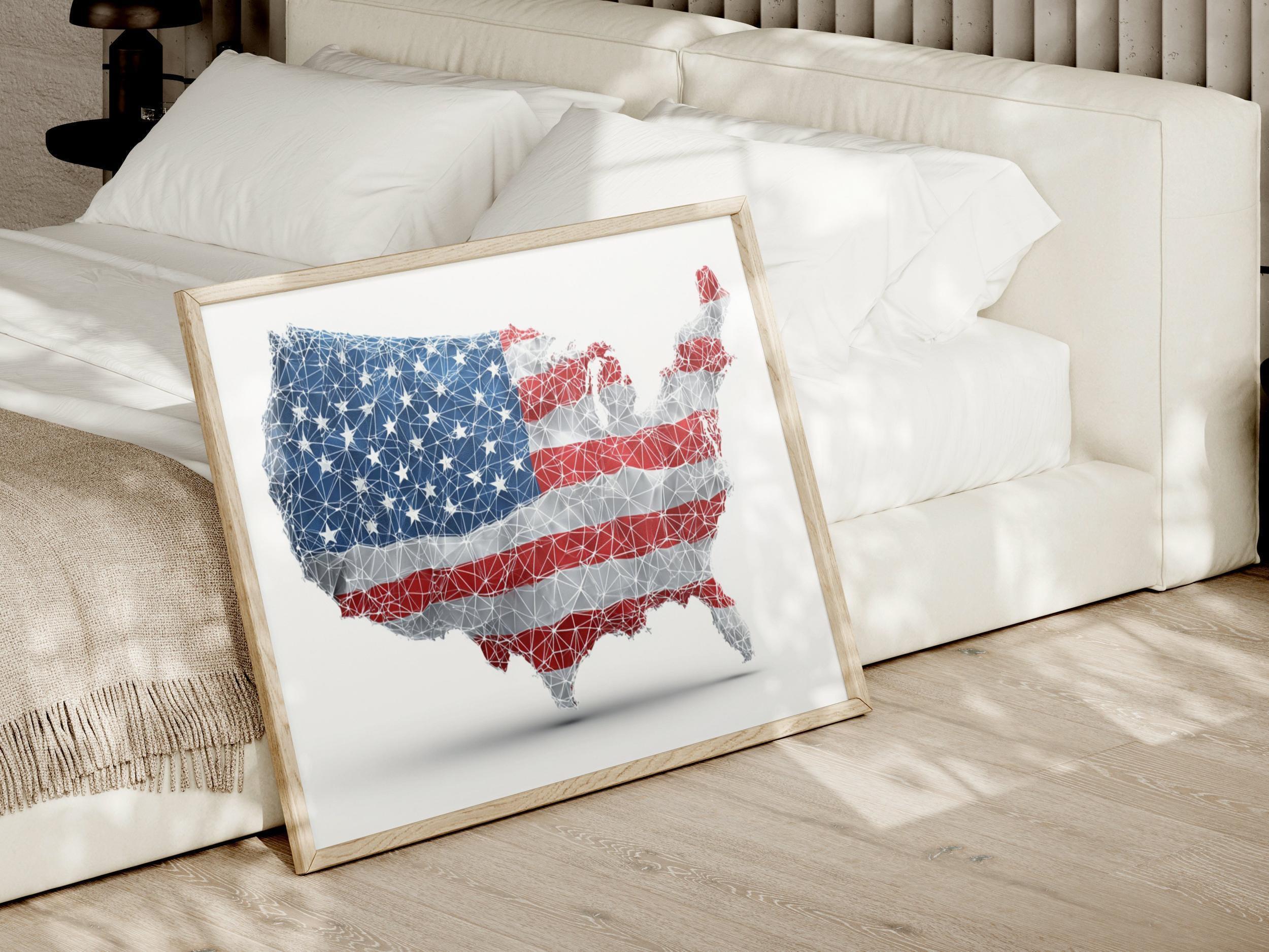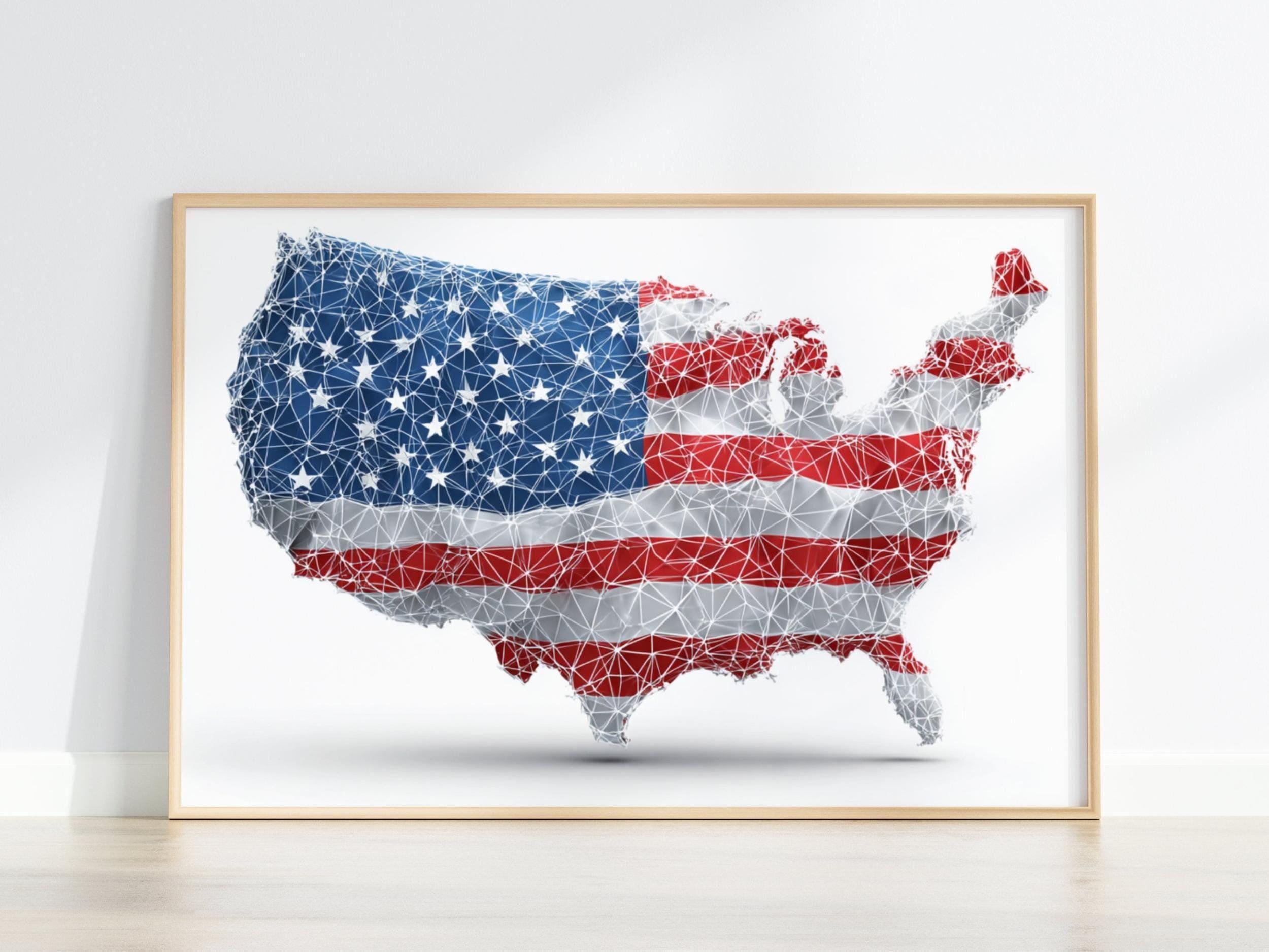 Celebrate your national pride with this striking geometric USA map wall art, featuring a modern abstract map design with an American flag overlay. This digital download brings a fresh, stylized take on patriotic decor, blending the classic red, white, and blue colors seamlessly into a network of polygons and lines. Perfect for adding a contemporary touch to your living room, office, or entryway, this piece embodies both artistic flair and meaningful symbolism.