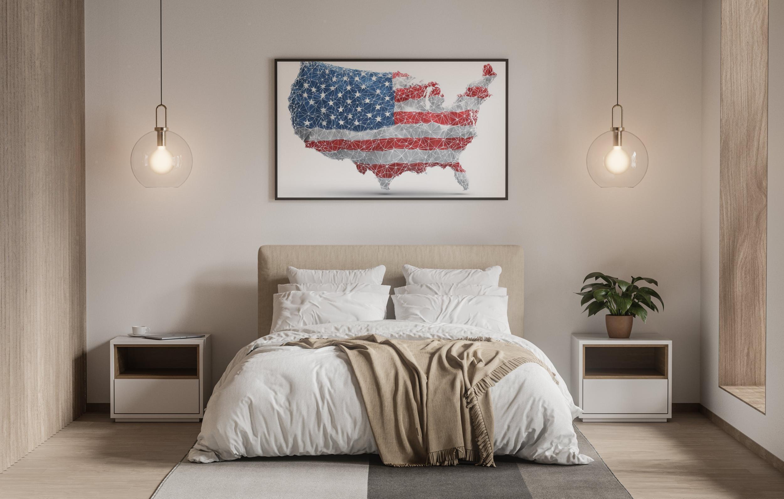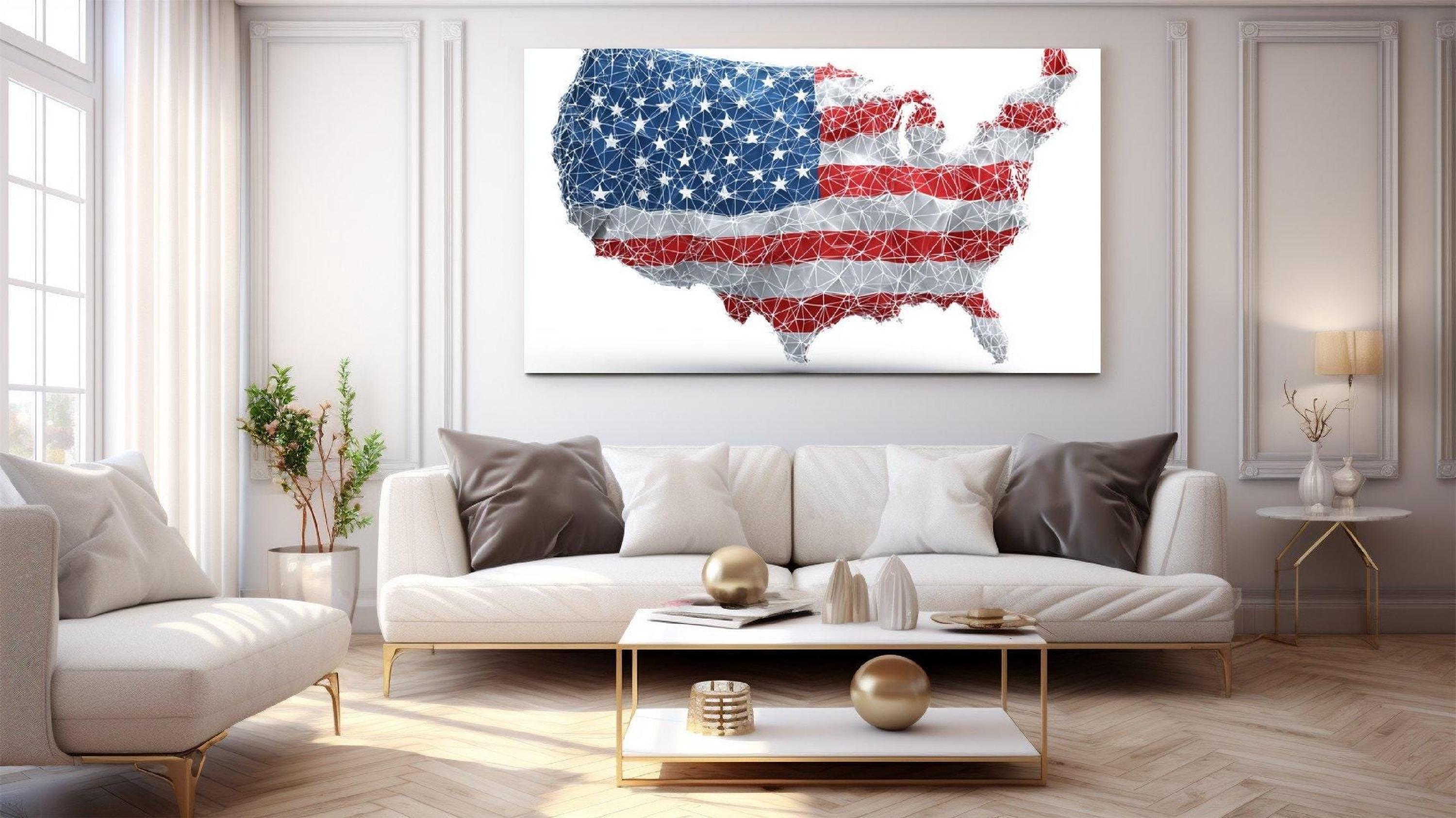 - ✅ Modern abstract country shape with a geometric American flag overlay for a unique, eye-catching look