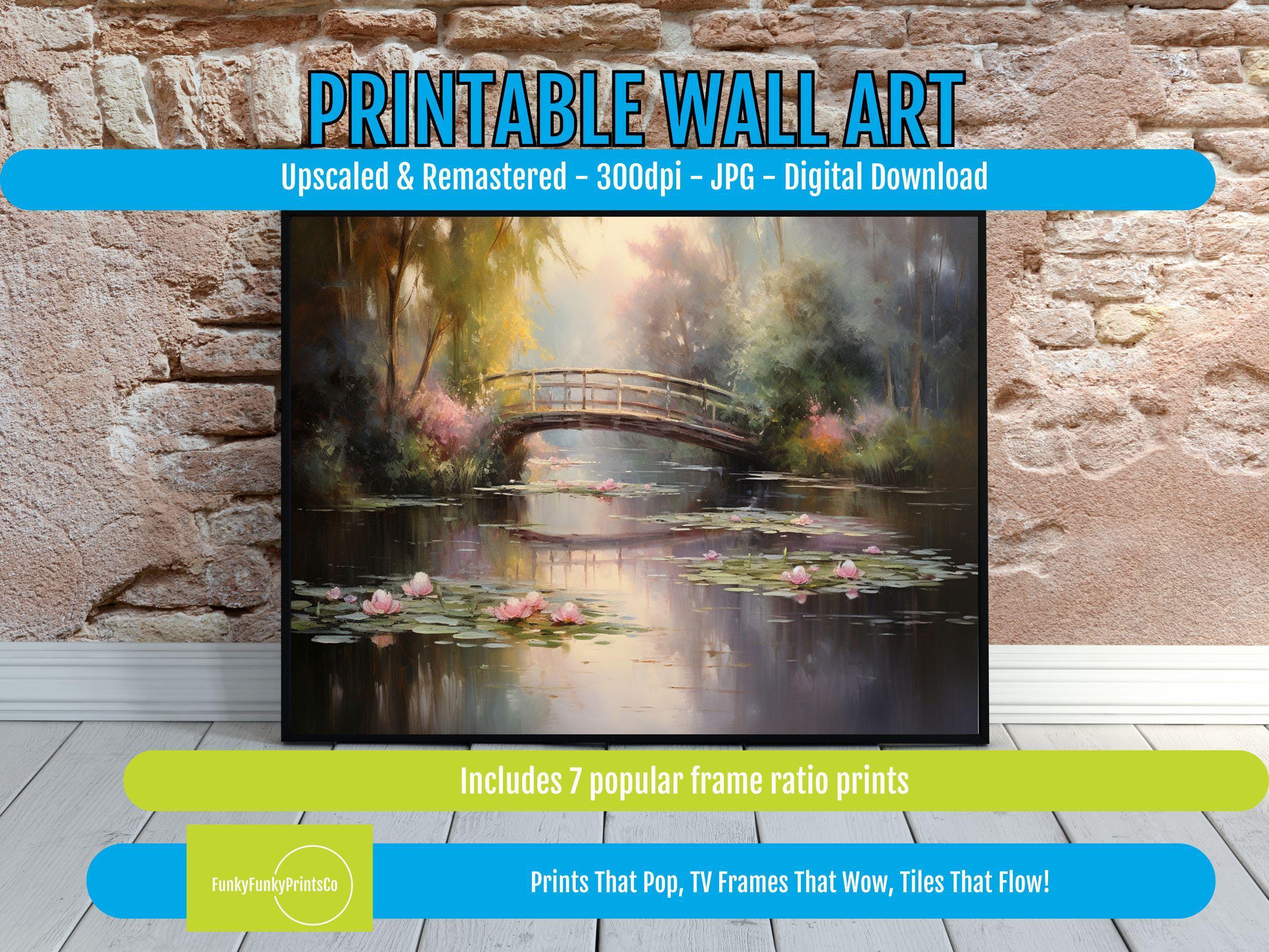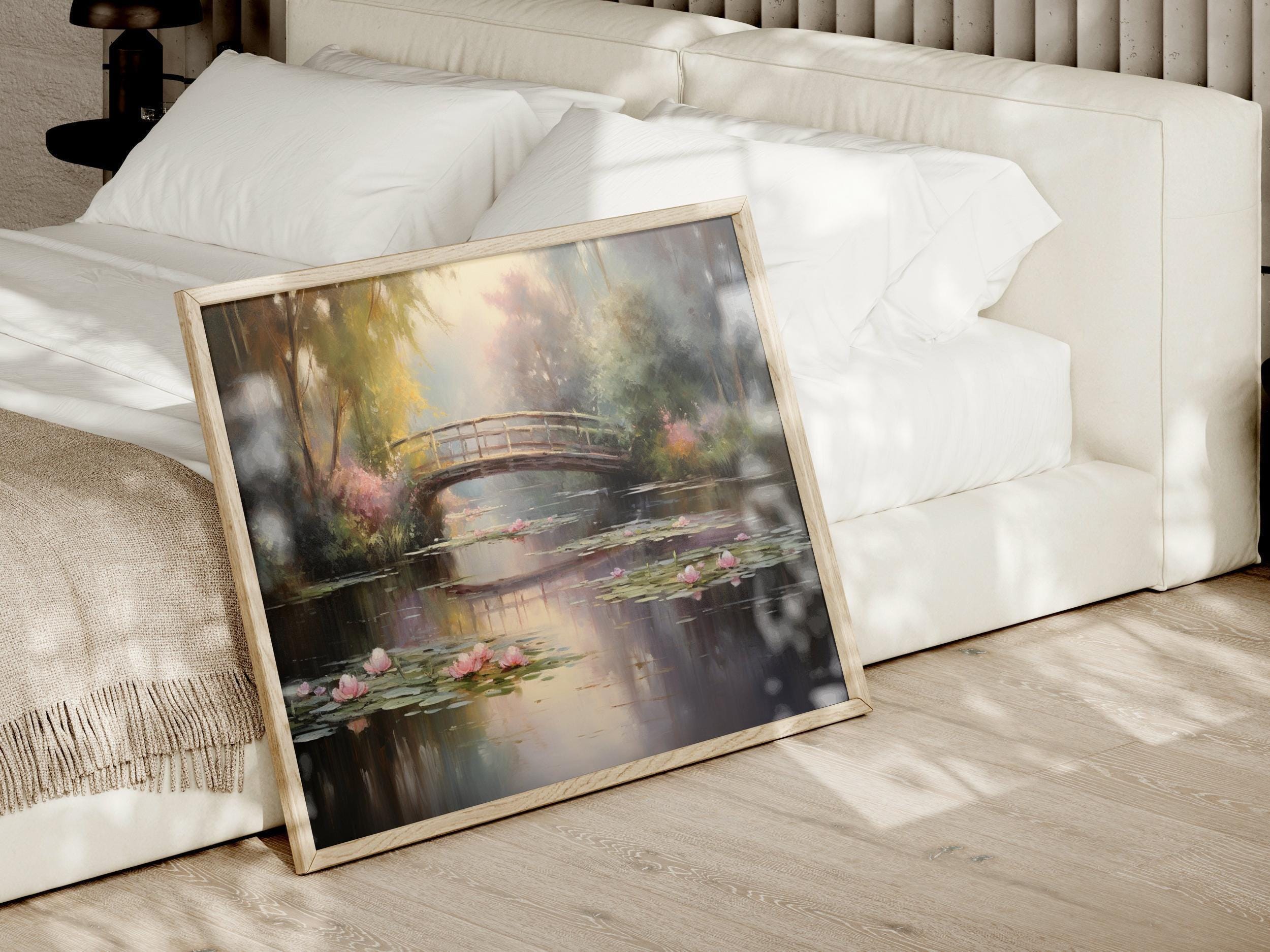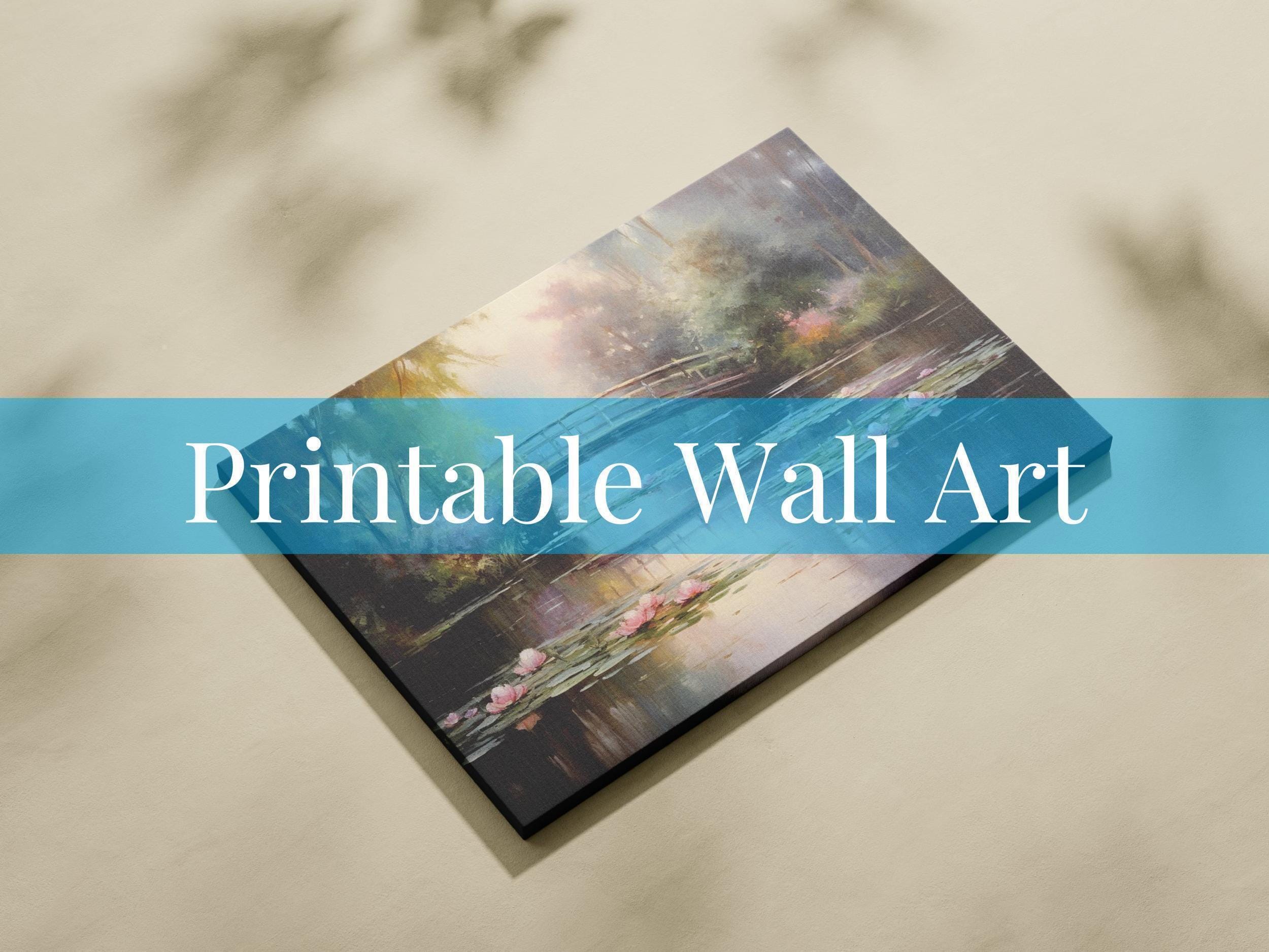 Step into a world of serene beauty with this tranquil landscape featuring a peaceful water lily pond, a charming wooden bridge, and lush greenery. Inspired by the gentle harmony of nature, this digital art piece captures the soft light and calm water scene that invites quiet reflection and relaxation. Perfect for adding a touch of natural beauty and pink blossom art to your printable home decor collection.
