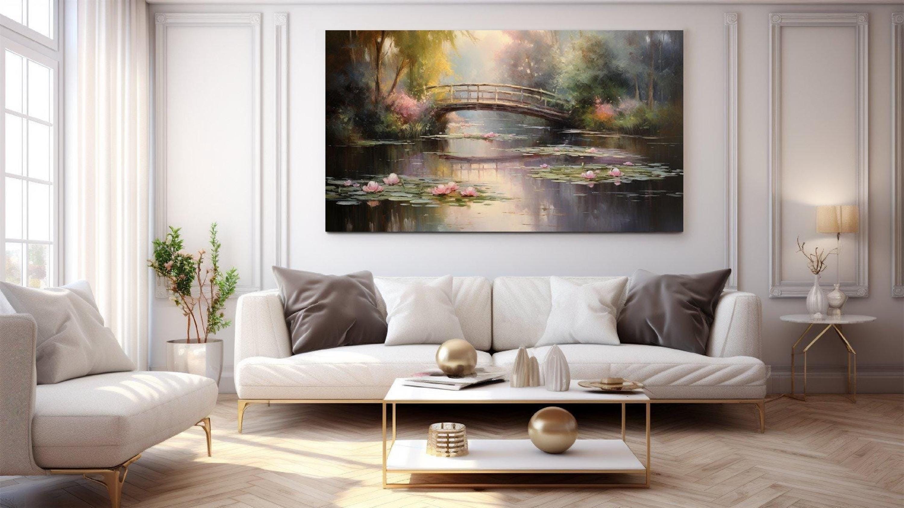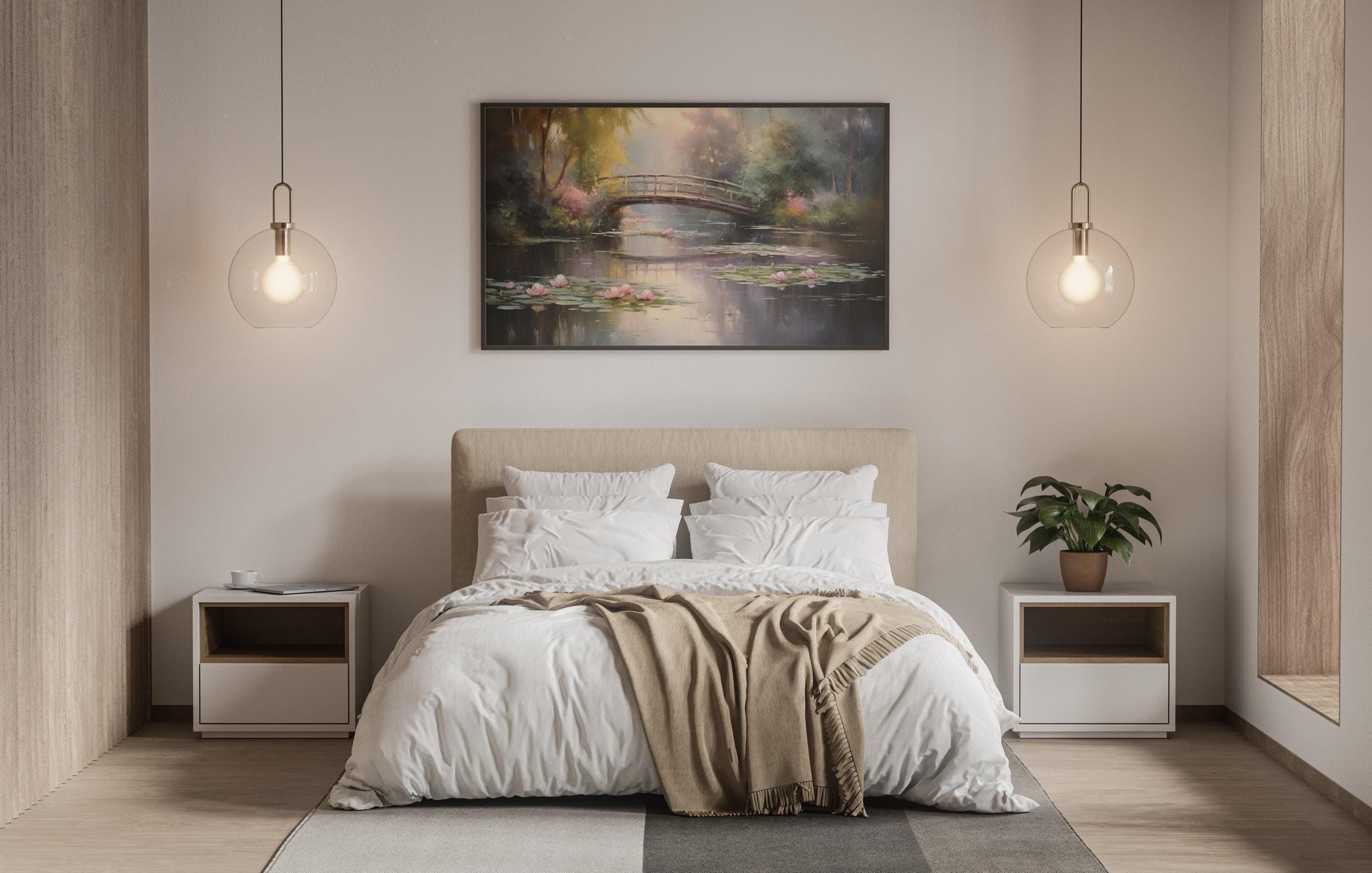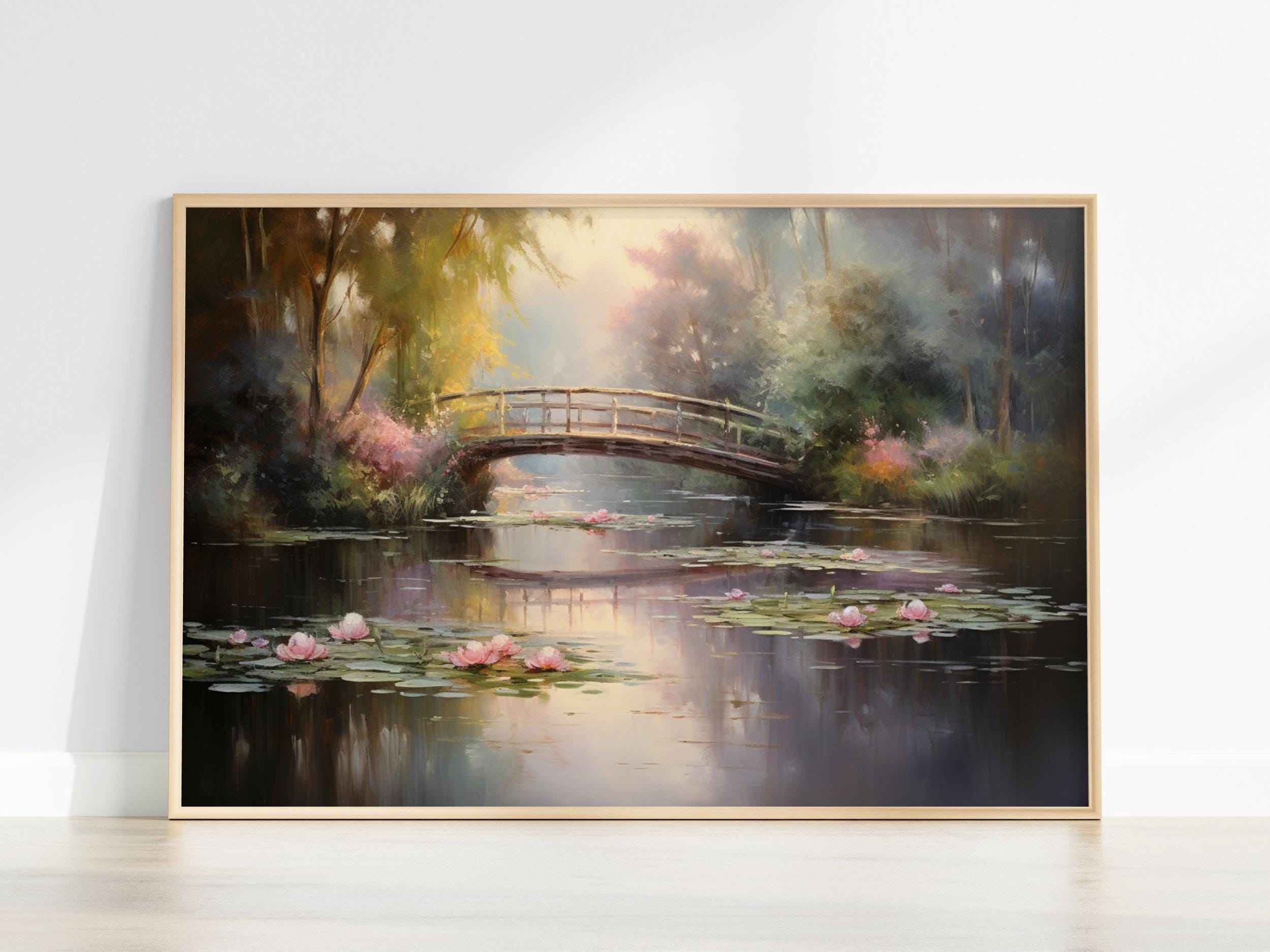Step into a world of serene beauty with this tranquil landscape featuring a peaceful water lily pond, a charming wooden bridge, and lush greenery. Inspired by the gentle harmony of nature, this digital art piece captures the soft light and calm water scene that invites quiet reflection and relaxation. Perfect for adding a touch of natural beauty and pink blossom art to your printable home decor collection.