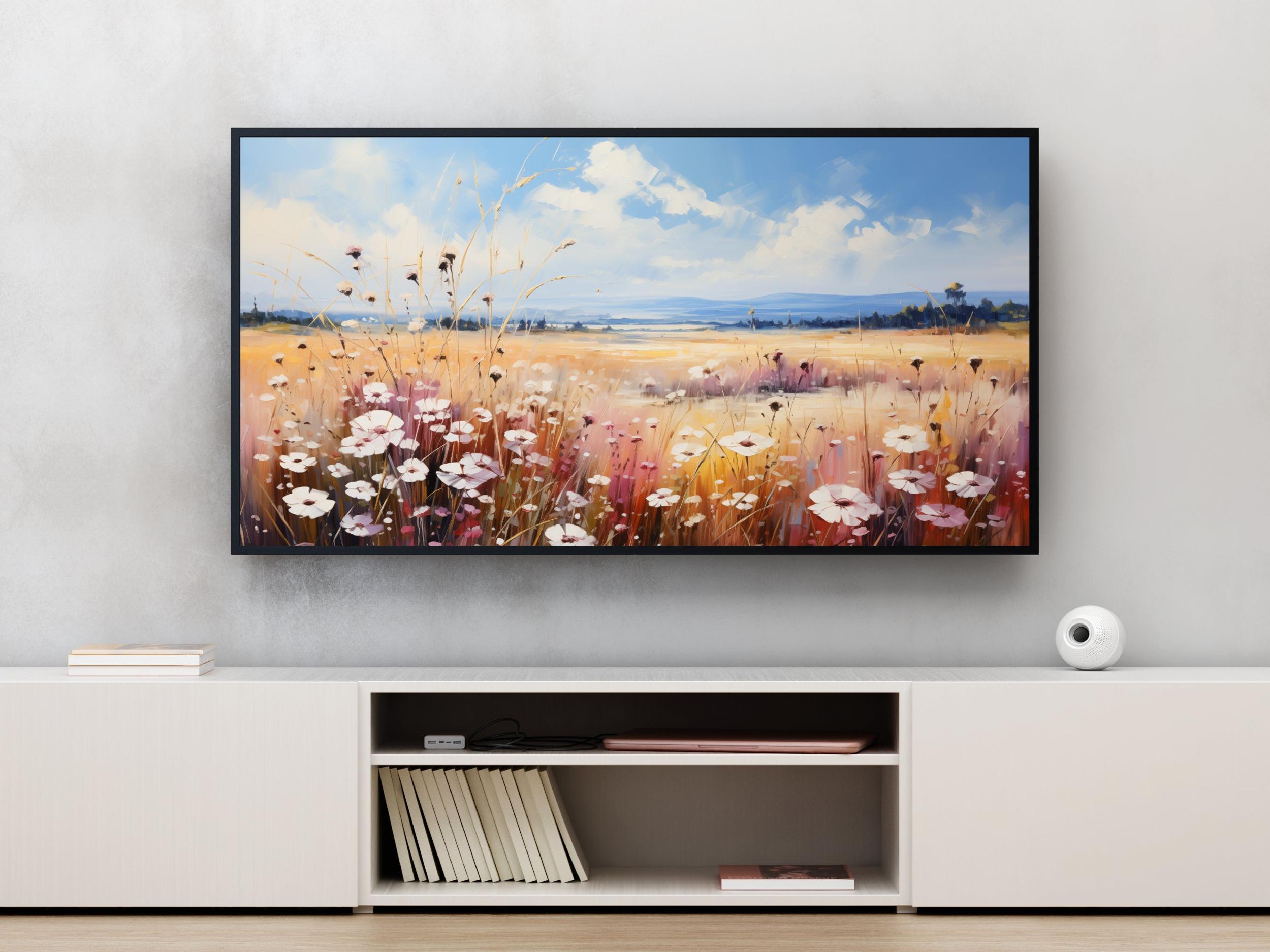 Look further and you’ll see rolling hills fading into shades of blue and purple, with fluffy clouds drifting overhead for a peaceful nature vibe. The warm, inviting palette enhances the serene landscape, creating a tranquil scene that captures the essence of a sun-kissed day in a flowering meadow. This piece adds blue sky art and vibrant spring energy to any space, making it a strong choice for your wall decor ideas.