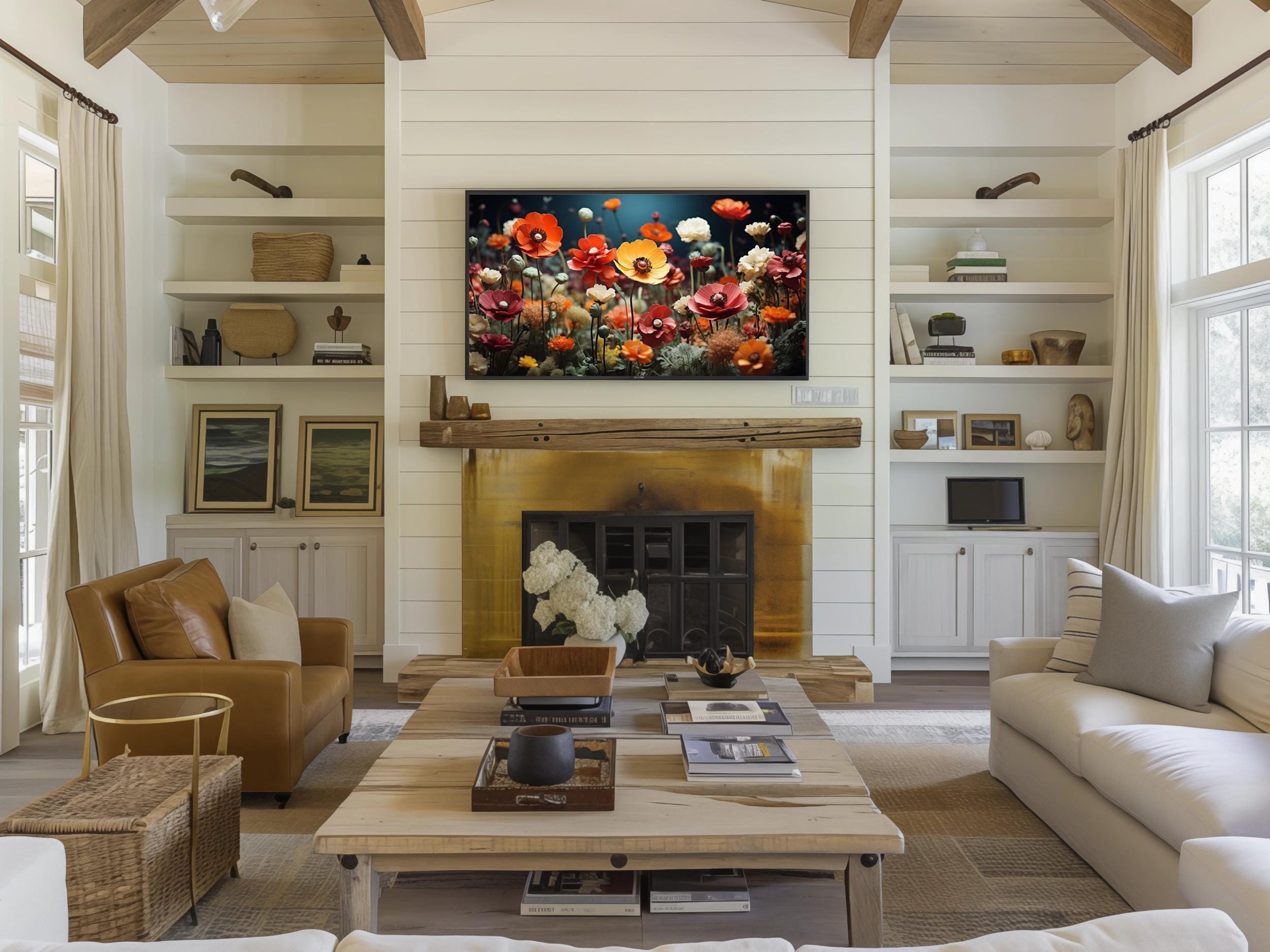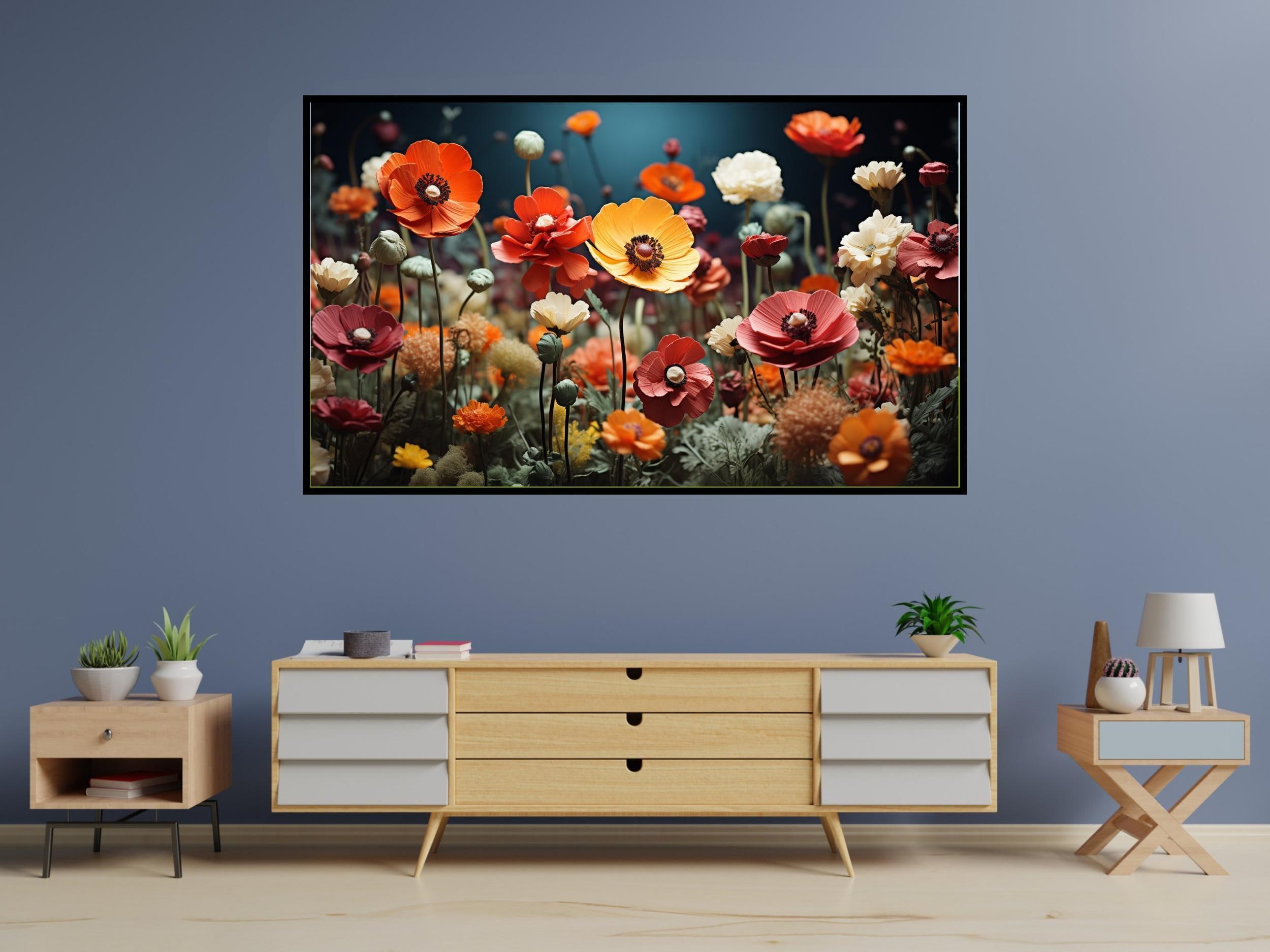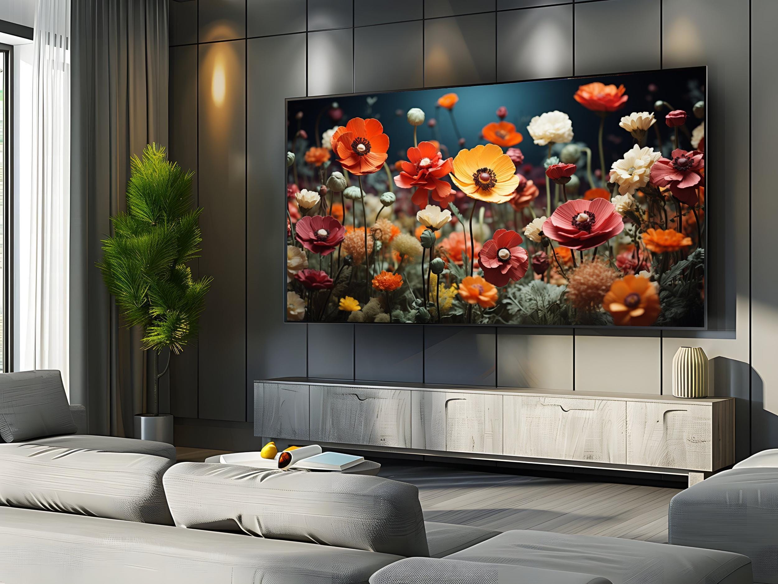 Step into a vibrant floral field where colorful blooms come alive in a mesmerizing digital floral art piece designed especially for Samsung Frame TVs. This lush flower meadow decor captures the warm golden lighting that bathes each realistic flower, creating a dreamlike and magical atmosphere. Perfect for adding a splash of natureโs beauty to your home decor digital collection, this artwork invites you to experience the serene charm of a dense flower field from the comfort of your living room.