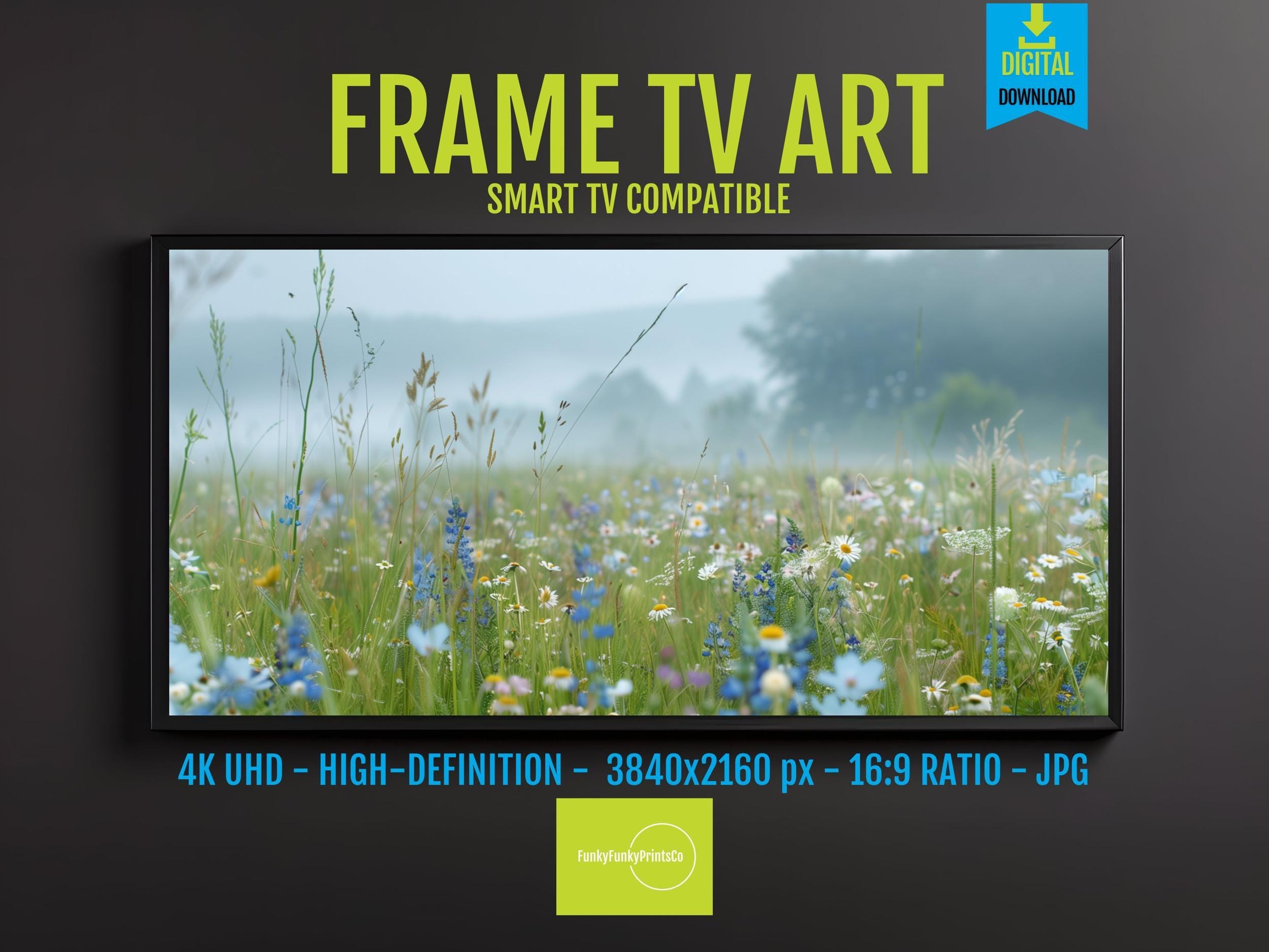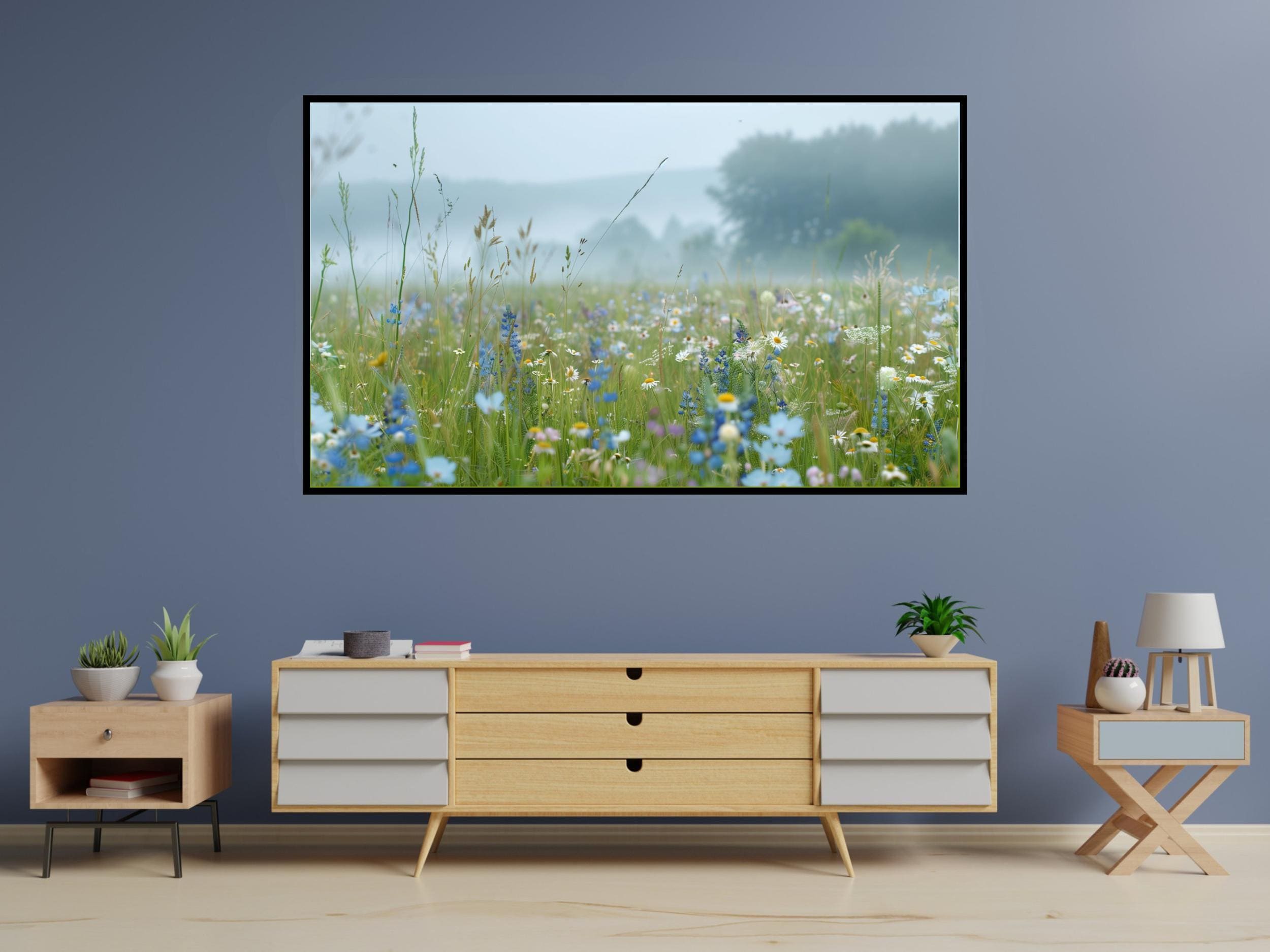 Step into a tranquil wildflower meadow where early morning mist softly blankets vibrant blue and purple flowers, creating a peaceful screen art experience like no other. This 4K UHD nature print brings the serenity of a misty morning to life with crisp detail and calming hues, perfect for anyone seeking a nature-inspired gift or a soothing addition to home decor. Inspired by the gentle beauty of meadow grasses swaying under soft light, this digital artwork transforms your screen into a serene landscape retreat.