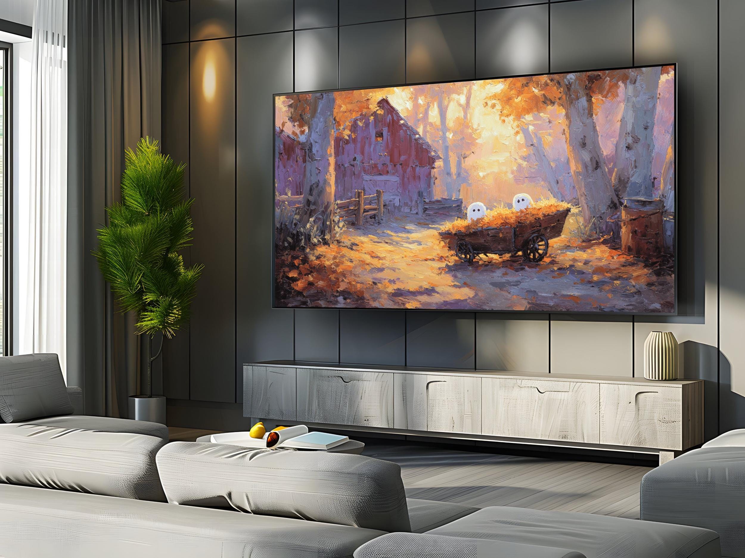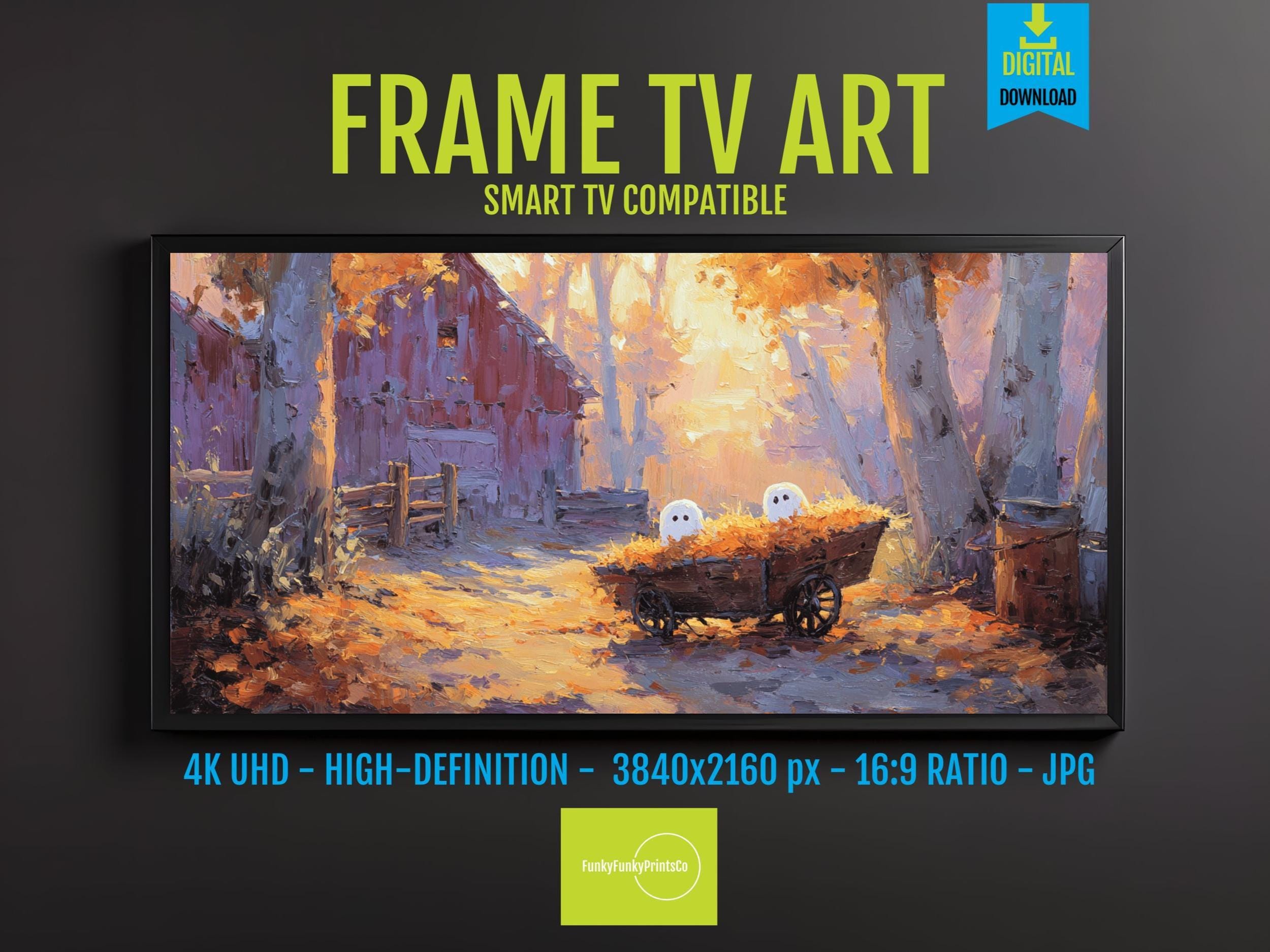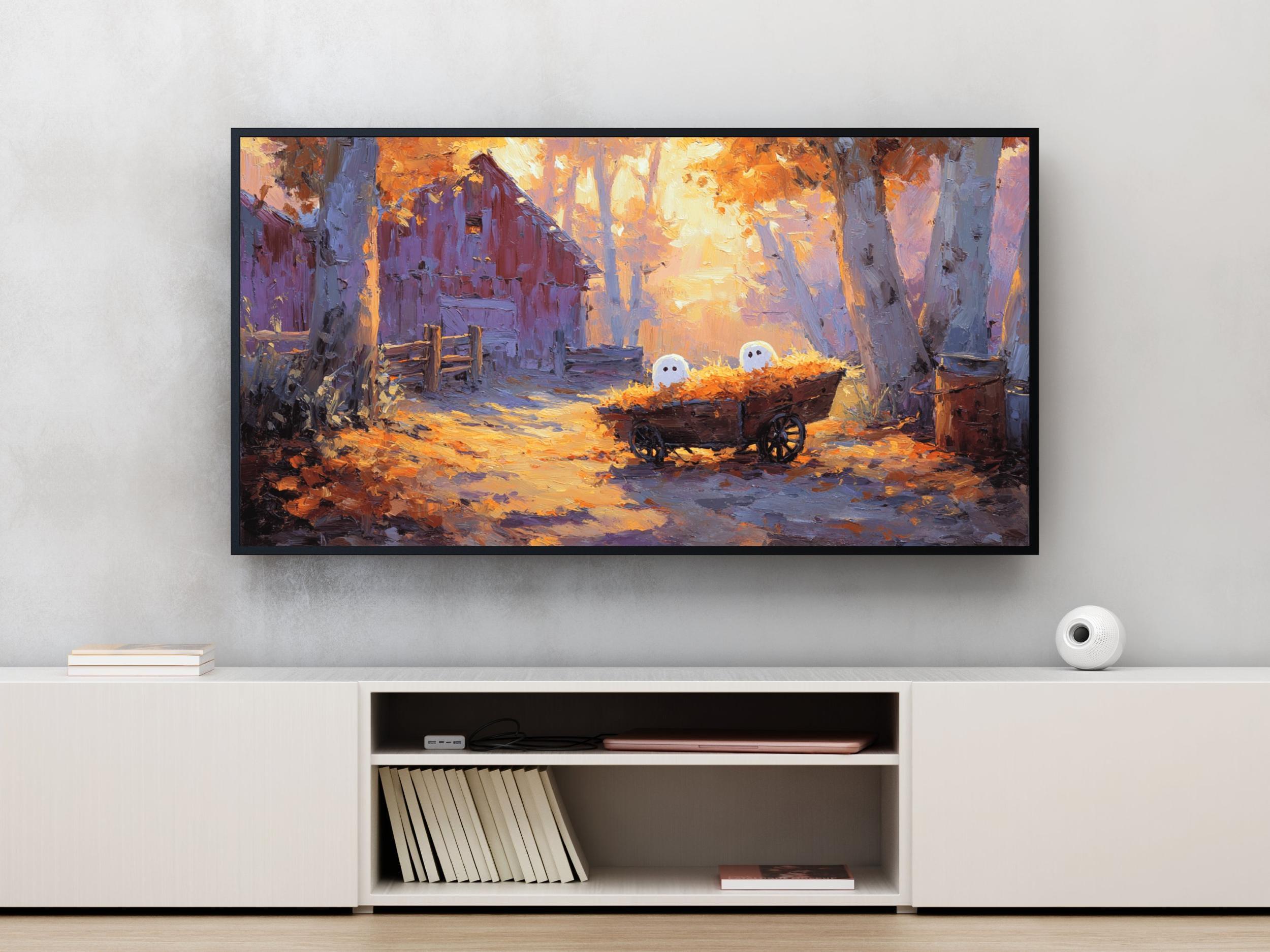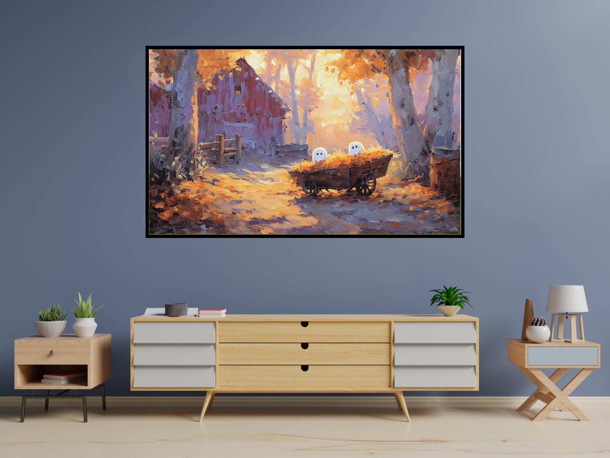 Step into a serene rural autumn scene where warm lighting and rustic charm come alive on your screen. This cozy autumn barn setting features a hay filled cart along a quiet path, framed by vibrant autumn foliage glow that captures nature inspired art at its finest. Playful ghost figures add a whimsical touch, making this digital autumn decor perfect for your Samsung Frame TV or any compatible 4K UHD display.