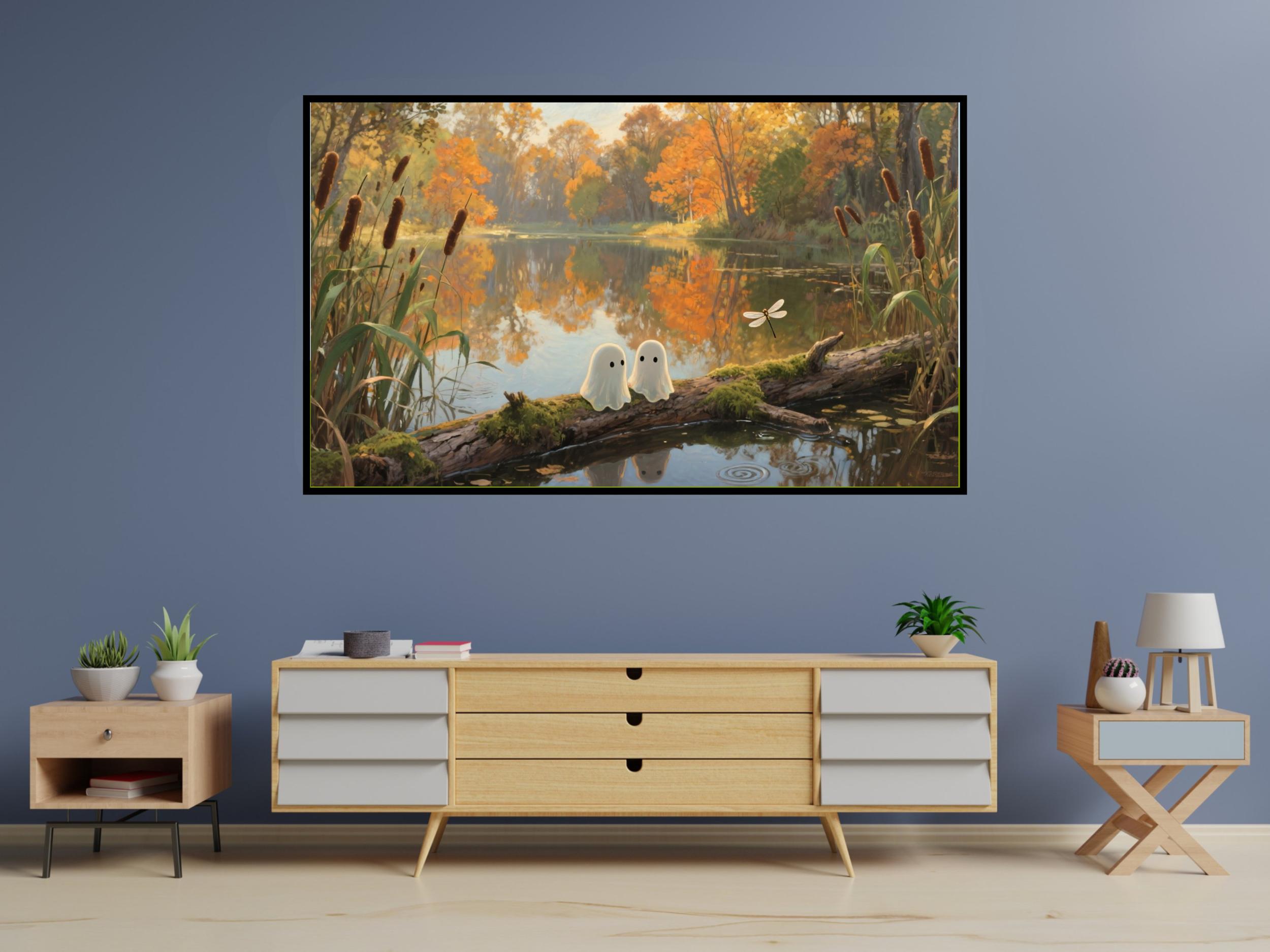 The image shows a peaceful scene set in a serene autumn landscape by calm waters. In the foreground, you’ll notice a moss covered log stretching gently over the water, where two cute cartoon ghosts with expressive eyes sit together. Their playful, simplistic forms bring whimsical charm to the nature scenery, and embody the essence of cute characters and digital art. Around them, tall grasses and cattails grow, rooting the ghosts in a tranquil, serene environment.