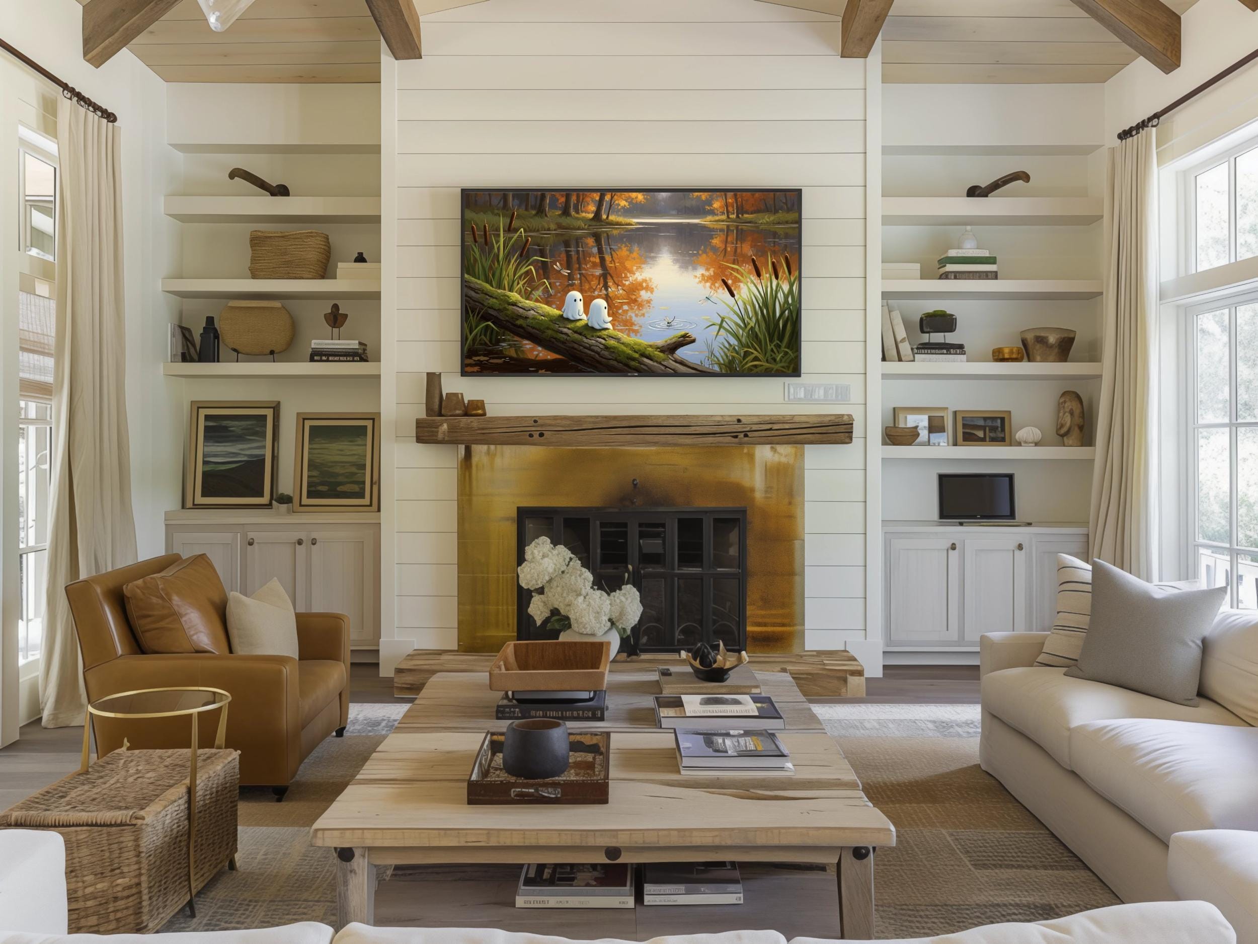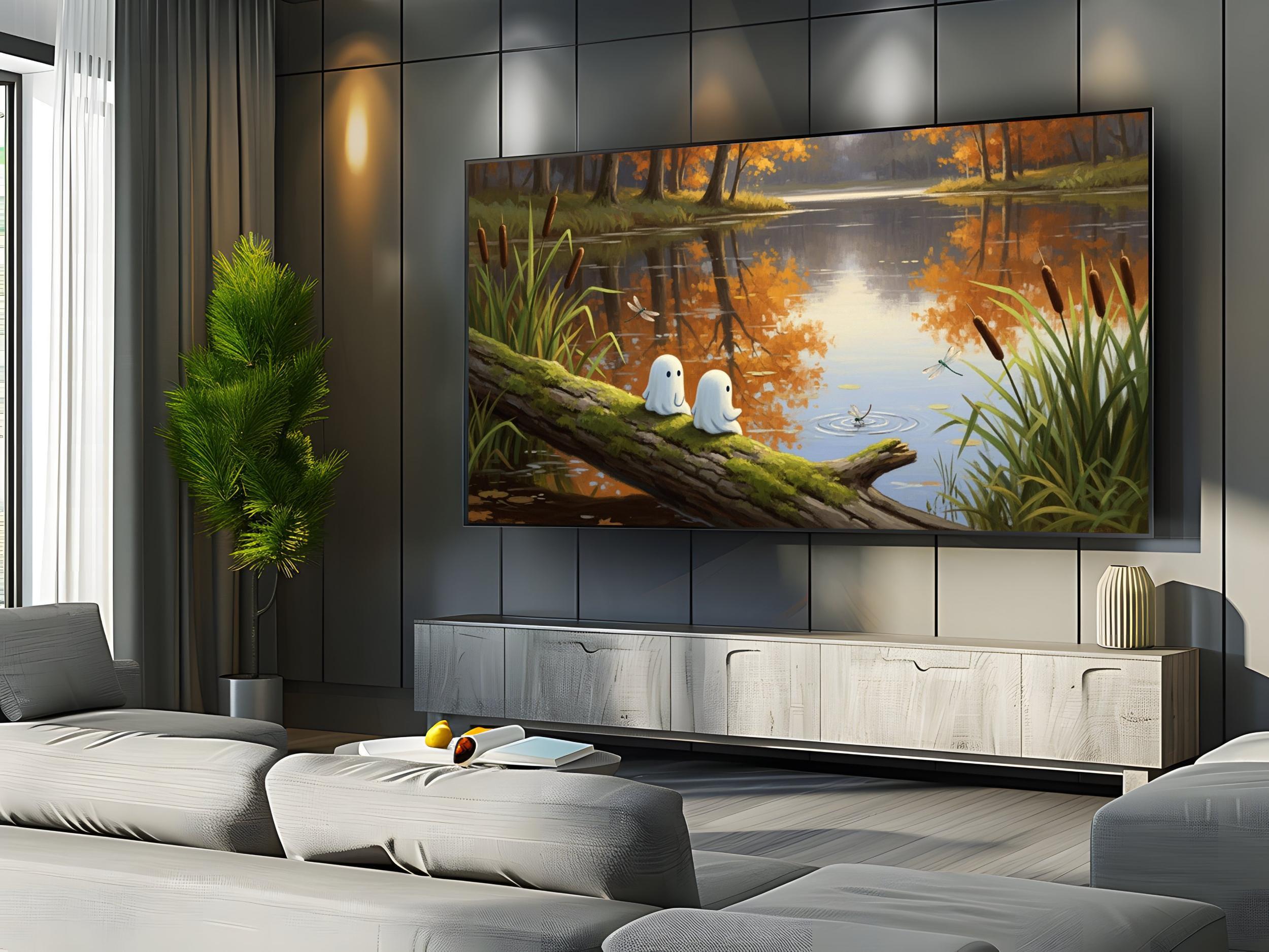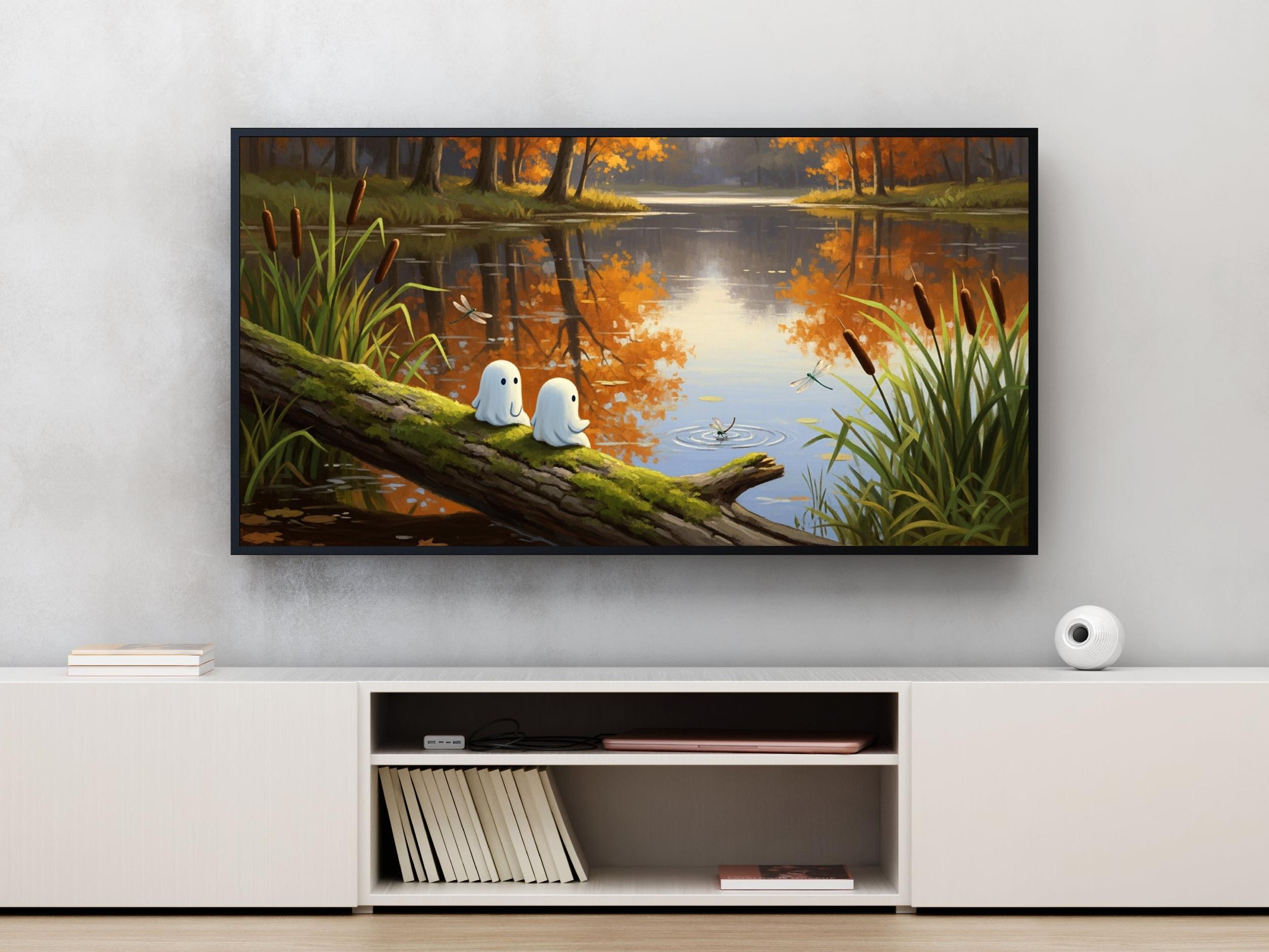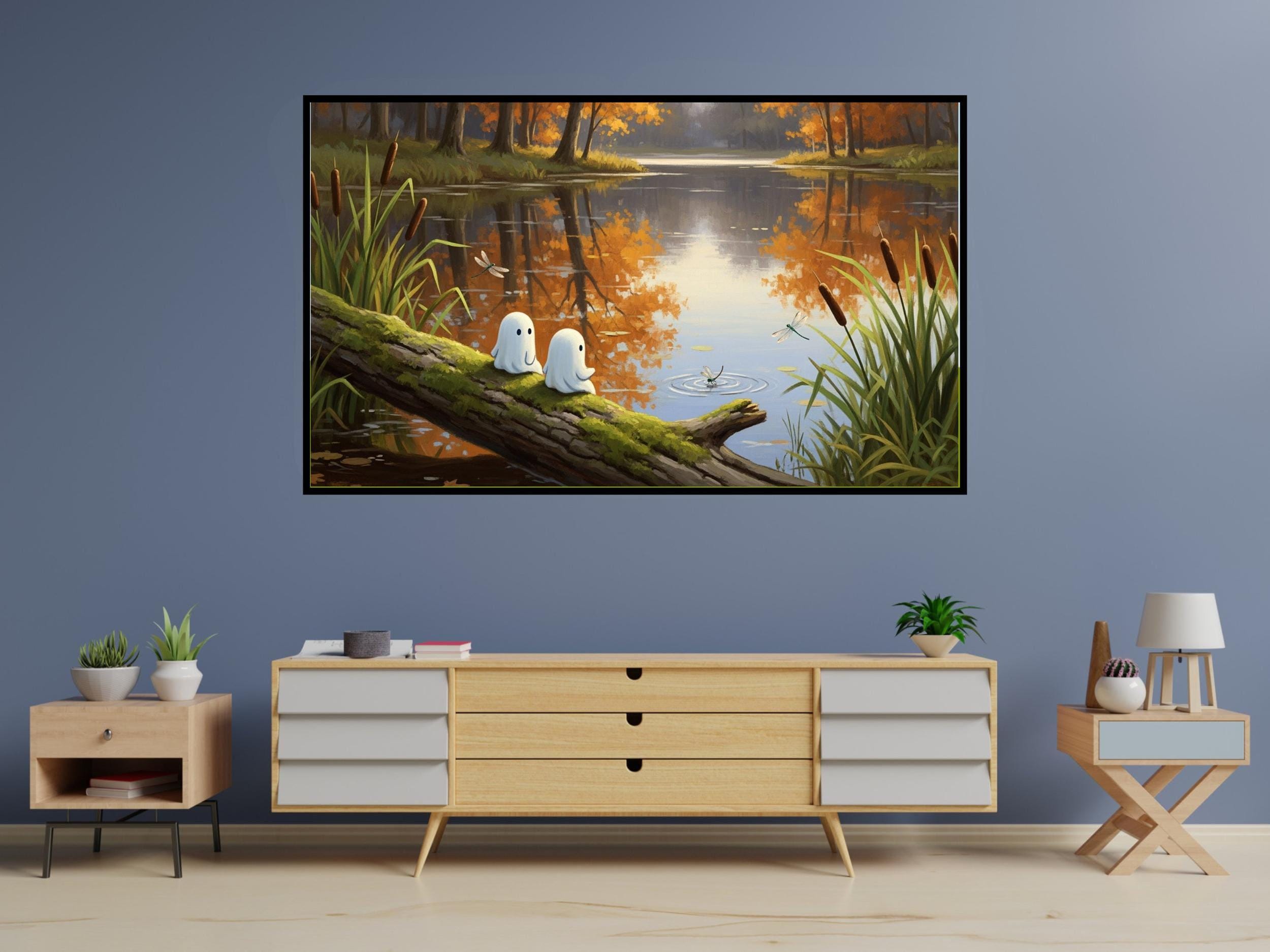 Step into a serene autumn landscape where playful fall foliage meets charming cartoon ghosts, bringing a whimsical spirit to your digital collection. This 4K instant download captures the vibrant colors of fall in an animated style, perfect for adding a touch of colorful fall decor to your space. Inspired by peaceful waters and fluttering dragonflies, this digital art invites you to enjoy a delightful blend of nature and imagination.