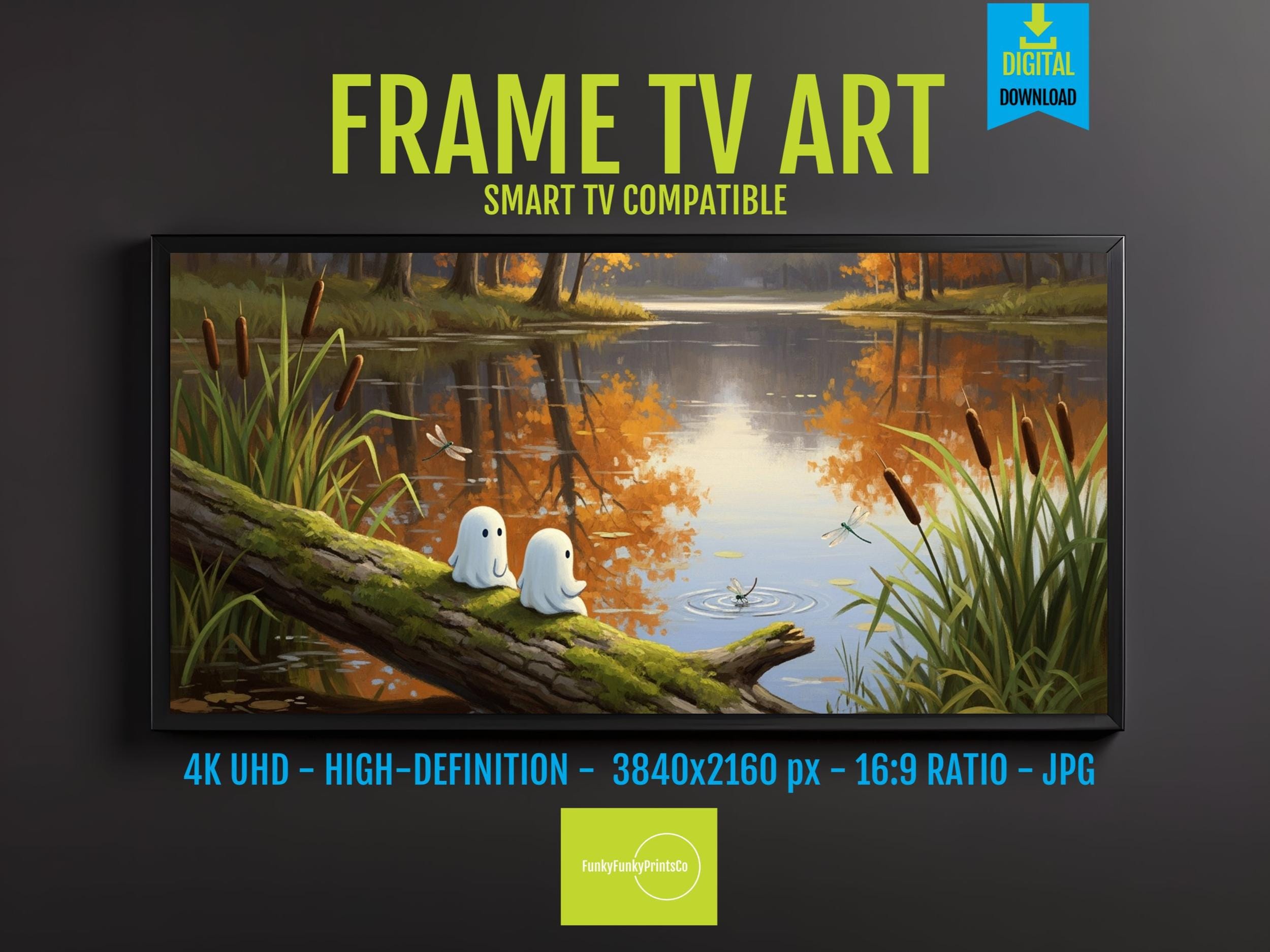The image features a serene autumn landscape in an animated style, set by a calm body of water. In the foreground, two small cartoon ghosts with rounded shapes and friendly expressions sit playfully on a log, bringing a whimsical scene to life. Surrounded by lush green grasses and cattails, this nature scene is further enhanced by vibrant fall foliage in shades of orange and yellow reflecting on the water, creating truly colorful art.