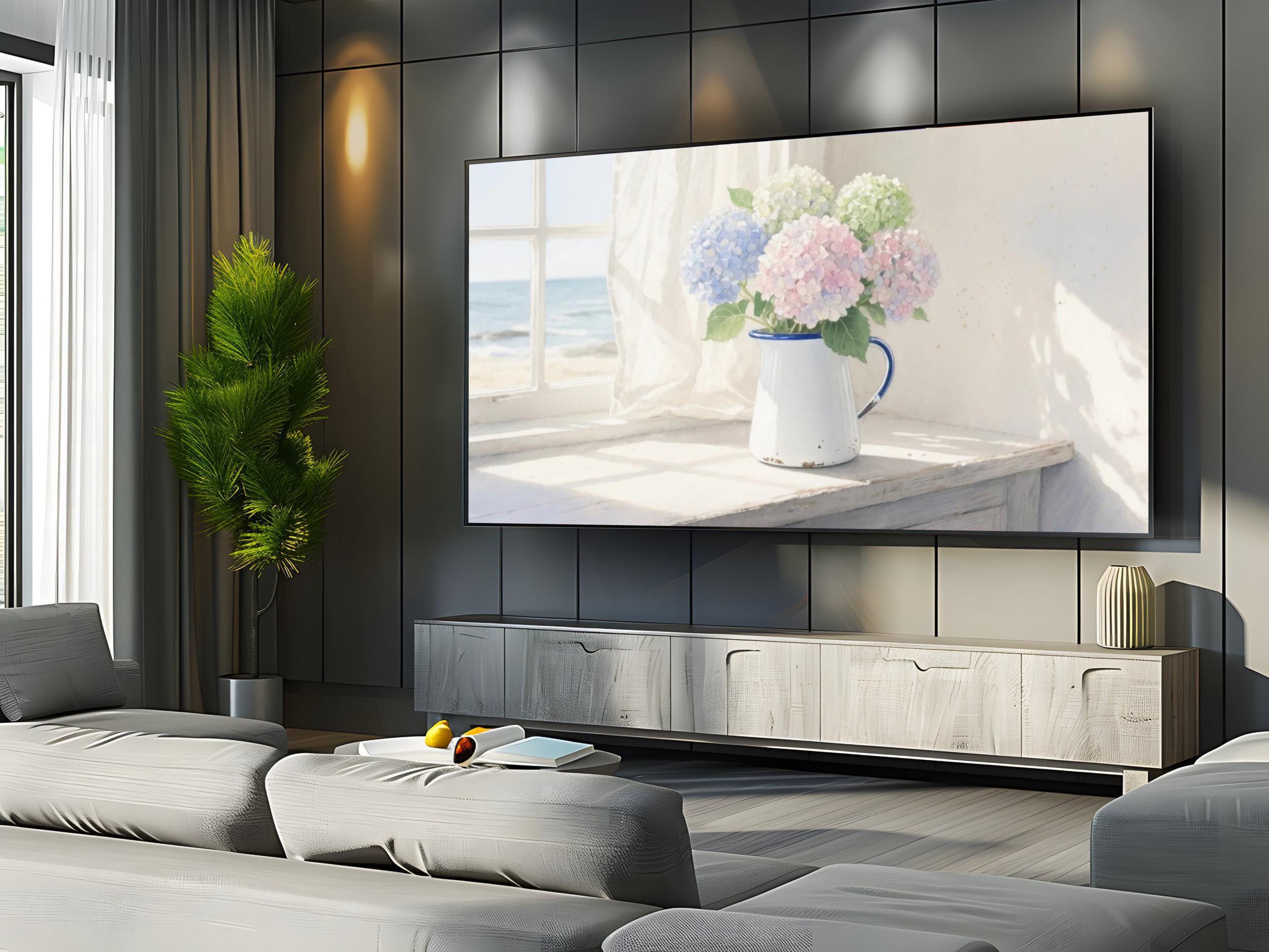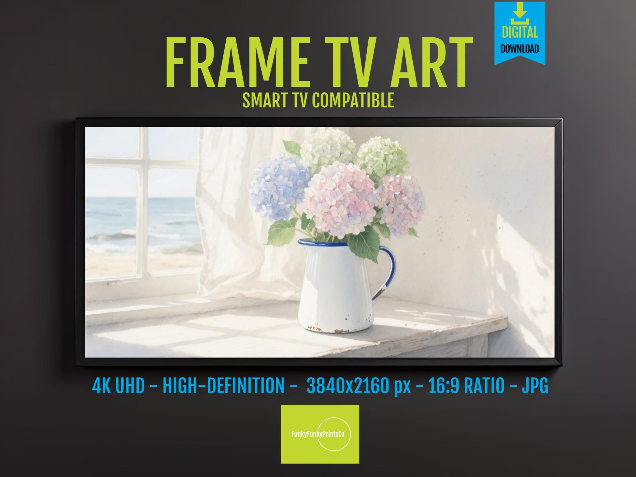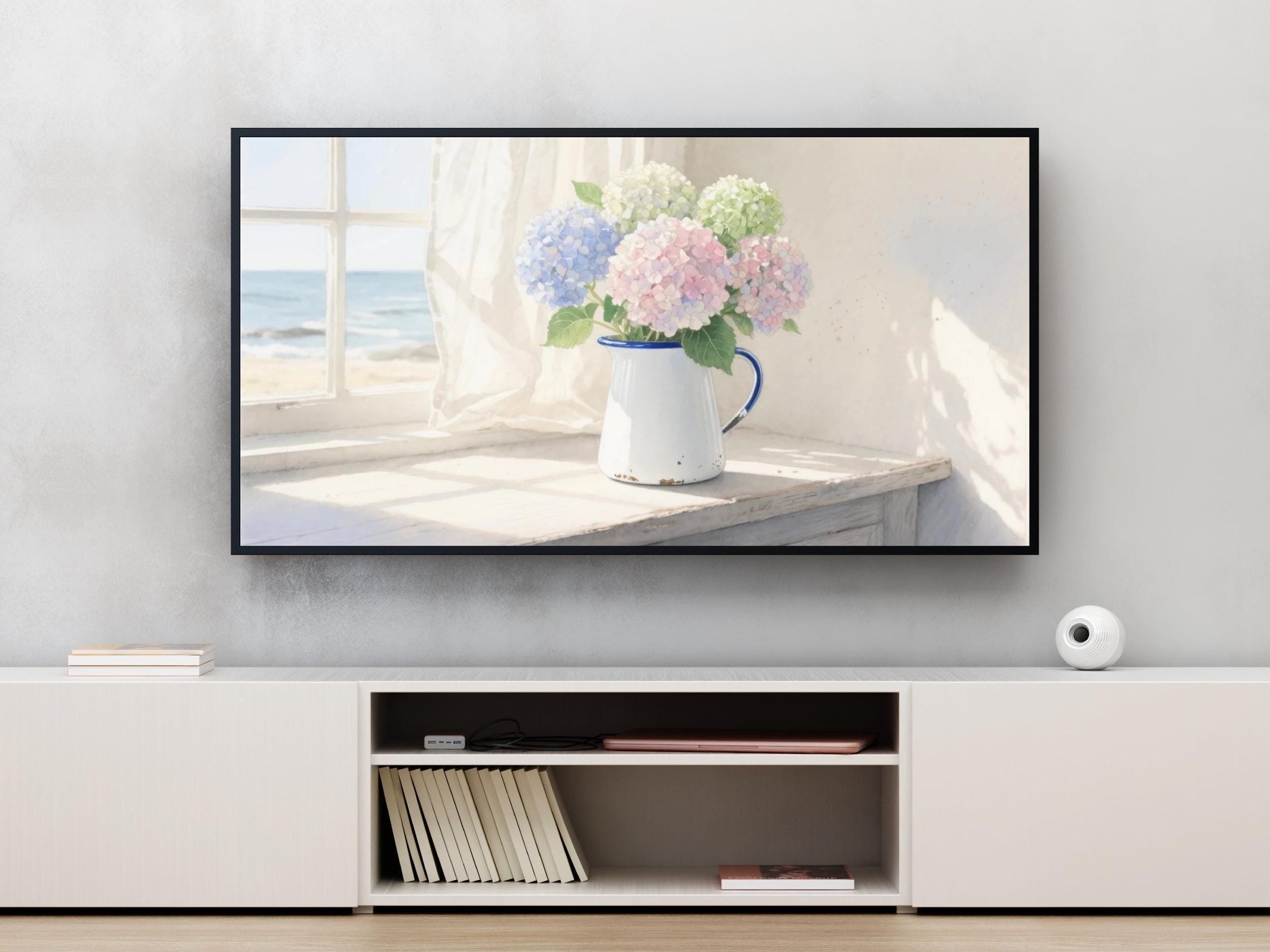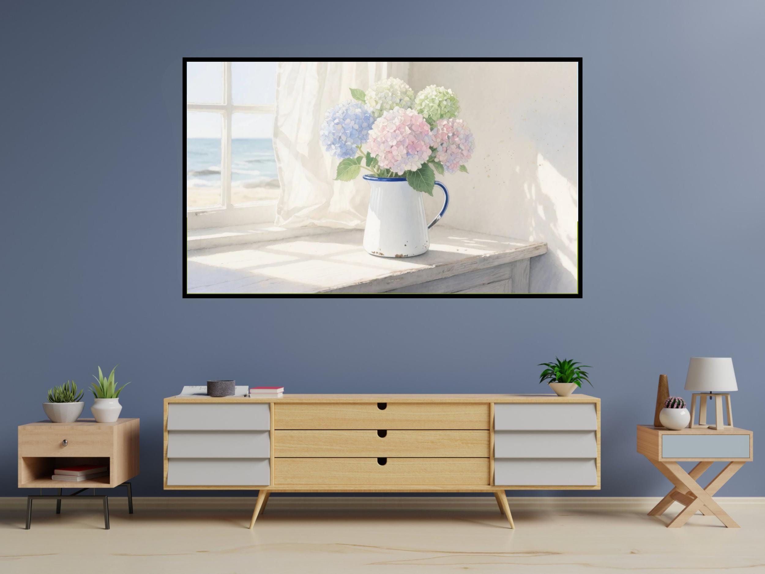 Immerse yourself in the gentle beauty of this hydrangea bouquet, rendered in soft pastel hues that bring a calming home decor touch to any digital space. Inspired by rustic coastal decor, the watercolor print captures a serene interior scene with a white pitcher vase that adds a charming, timeless feel. Perfect as a floral screen saver or digital art piece, this 4K digital art invites tranquility and subtle elegance into your everyday environment.