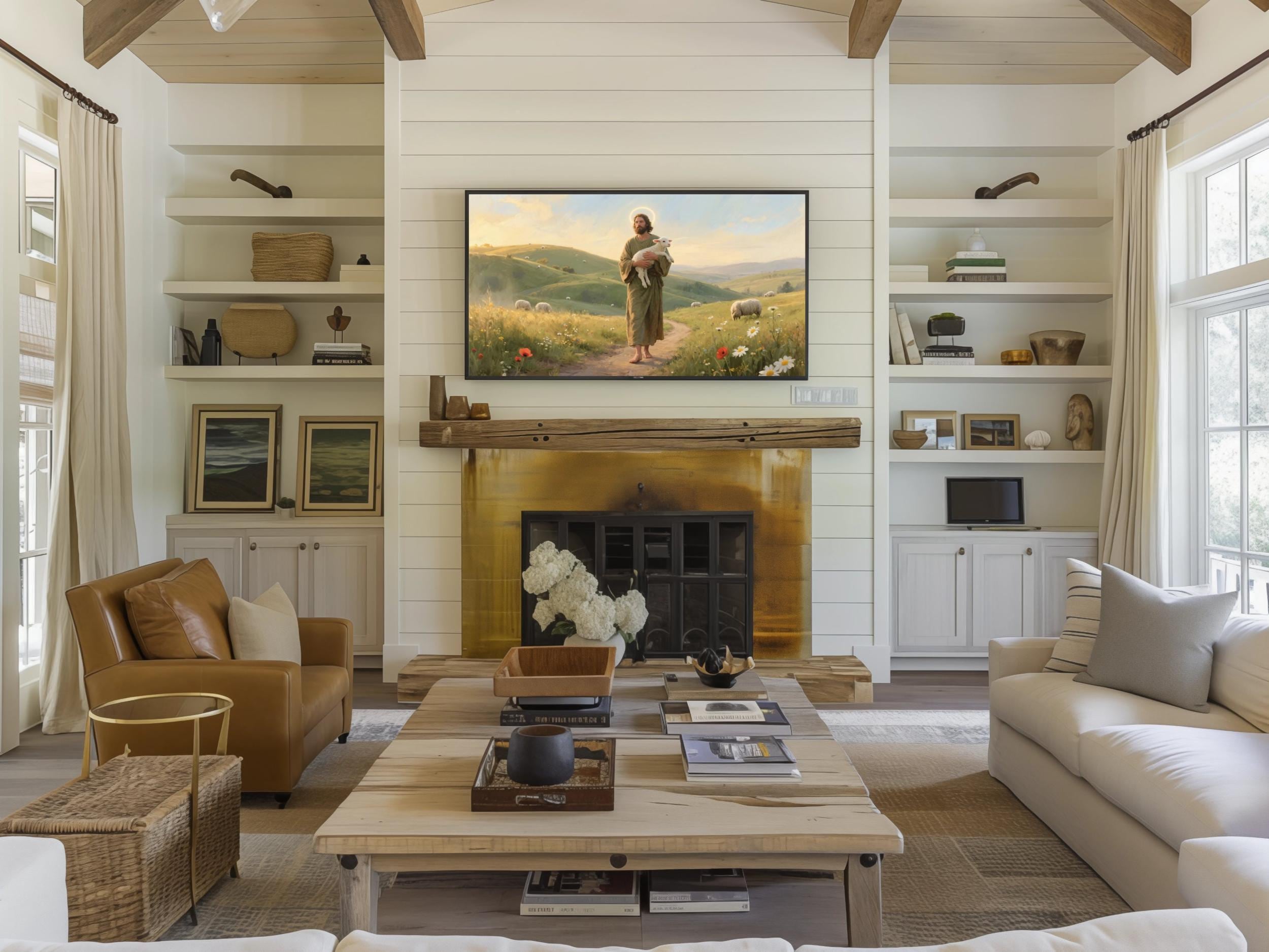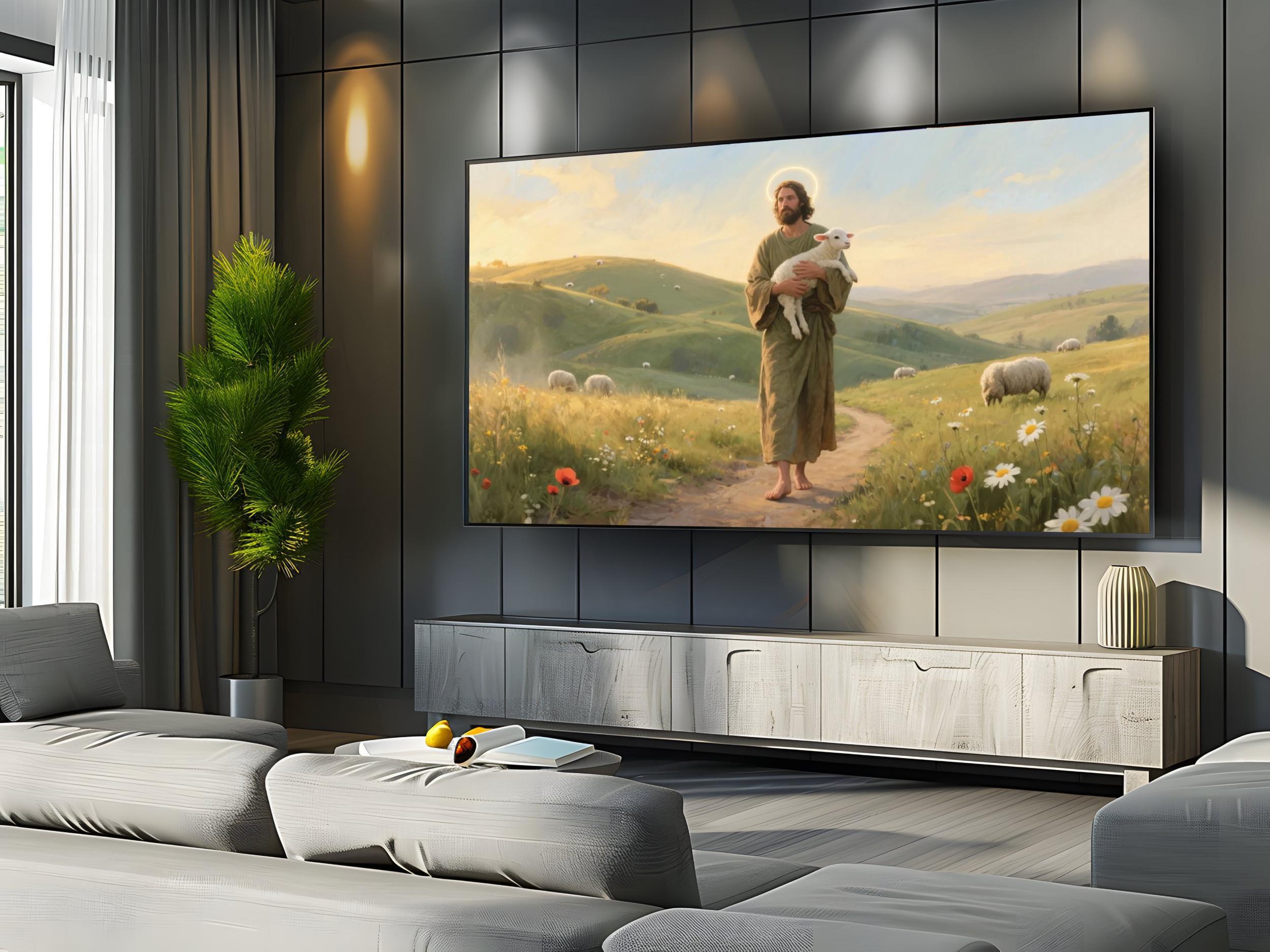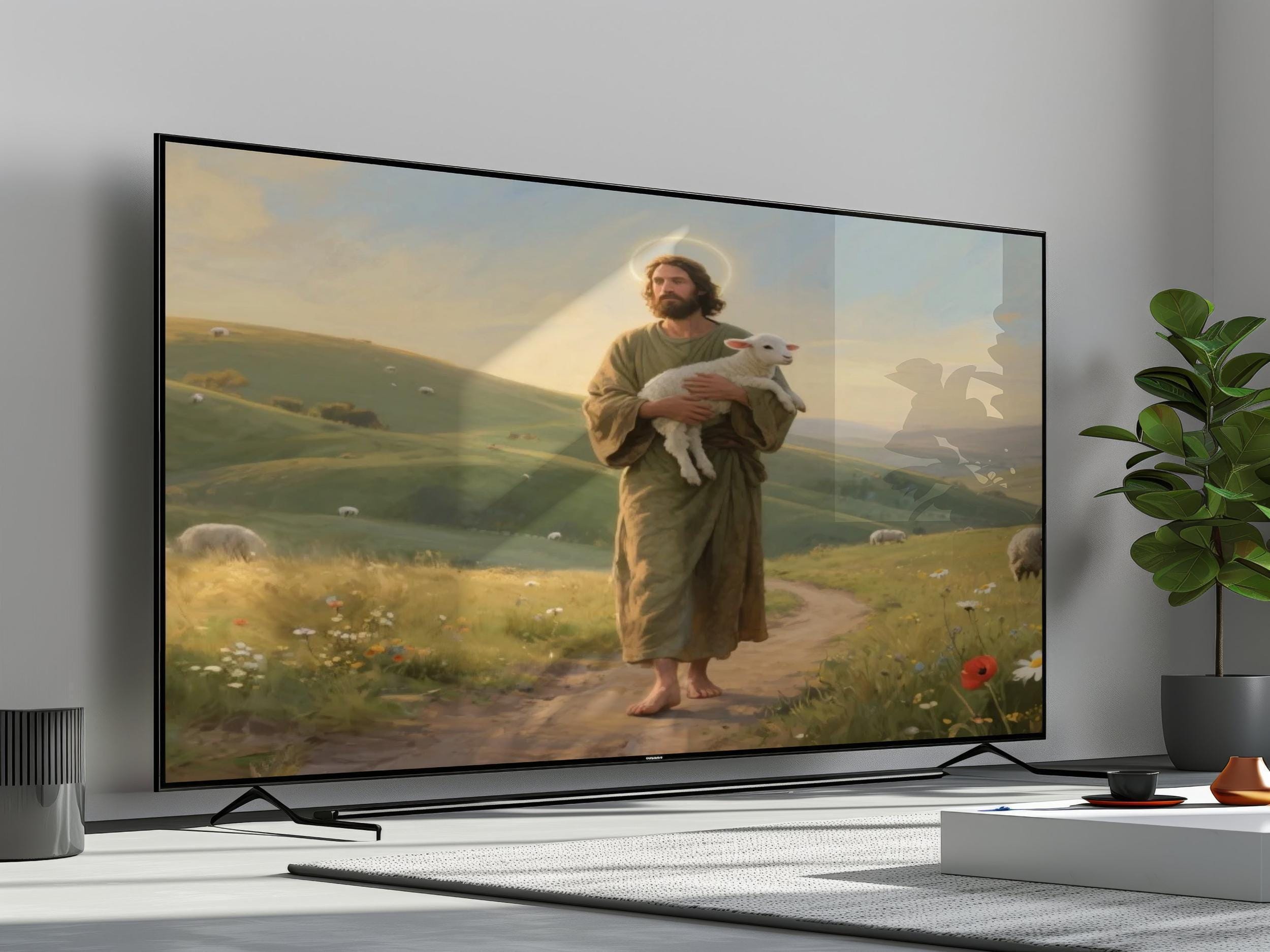 Immerse yourself in a serene digital decor piece that captures the gentle beauty of rolling green hills and a peaceful harmony sheep scene. This tranquil art, bathed in warm golden light, invites calm dawn reflections and a quiet connection with nature. Perfect as a 4k UHD digital download, it transforms your home screen into a heavenly quality sanctuary.