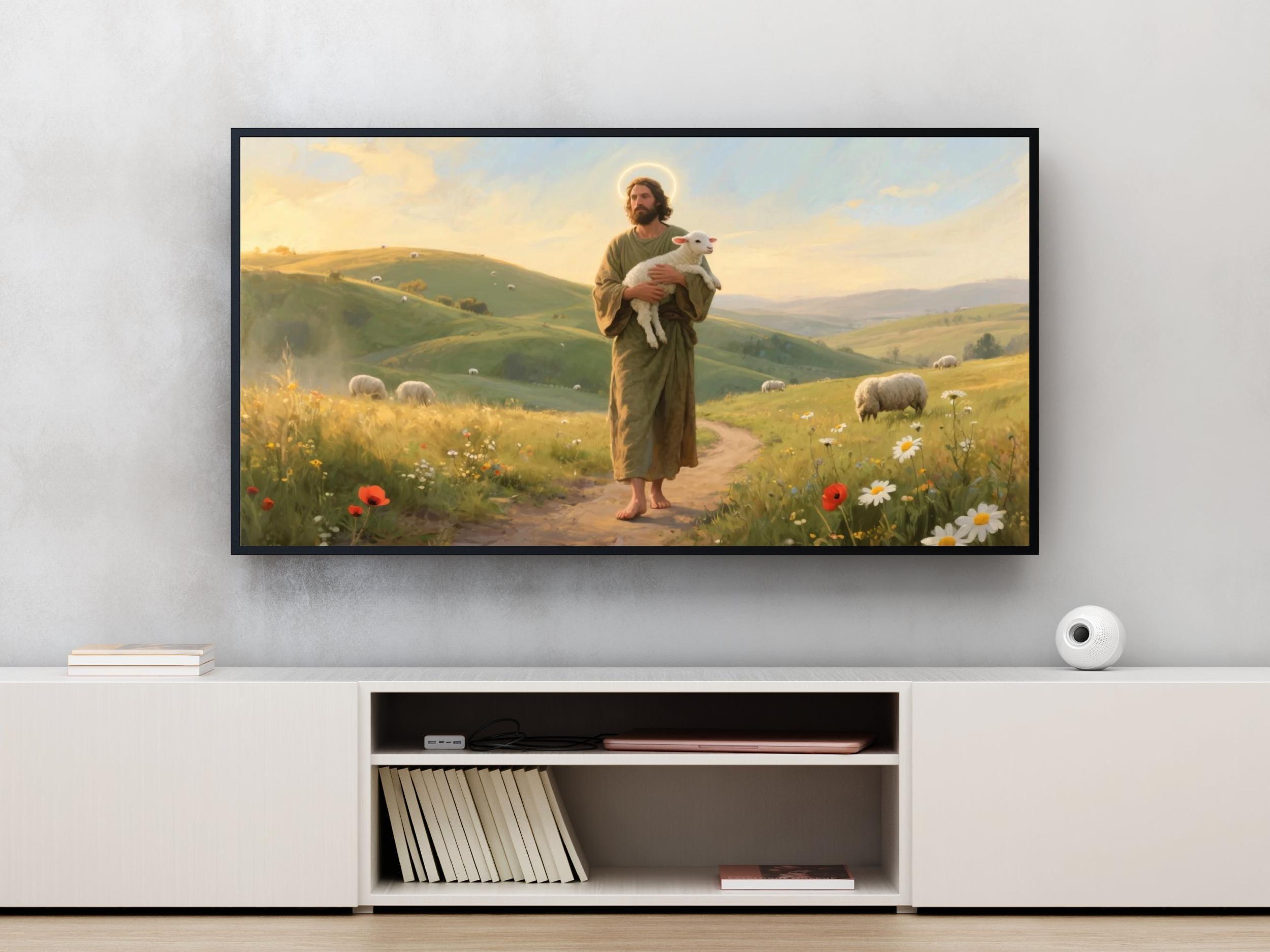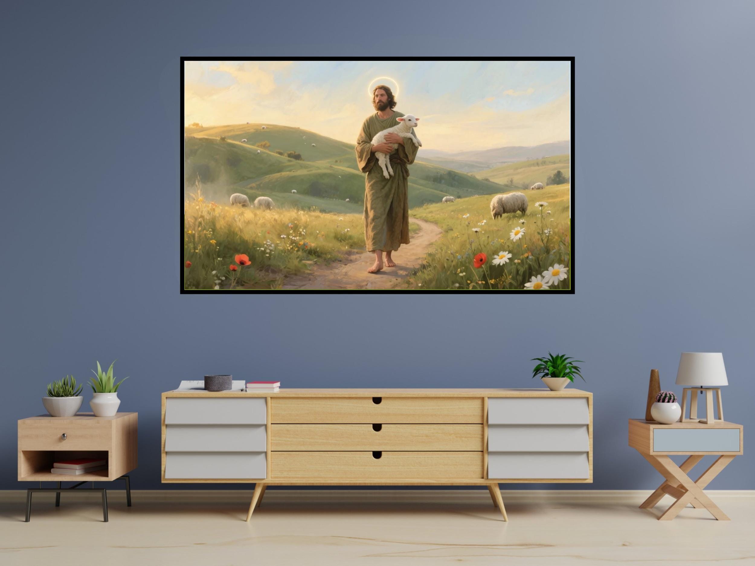 Features an olive green robe figure holding a lamb, set against wildflowers and grazing sheep