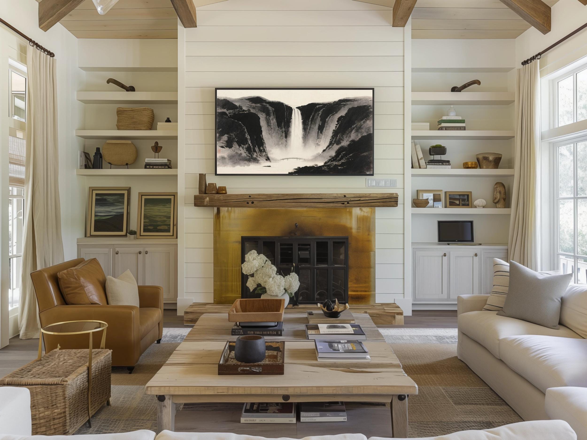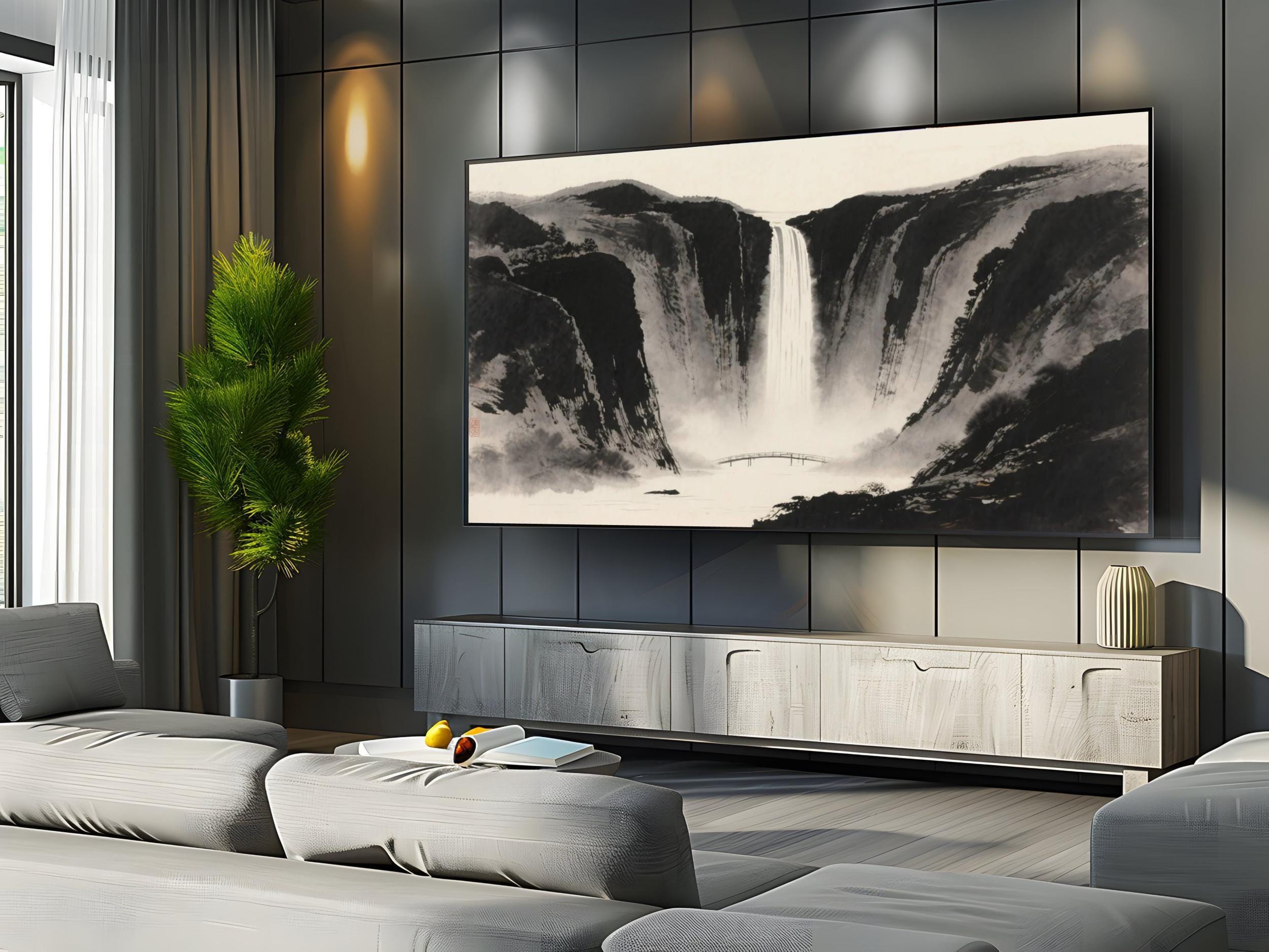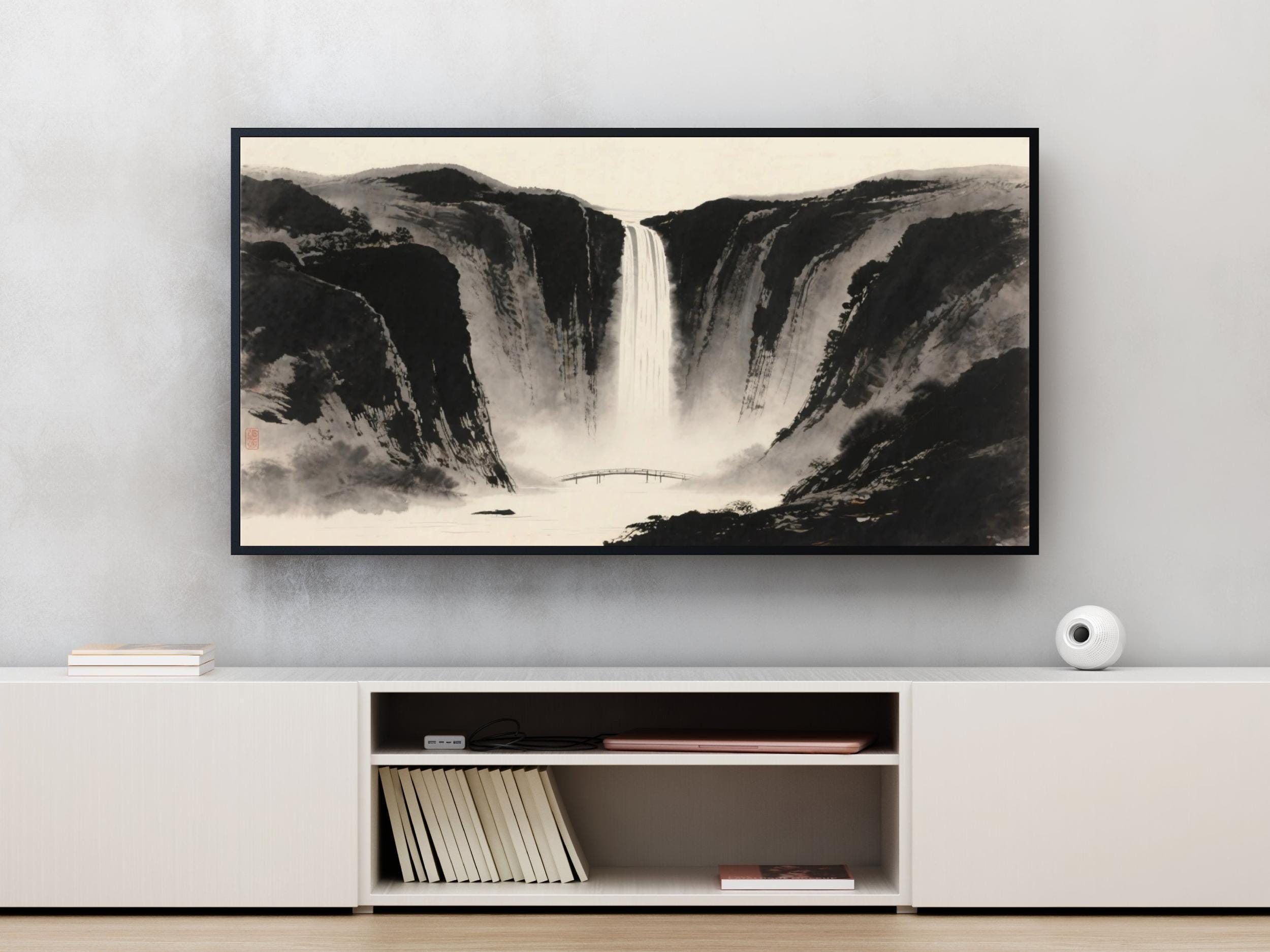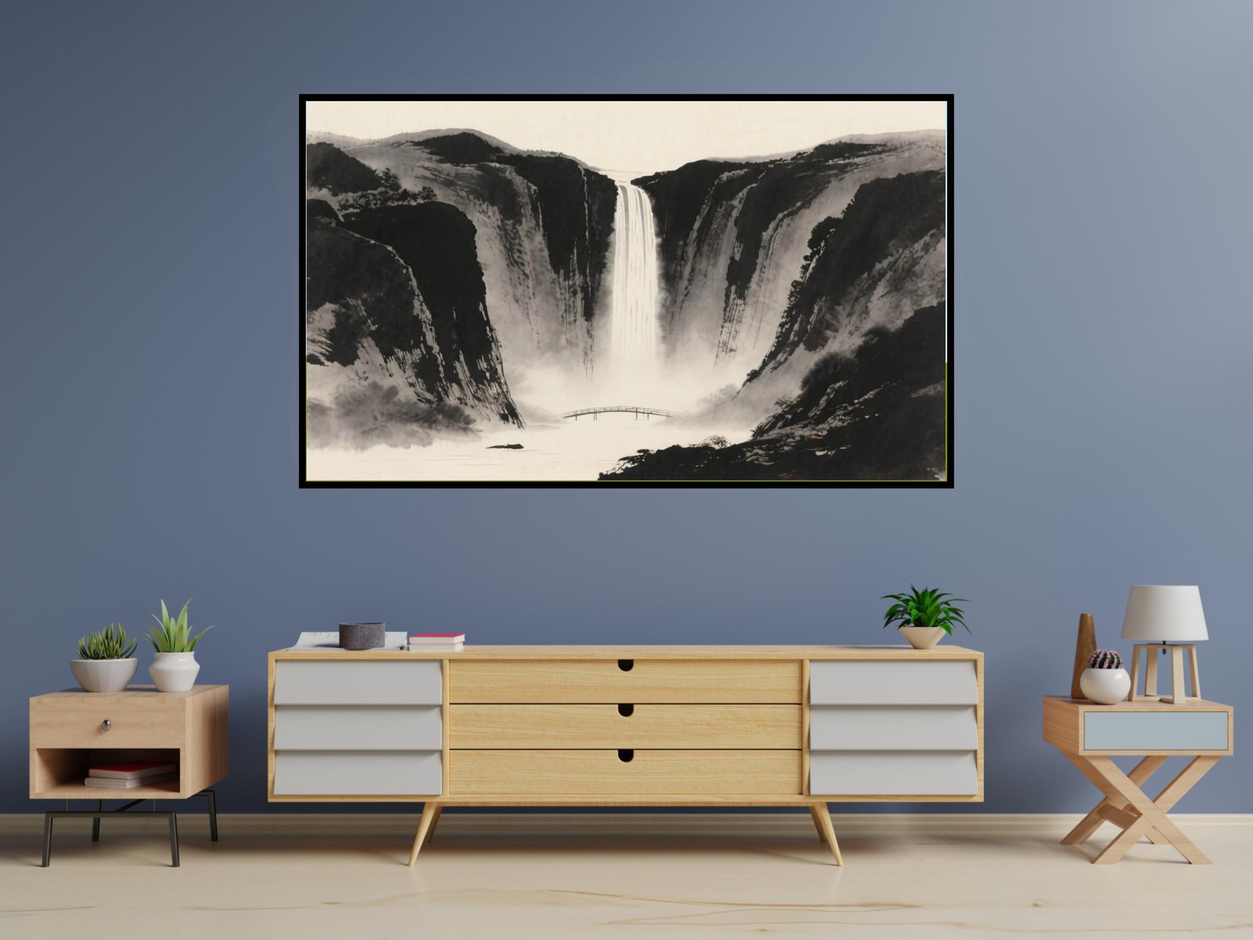 Immerse yourself in a serene scenic escape with this peaceful ink wash digital download art, thoughtfully designed to bring calming nature decor into your living space. Inspired by the timeless beauty of rugged cliffs and cascading waterfalls, this artwork captures the essence of tranquility through a refined black gray palette. Perfect for those seeking a soothing wall print that blends modern aesthetics with classic artistry.