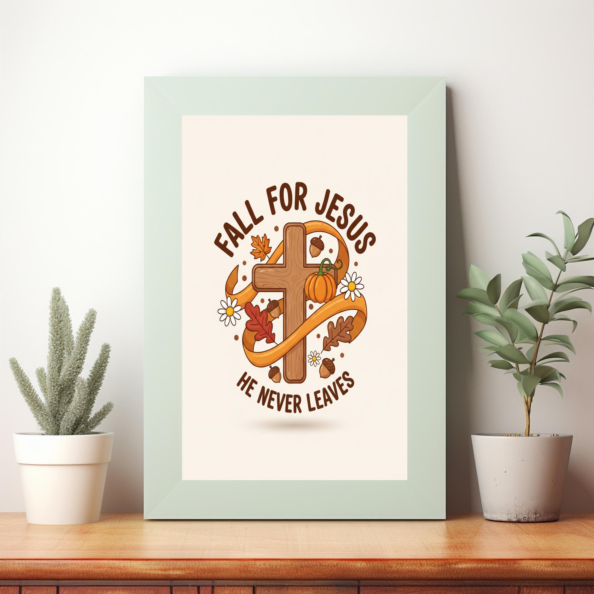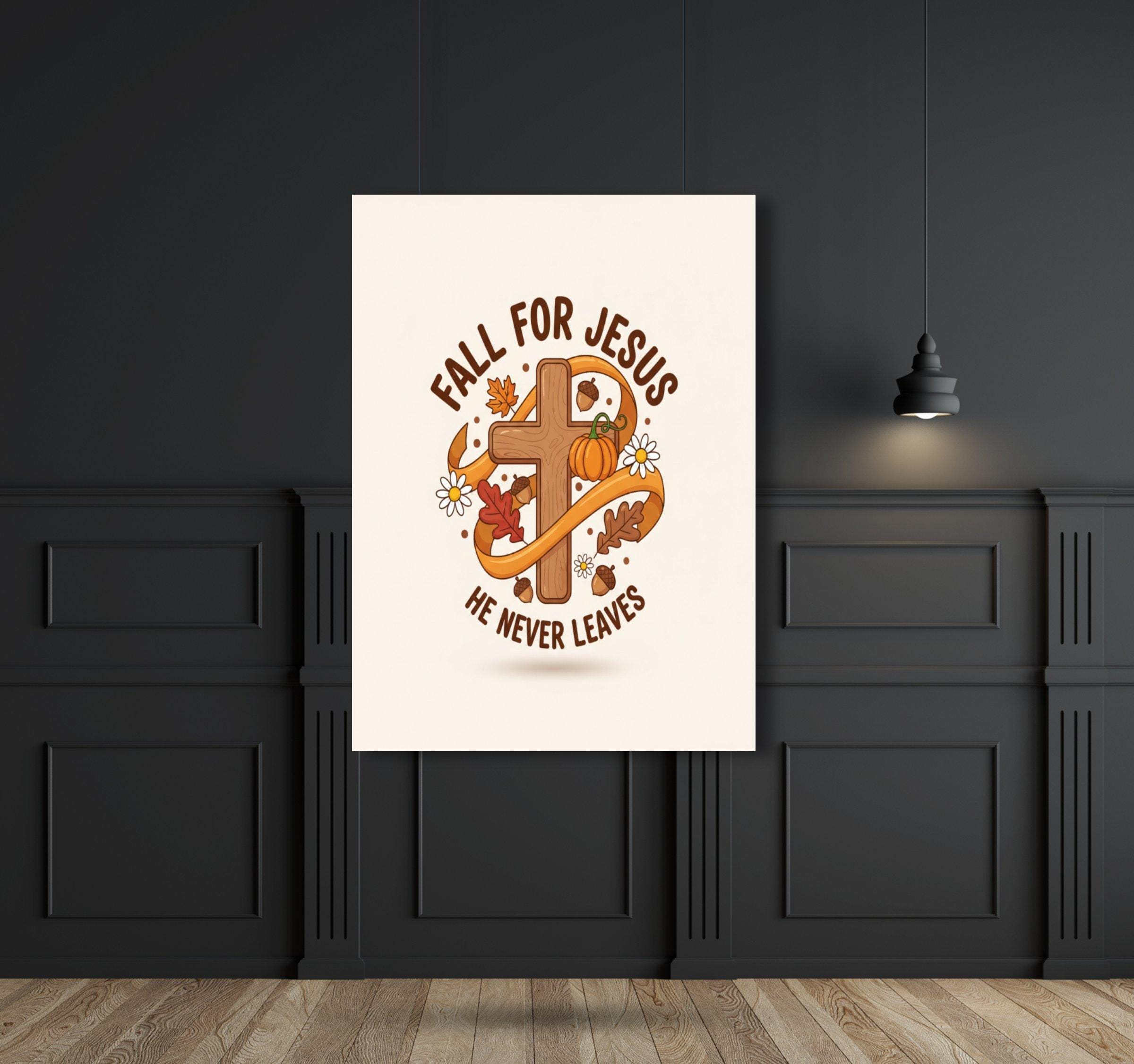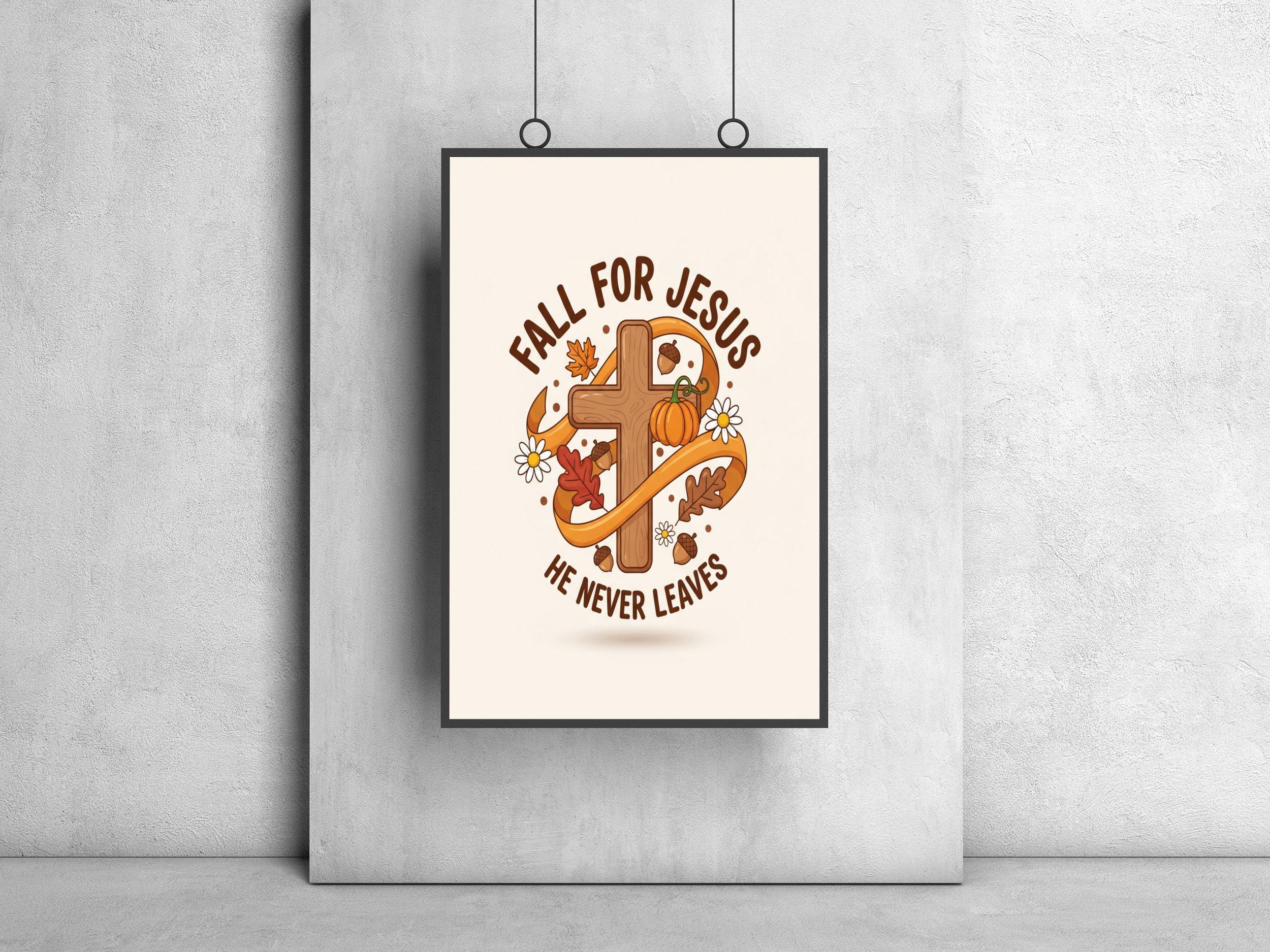 An inspirational quote, "FALL FOR JESUS," appears at the top in a bold, rounded font, and "HE NEVER LEAVES" accents the bottom in a complementary style. The pumpkin design, combined with the faith based art, captures the spirit of autumn decor and scripture decor in one piece.