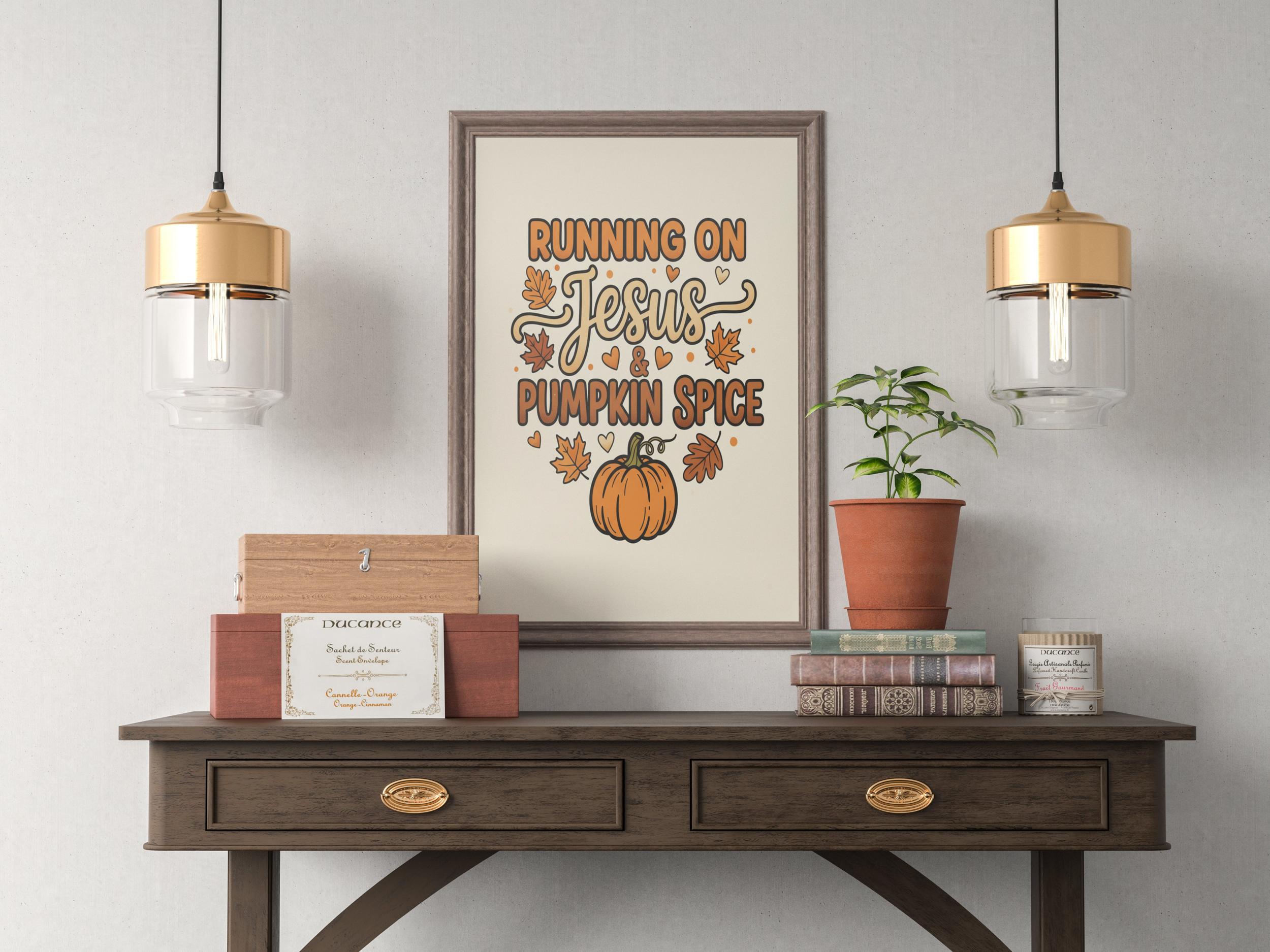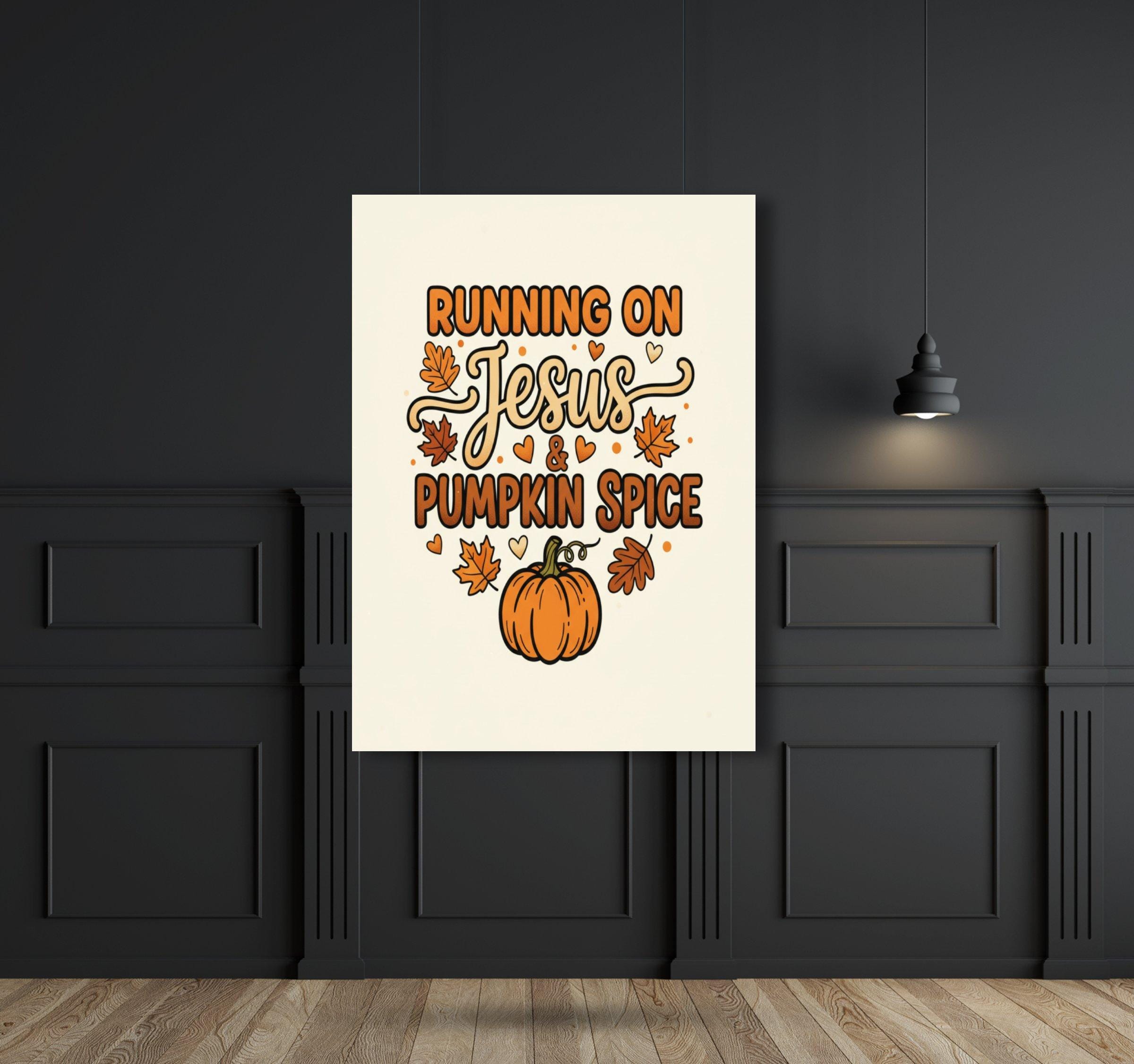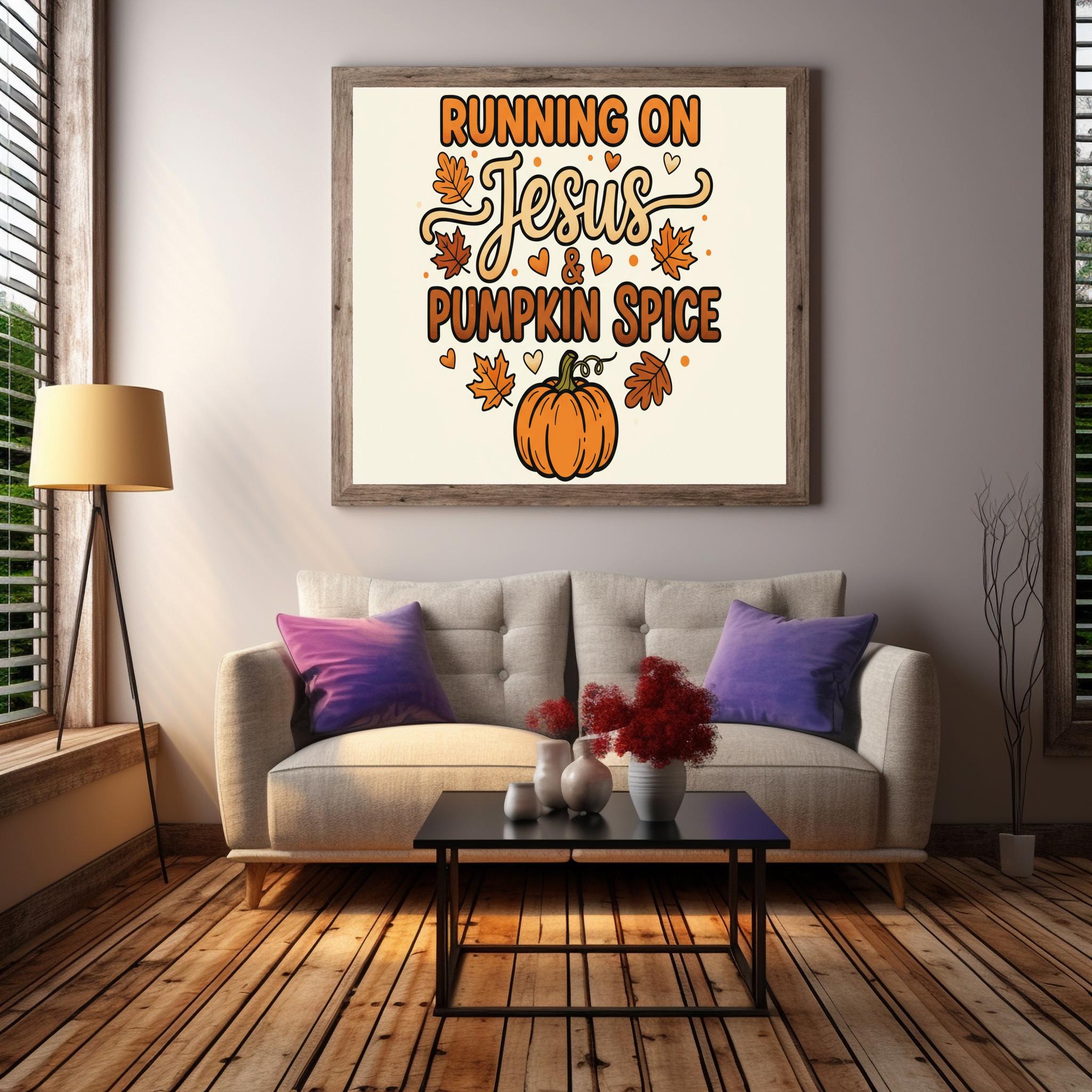 This christian wall art features a playful and colorful design centered around the phrase "Running on Jesus & Pumpkin Spice." The mix of bold and whimsical fonts, including flowing script for "Jesus," adds a charming touch of jesus art while creating heartwarming decor for your home.
