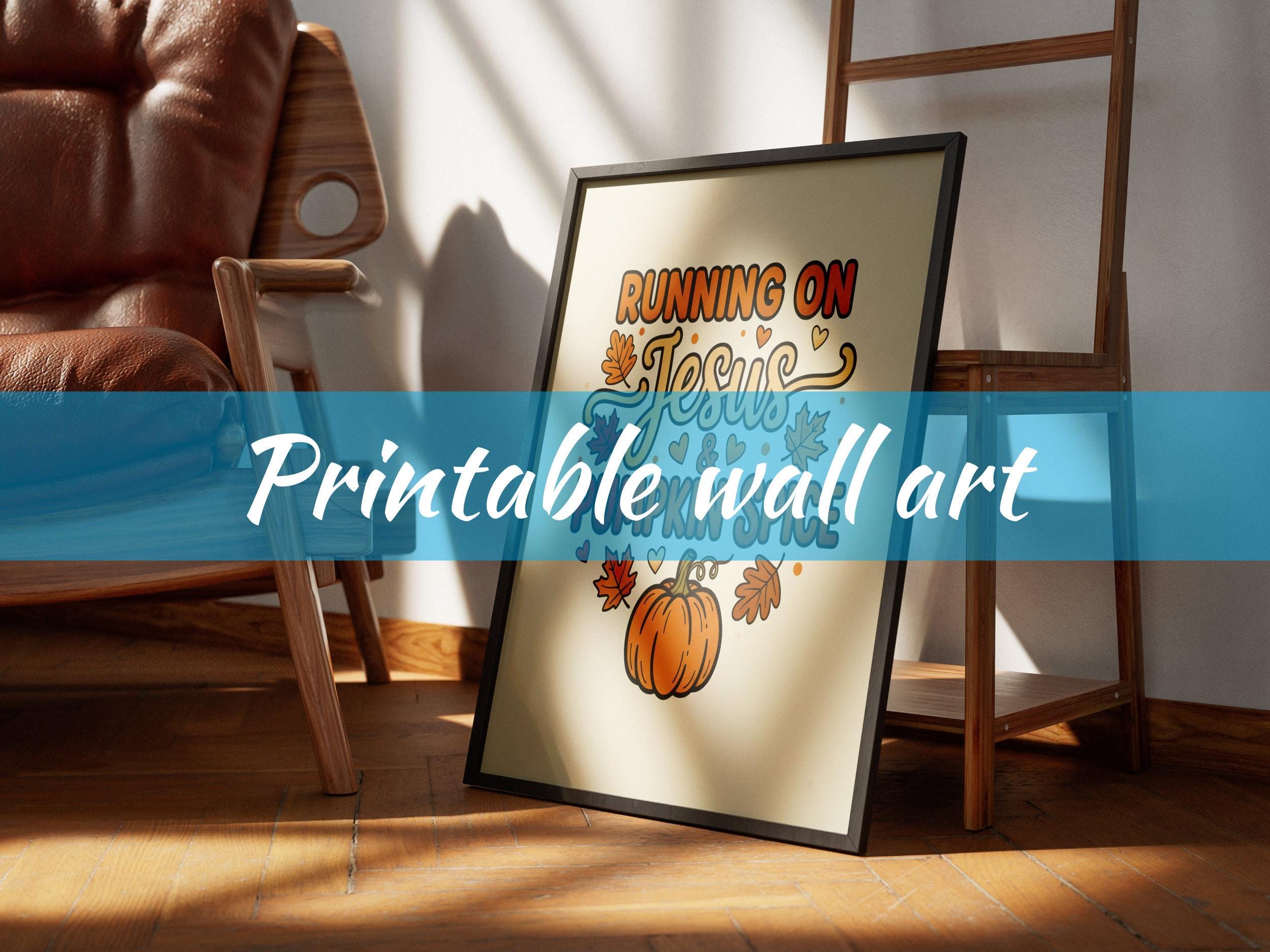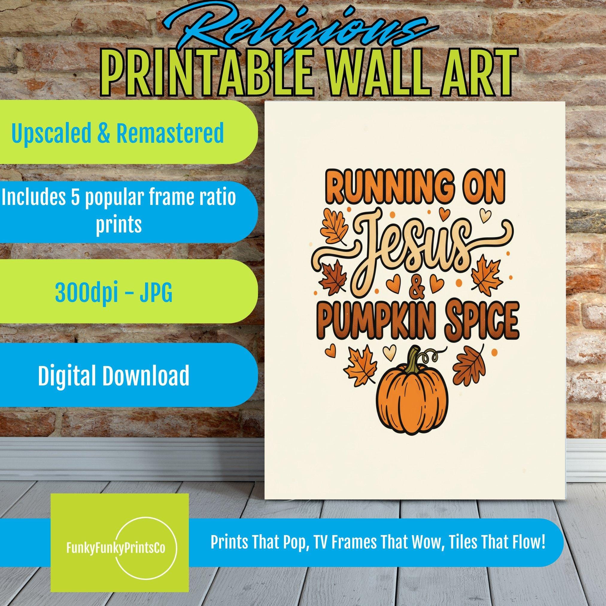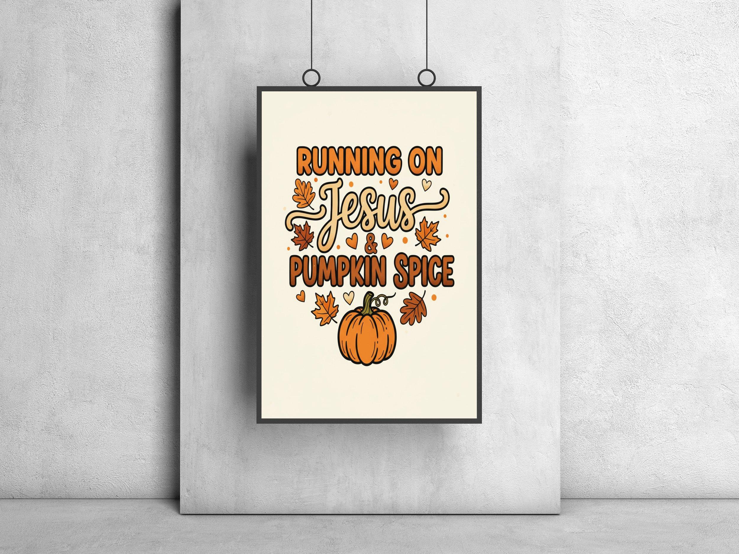 This christian wall art features a playful and colorful design centered around the phrase "Running on Jesus & Pumpkin Spice." The mix of bold and whimsical fonts, including flowing script for "Jesus," adds a charming touch of jesus art while creating heartwarming decor for your home.
