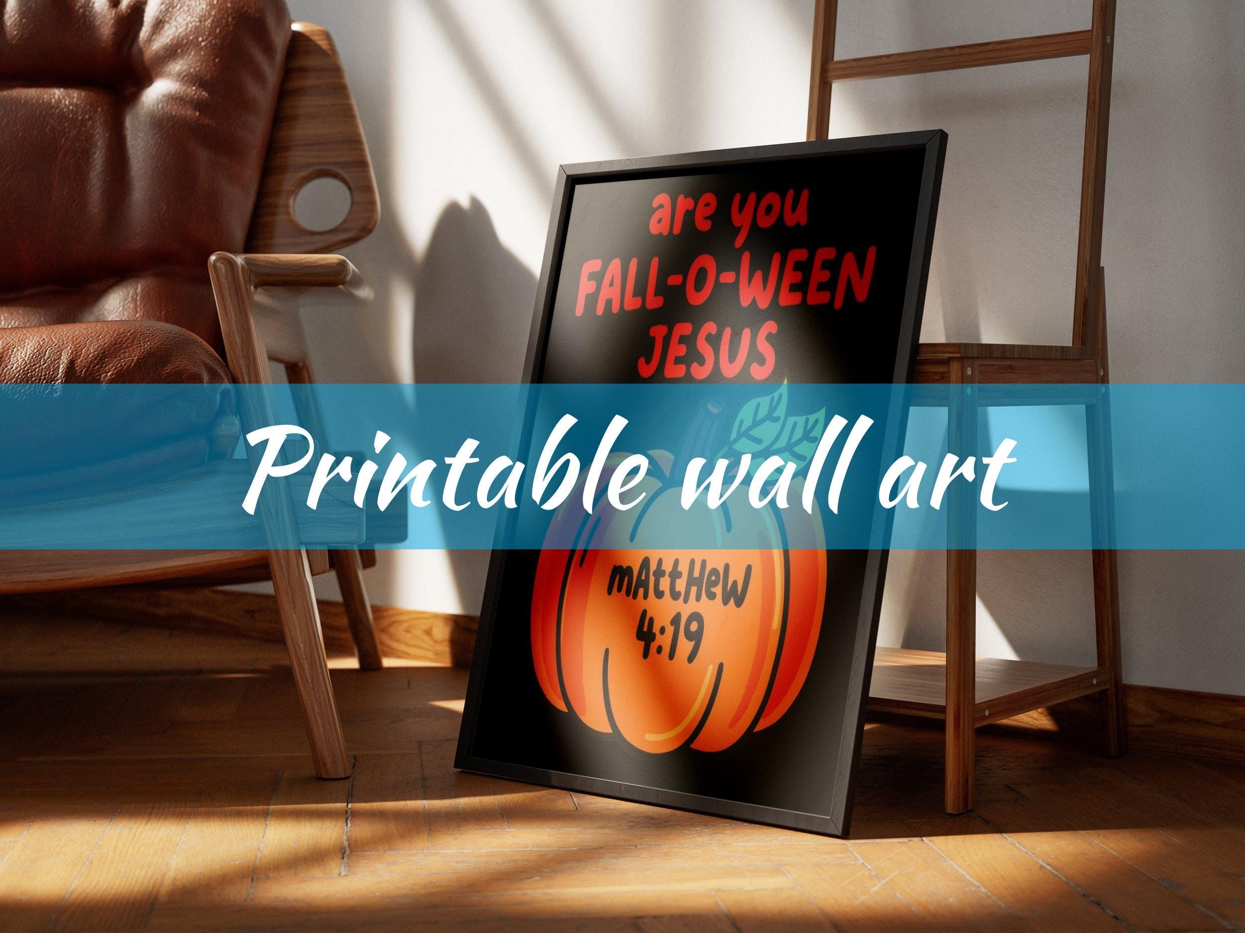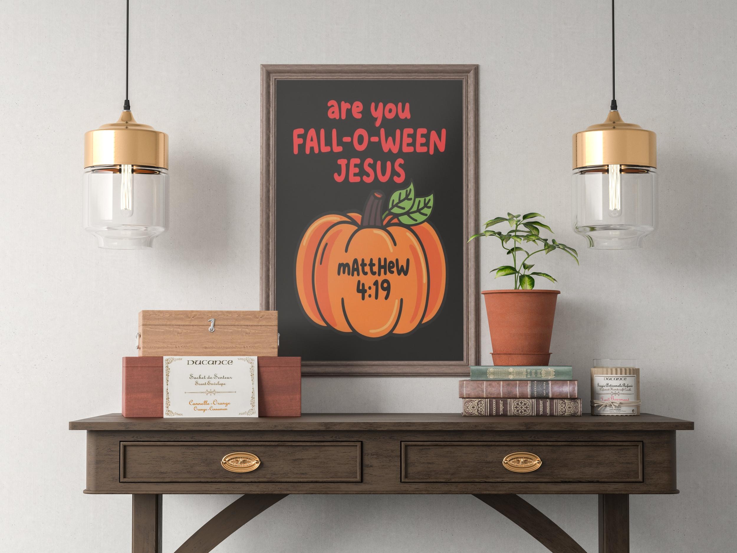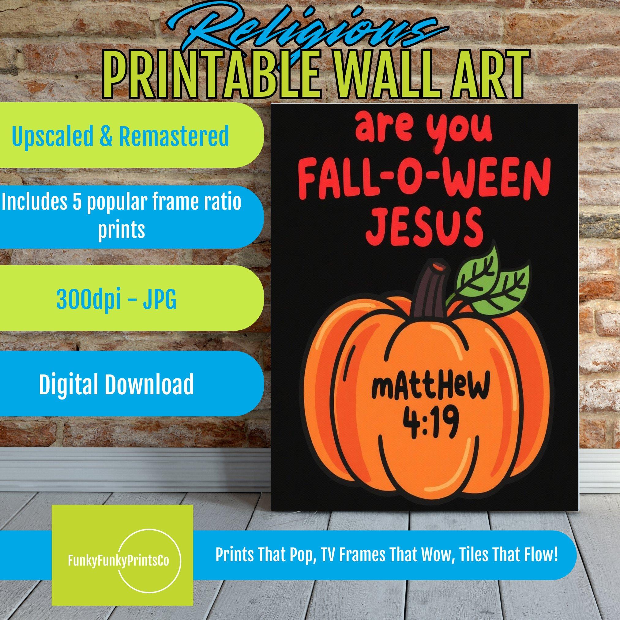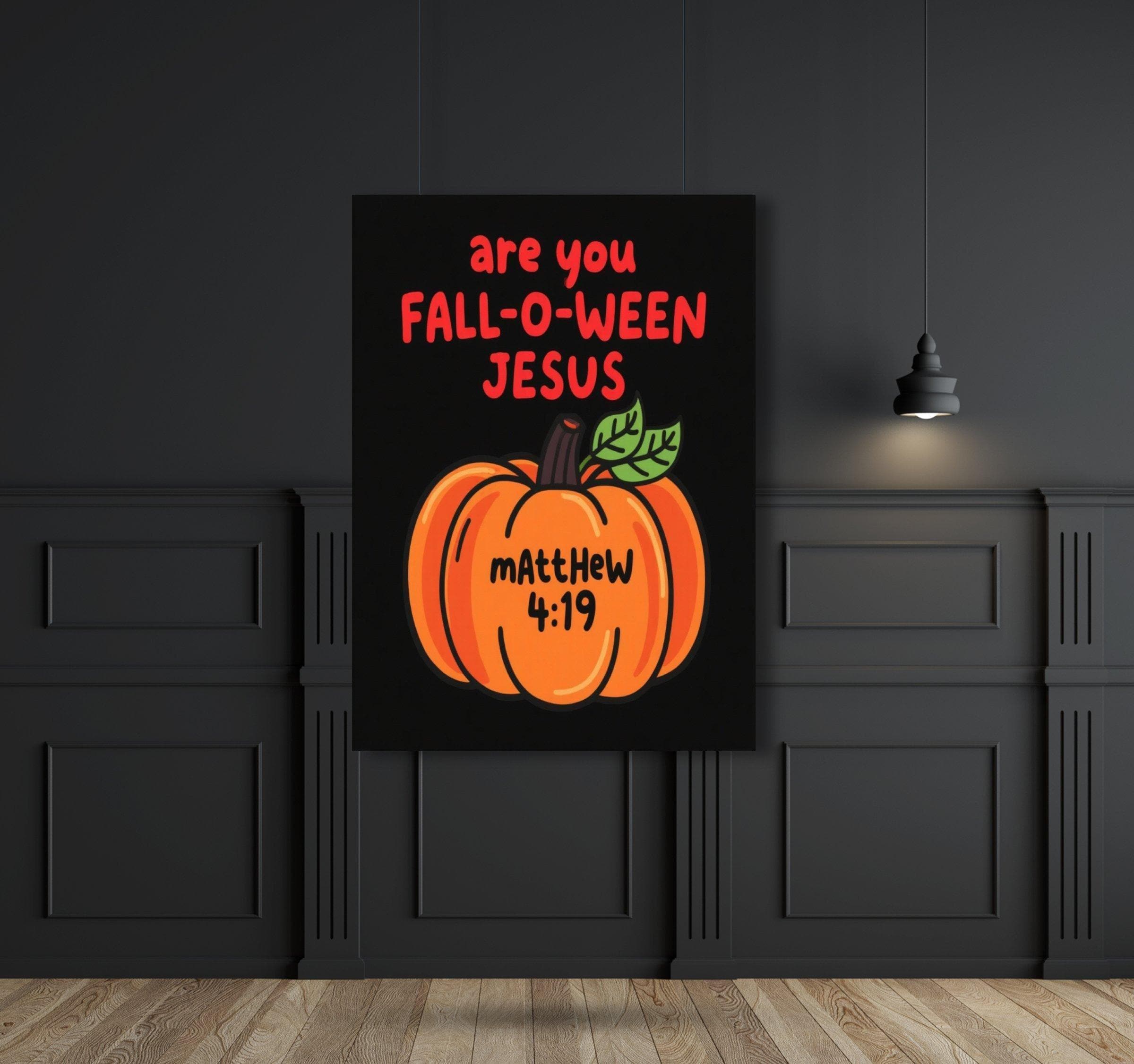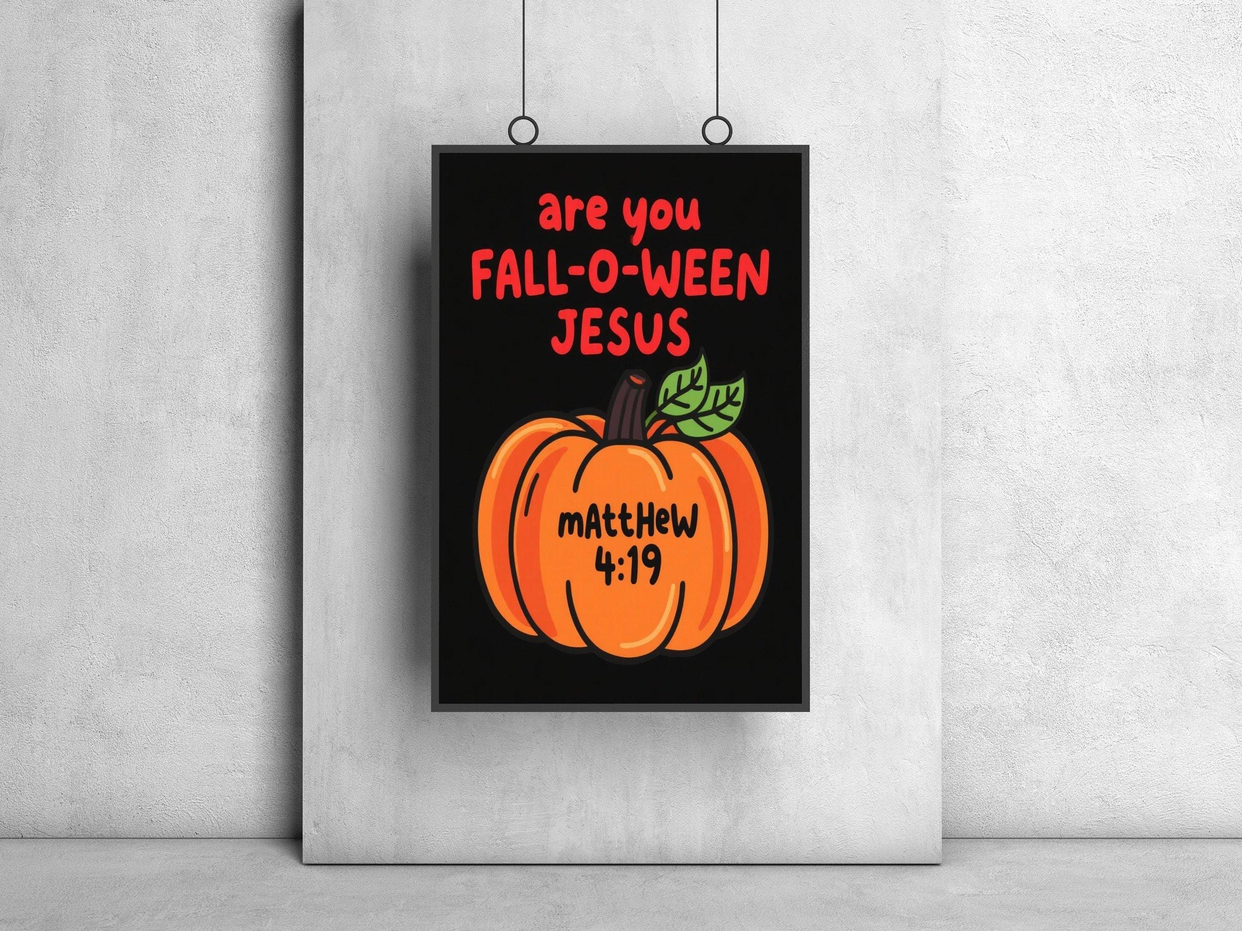 The image features a playful, whimsical design centered around a cartoon-style pumpkin illustration. This vibrant piece of halloween art showcases a bright orange pumpkin with a green leaf, drawn in a kid friendly art style. Above the pumpkin, colorful print text reads "are you FALL-O-WEAN JESUS" in bold, eye-catching letters, with “FALL-O-WEAN” in a larger, festive font. Below the pumpkin, the reference "mAttHEw 4:19" appears in a contrasting color, adding a touch of religious art with a lighthearted twist. The solid black background highlights the lively fun graphics and playful elements, making it perfect for both holiday decor and seasonal art.