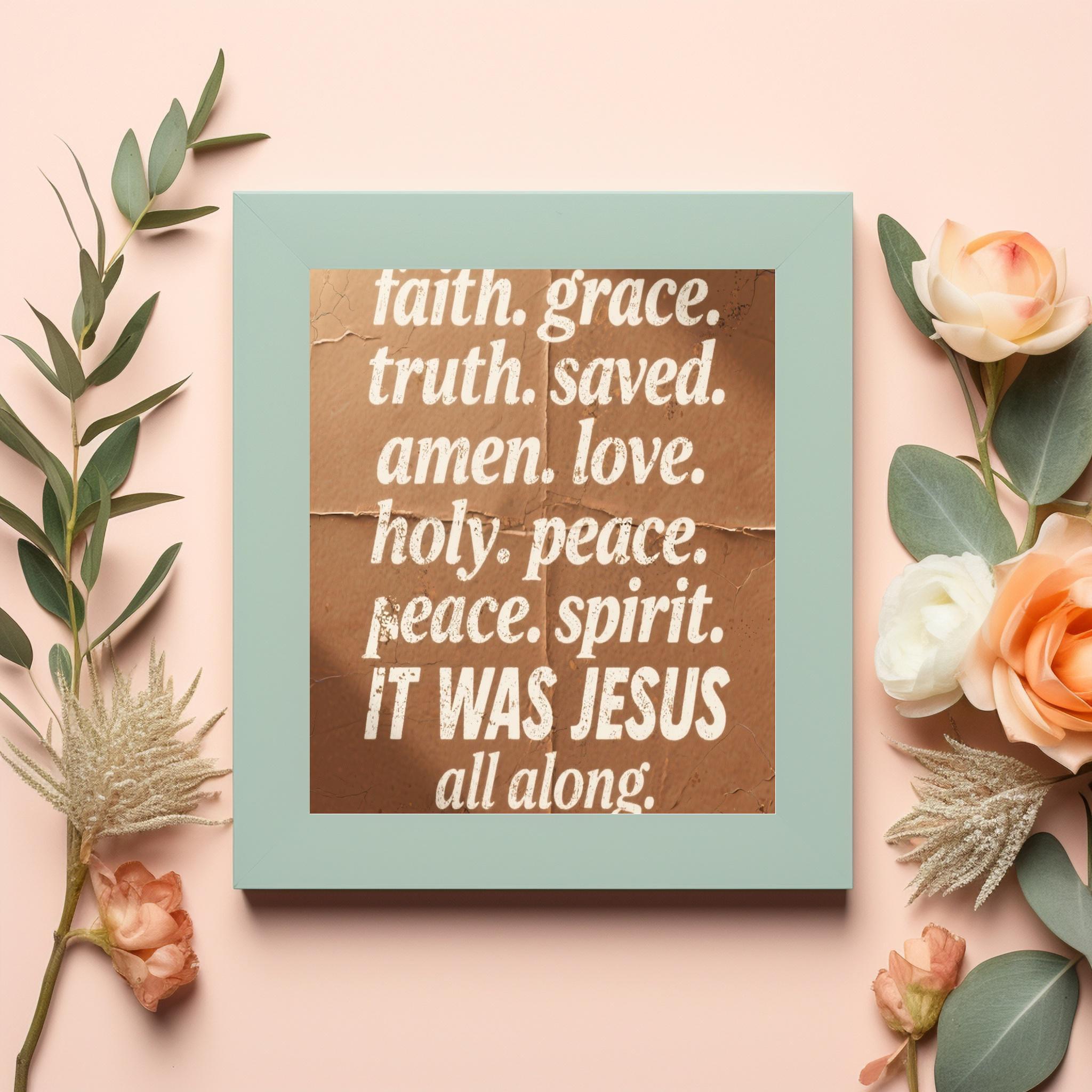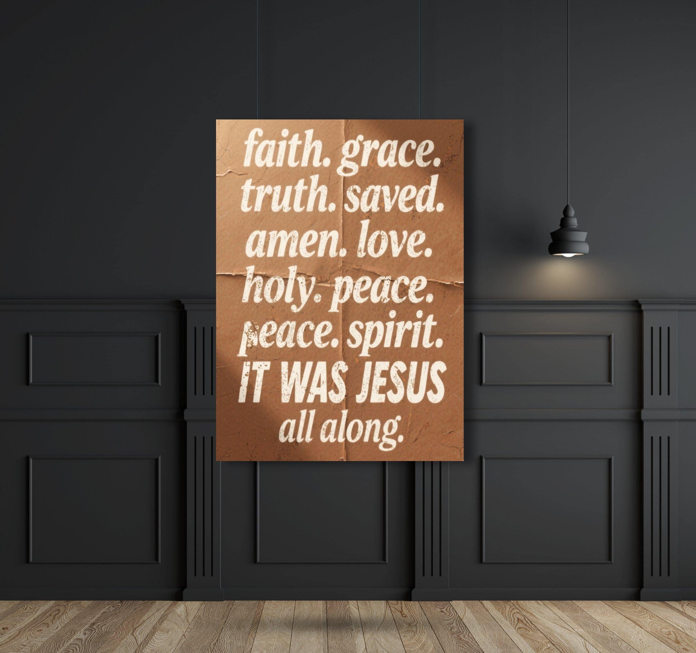 The image showcases a textured brown background that looks like aged or crumpled paper, bringing a rustic art feel to your space. In the foreground, a series of motivational words—such as "faith," "grace," "truth," "saved," "amen," "love," "holy," "peace," and "spirit"—are arranged vertically, each separated by a dot. These powerful words inspire faith and love, highlighting the presence of the holy spirit and culminating with "IT WAS JESUS all along."