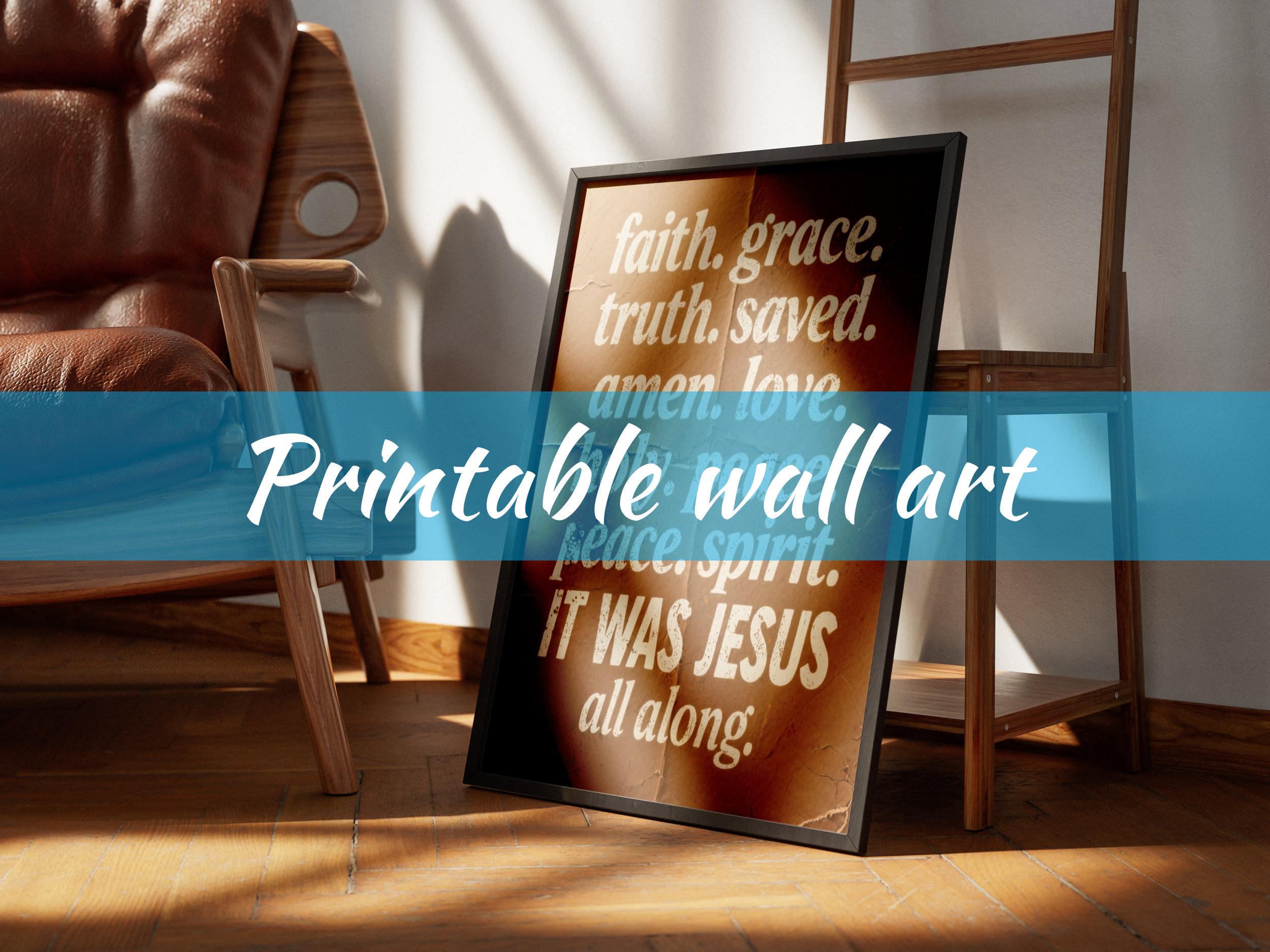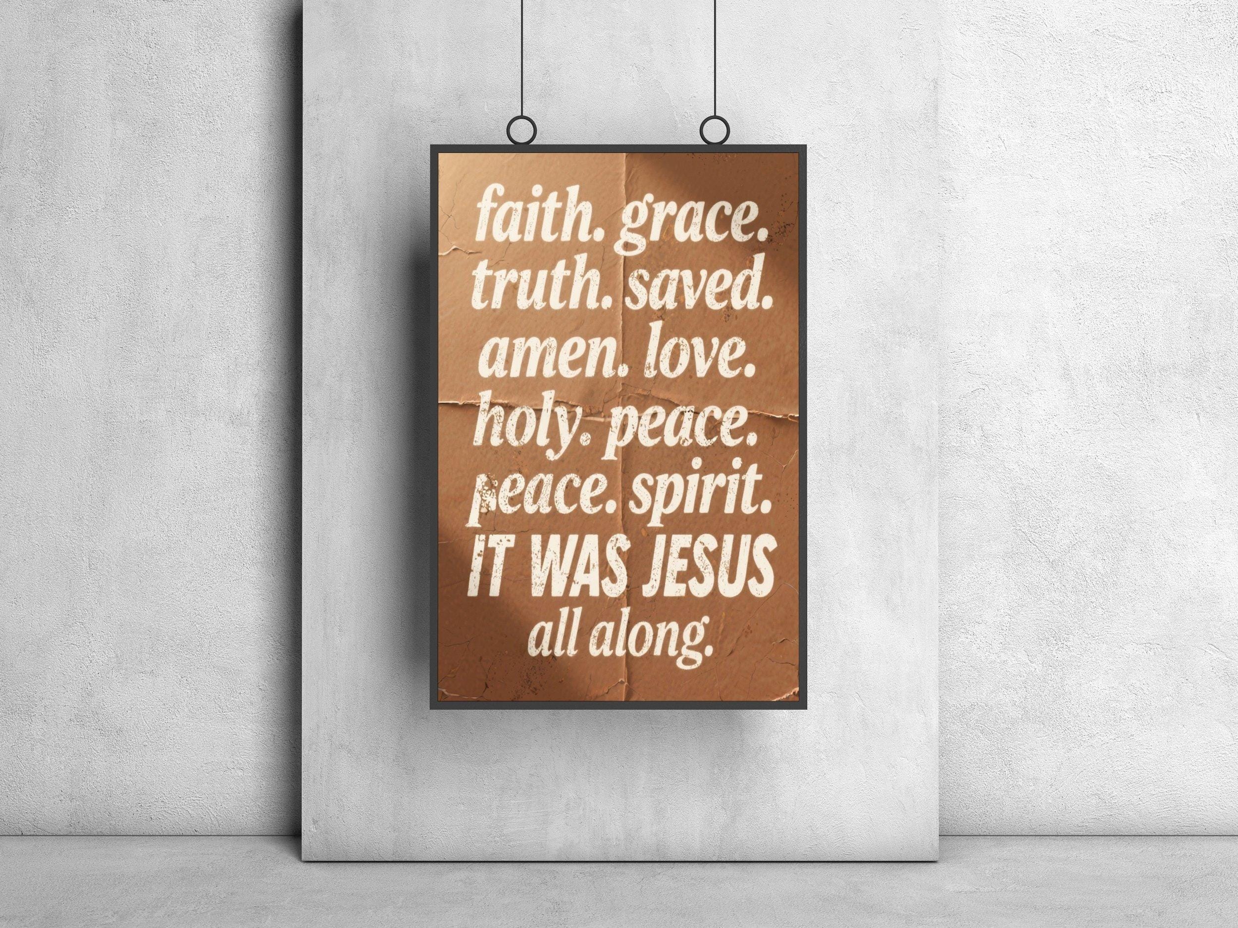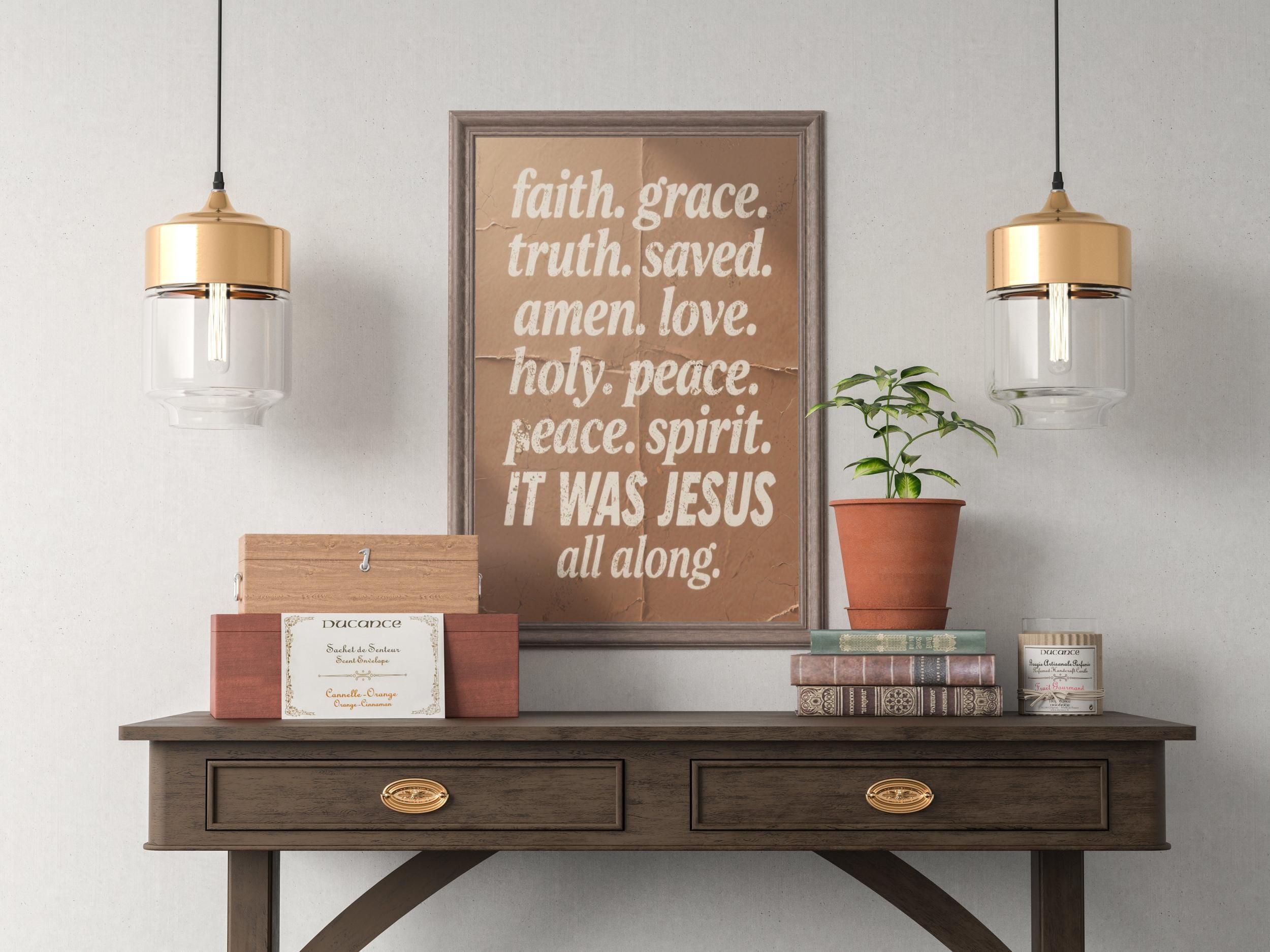 Presented in a bold, white font that stands out against the background, the bible verse inspired phrase "IT WAS JESUS" is featured larger and bolder, emphasizing its message. This spiritual wall art print beautifully blends faith based inspiration with a warm, rustic touch, making it ideal as christian art for your peaceful home, art for church, or any space in need of uplifting, inspirational art.