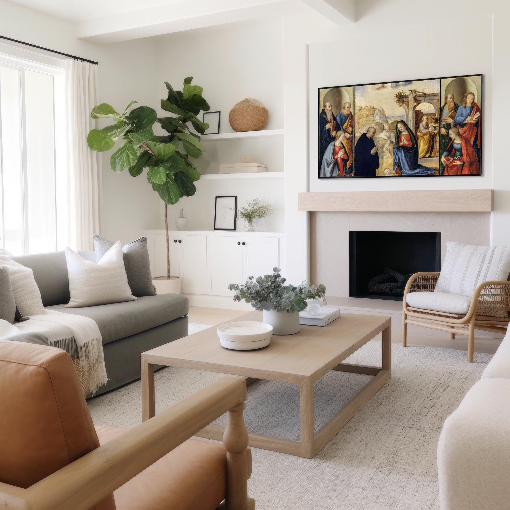 Step into a tranquil space where sacred home decor meets modern digital artistry with this Virgin Mary and Saints triptych, designed specifically for Samsung Frame TV. This digital download art showcases the Virgin Mary prayer scene and saints adorned in striking blue red robes, blending devotion with contemporary style. Each panel invites you to experience a moment of reverence, making it a perfect spiritual gift idea for your prayer room or living space.