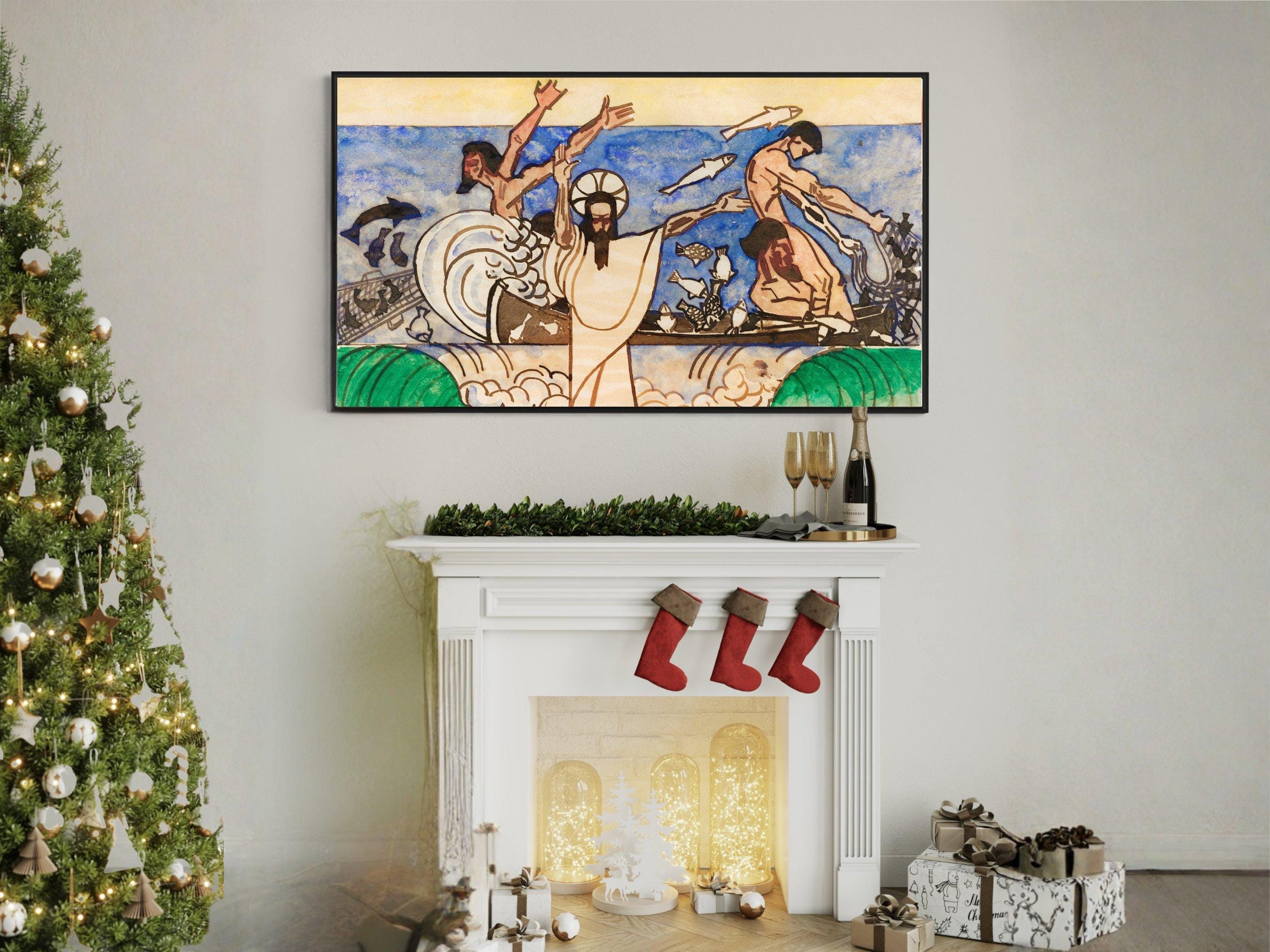 Dive into a captivating scene where dynamic waves art merges seamlessly with colorful digital art, creating a vivid tribute to nature’s energy and spirit. This piece, inspired by folk art style, showcases a stylized boat image surrounded by muscular men fishing, fish, and the lively motion of water. Curated by Rob and Will Palmer, this AI-assisted design brings together tradition and modernity, making it an inspiring addition to your digital home decor or a thoughtful gift for fishermen.