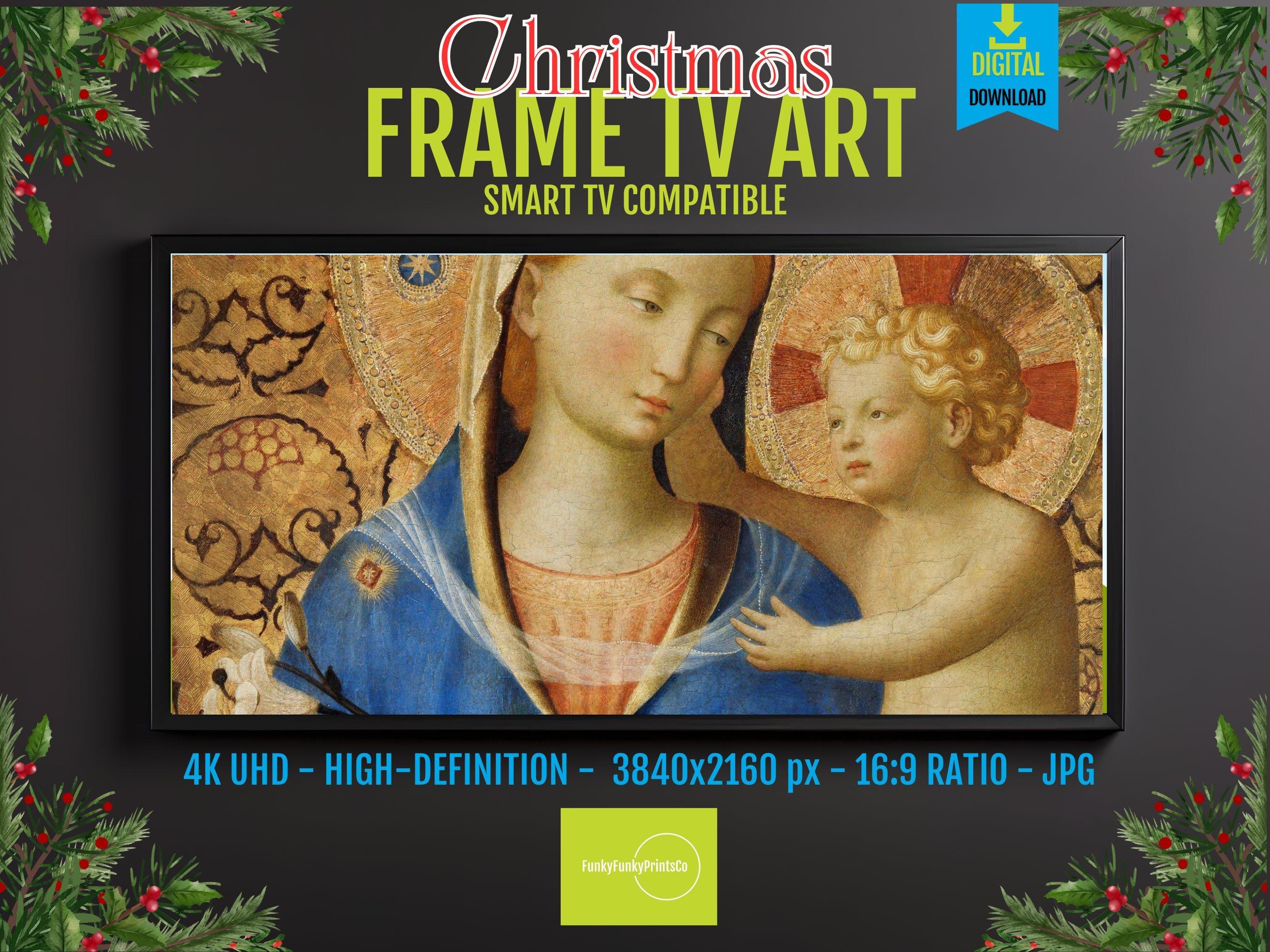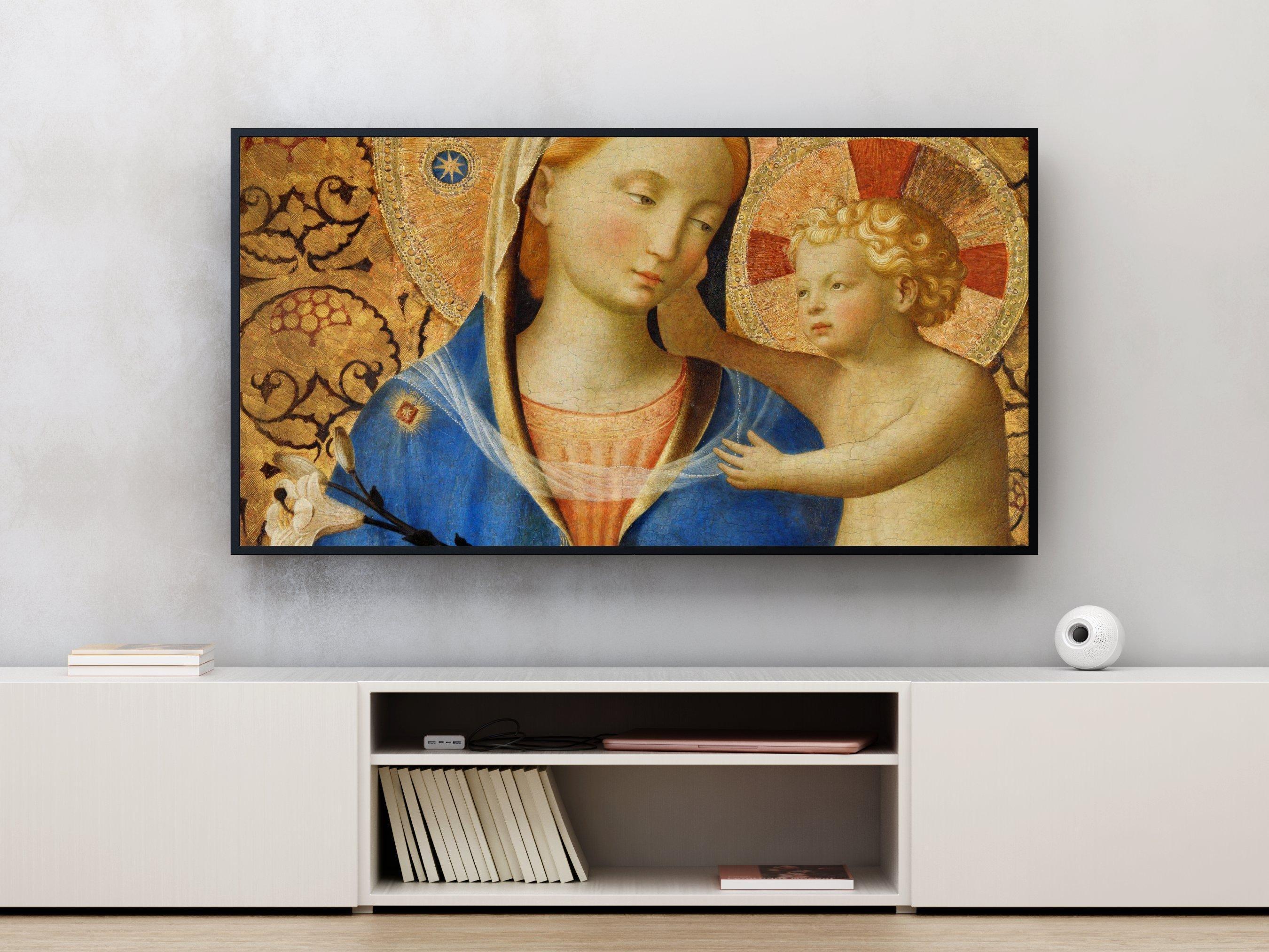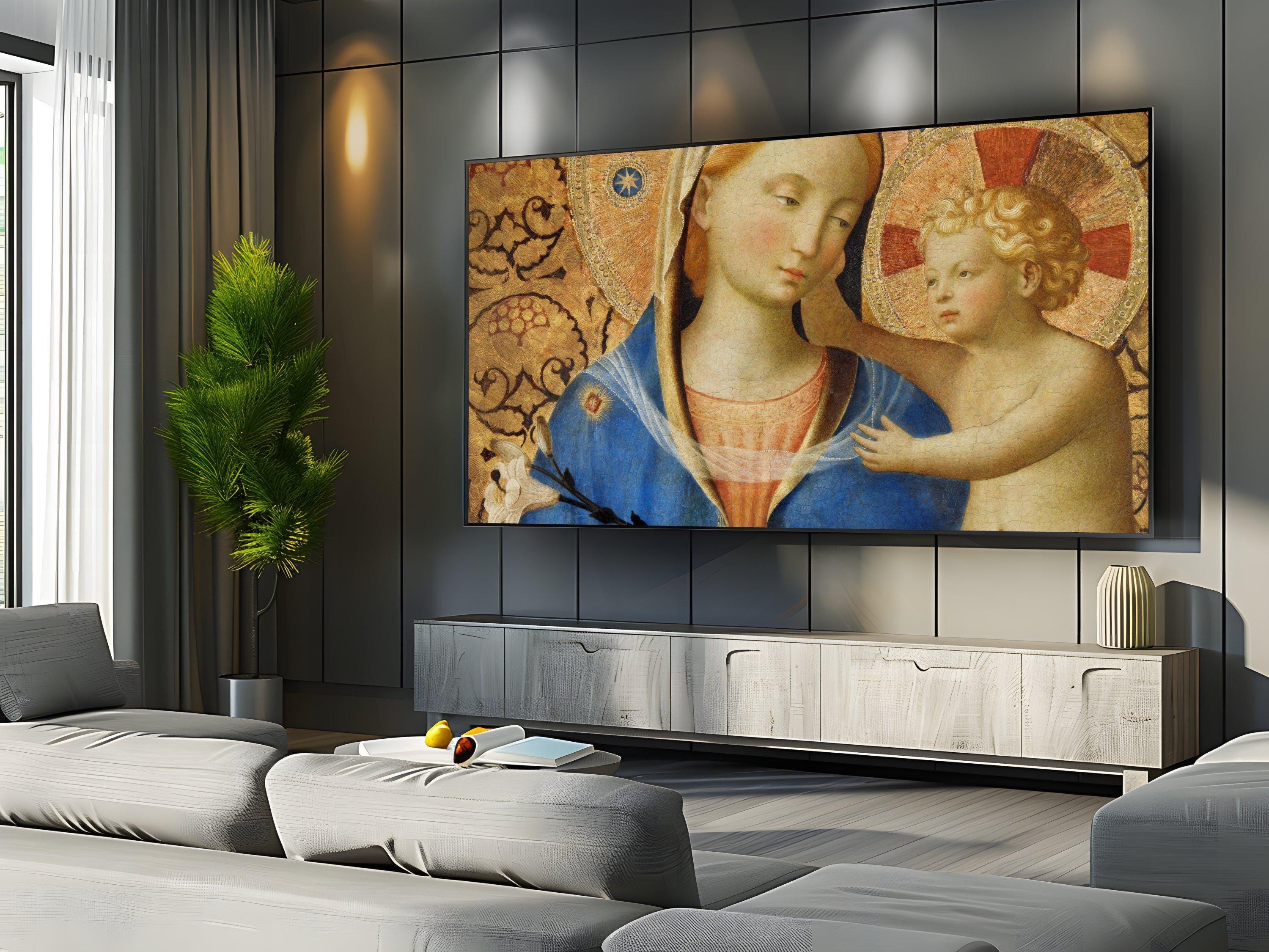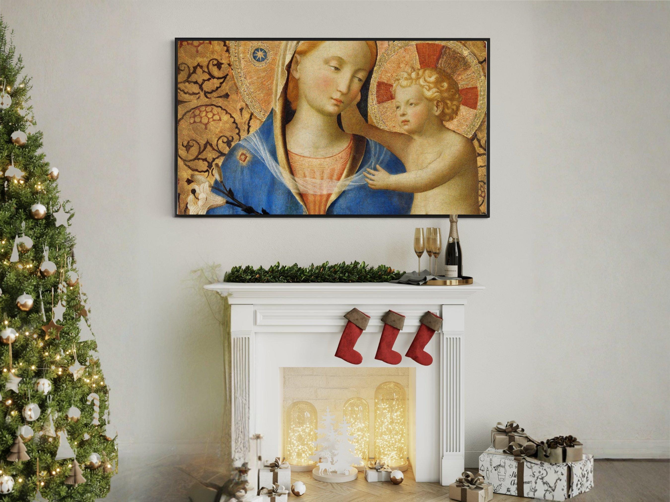 Discover a serene expression of devotion with this sacred digital art, beautifully portraying Mother Mary and Infant Jesus in a tender moment. Crafted to enhance your faith-inspired decor, this piece highlights the Virgin Mary’s iconic blue robe and delicate gold leaf accents, designed specifically for Samsung Frame TV and other high-definition screens. Infuse your space with warmth and reverence through this modern religious art that celebrates timeless spirituality.
