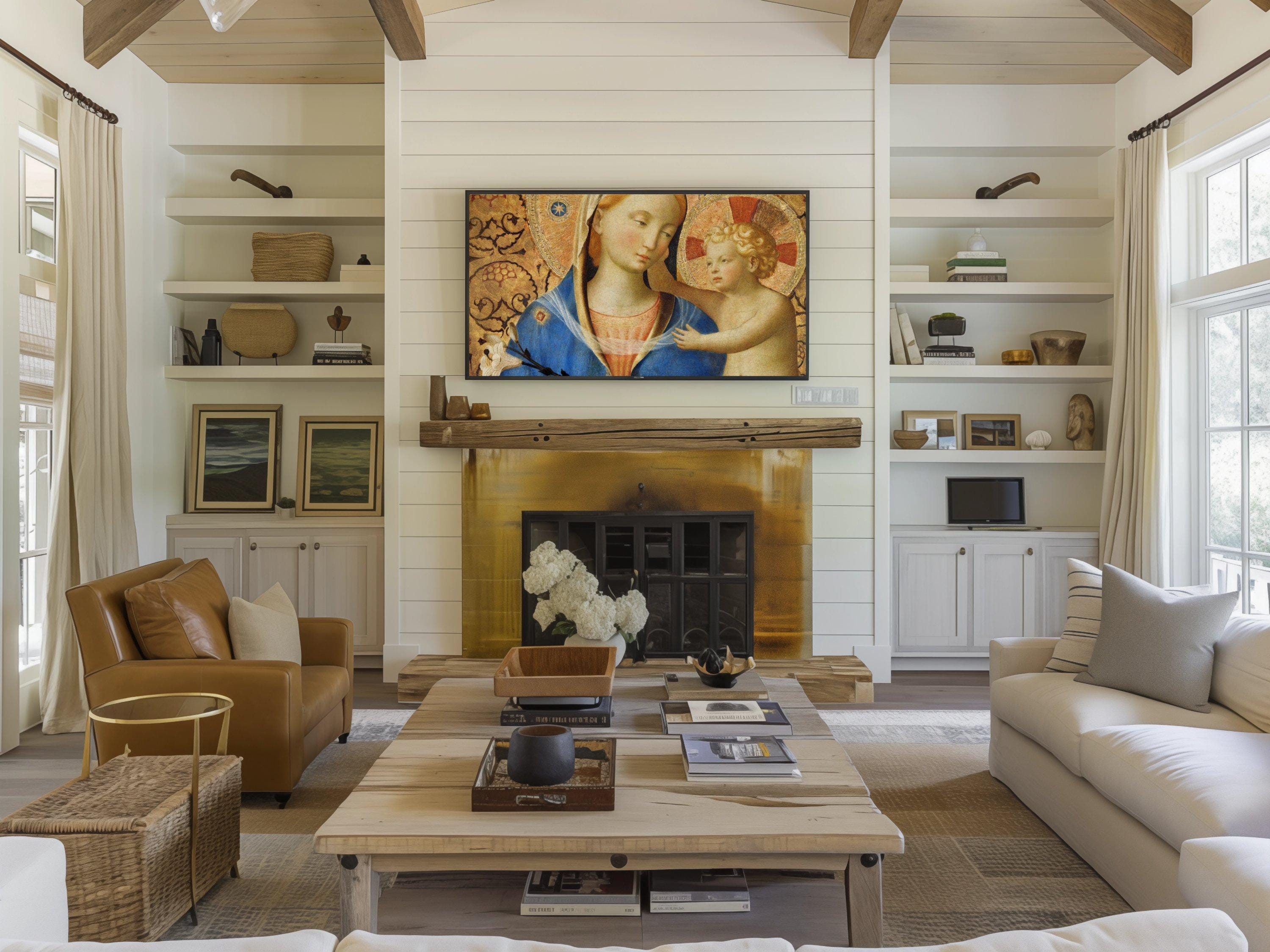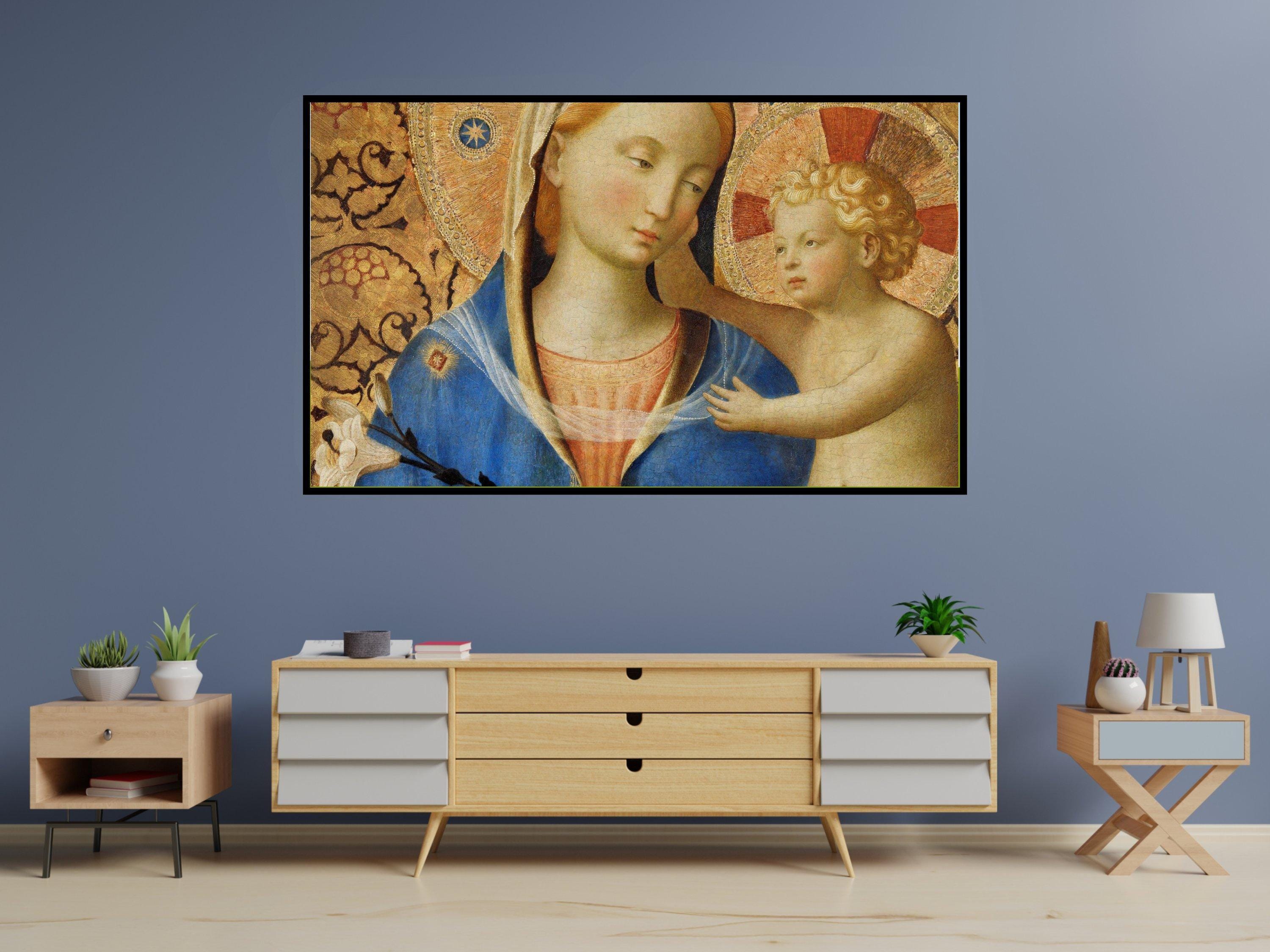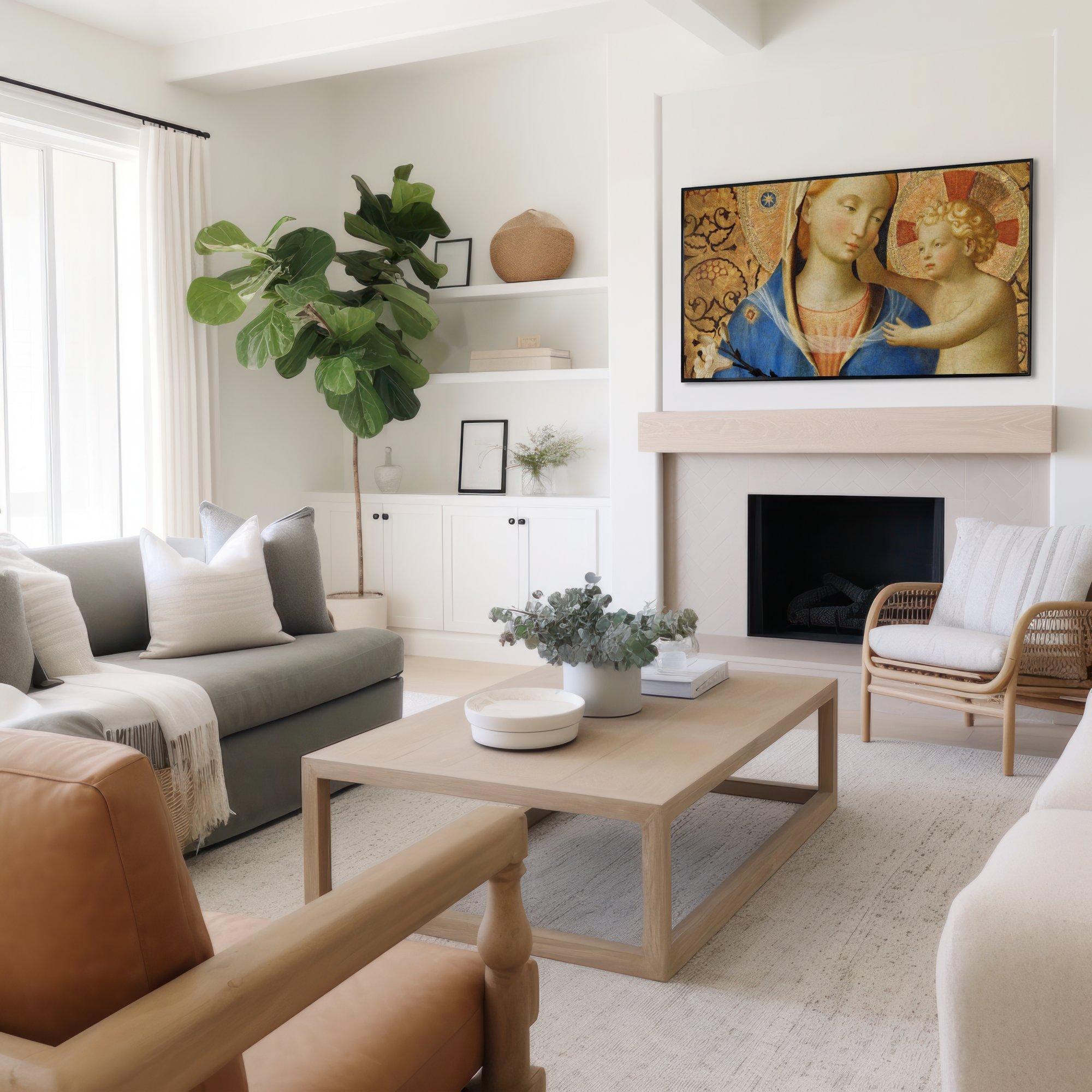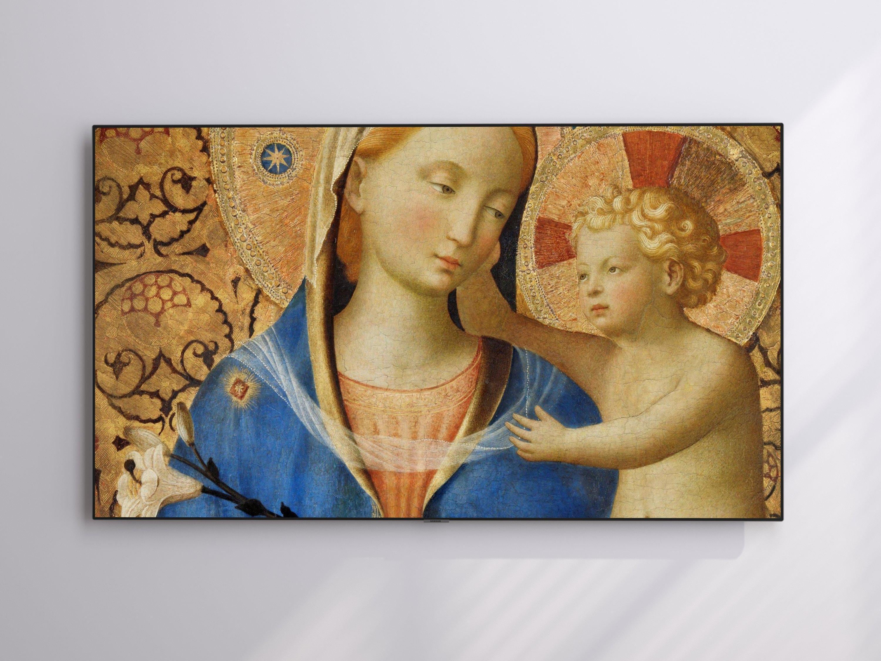 Discover a serene expression of devotion with this sacred digital art, beautifully portraying Mother Mary and Infant Jesus in a tender moment. Crafted to enhance your faith-inspired decor, this piece highlights the Virgin Mary’s iconic blue robe and delicate gold leaf accents, designed specifically for Samsung Frame TV and other high-definition screens. Infuse your space with warmth and reverence through this modern religious art that celebrates timeless spirituality.