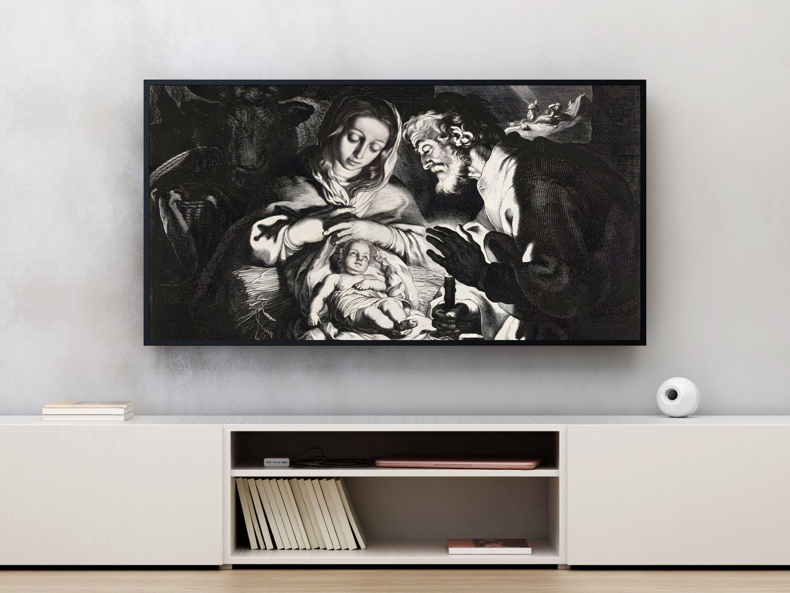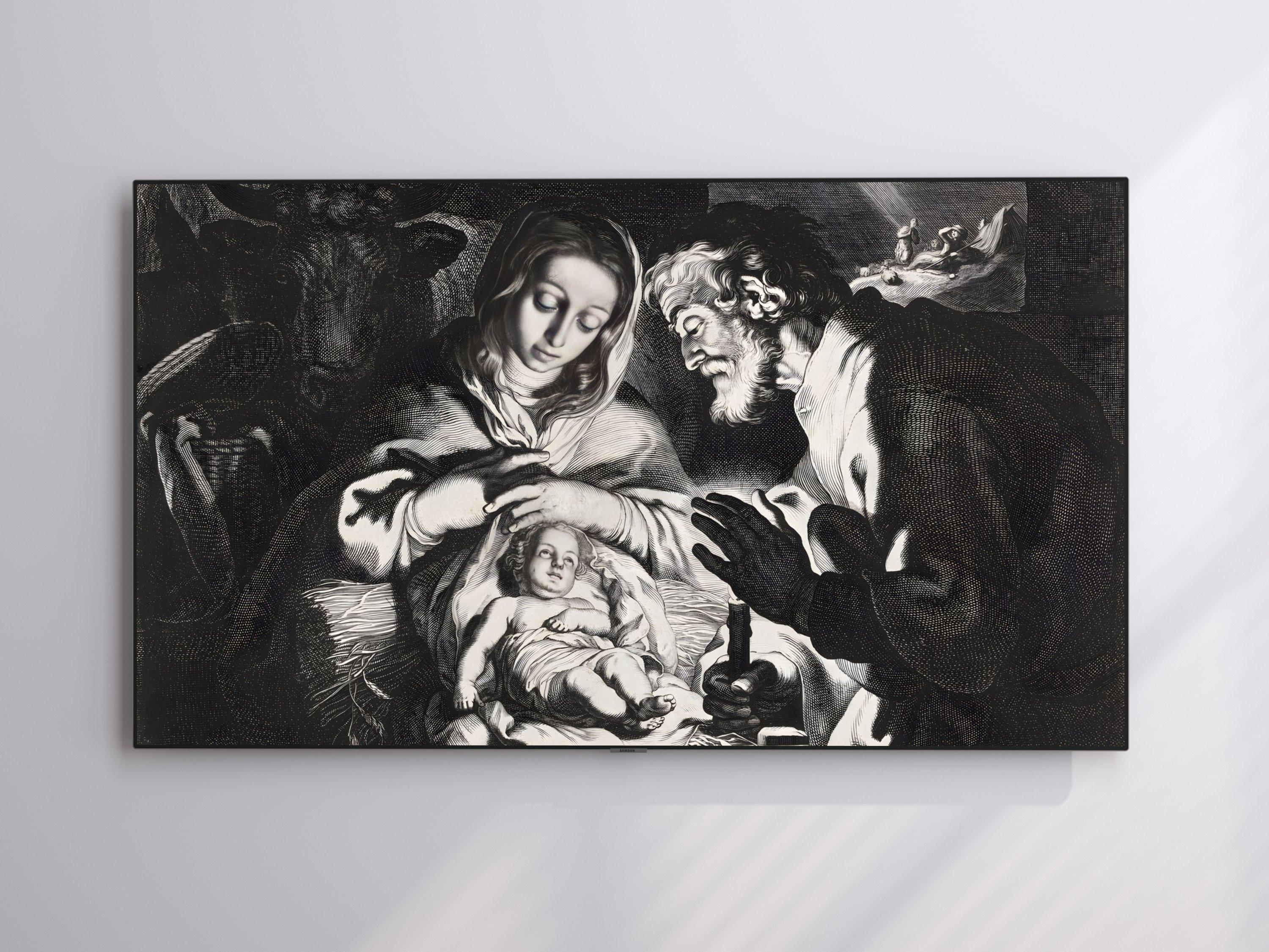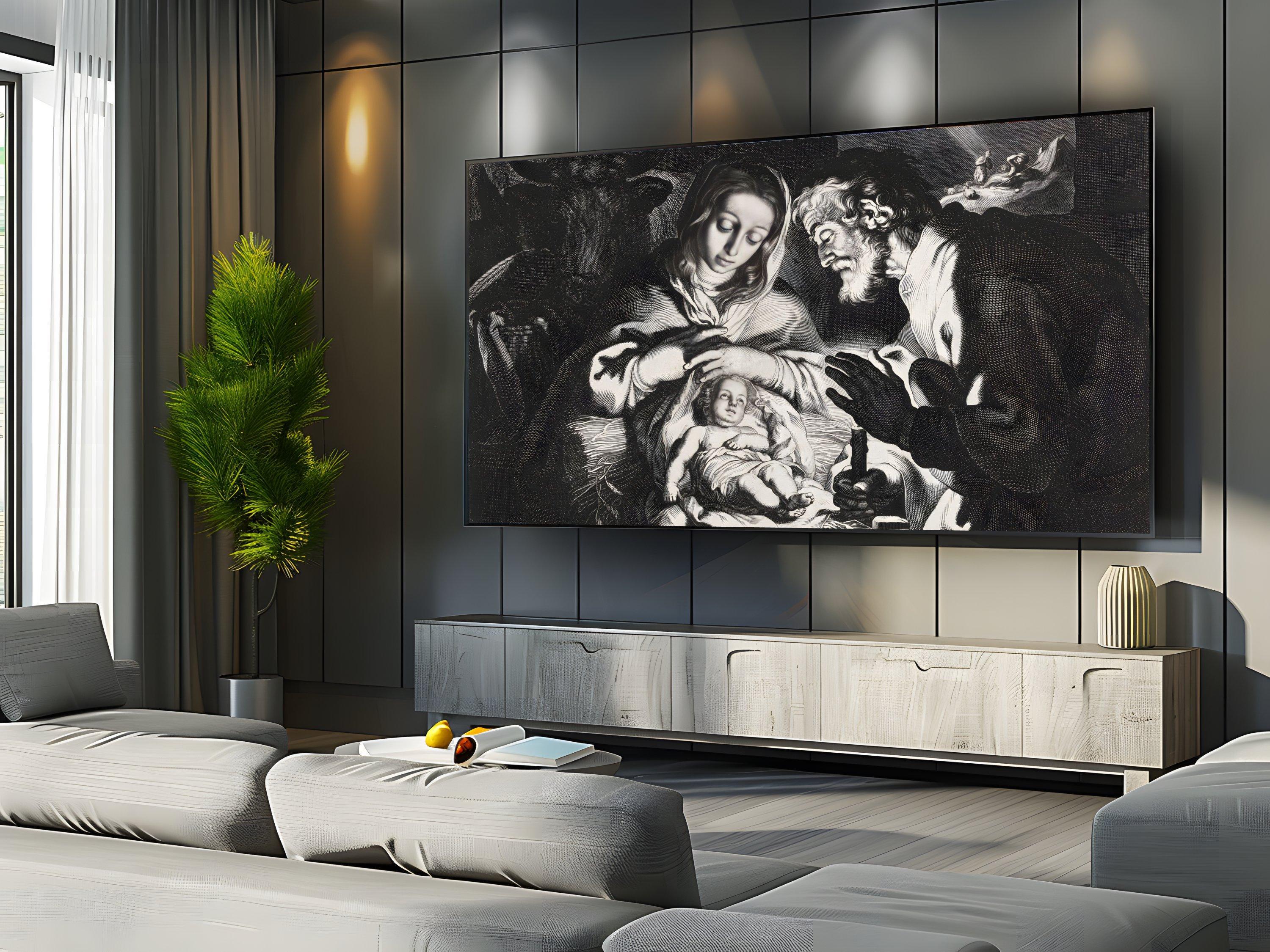 Discover a tranquil moment captured in this digital nativity art, where the warm spiritual scene of Mary, Joseph, and the infant Jesus unfolds beautifully on your screen. Designed specifically for TV screen decor, this piece brings a sacred family scene to life with intricate line work and a dramatic style print. Perfect for adding a modern Christmas art touch to your spiritual home decor, it blends tradition with contemporary elegance.