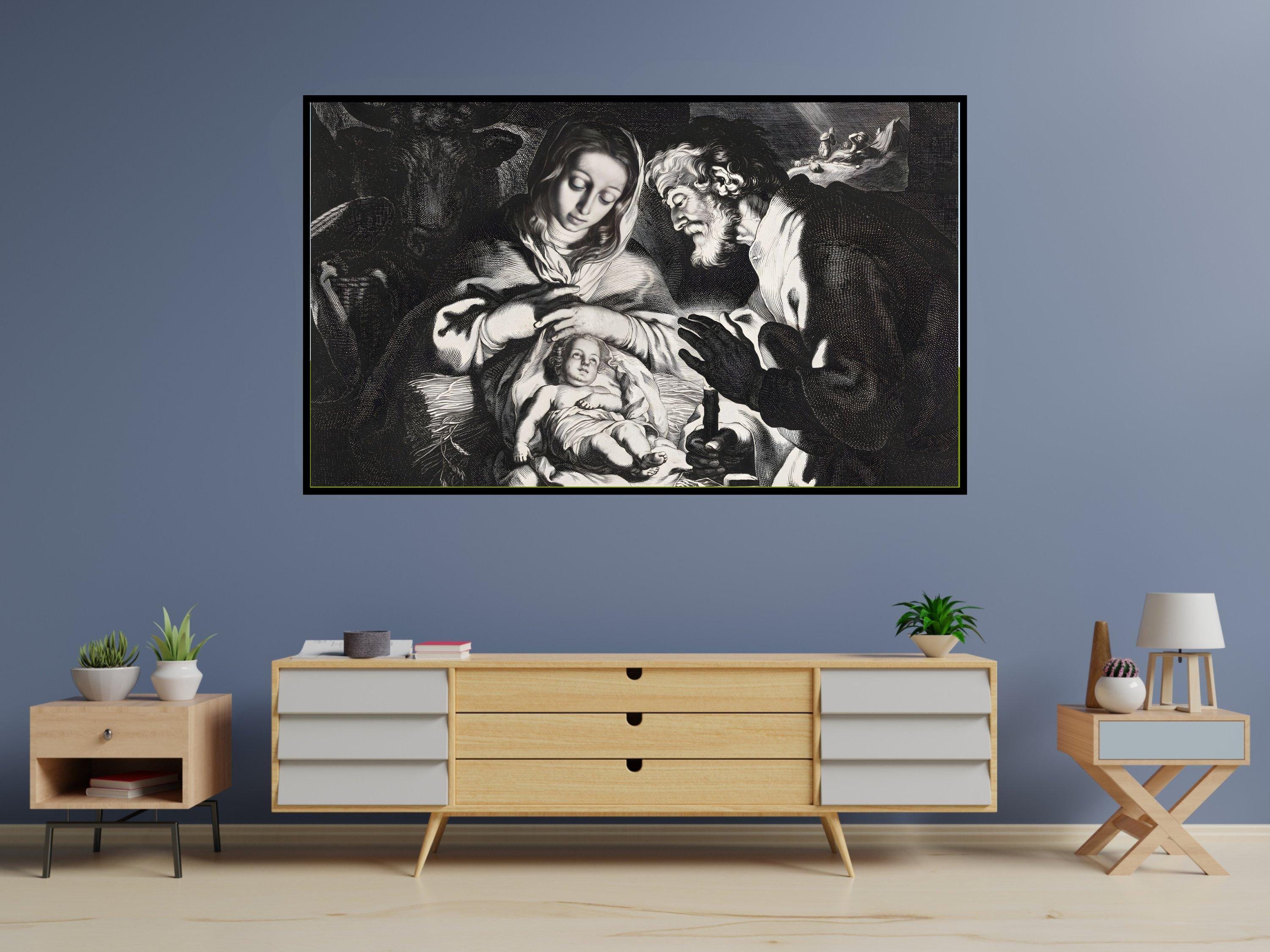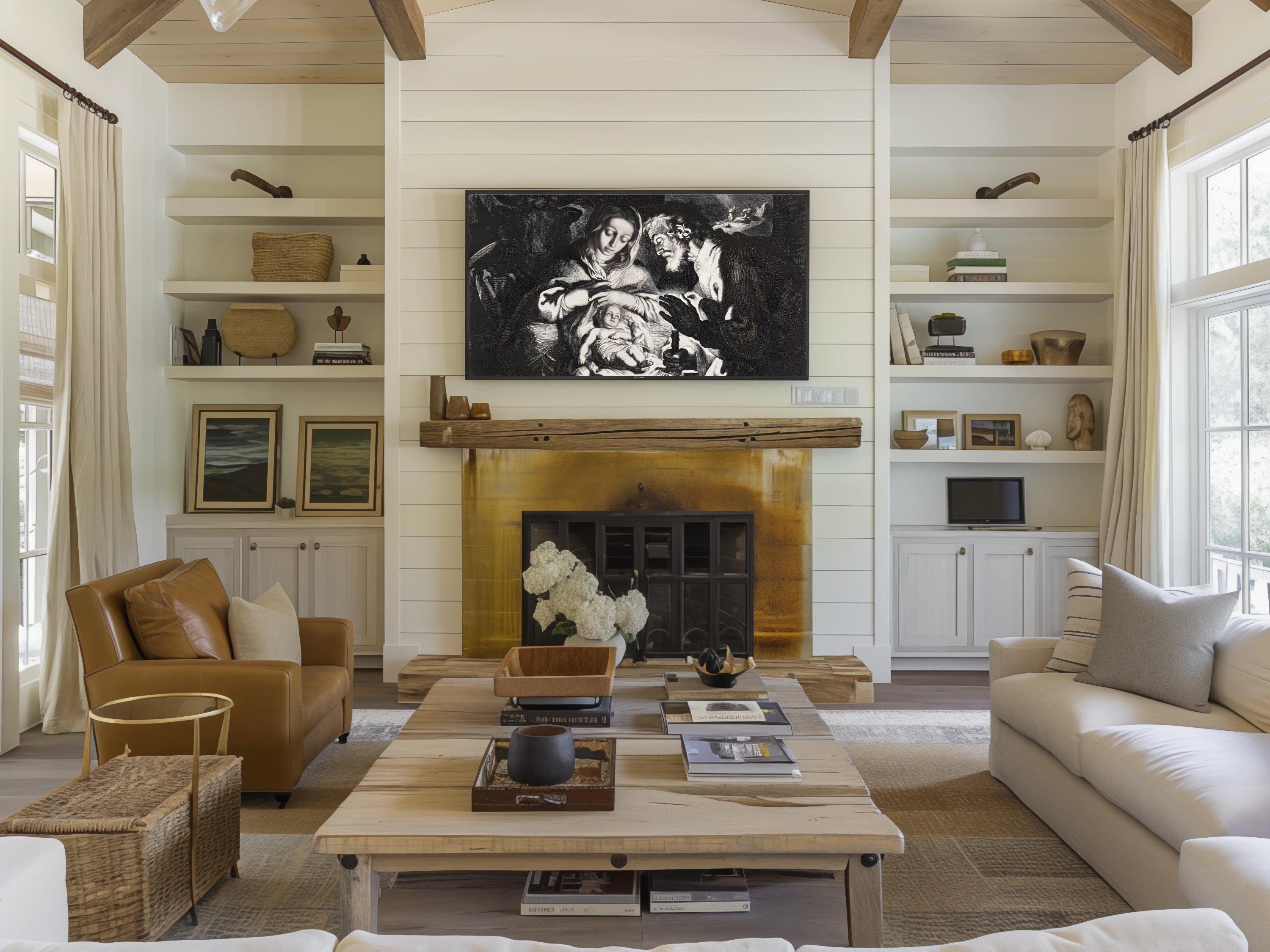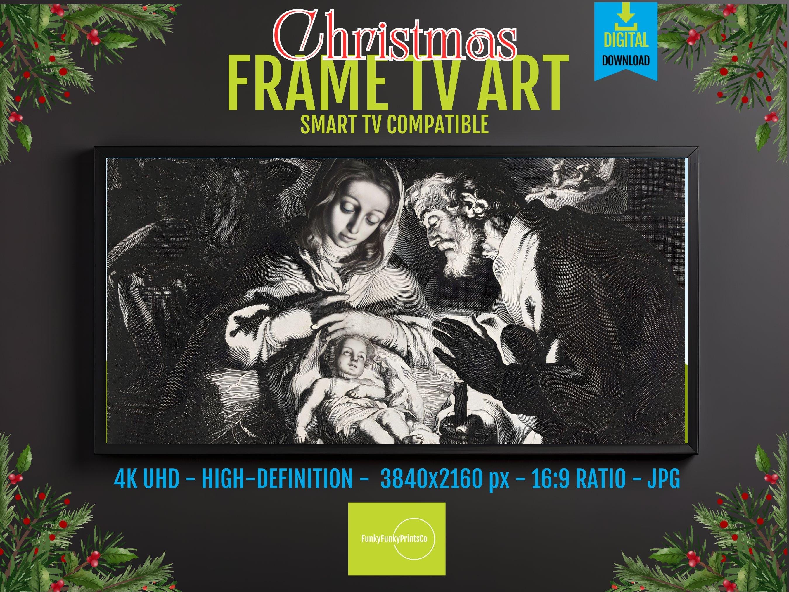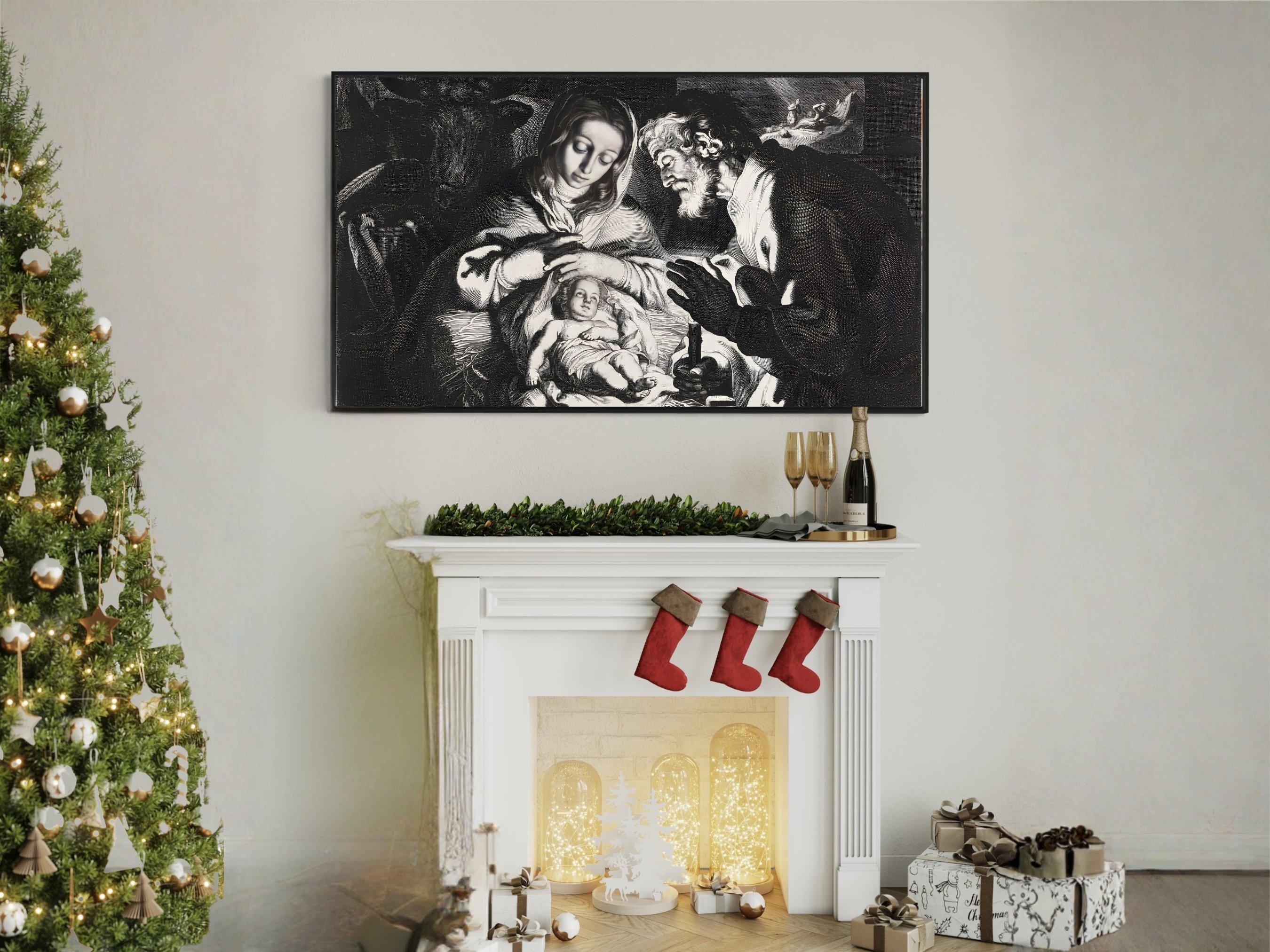Discover a tranquil moment captured in this digital nativity art, where the warm spiritual scene of Mary, Joseph, and the infant Jesus unfolds beautifully on your screen. Designed specifically for TV screen decor, this piece brings a sacred family scene to life with intricate line work and a dramatic style print. Perfect for adding a modern Christmas art touch to your spiritual home decor, it blends tradition with contemporary elegance.