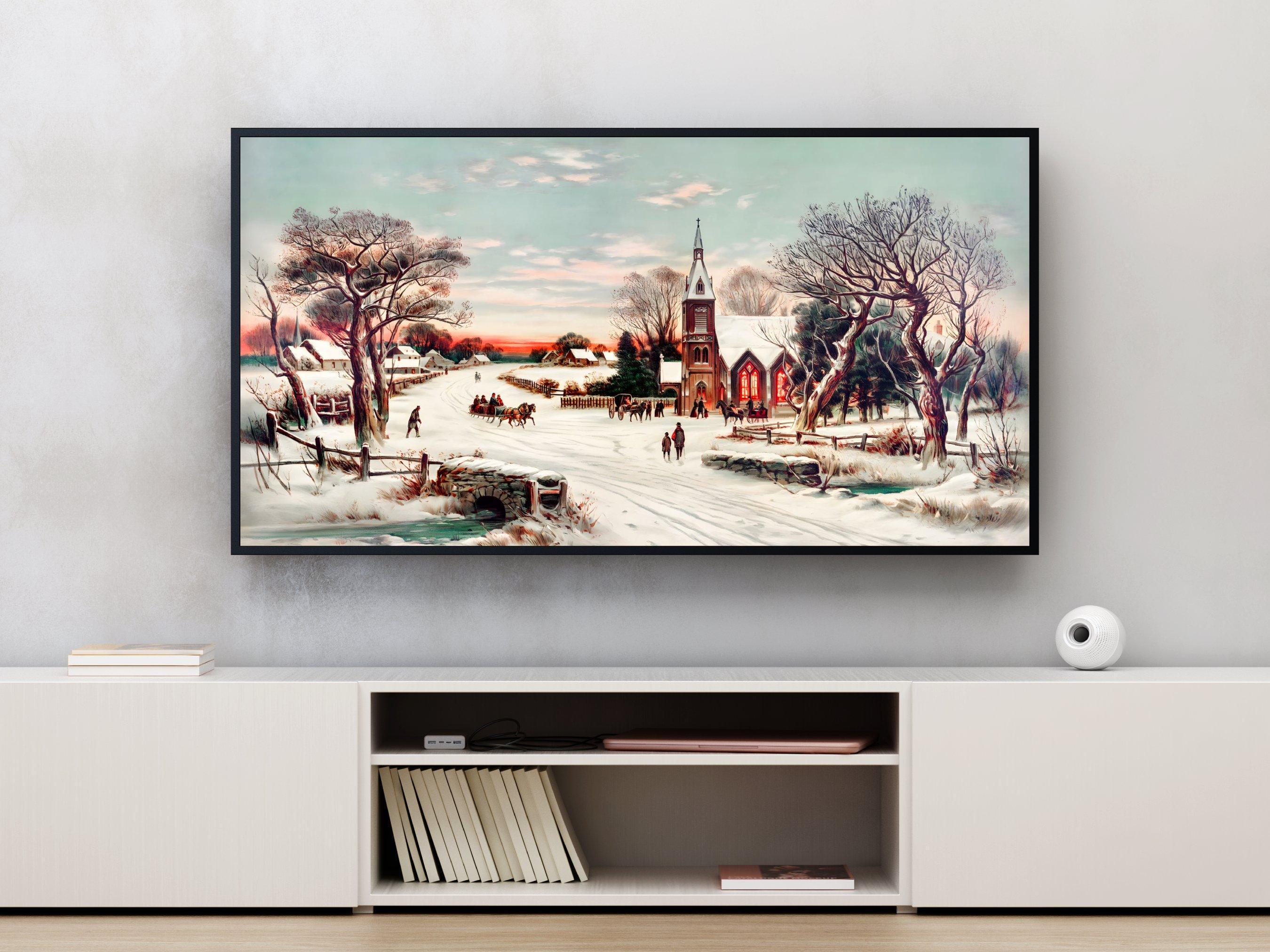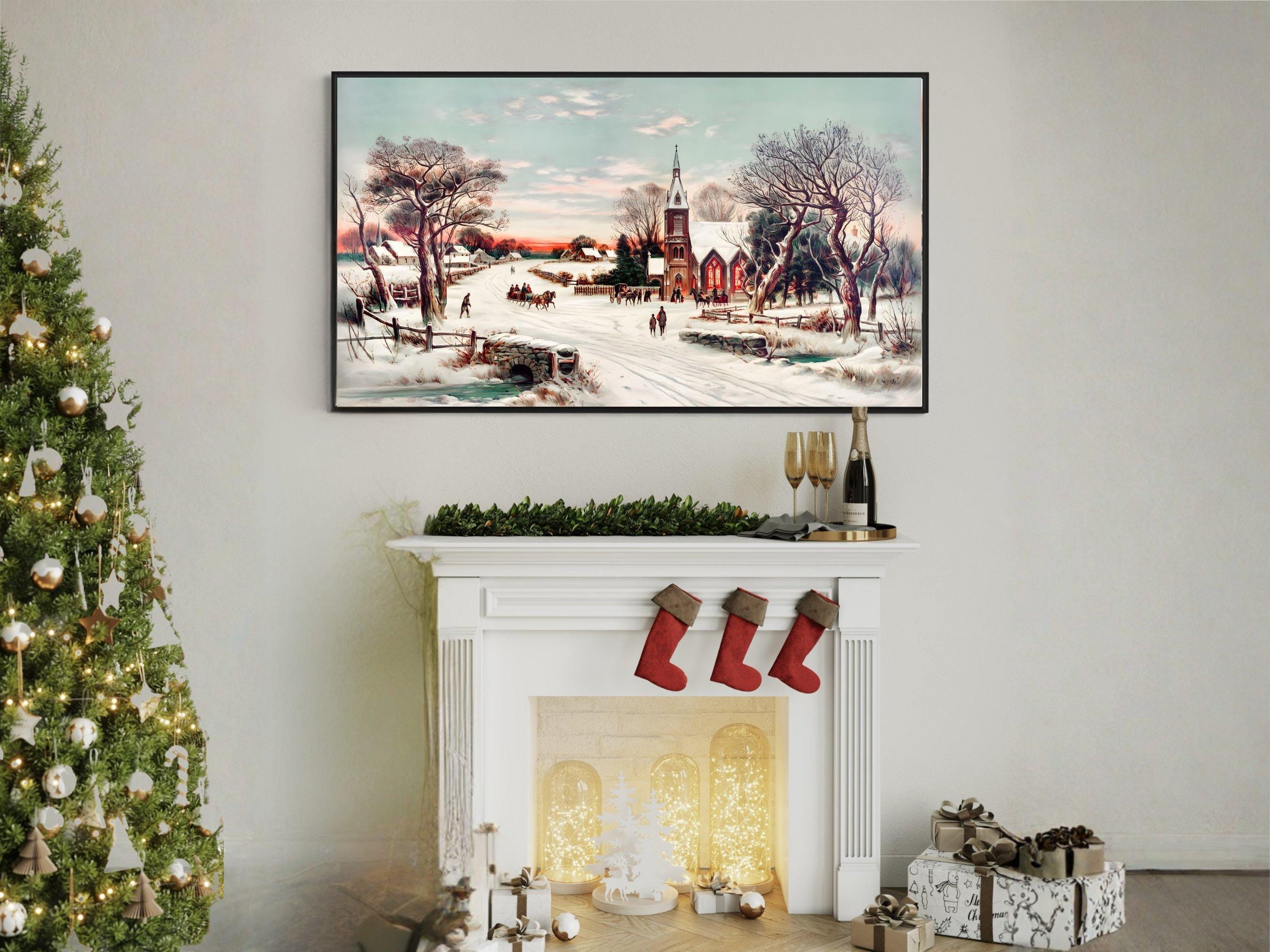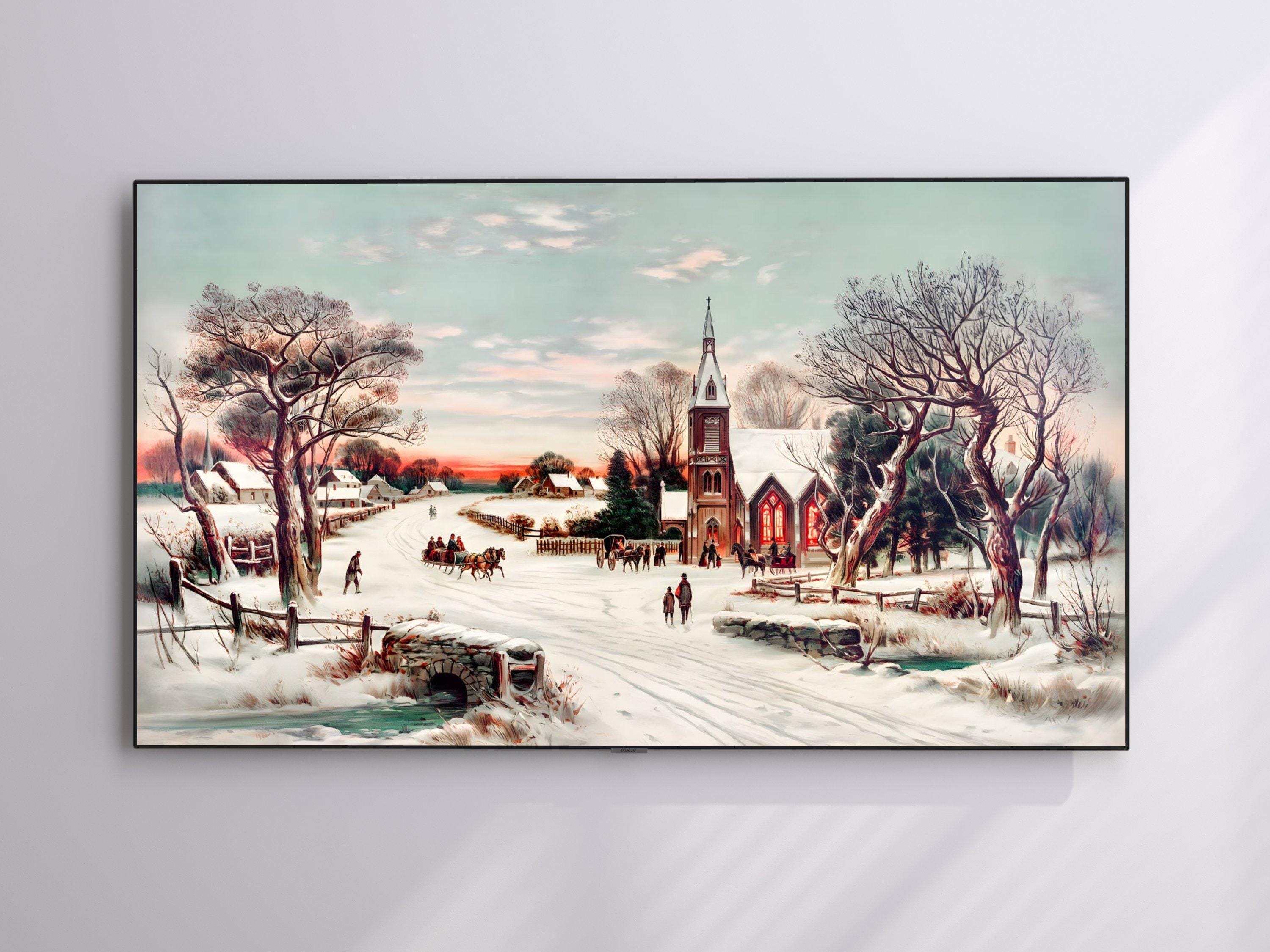 Step into a serene winter wonderland where a cozy church artwork glows warmly beneath a soft pastel palette of pink and blue skies. This charming carriage scene invites you to imagine a peaceful stroll along a snow covered path, evoking the nostalgic feel of vintage holiday cards. Perfectly designed for your Samsung Frame TV, this digital art download brings timeless holiday warmth and quaint village decor to your living space.