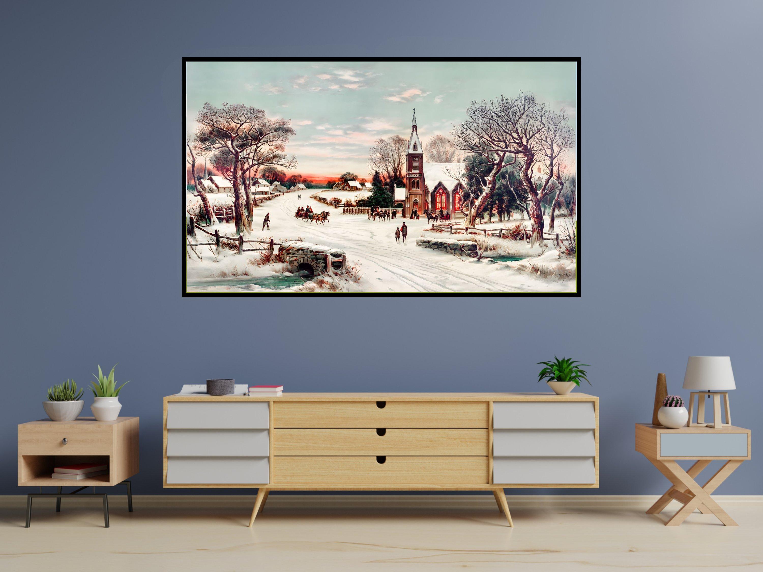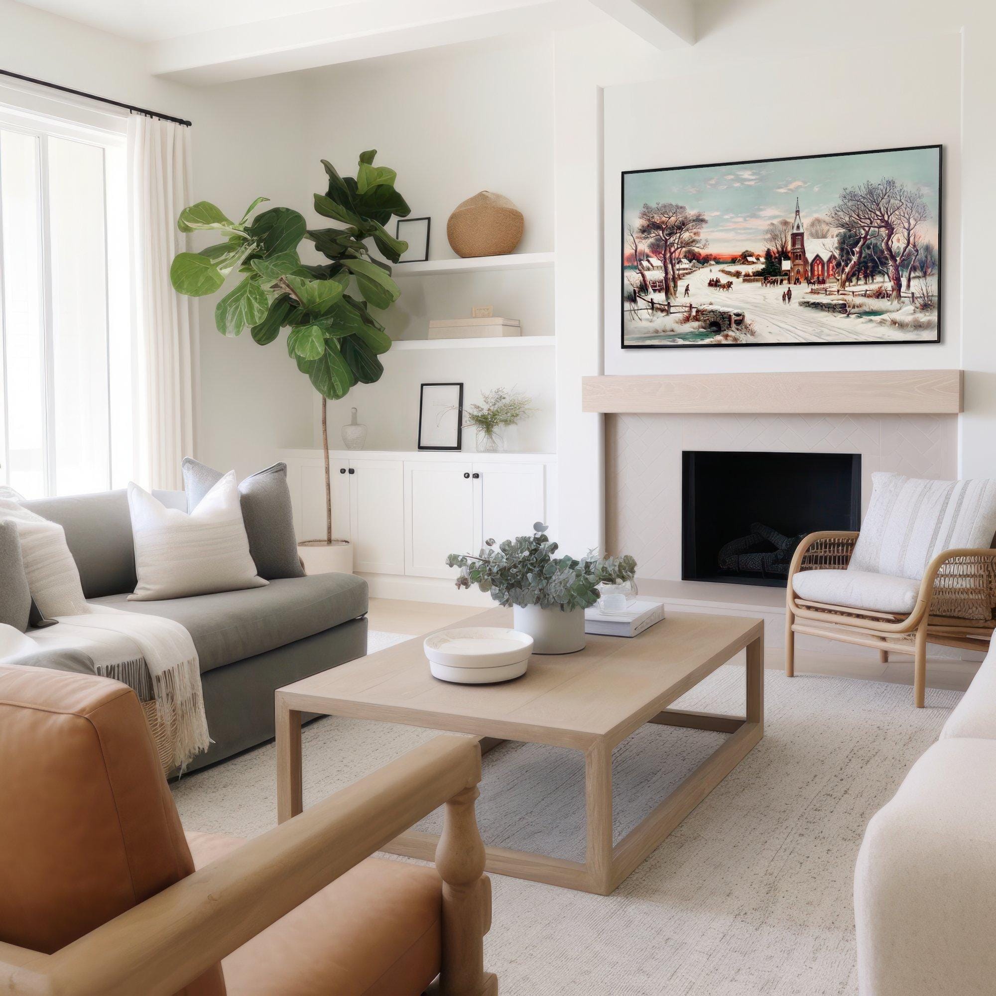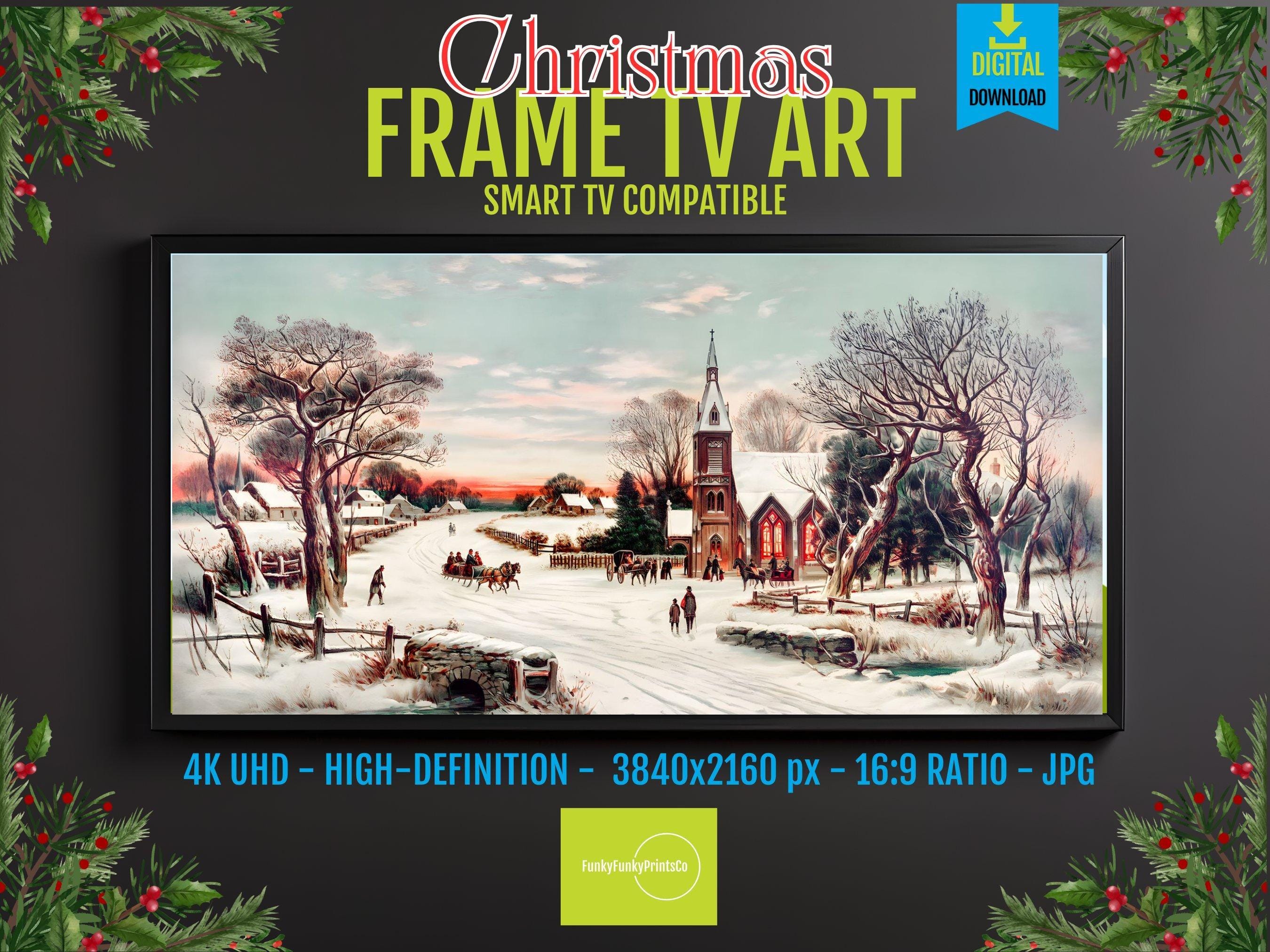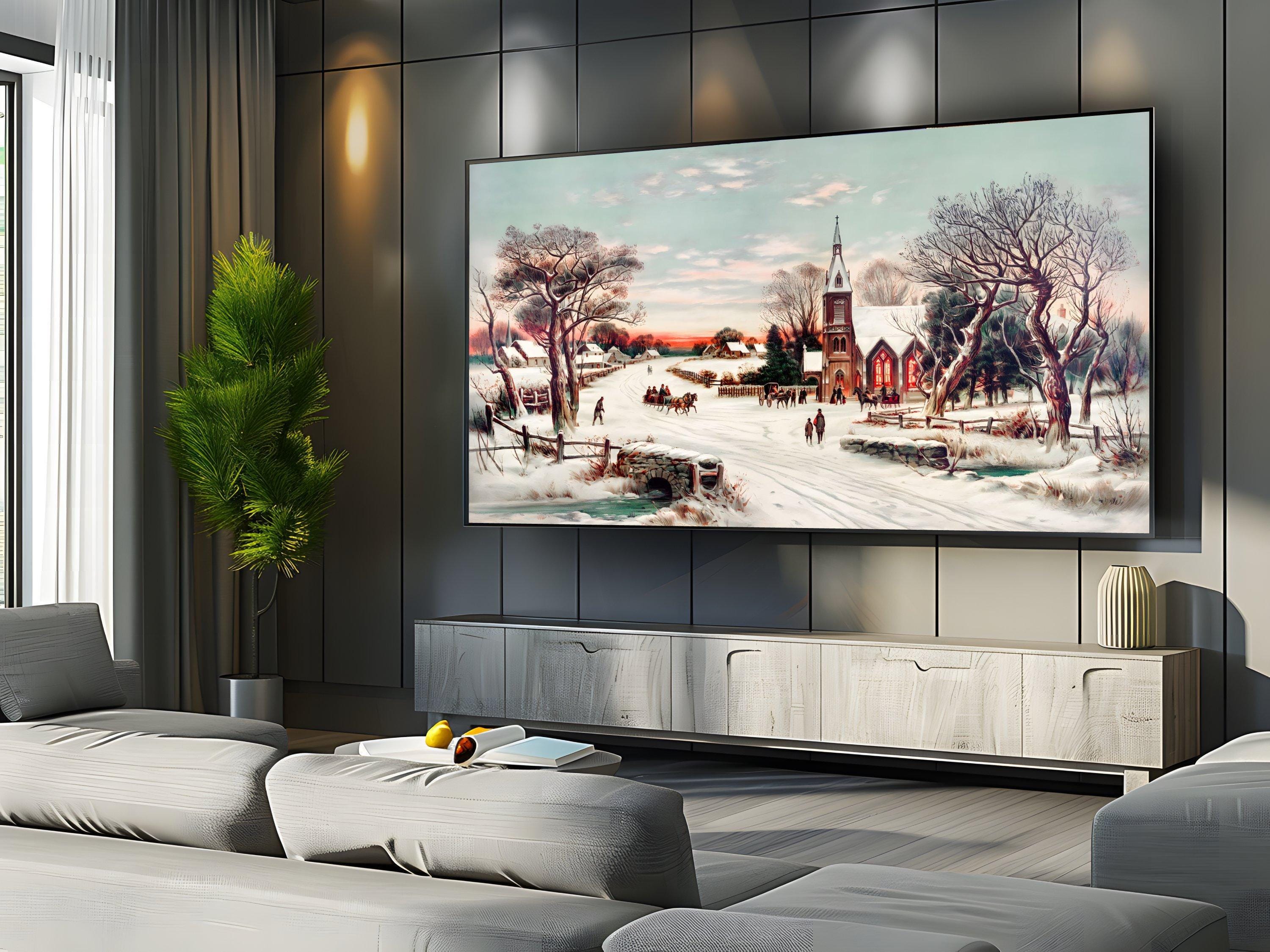 Step into a serene winter wonderland where a cozy church artwork glows warmly beneath a soft pastel palette of pink and blue skies. This charming carriage scene invites you to imagine a peaceful stroll along a snow covered path, evoking the nostalgic feel of vintage holiday cards. Perfectly designed for your Samsung Frame TV, this digital art download brings timeless holiday warmth and quaint village decor to your living space.