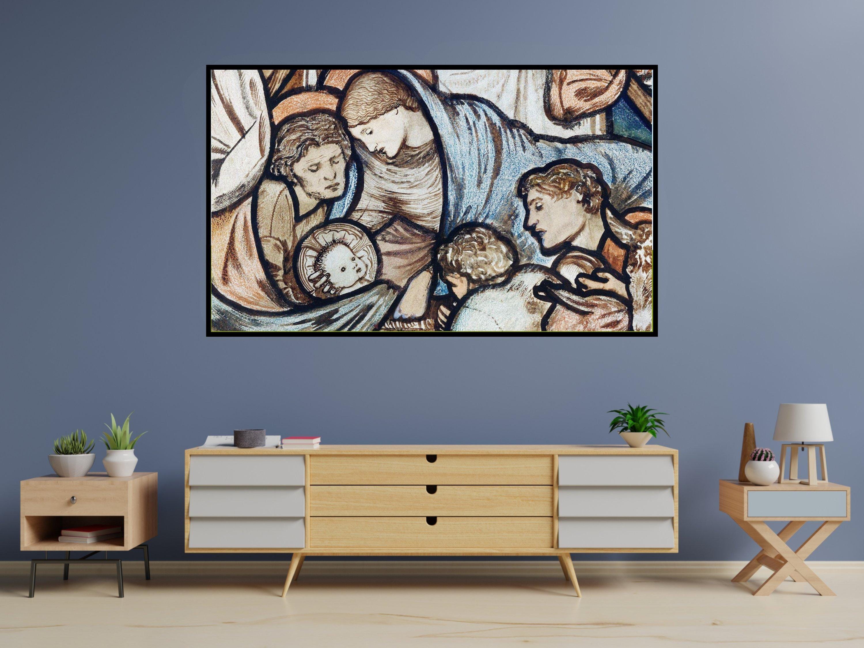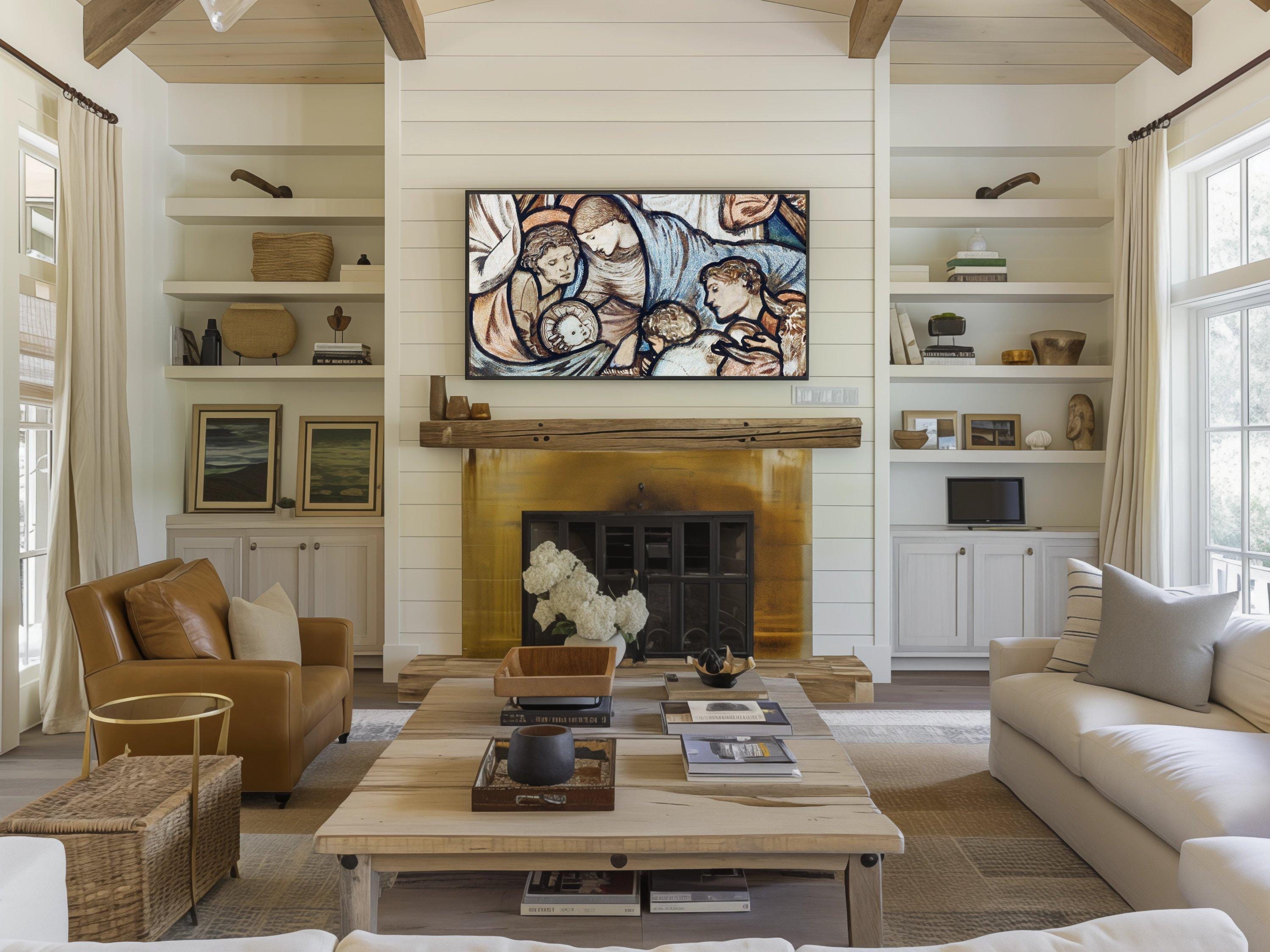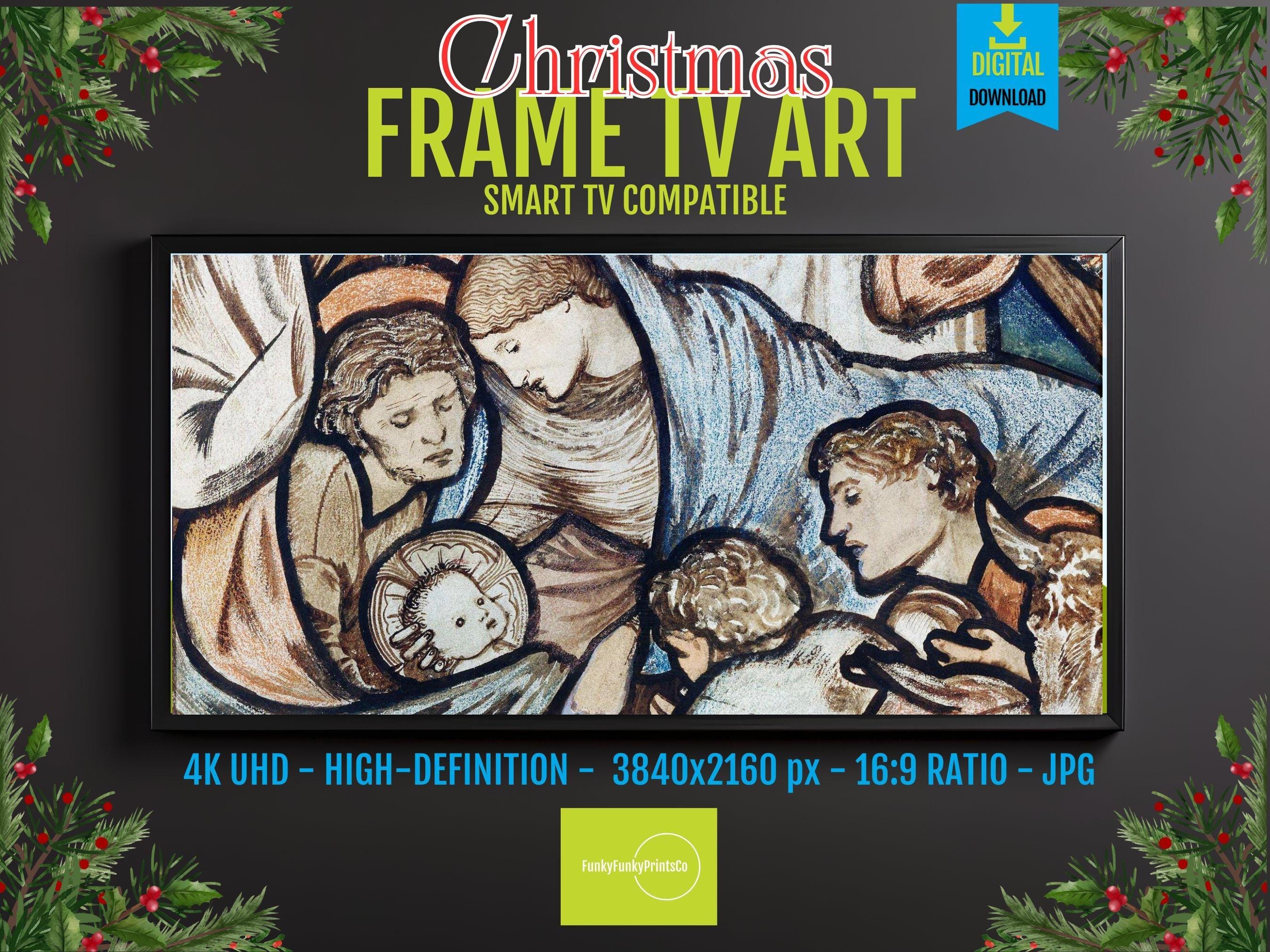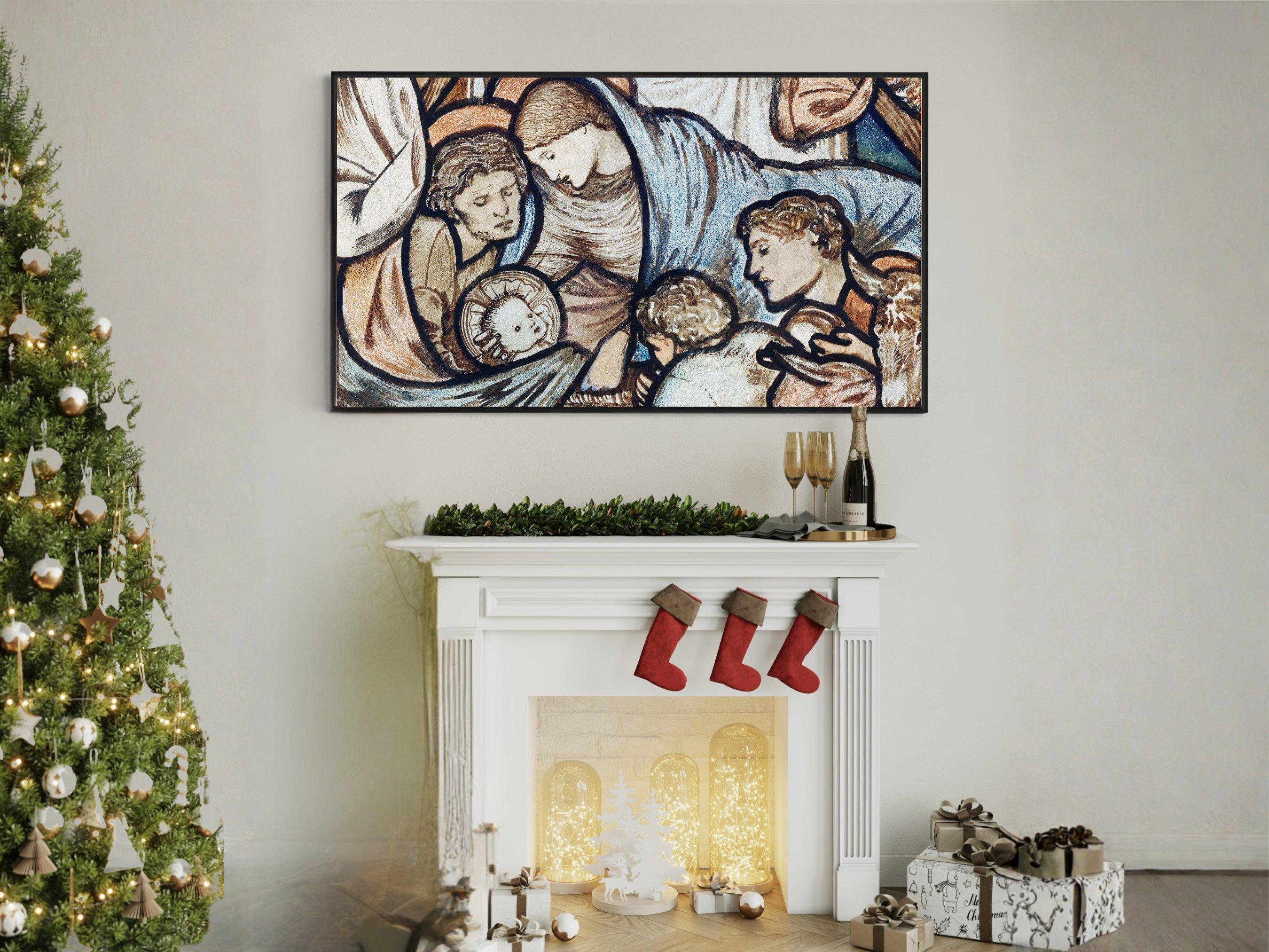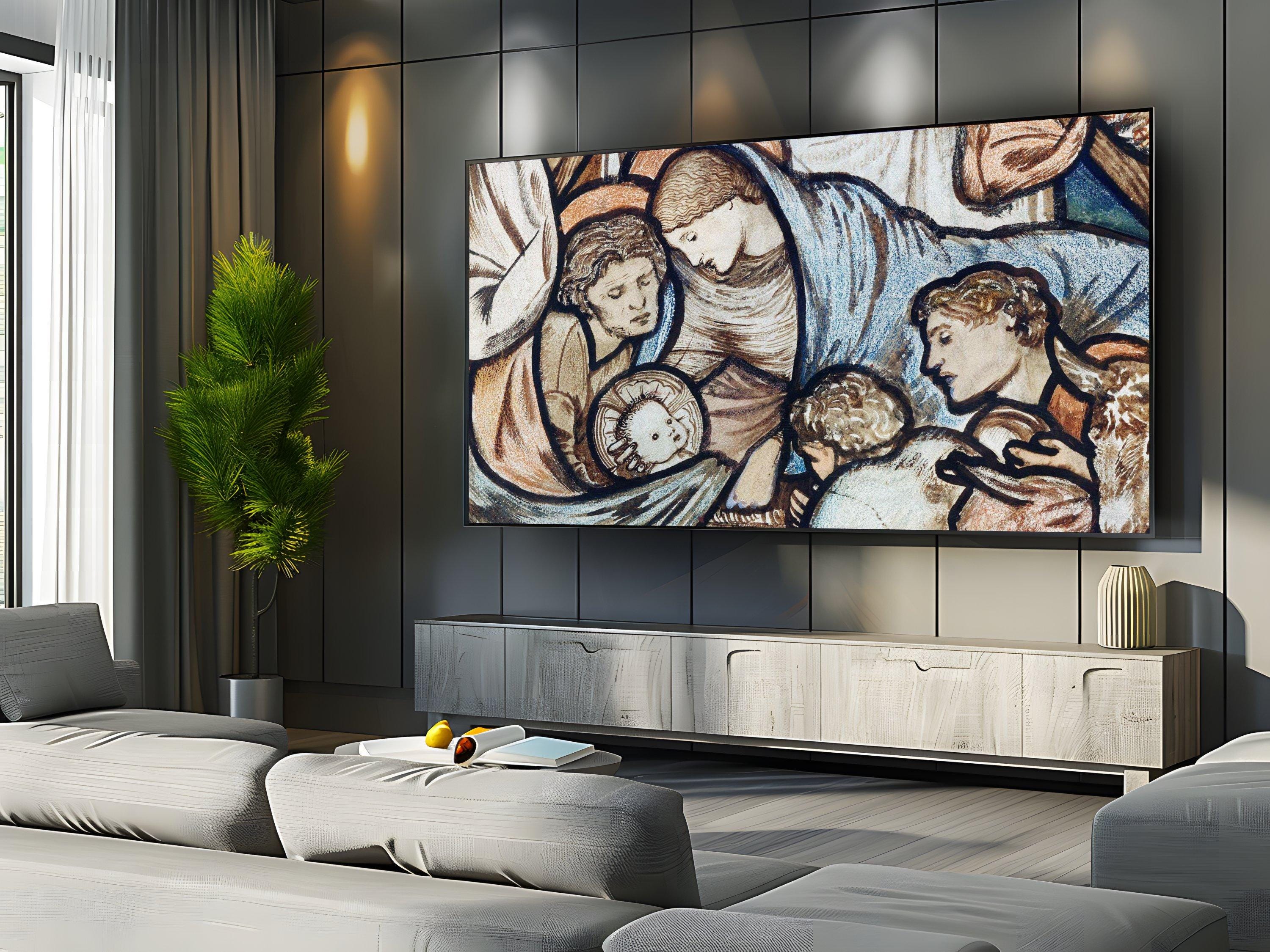 Step into a tranquil world where religious wall art meets tender emotion in this beautiful mother and child scene. Rendered in soft earth tones and pastel earth tones, the digital artwork captures a serene moment that invites calm and reflection. Designed specifically for Samsung Frame art, this piece blends stained glass style with flowing garments art to create a spiritual ambiance perfect for any home.