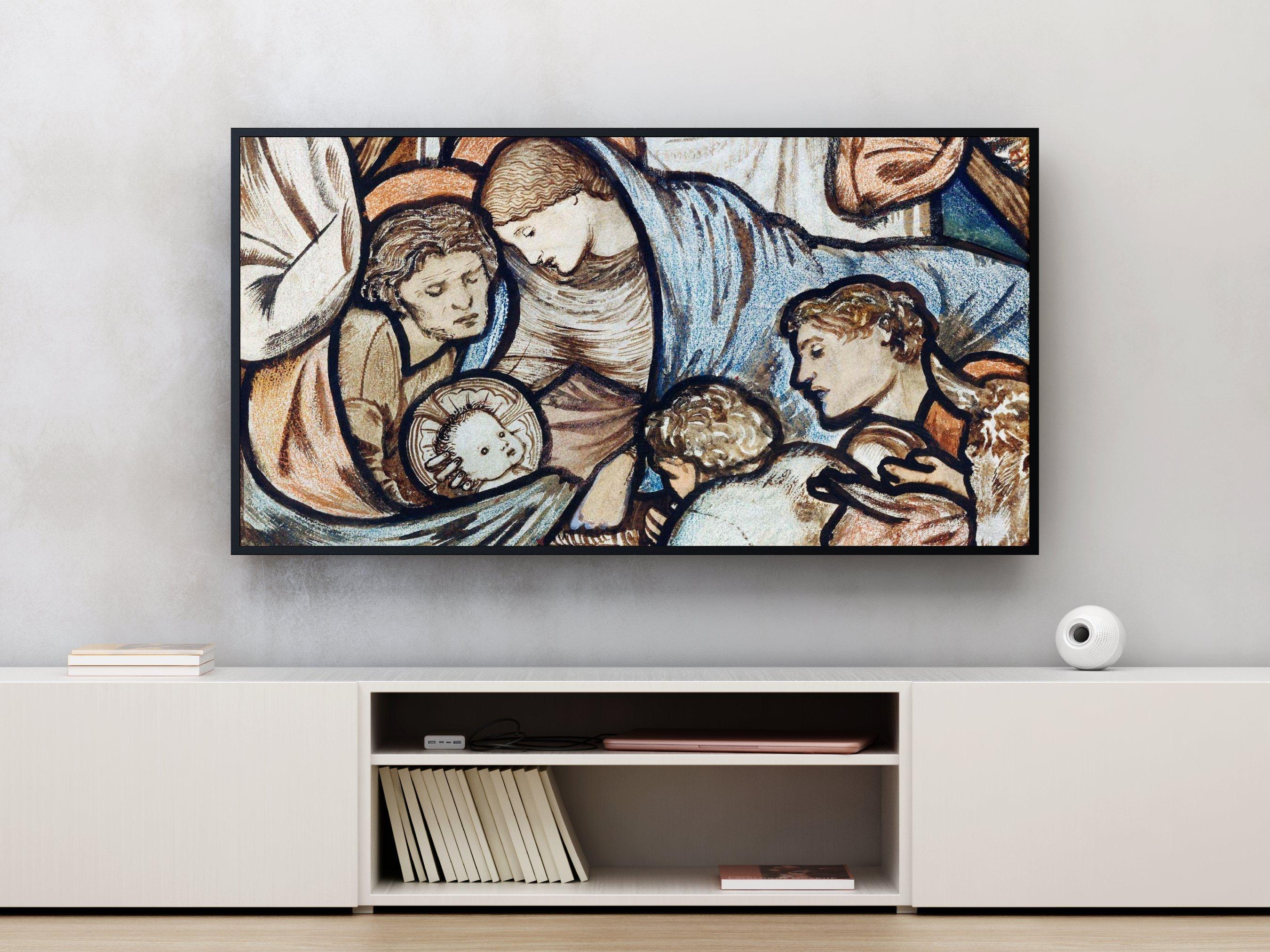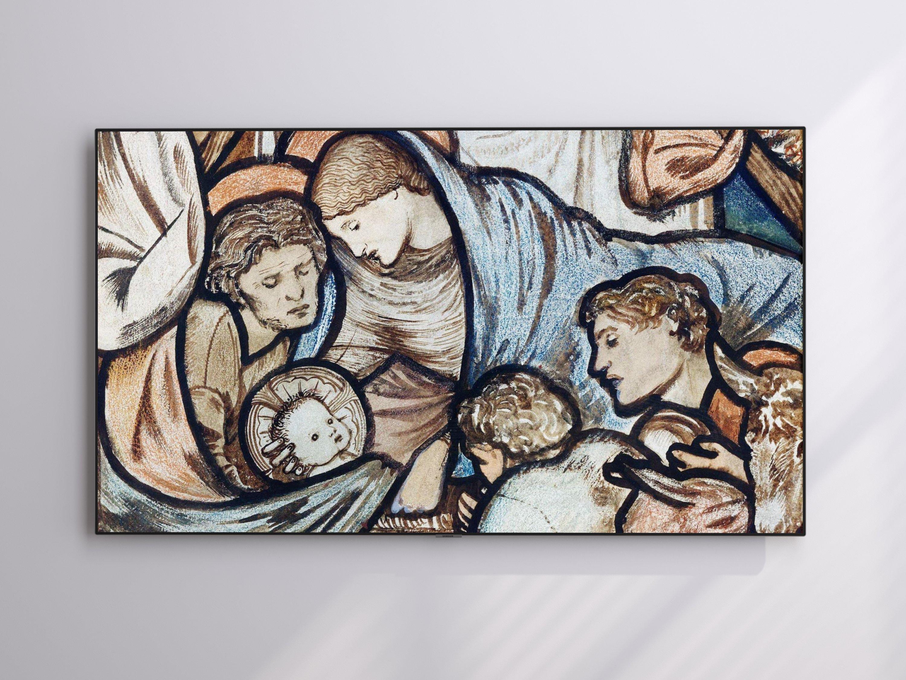 Step into a tranquil world where religious wall art meets tender emotion in this beautiful mother and child scene. Rendered in soft earth tones and pastel earth tones, the digital artwork captures a serene moment that invites calm and reflection. Designed specifically for Samsung Frame art, this piece blends stained glass style with flowing garments art to create a spiritual ambiance perfect for any home.