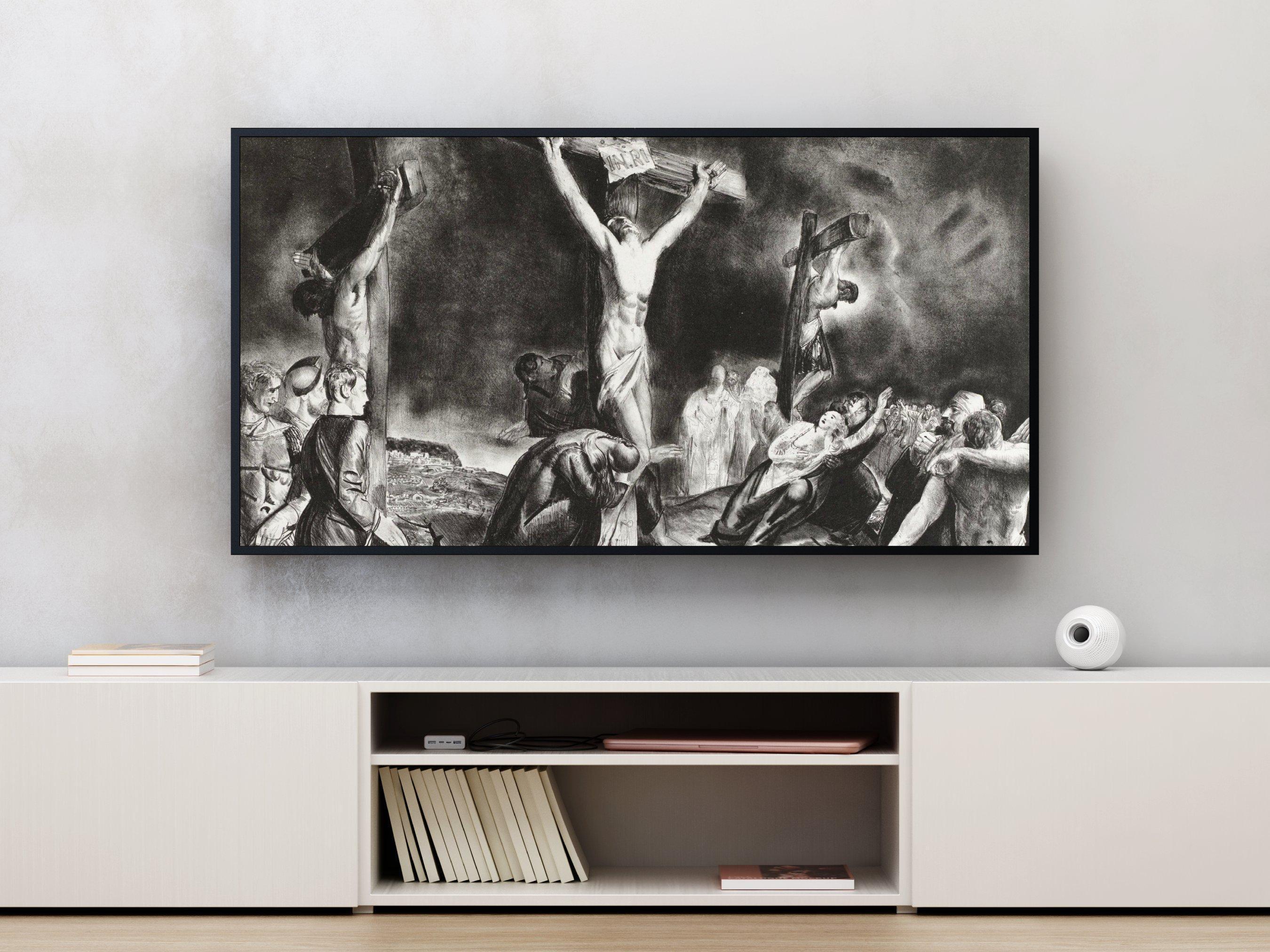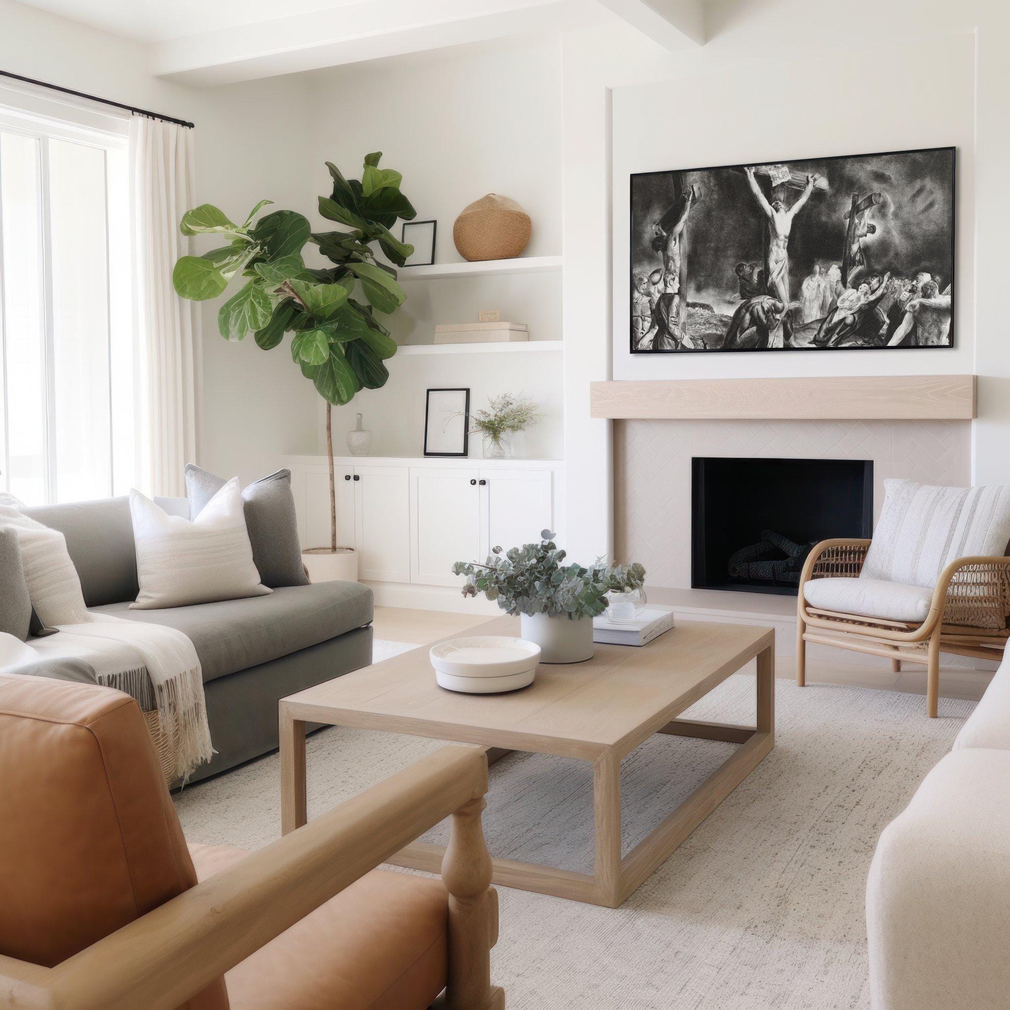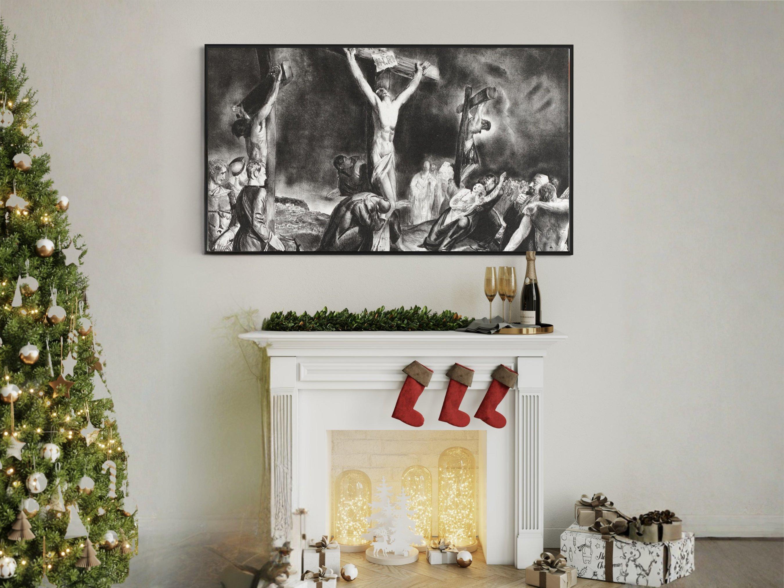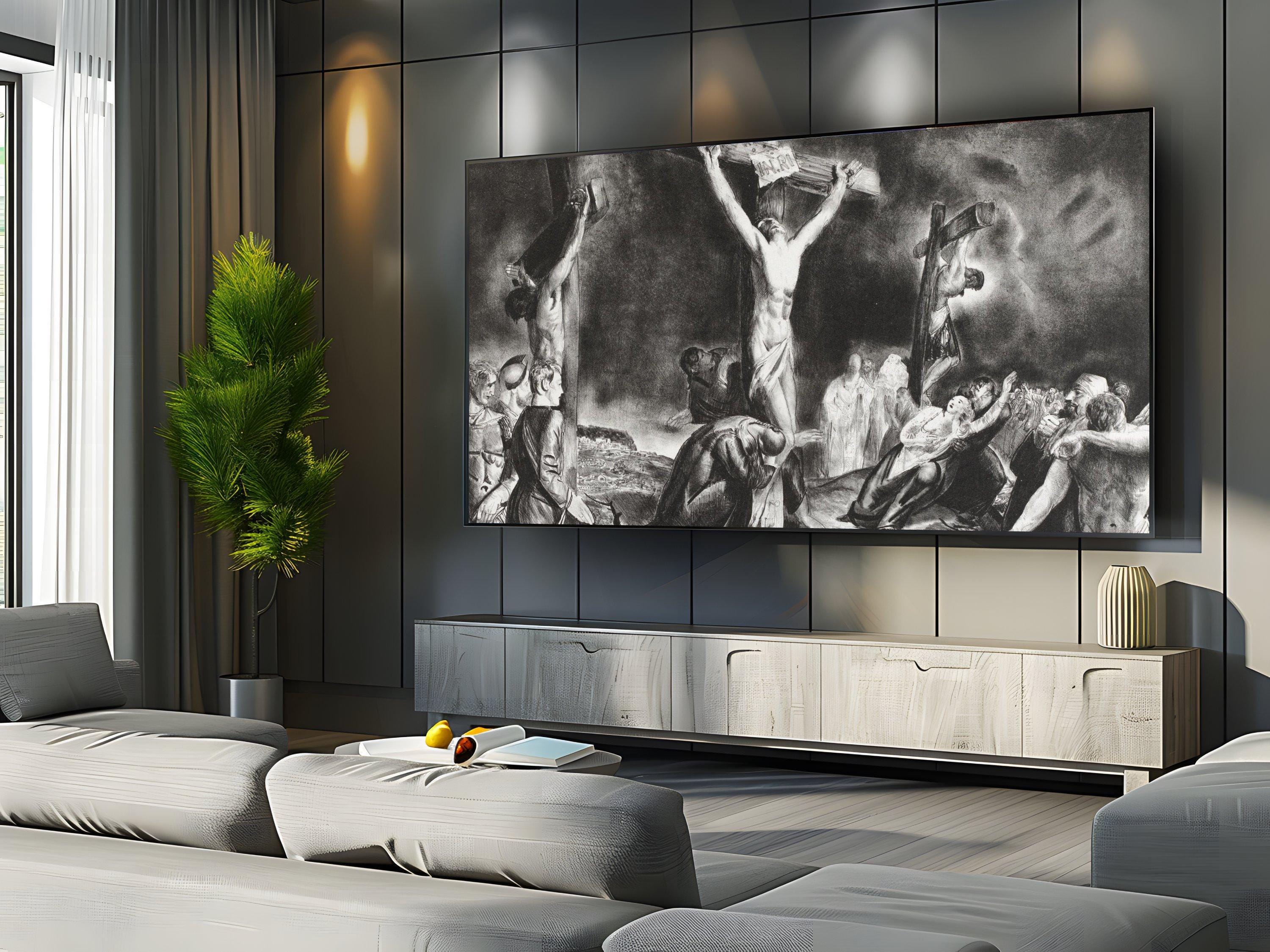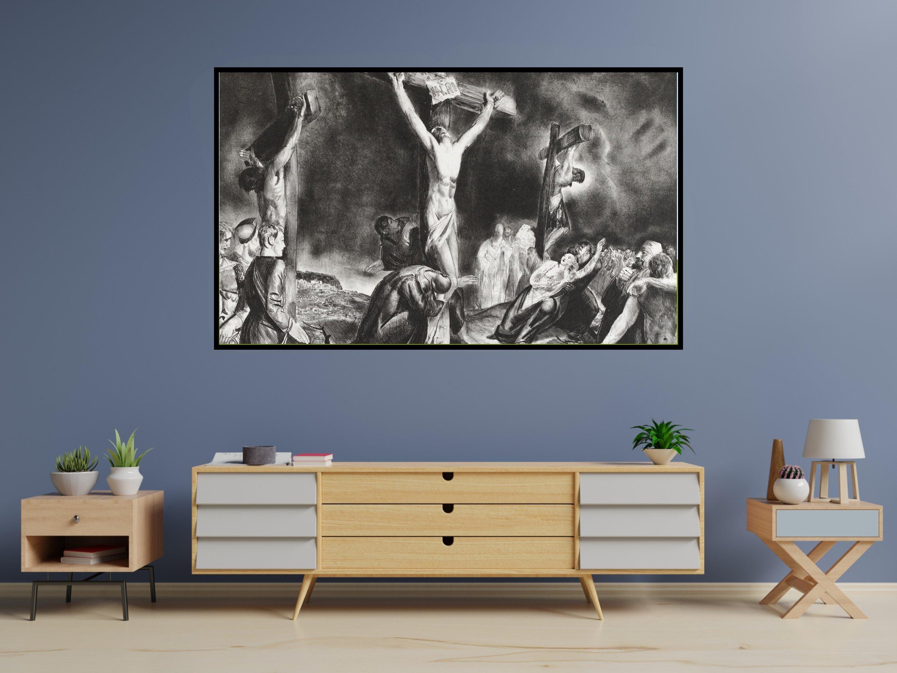 Step into a moment of profound reflection with this evocative digital download art, where sorrow and faith intertwine in a striking black and gray palette. Inspired by old master style paintings, this piece captures a dramatic crucifixion scene that resonates deeply with those seeking meaningful Christian faith gifts or religious home decor. The interplay of light and shadow invites contemplation, making it a powerful addition to any spiritual space.