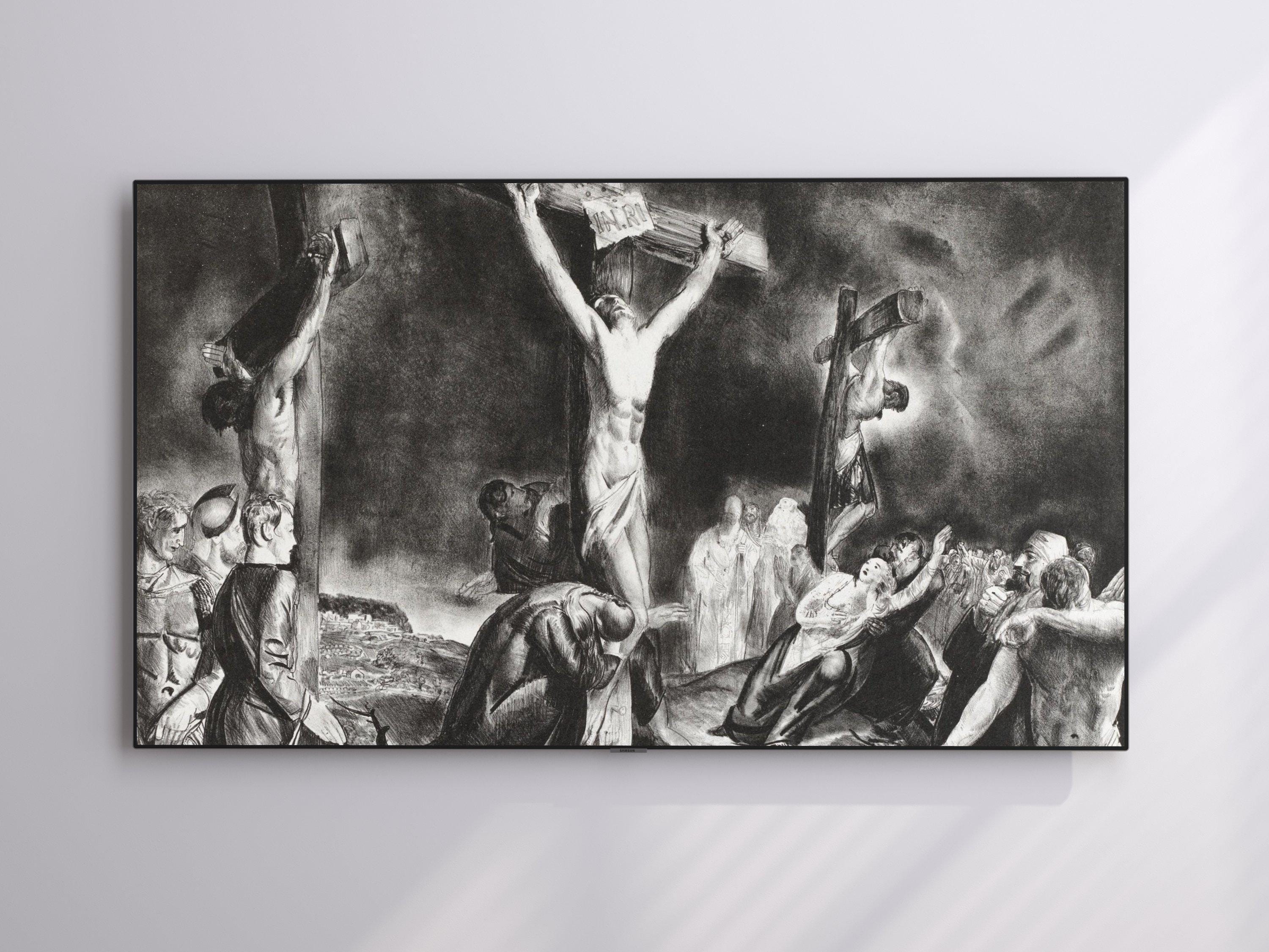 Step into a moment of profound reflection with this evocative digital download art, where sorrow and faith intertwine in a striking black and gray palette. Inspired by old master style paintings, this piece captures a dramatic crucifixion scene that resonates deeply with those seeking meaningful Christian faith gifts or religious home decor. The interplay of light and shadow invites contemplation, making it a powerful addition to any spiritual space.
