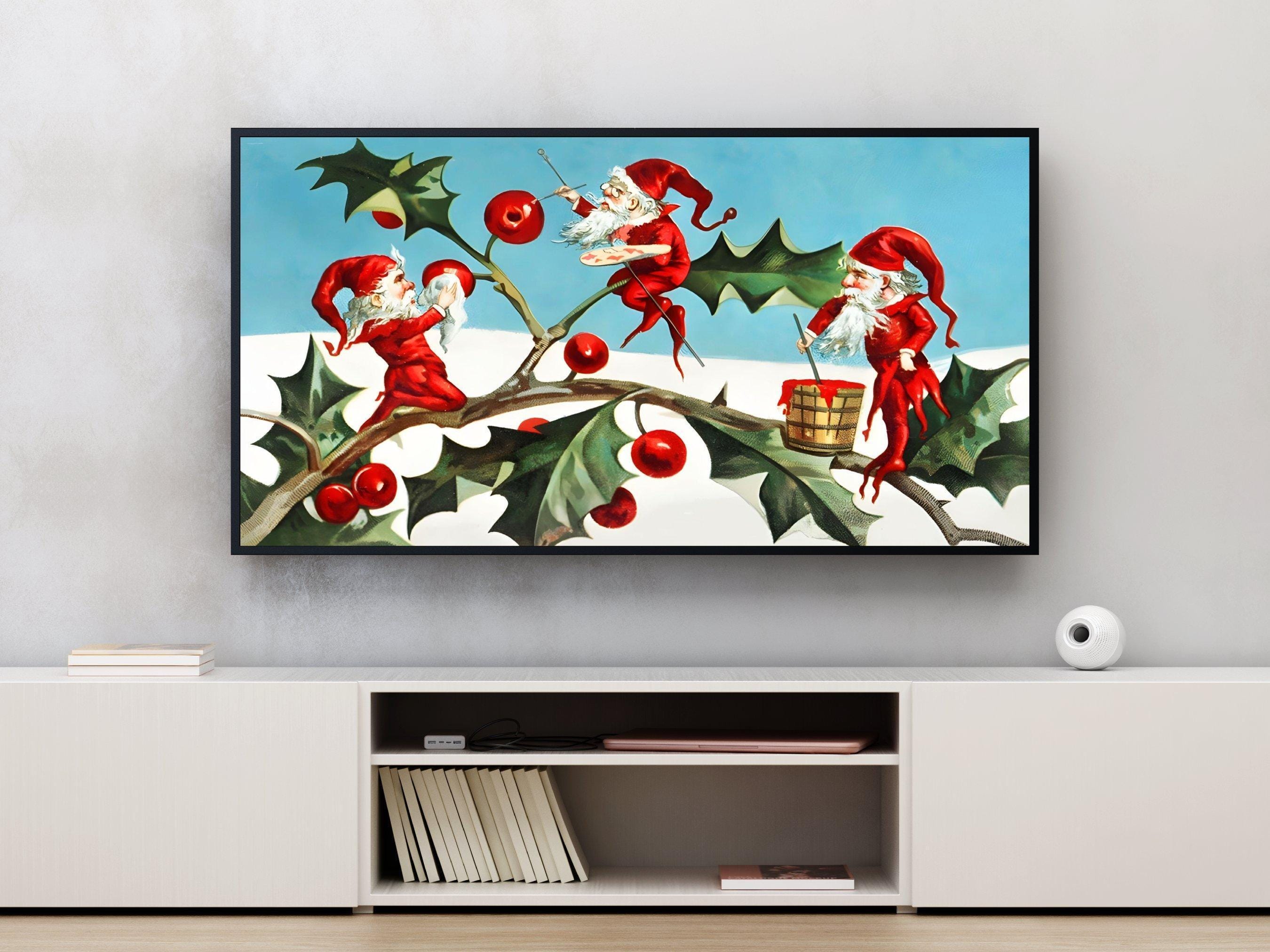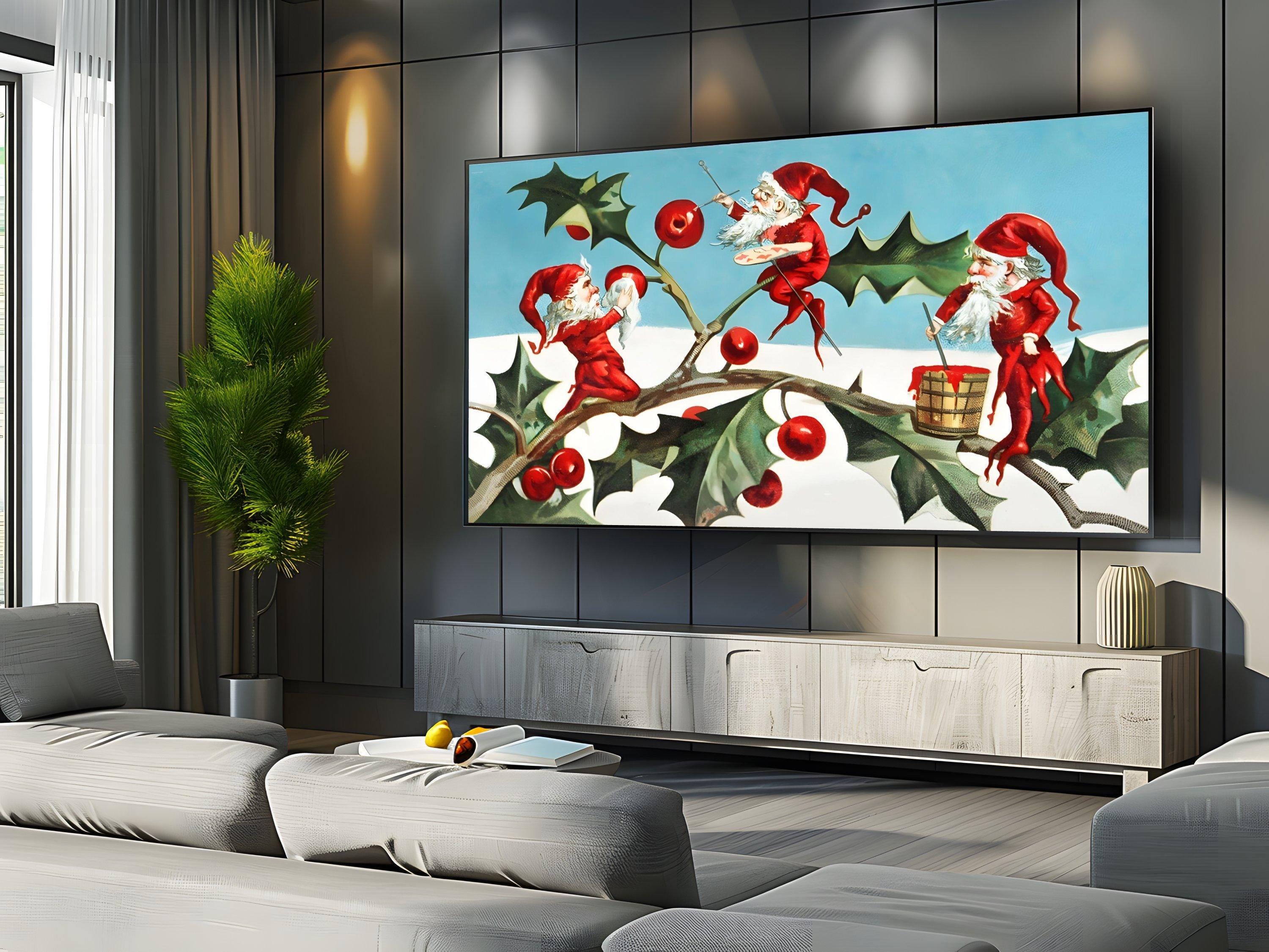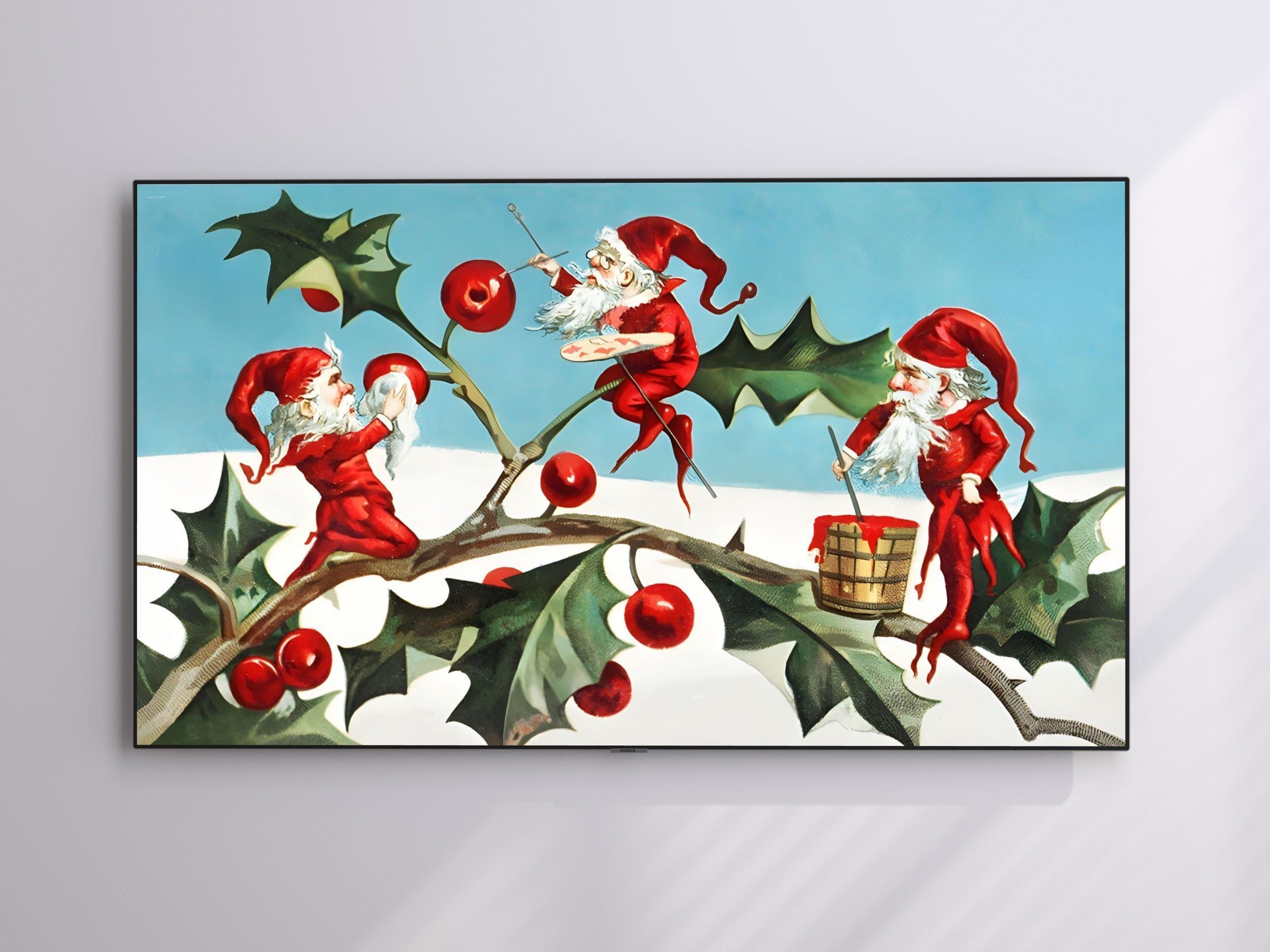 Step into a whimsical winter wonderland where holiday gnome art brings festive cheer to your digital space. These playful figures, dressed in bright red outfits, dance among holly branches and vibrant red berries, capturing the magic of the season in a cheerful red scene. Perfect for adding a touch of fantasy holiday art to your seasonal wall or gifting a unique gnome gift idea.