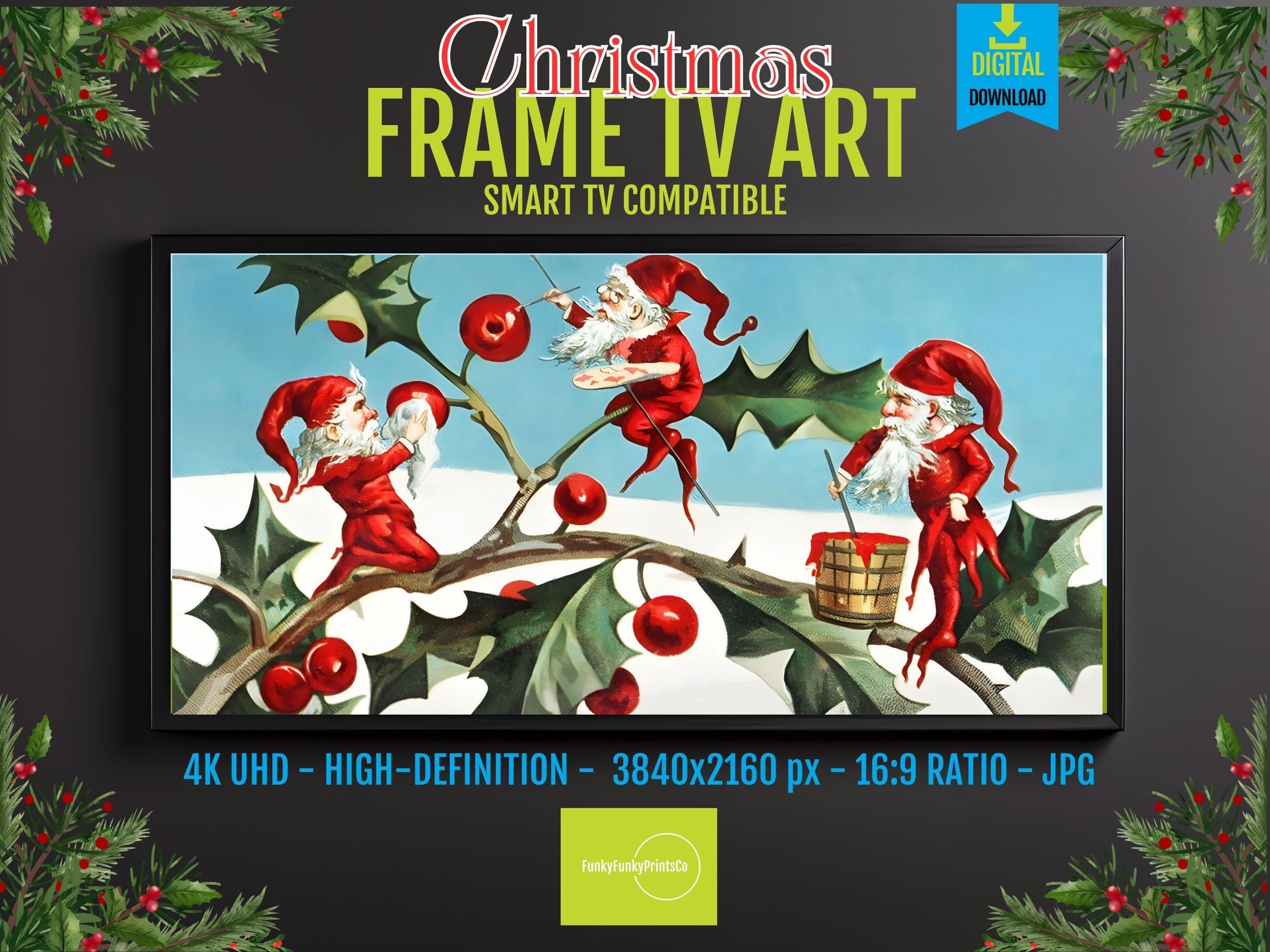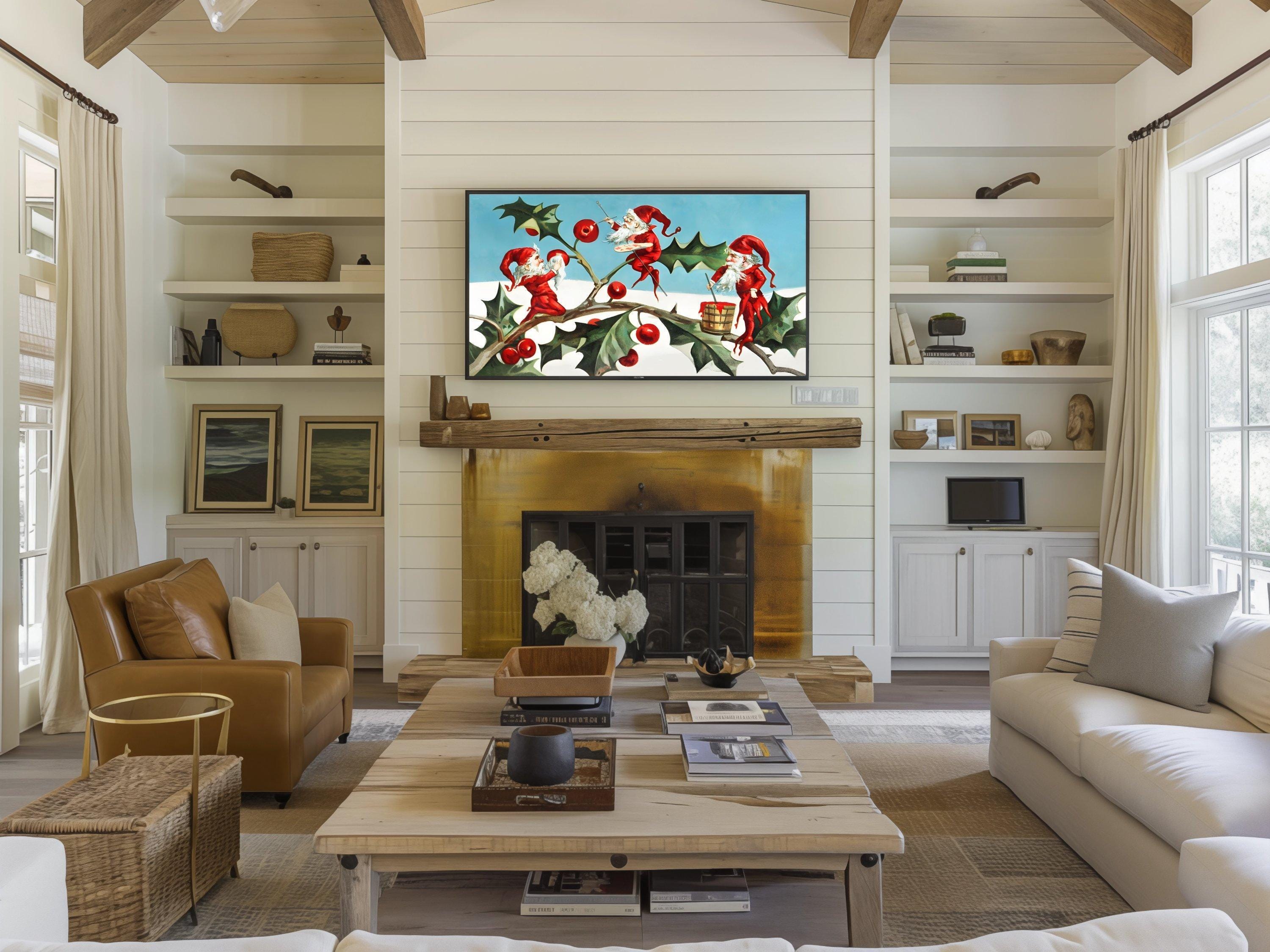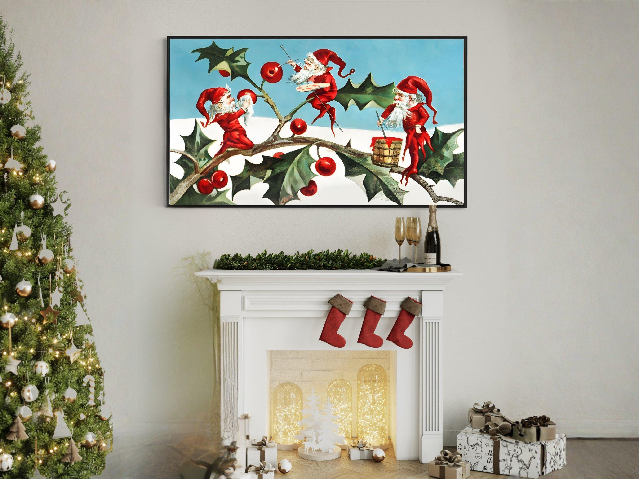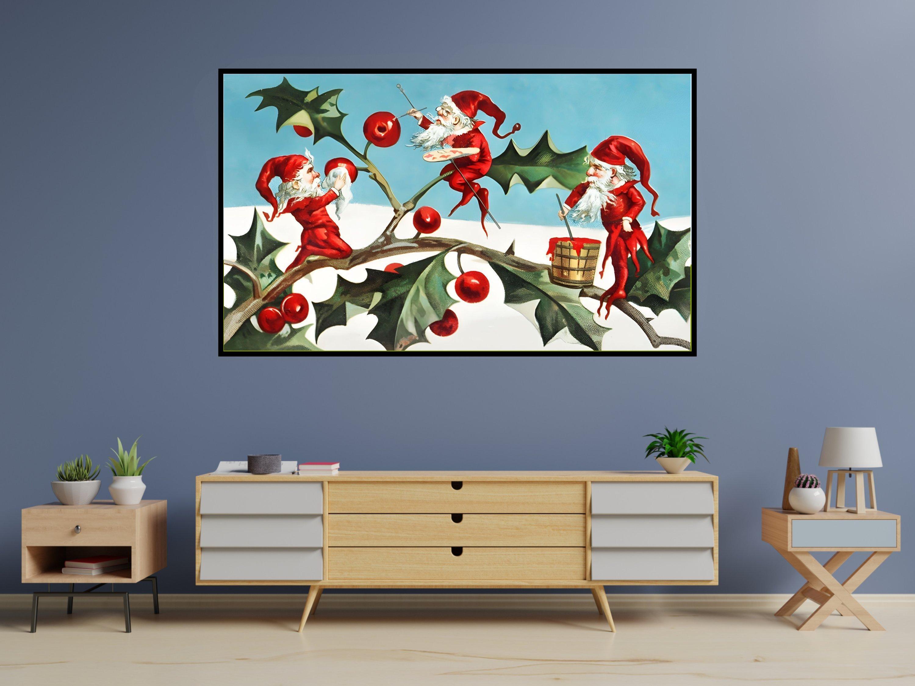 Step into a whimsical winter wonderland where holiday gnome art brings festive cheer to your digital space. These playful figures, dressed in bright red outfits, dance among holly branches and vibrant red berries, capturing the magic of the season in a cheerful red scene. Perfect for adding a touch of fantasy holiday art to your seasonal wall or gifting a unique gnome gift idea.