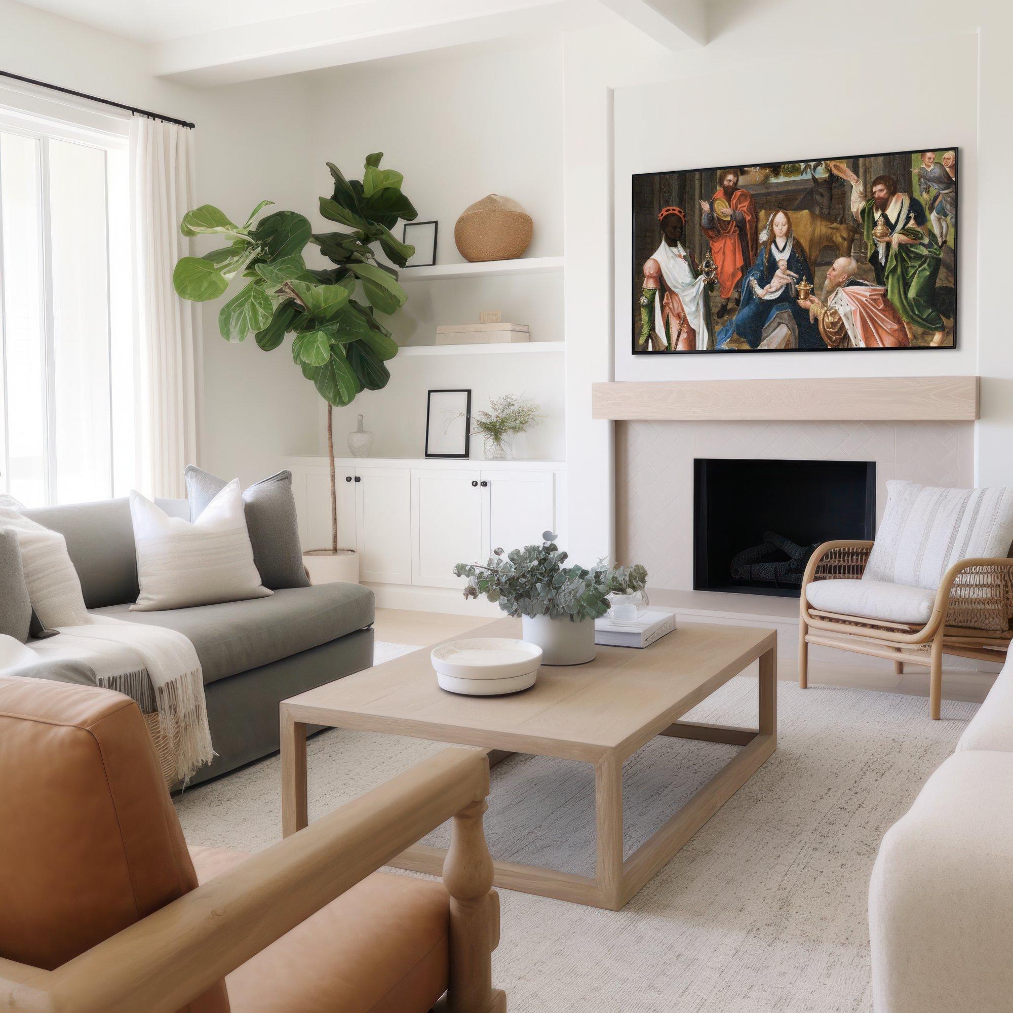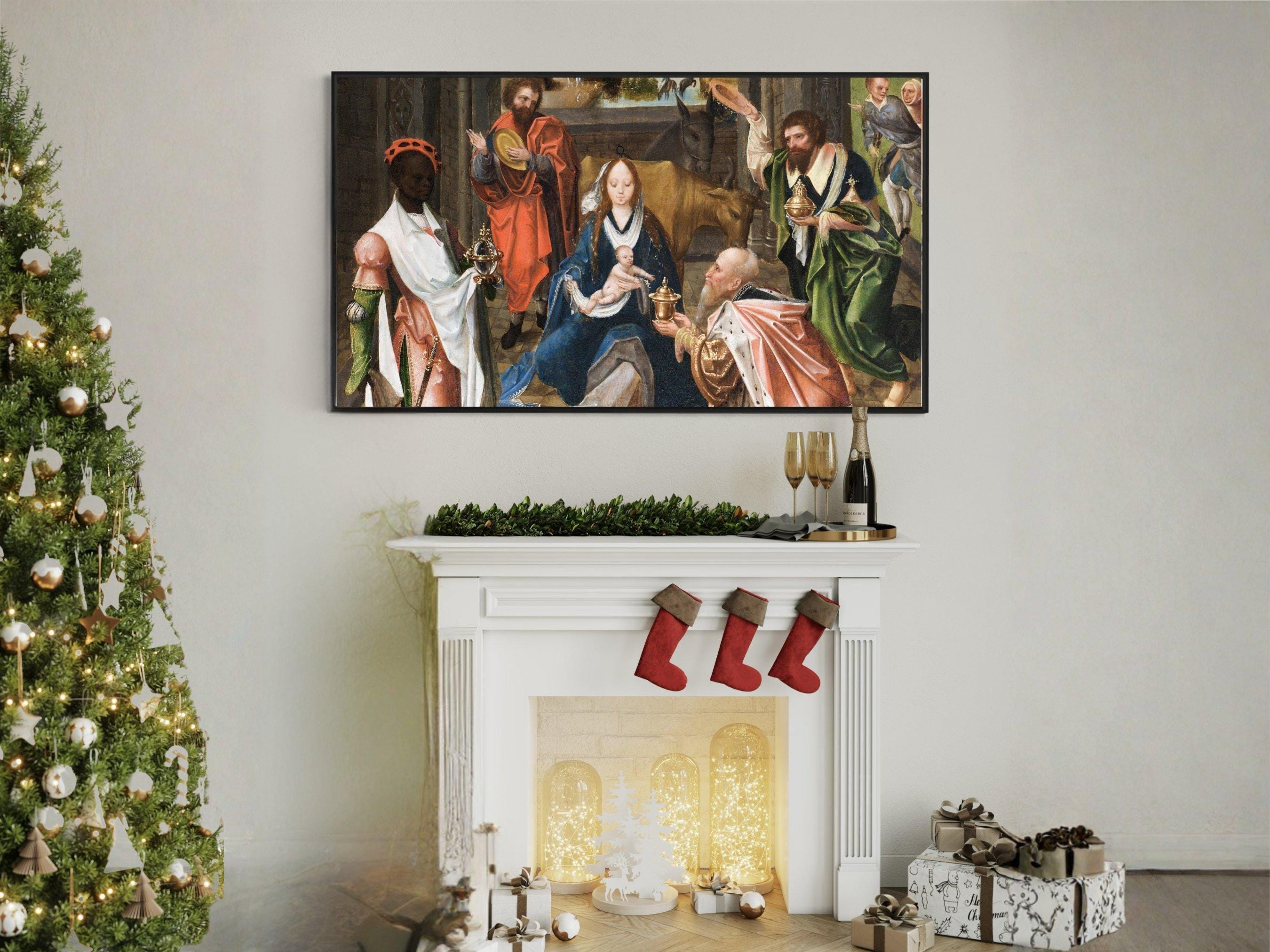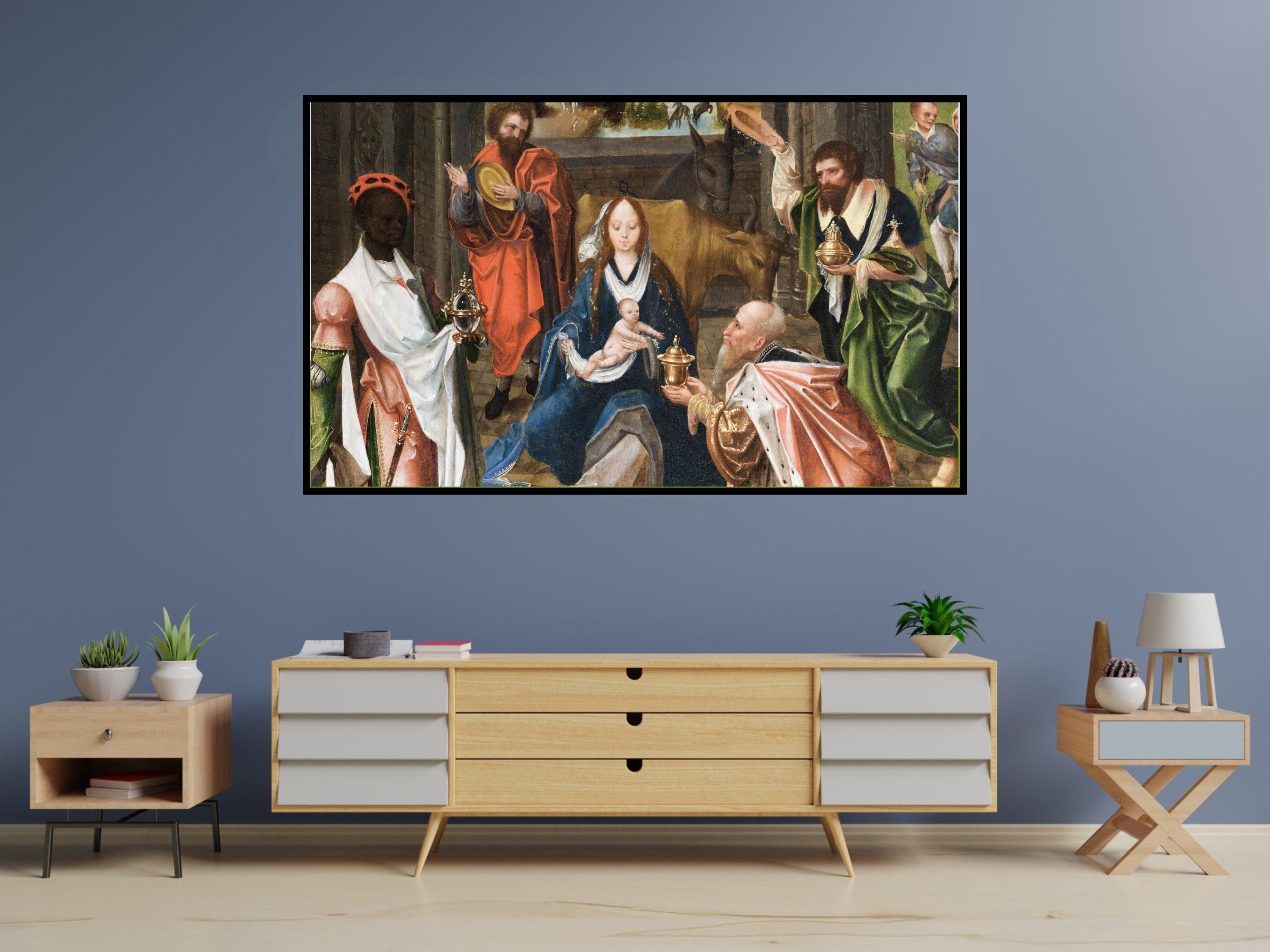 Experience a serene moment of spiritual beauty with this digital download art, featuring the Virgin Mary in her iconic blue robe tenderly holding the infant Jesus. This nativity scene print invites you to reflect on the warmth and reverence of the rustic stable setting, enhanced by the presence of the three kings gifts and subtle, warm tone artwork. Perfect for those seeking religious home decor that blends tradition with modern digital craftsmanship.