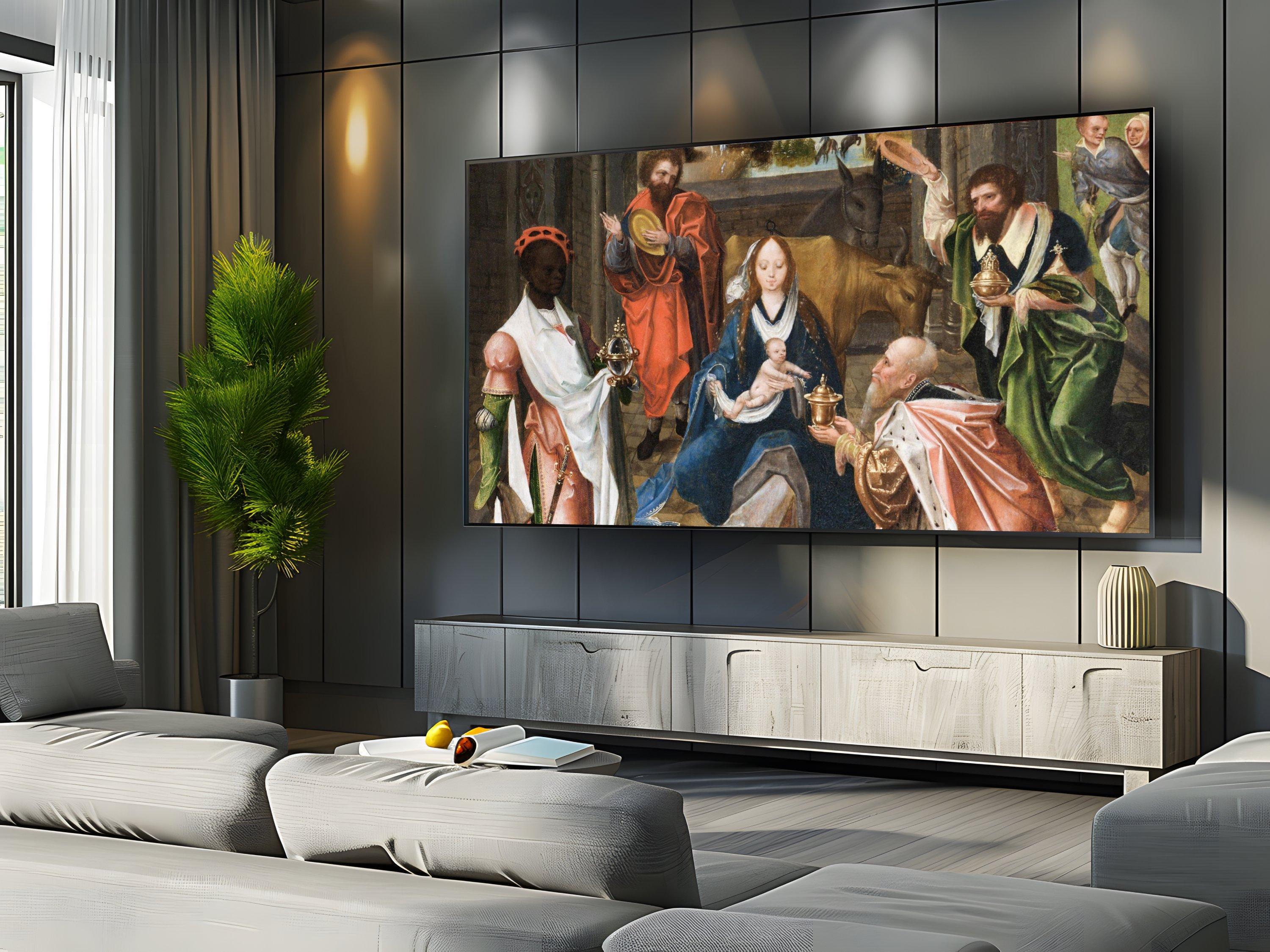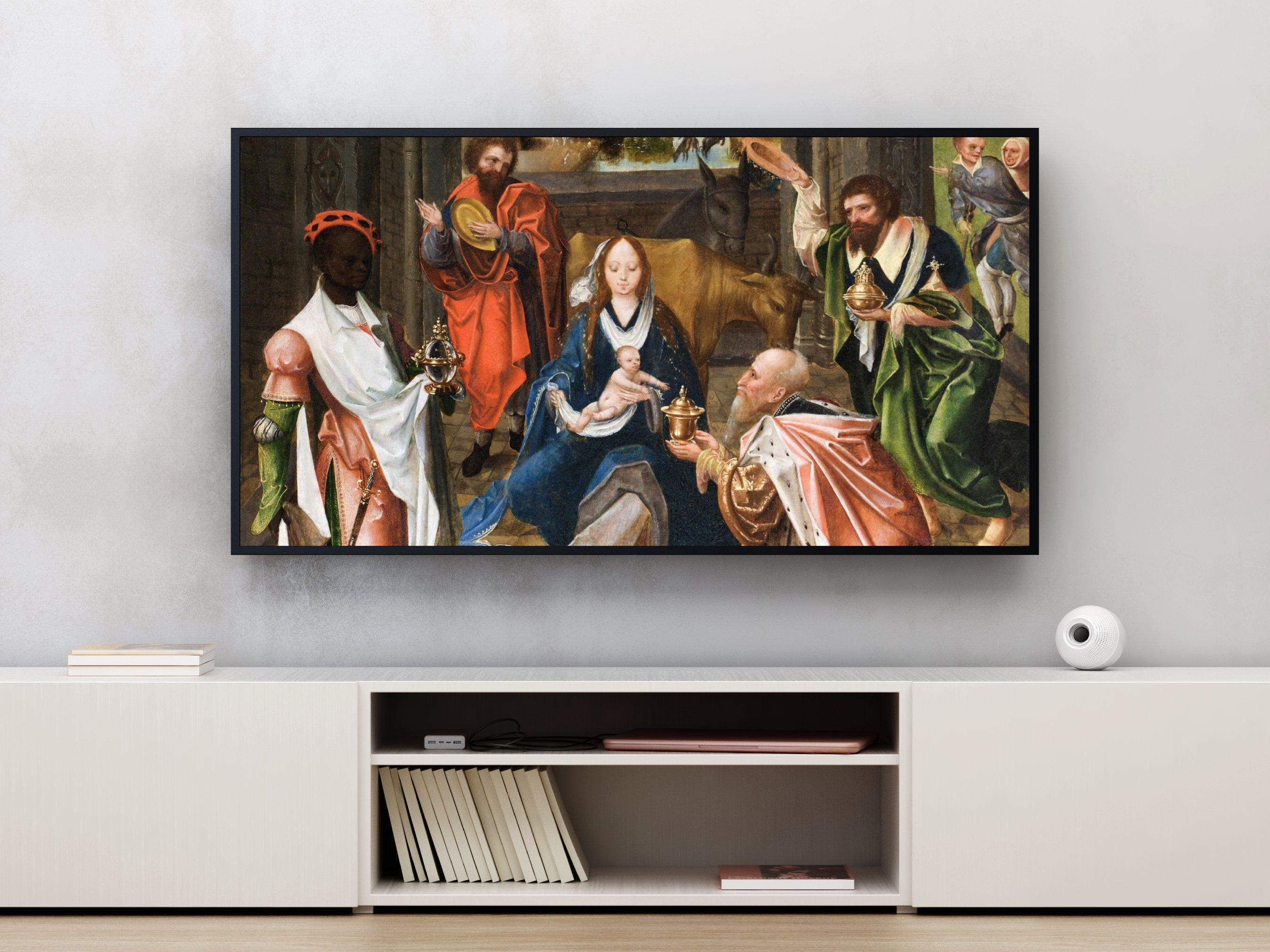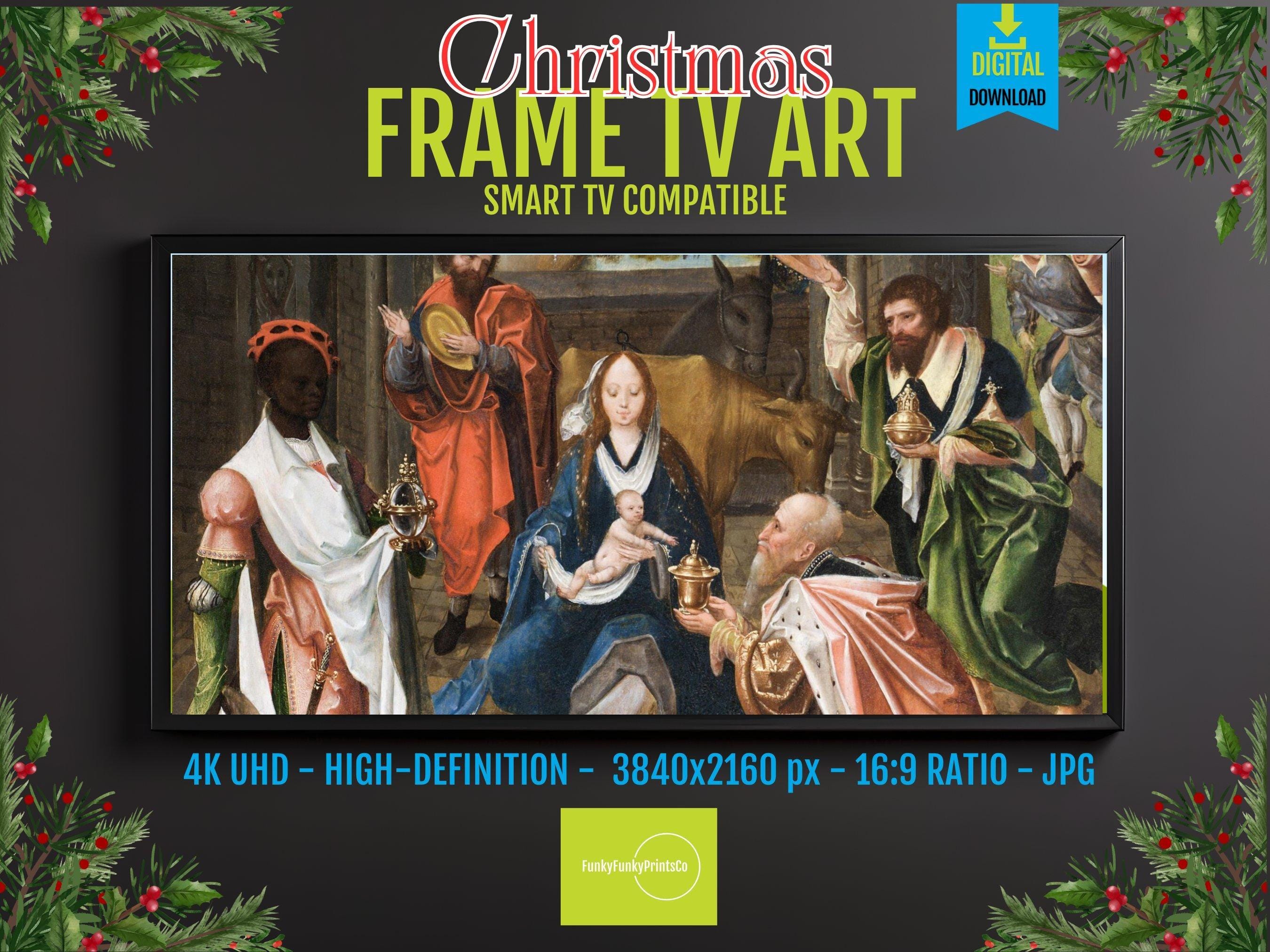 Experience a serene moment of spiritual beauty with this digital download art, featuring the Virgin Mary in her iconic blue robe tenderly holding the infant Jesus. This nativity scene print invites you to reflect on the warmth and reverence of the rustic stable setting, enhanced by the presence of the three kings gifts and subtle, warm tone artwork. Perfect for those seeking religious home decor that blends tradition with modern digital craftsmanship.