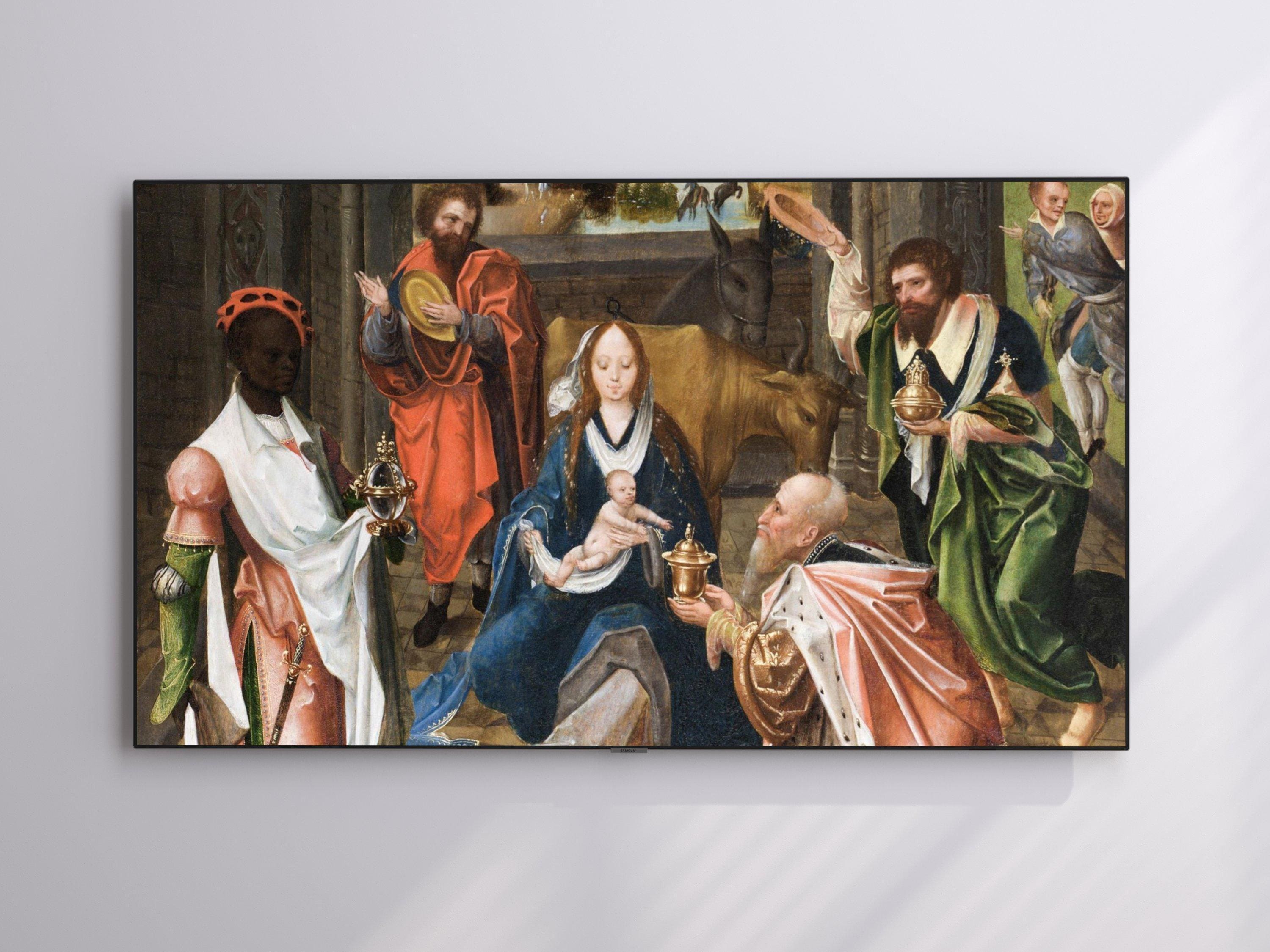 Depicts Virgin Mary with infant Jesus, surrounded by three kings and a bearded man gesture