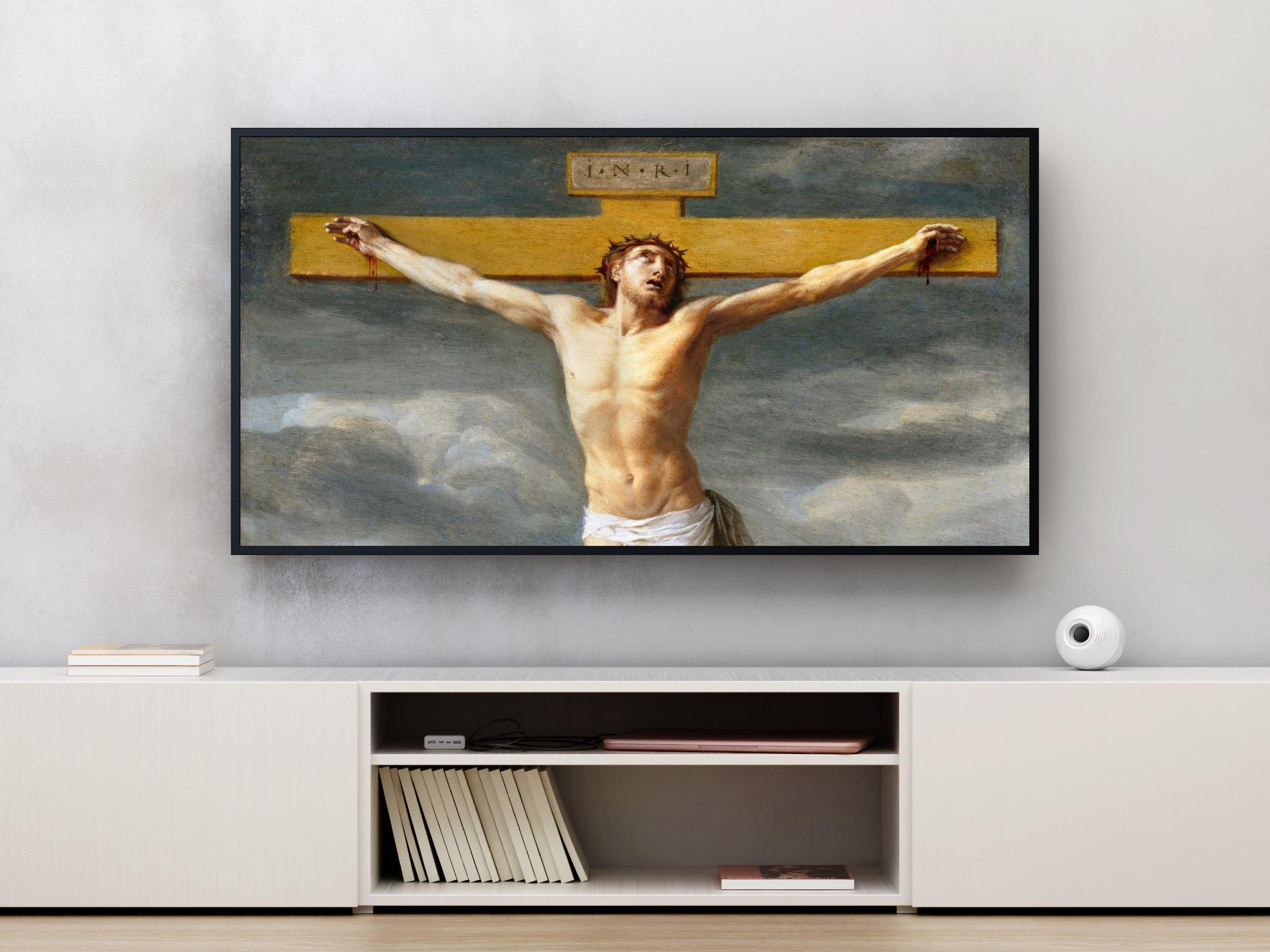 - Features Jesus Christ on the cross with dramatic swirling sky and the inscription INRI