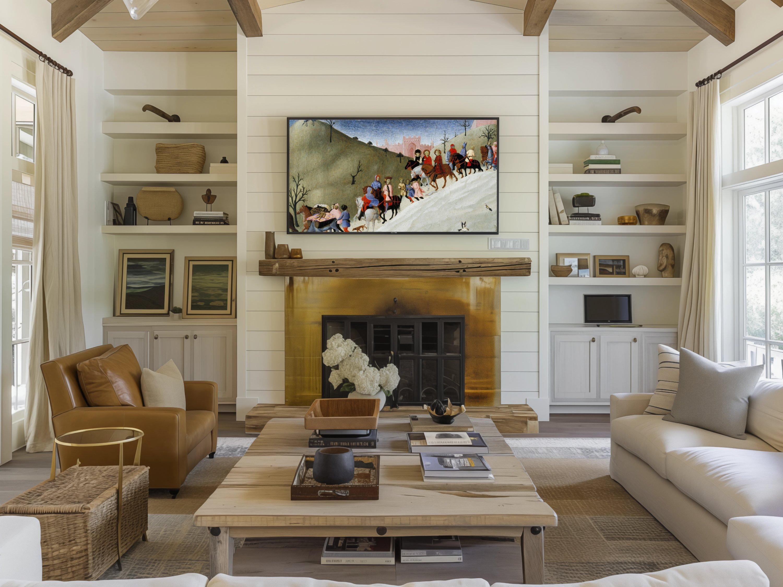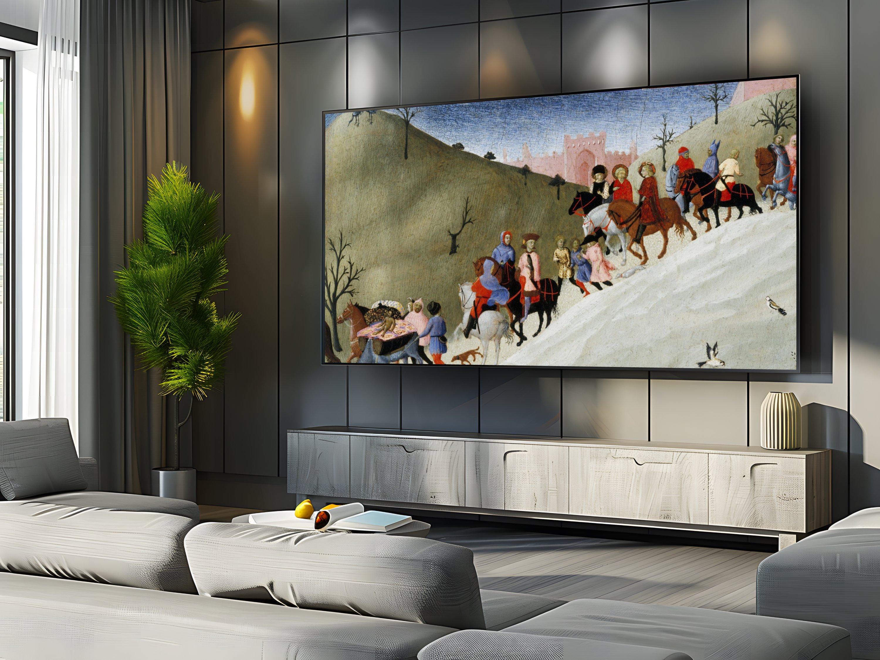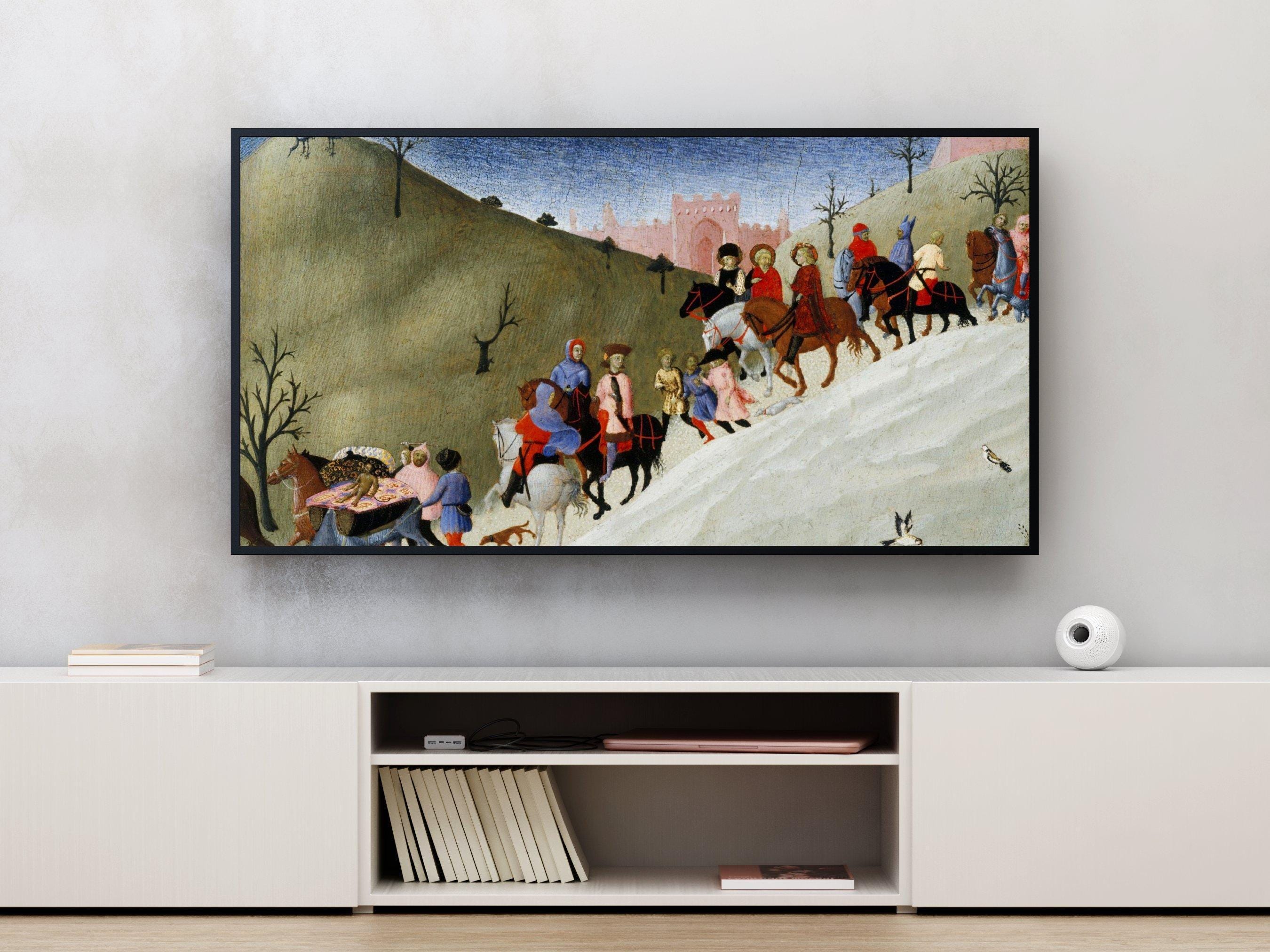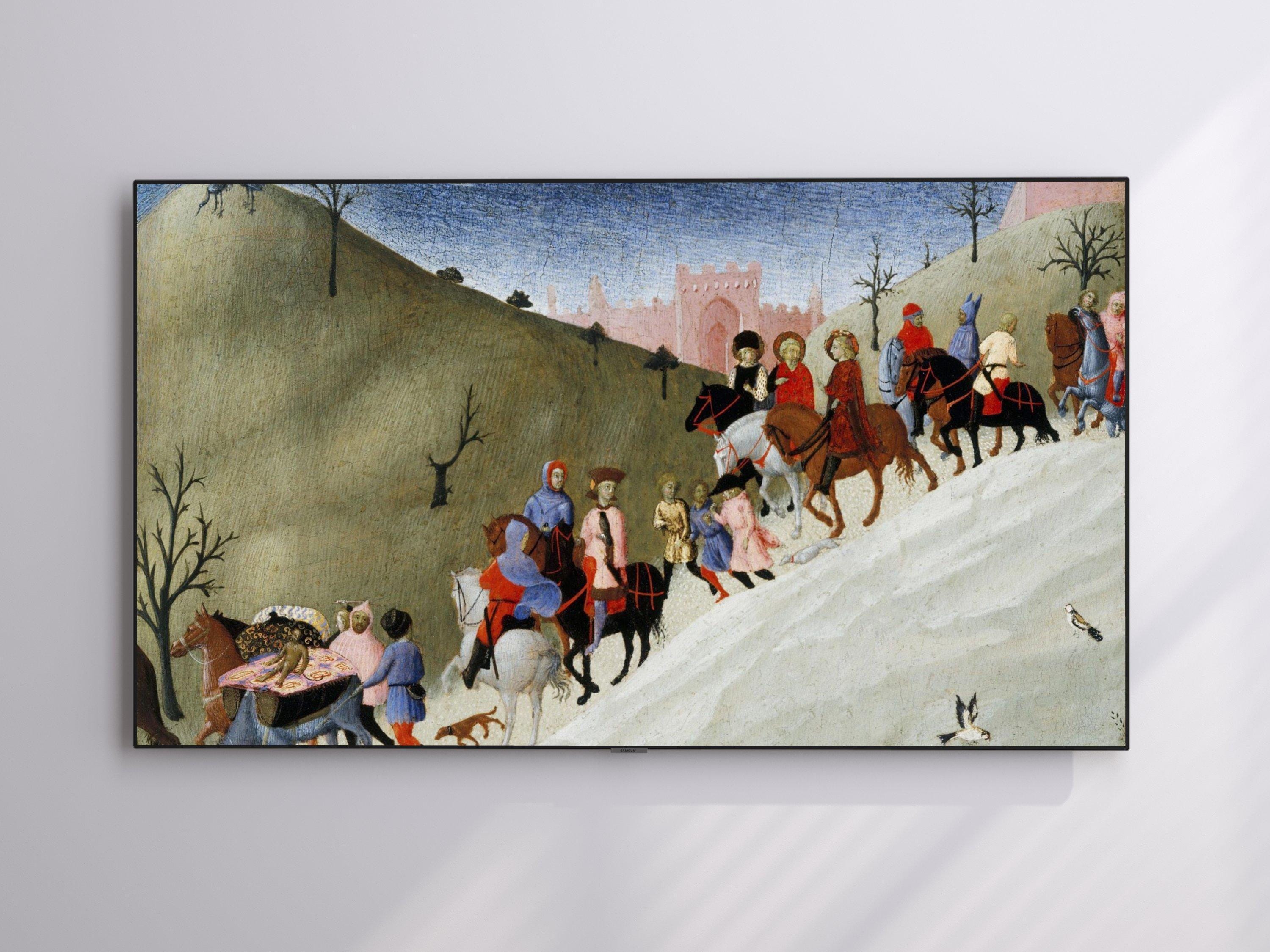 Immerse yourself in a vibrant journey through time with this digital art download that beautifully captures figures on horseback and travelers wandering a medieval landscape. Inspired by the rich history of pilgrimage and travel, this piece showcases colorful riders and walkers moving across rolling hills, evoking a sense of community and adventure. Perfect as a 4K HD screensaver for your Samsung Frame TV, it brings a touch of bygone era artwork into your modern space.