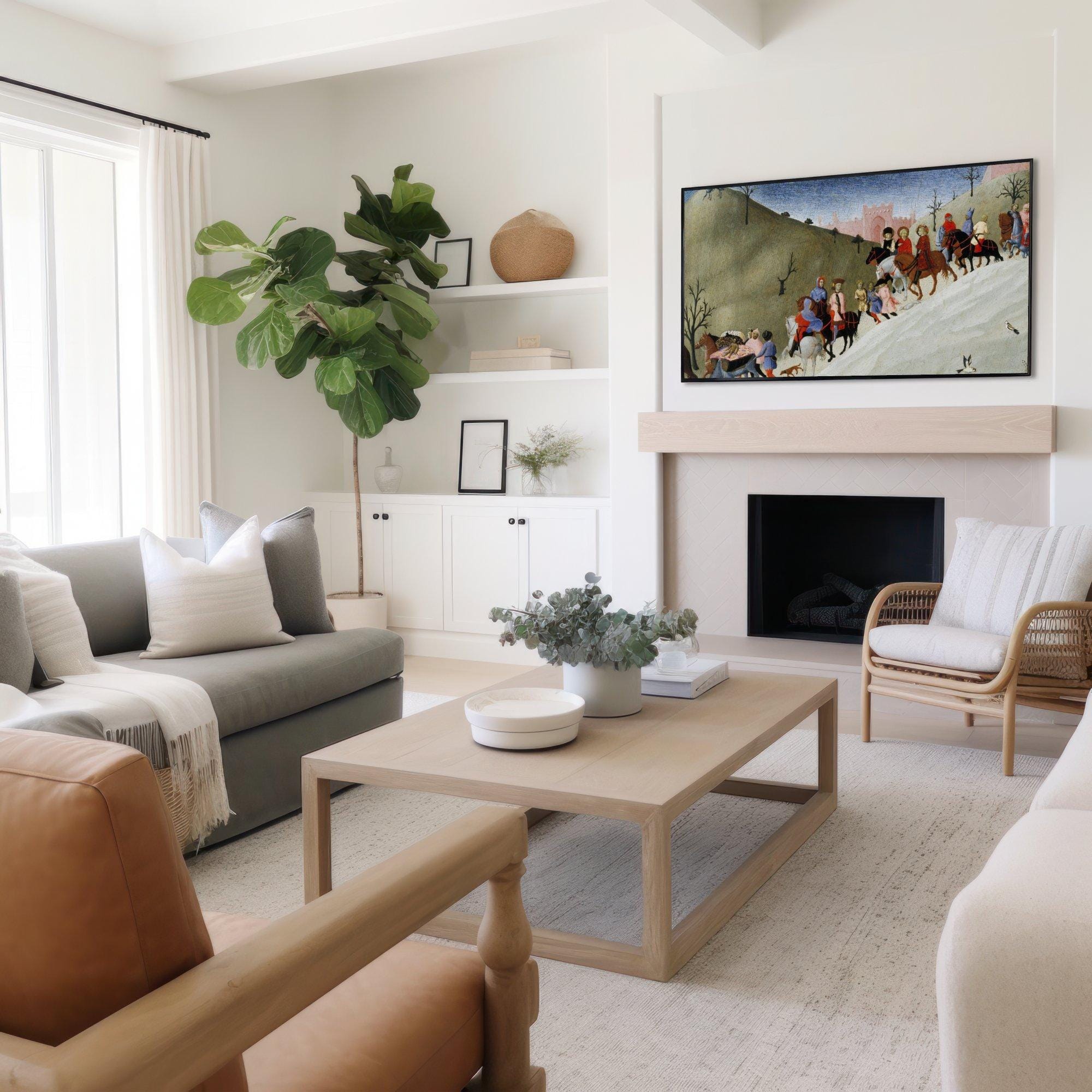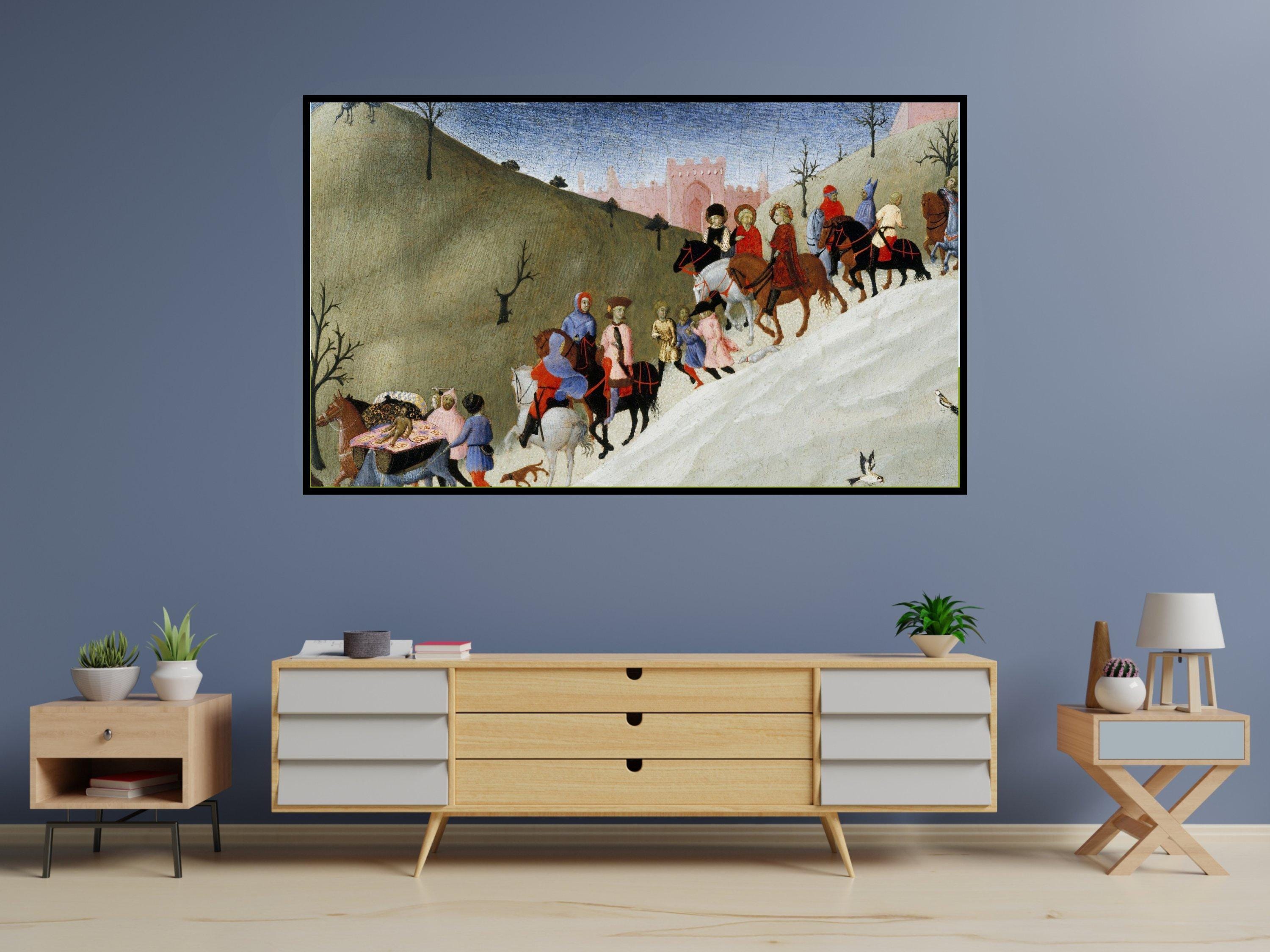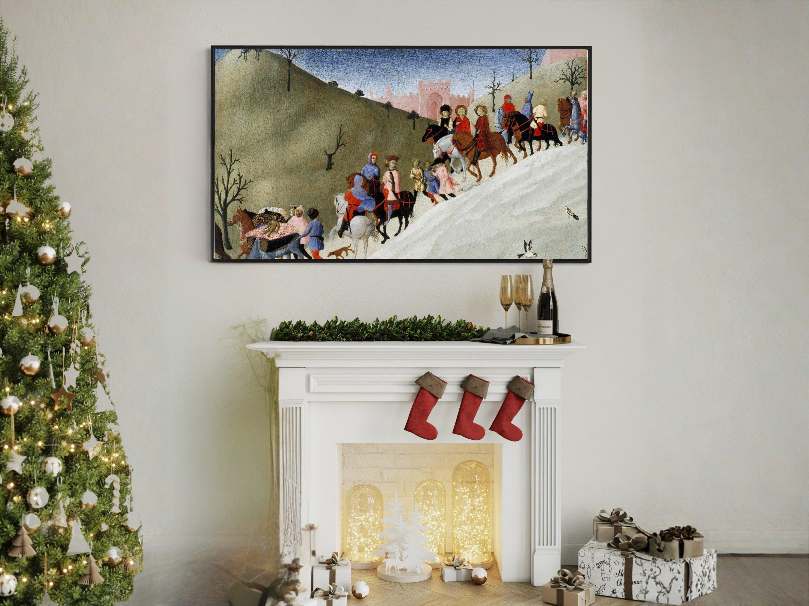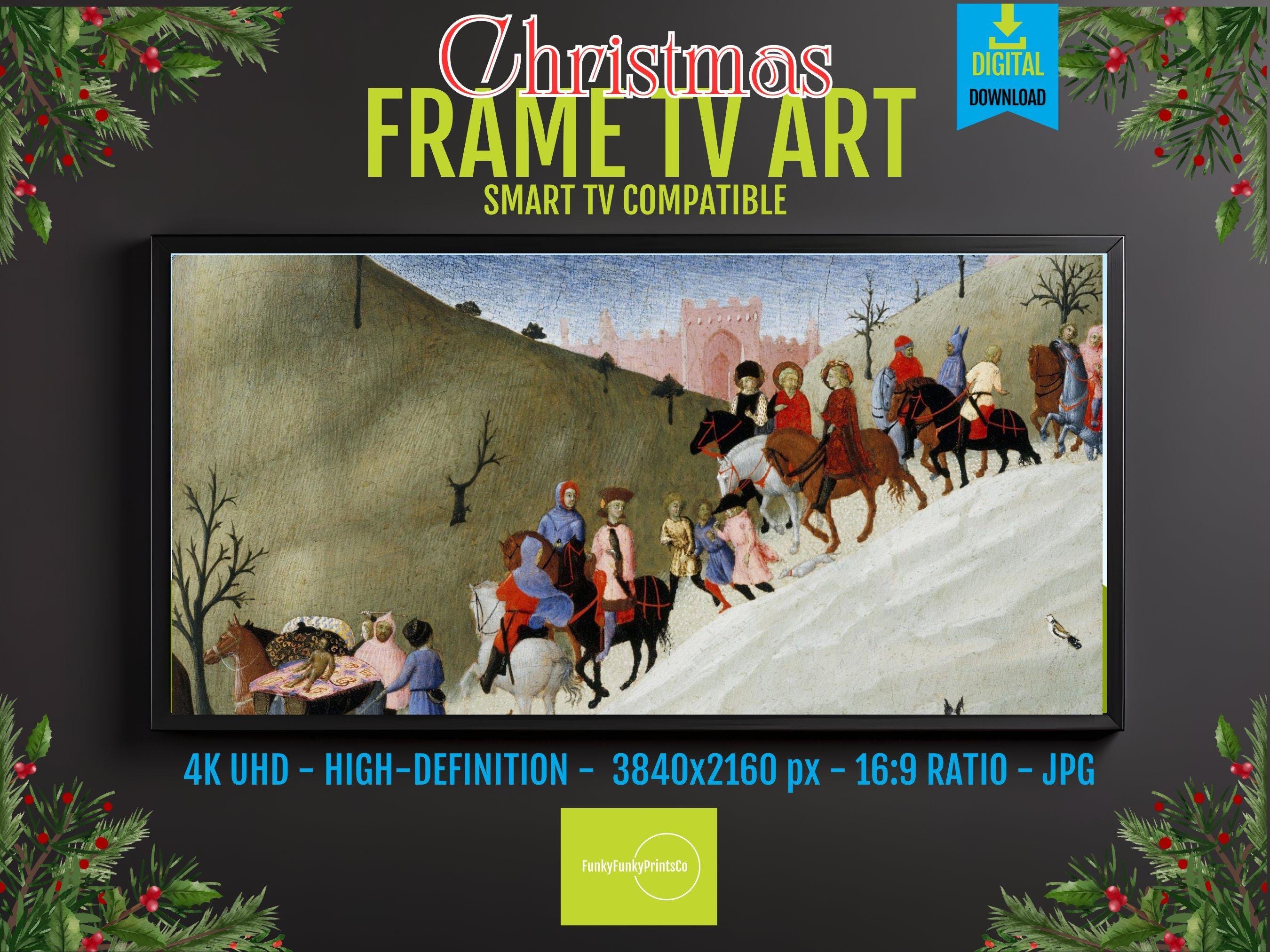 Immerse yourself in a vibrant journey through time with this digital art download that beautifully captures figures on horseback and travelers wandering a medieval landscape. Inspired by the rich history of pilgrimage and travel, this piece showcases colorful riders and walkers moving across rolling hills, evoking a sense of community and adventure. Perfect as a 4K HD screensaver for your Samsung Frame TV, it brings a touch of bygone era artwork into your modern space.
